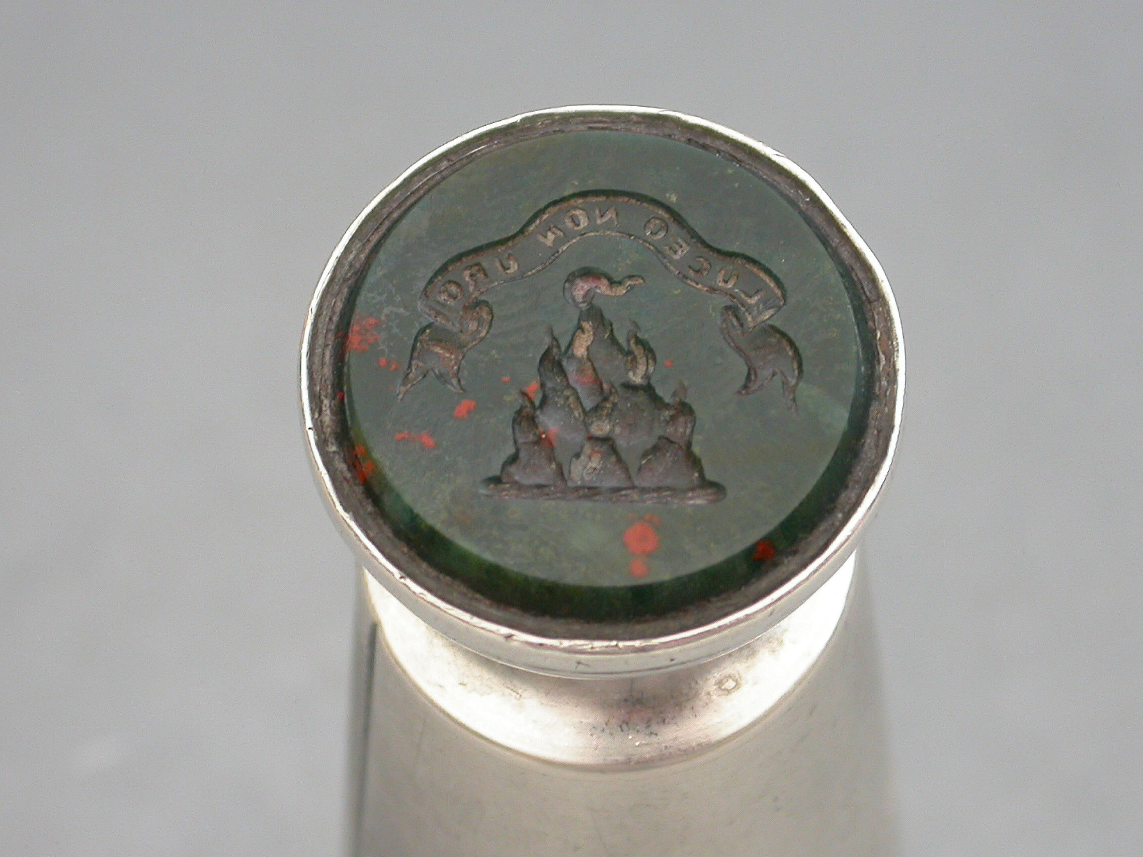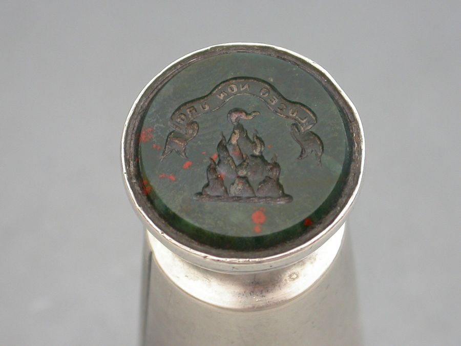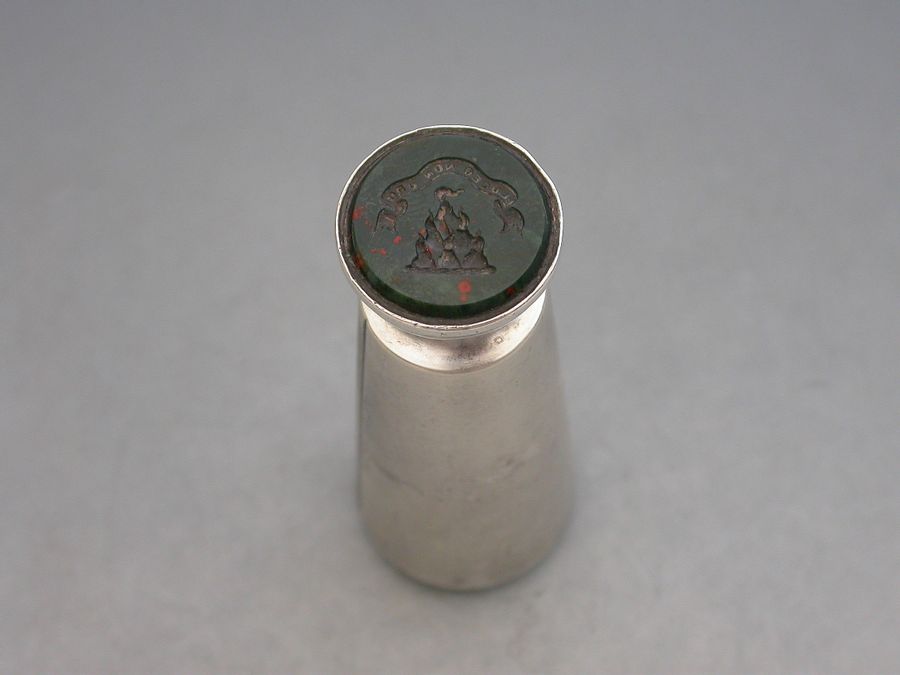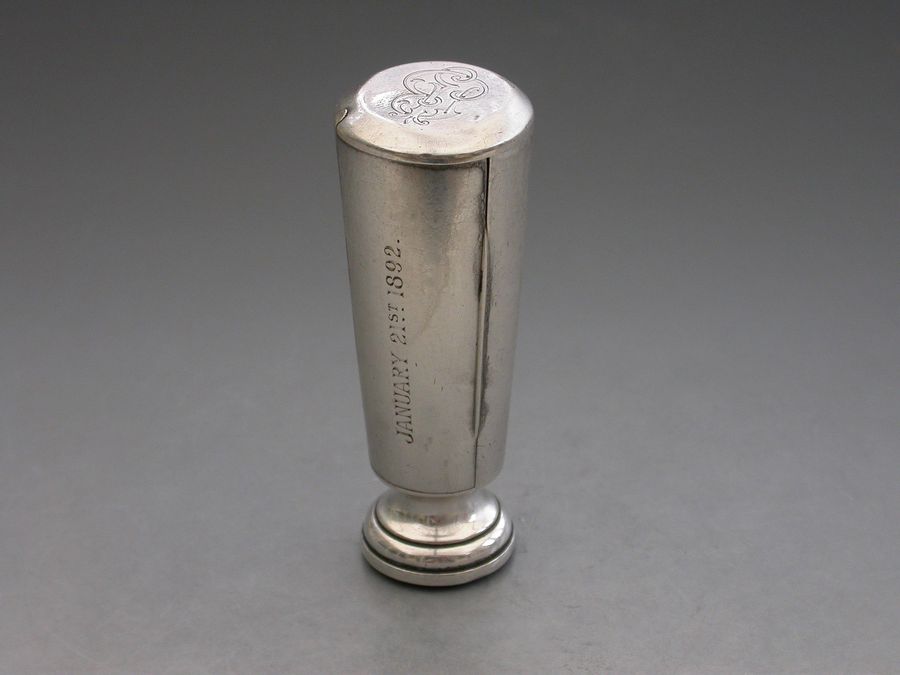 A good Victorian silver Vesta Case combined with a Table Seal, of flared cylindrical form with engraved striker to the side, the top engraved with a contemporary cypher and the hinged lid engraved with the date - January 21st 1892. The circular bloodstone seal matrix carved a crest and motto. Silver gilt interior.