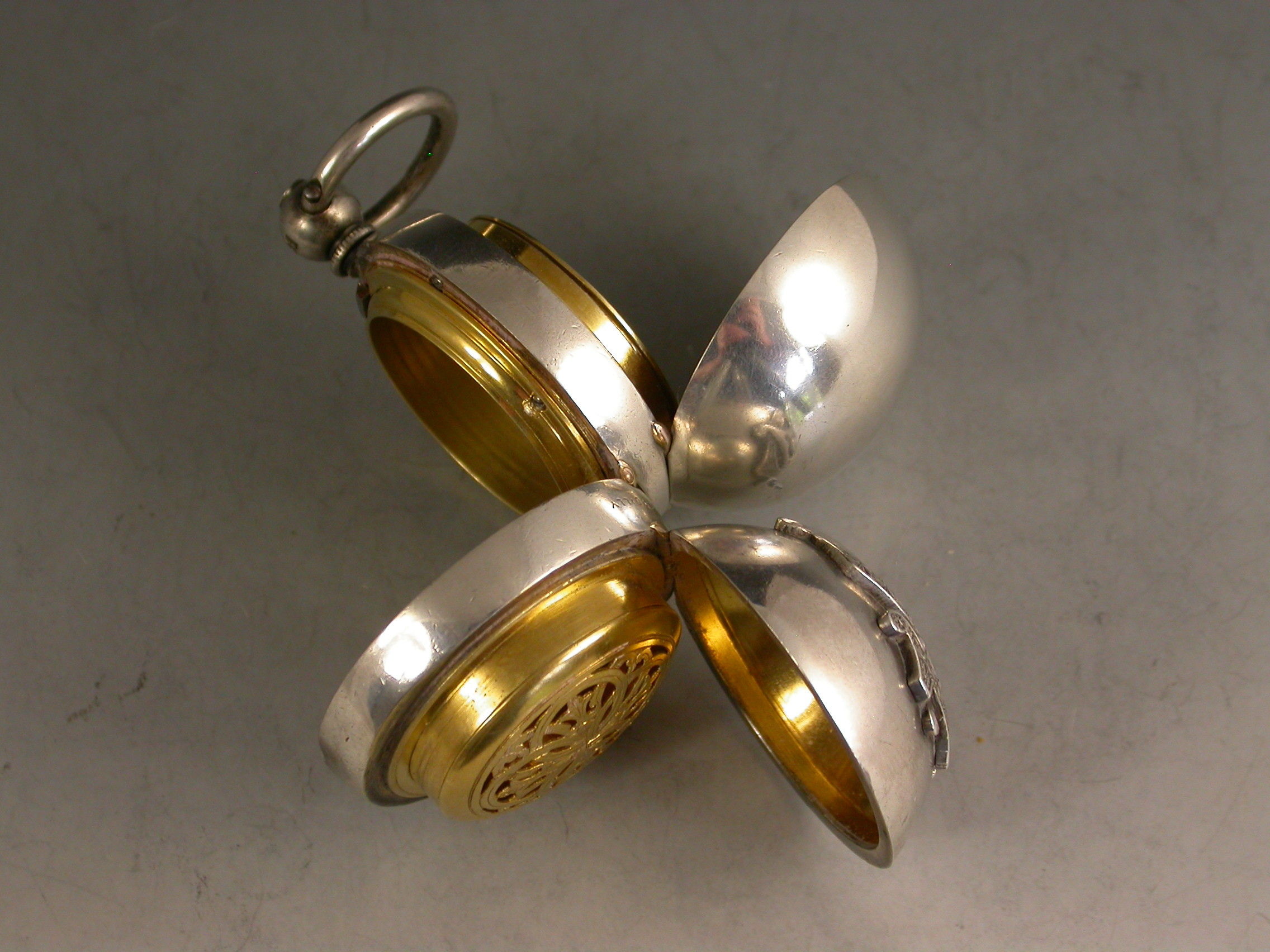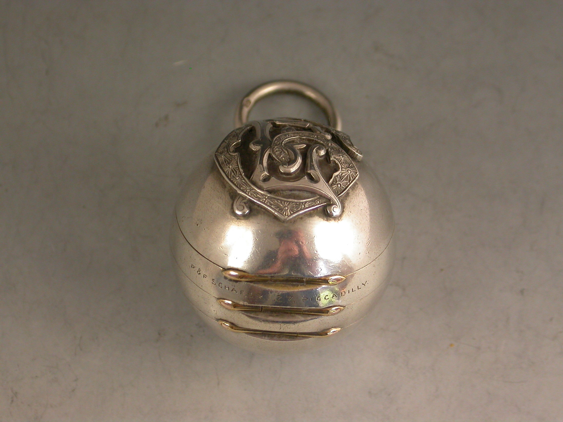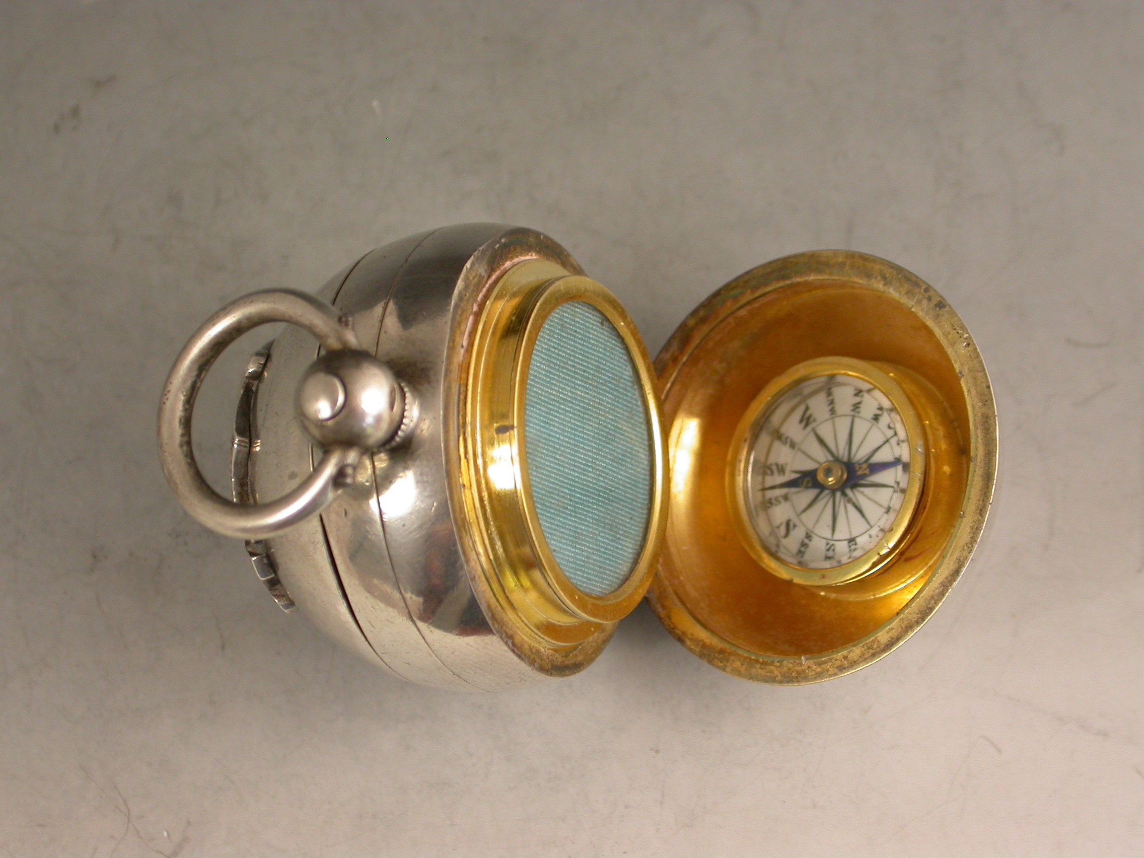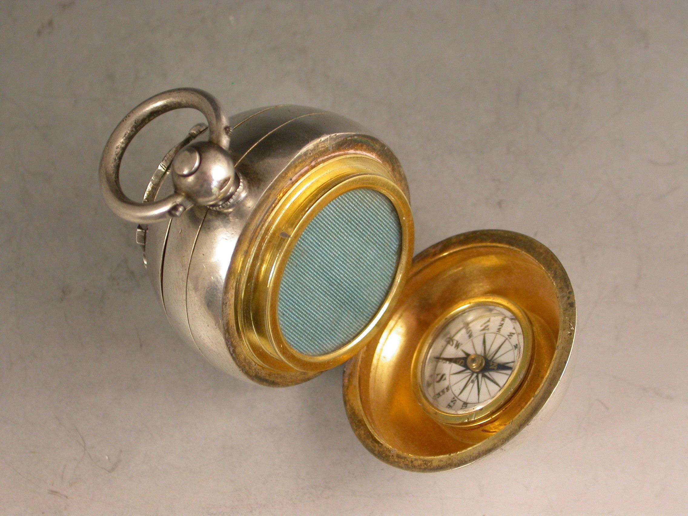 An extremely fine and rare Victorian silver combination Vinaigrette, Compass, Coin Holder and Photo Frame, made in the form of a sphere, with attached suspension ring and push button opening mechanism to the central compartment, two other hinged compartments contain the Vinaigrette and the Compass whilst the central compartment houses the coin holder. Gold hinges and applied Gothic monogram - 'G.E.'