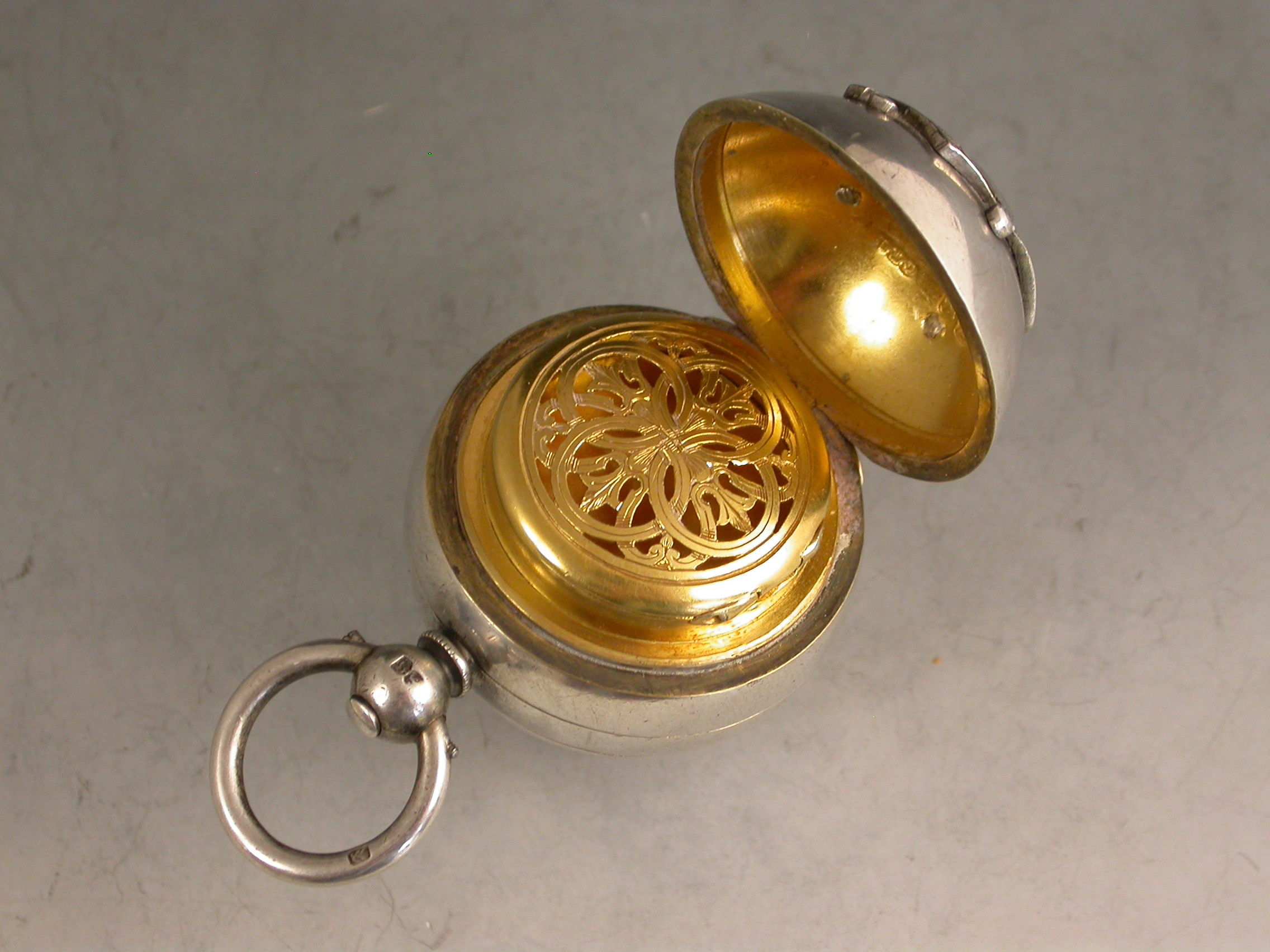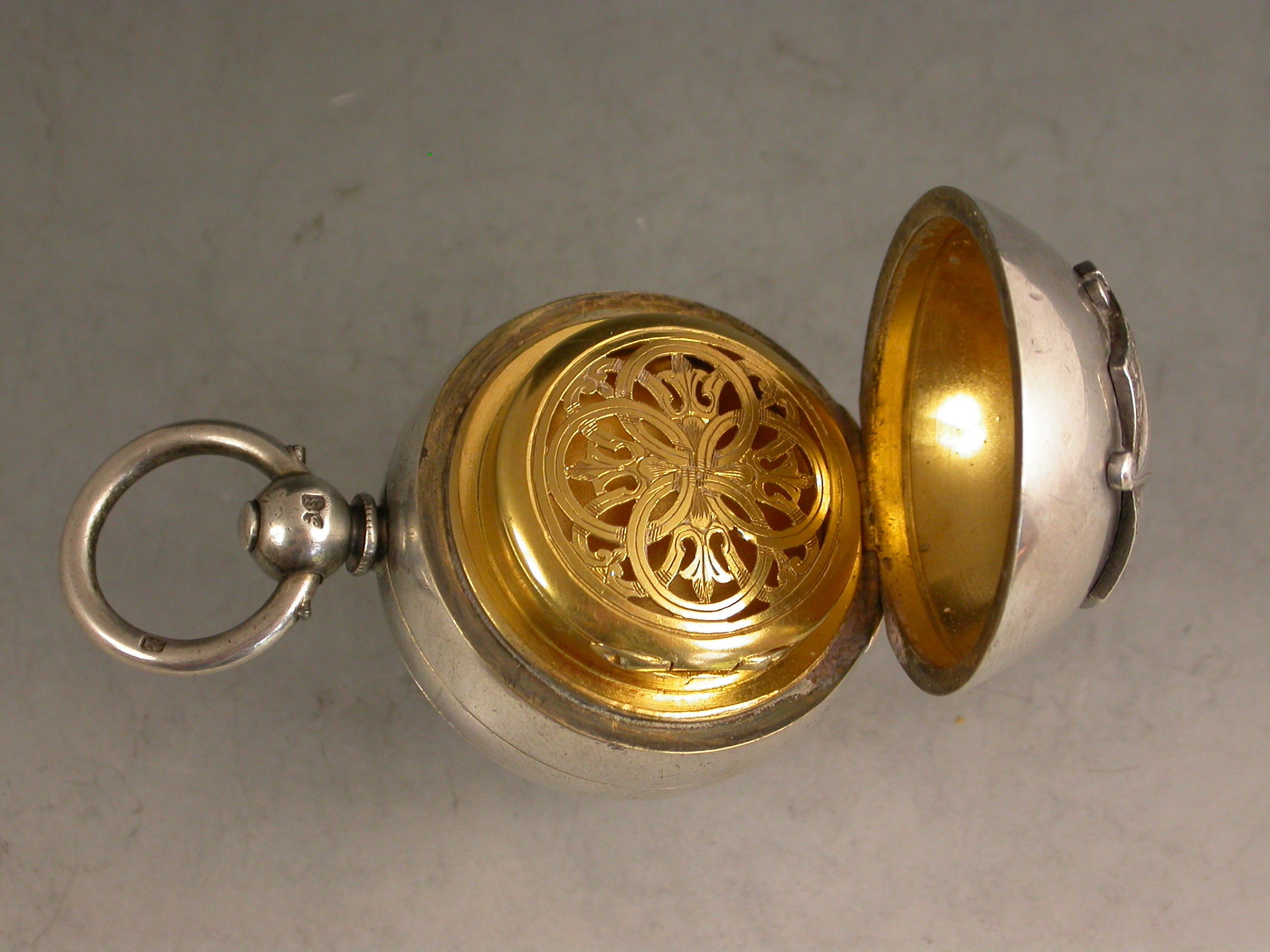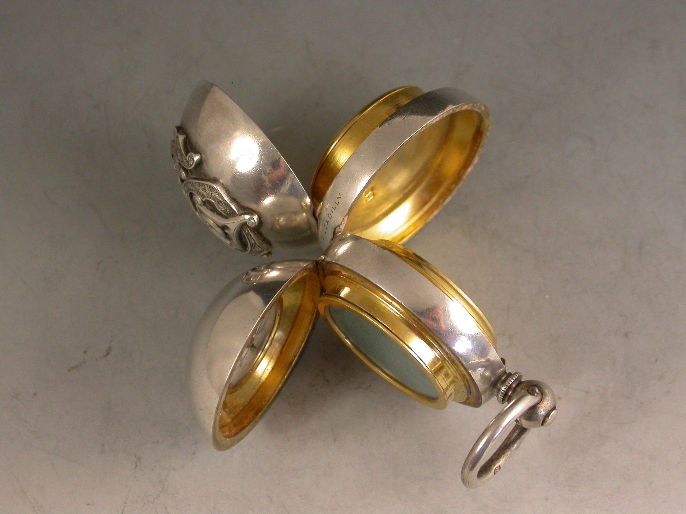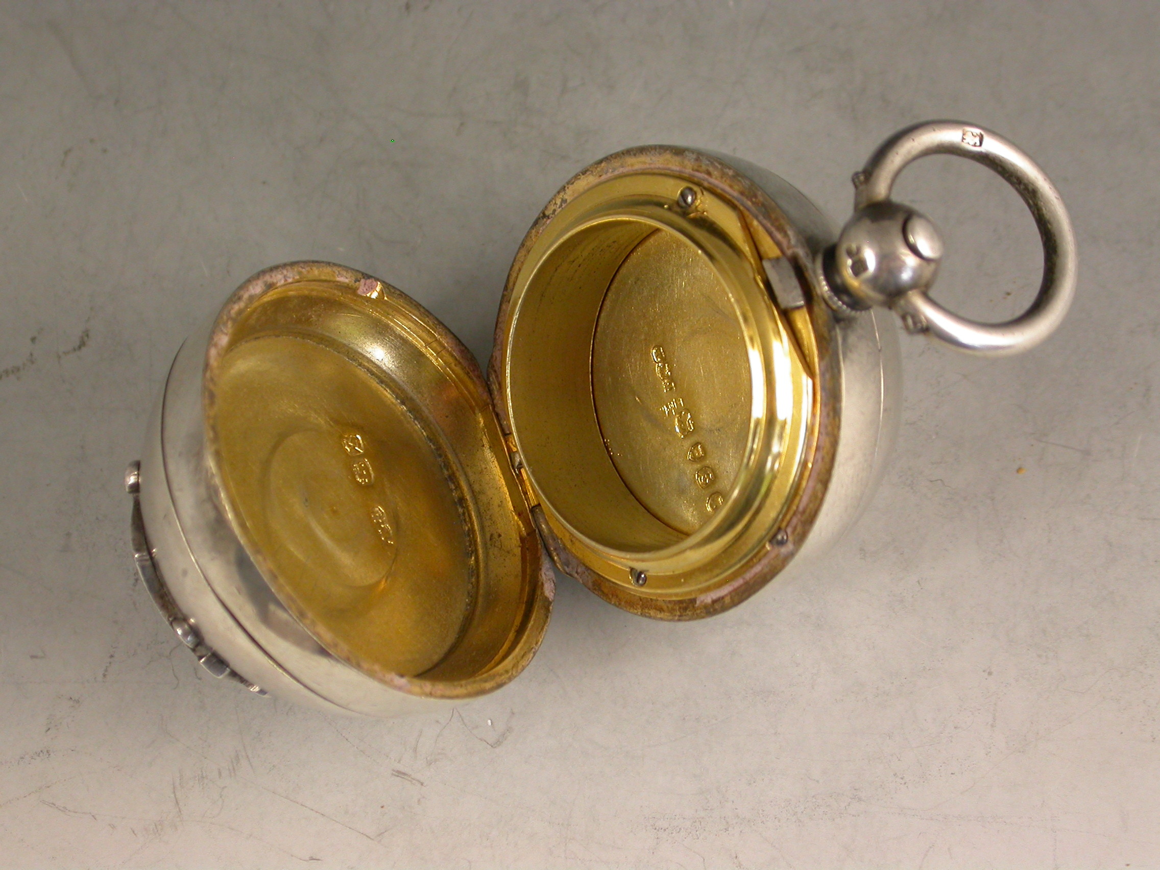 An extremely fine and rare Victorian silver combination Vinaigrette, Compass, Coin Holder and Photo Frame, made in the form of a sphere, with attached suspension ring and push button opening mechanism to the central compartment, two other hinged compartments contain the Vinaigrette and the Compass whilst the central compartment houses the coin holder. Gold hinges and applied Gothic monogram - 'G.E.'