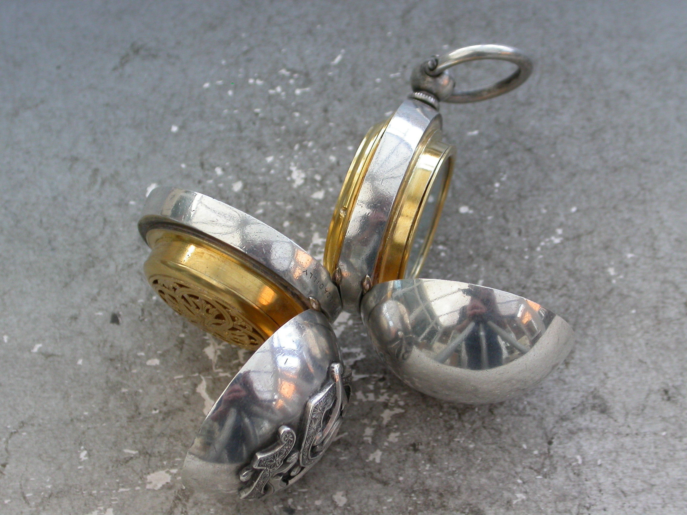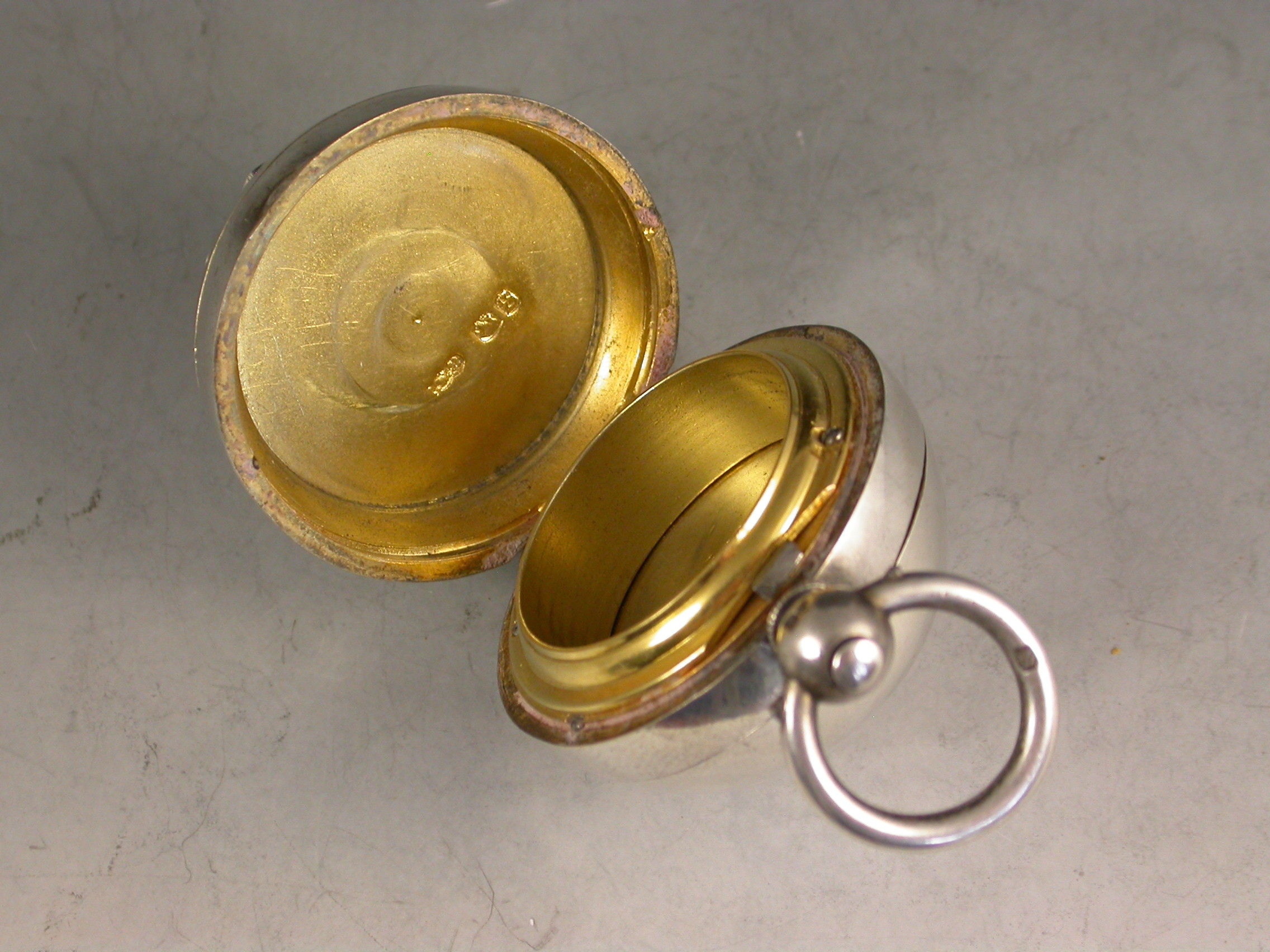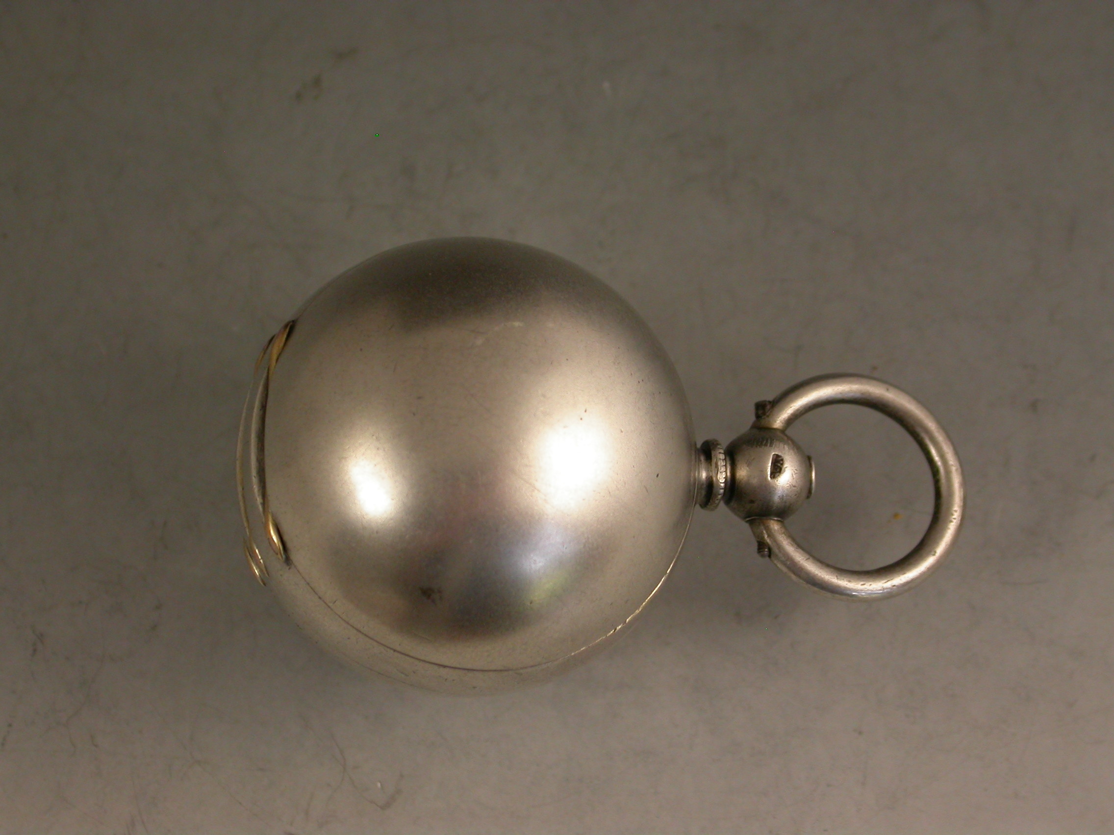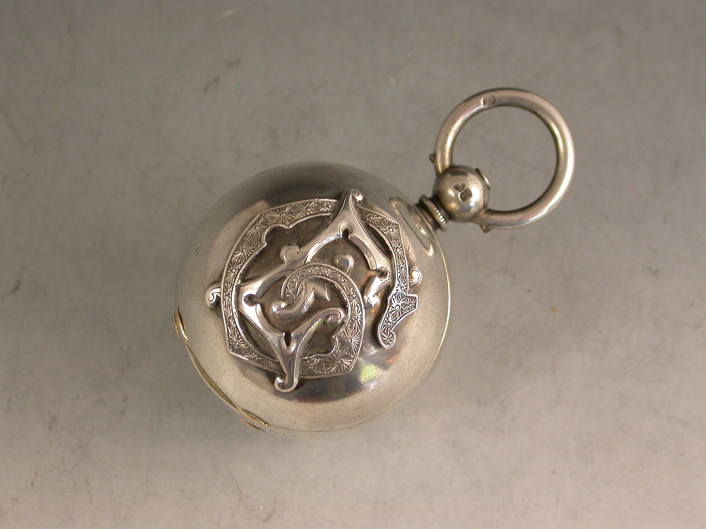 An extremely fine and rare Victorian silver combination Vinaigrette, Compass, Coin Holder and Photo Frame, made in the form of a sphere, with attached suspension ring and push button opening mechanism to the central compartment, two other hinged compartments contain the Vinaigrette and the Compass whilst the central compartment houses the coin holder. Gold hinges and applied Gothic monogram - 'G.E.'