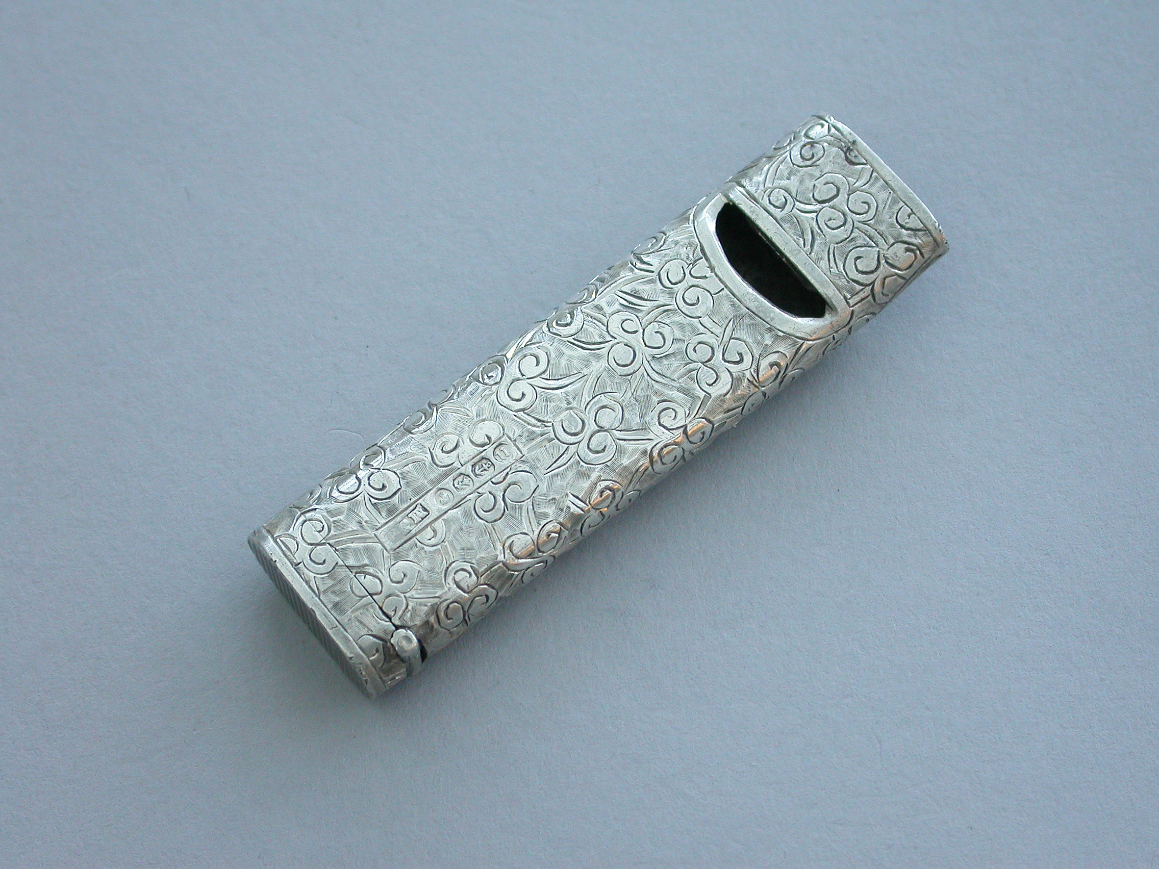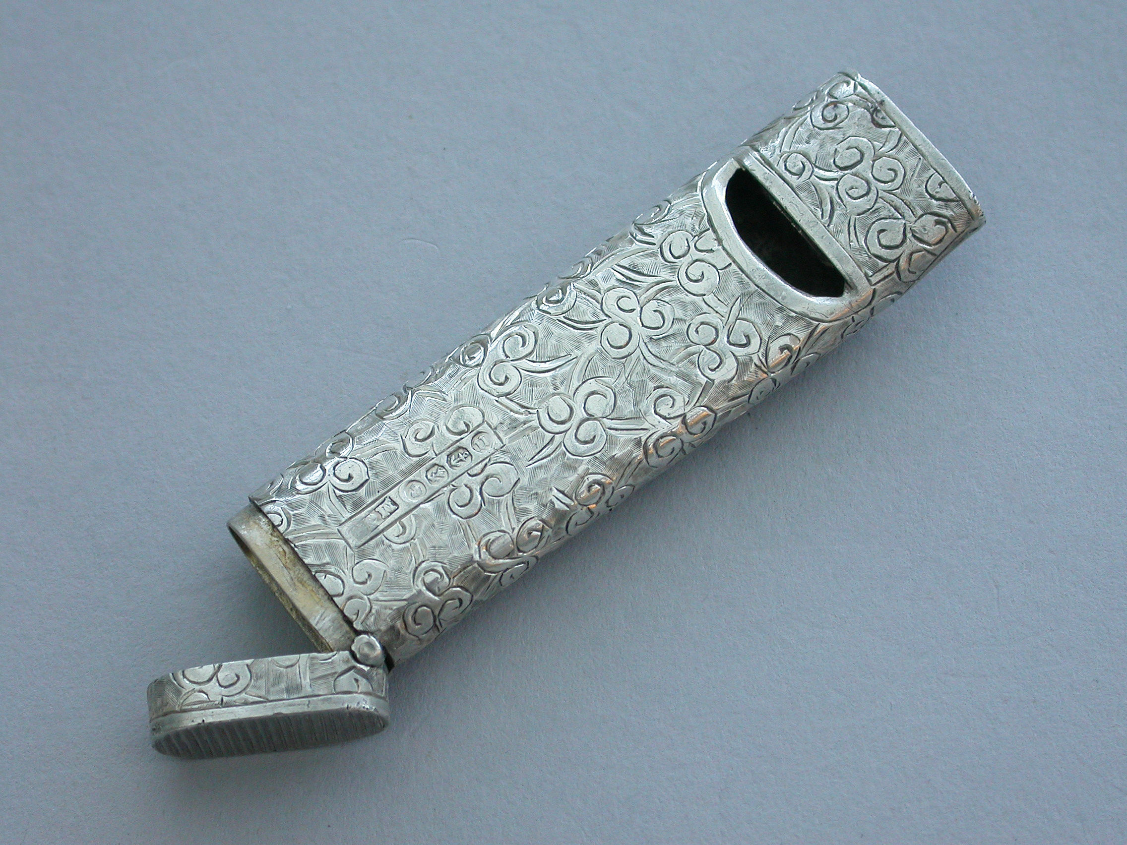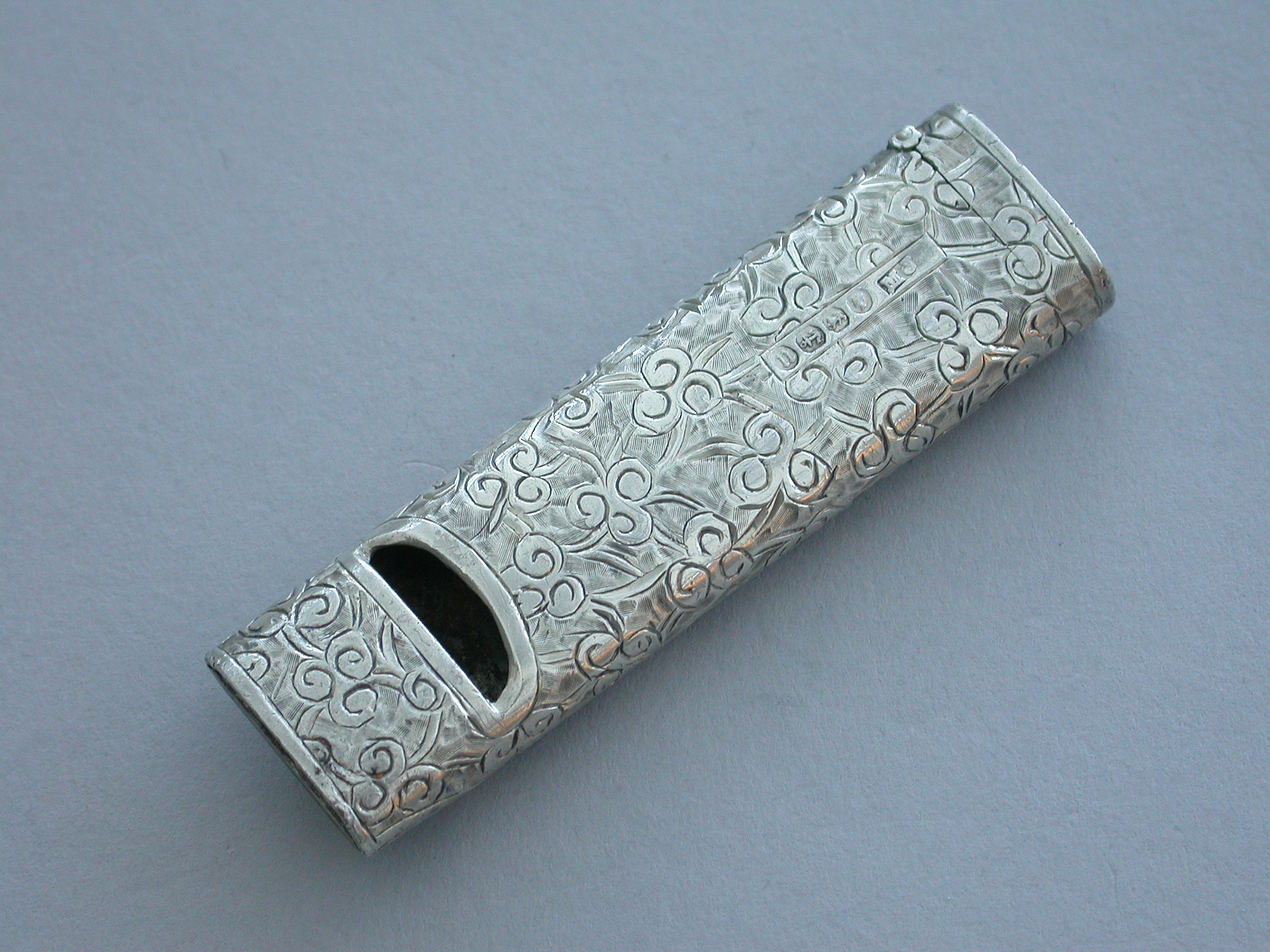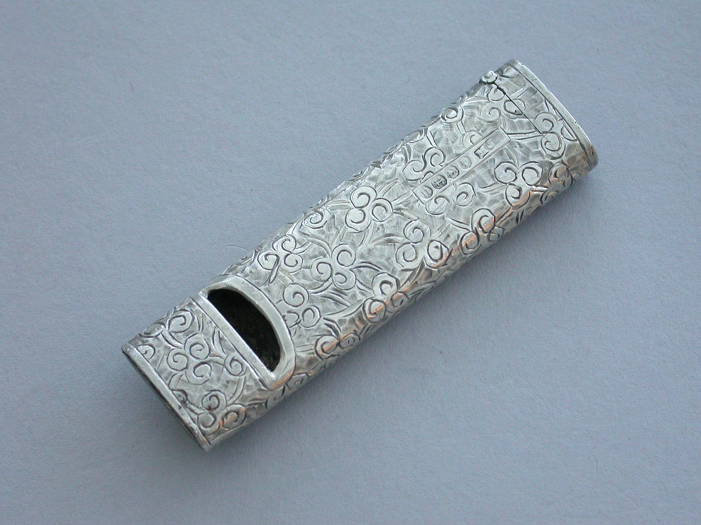 A good Victorian silver combination Vesta Case and Whistle of flat tubular form with hinged lid and silver gilt interior, the body with foliate scroll engraved decoration