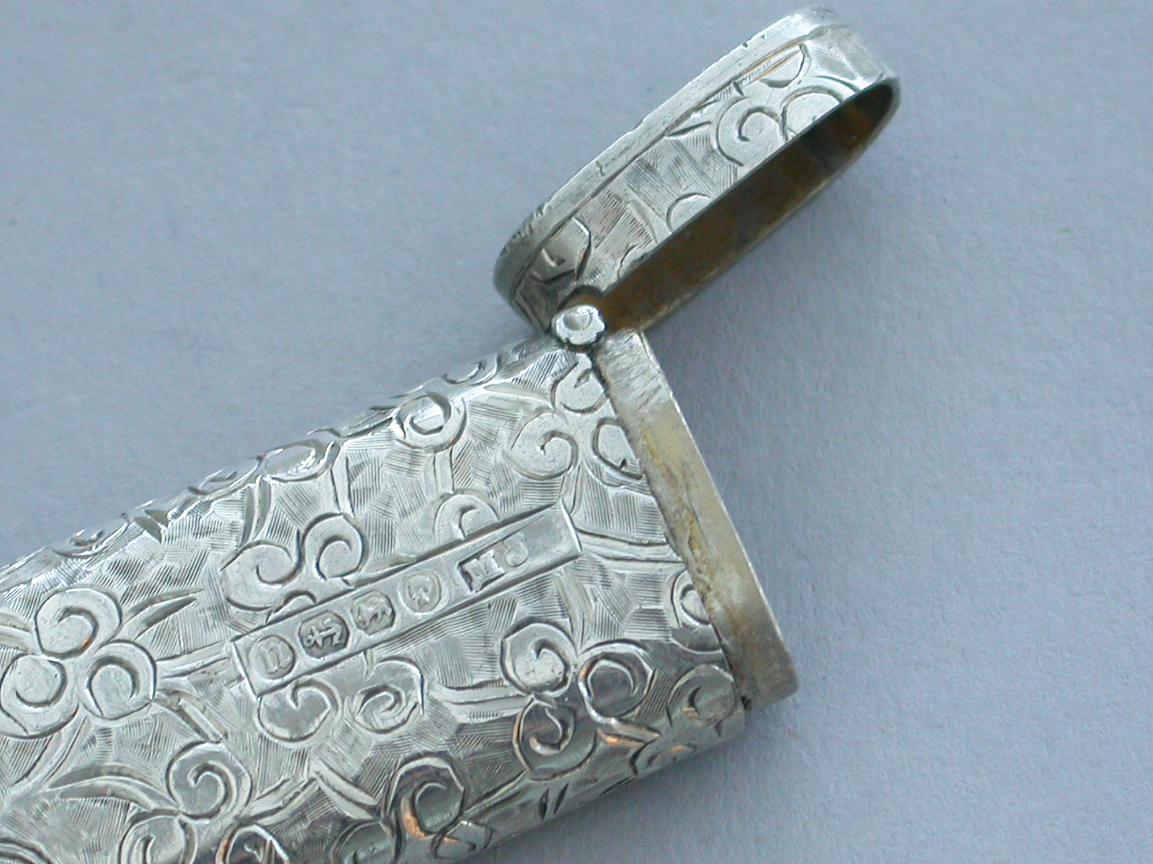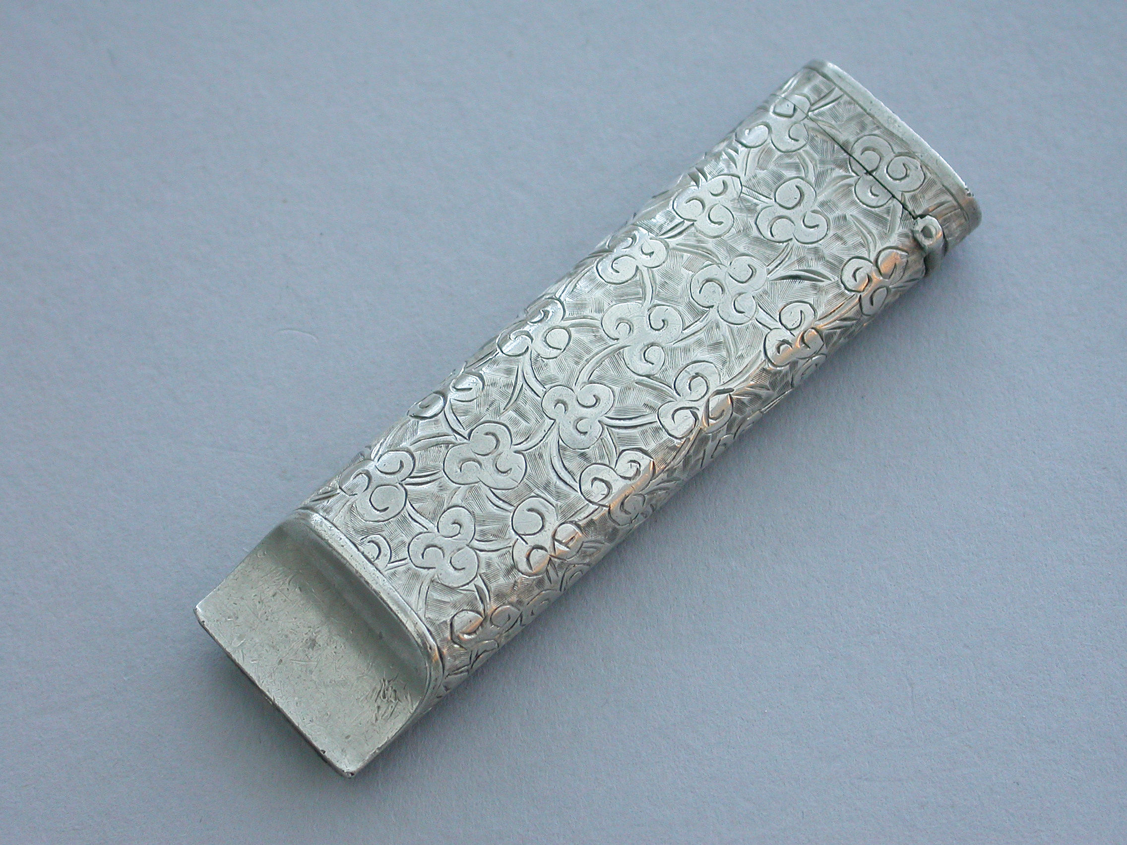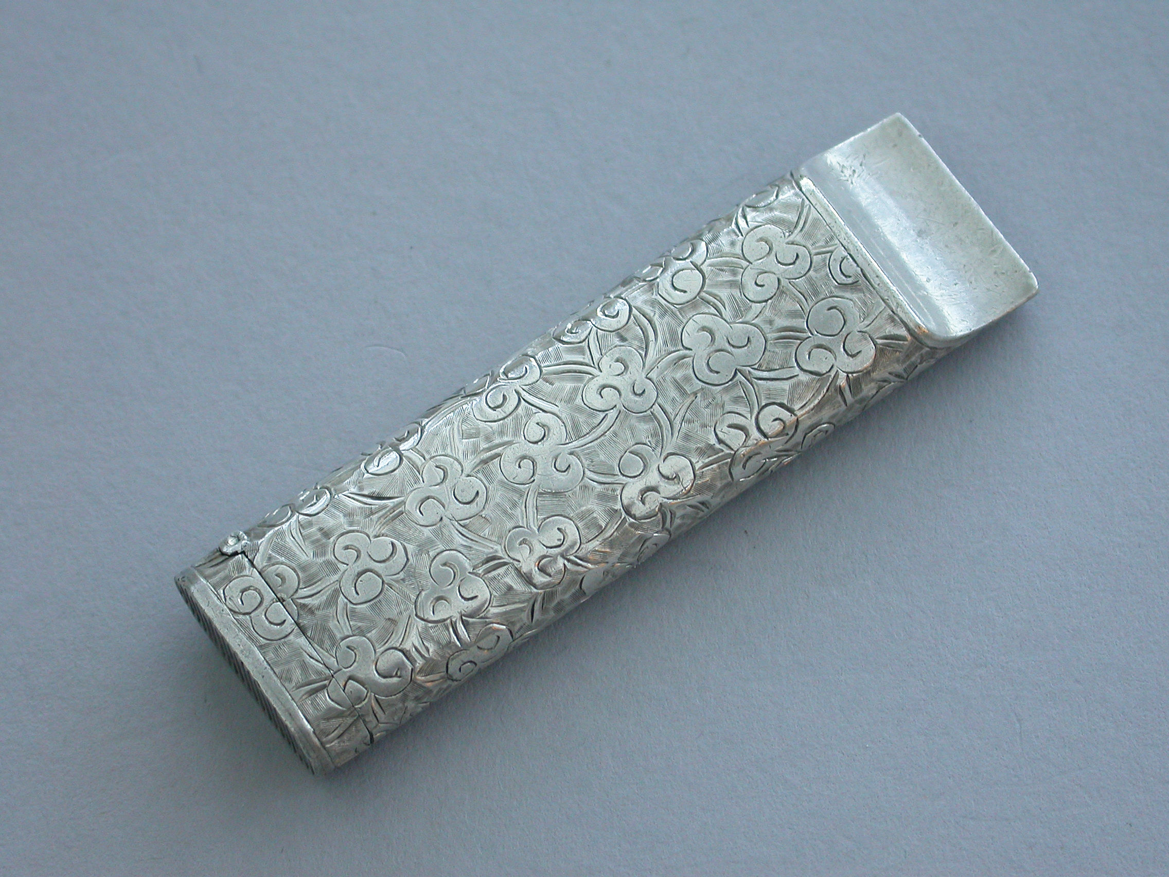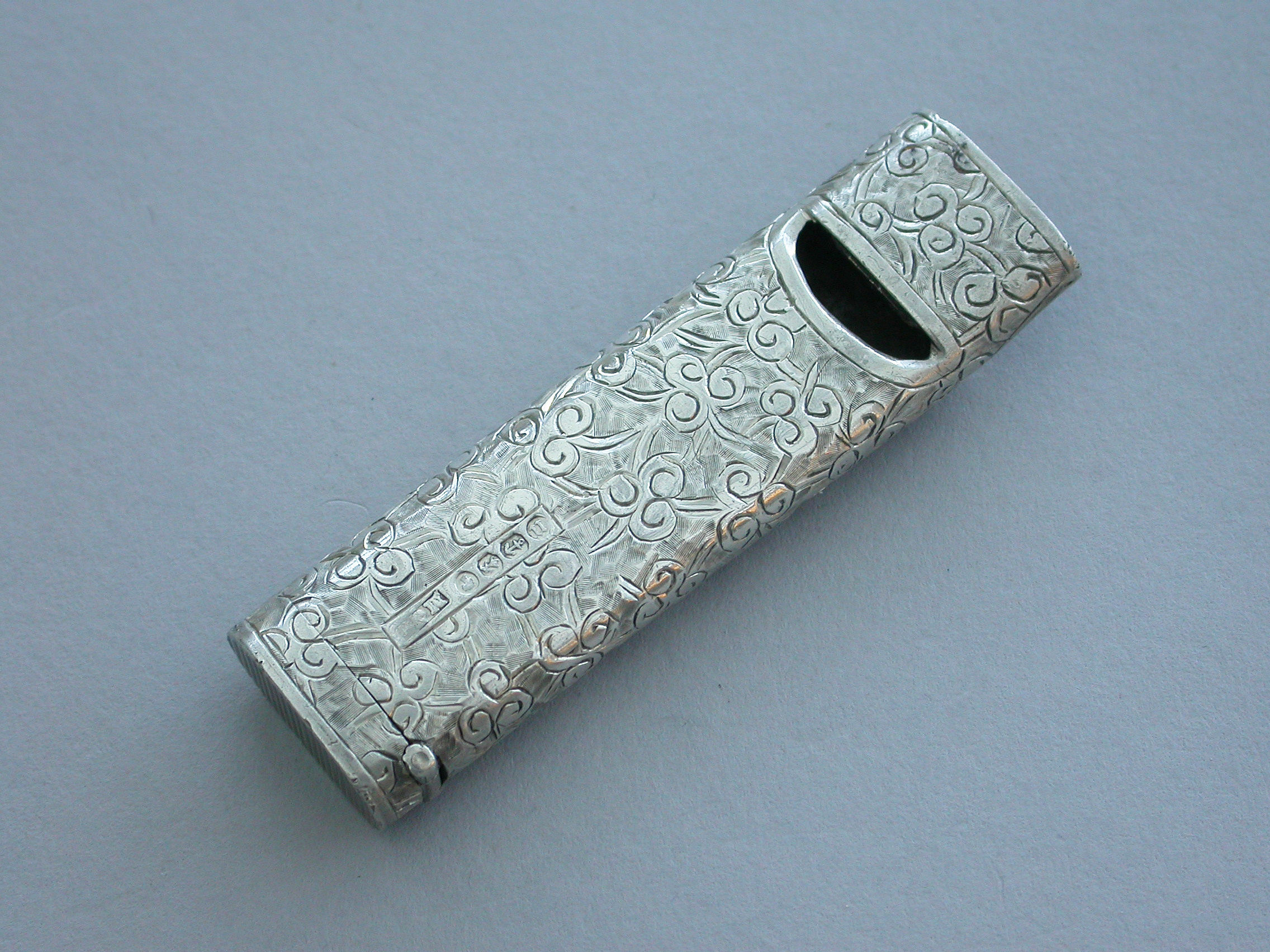 A good Victorian silver combination Vesta Case and Whistle of flat tubular form with hinged lid and silver gilt interior, the body with foliate scroll engraved decoration