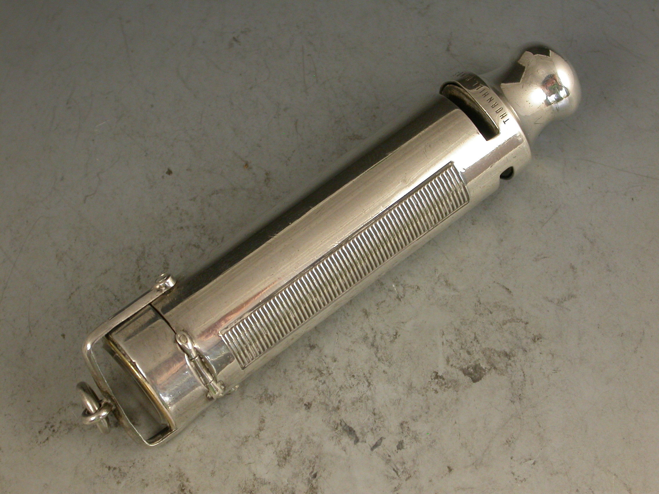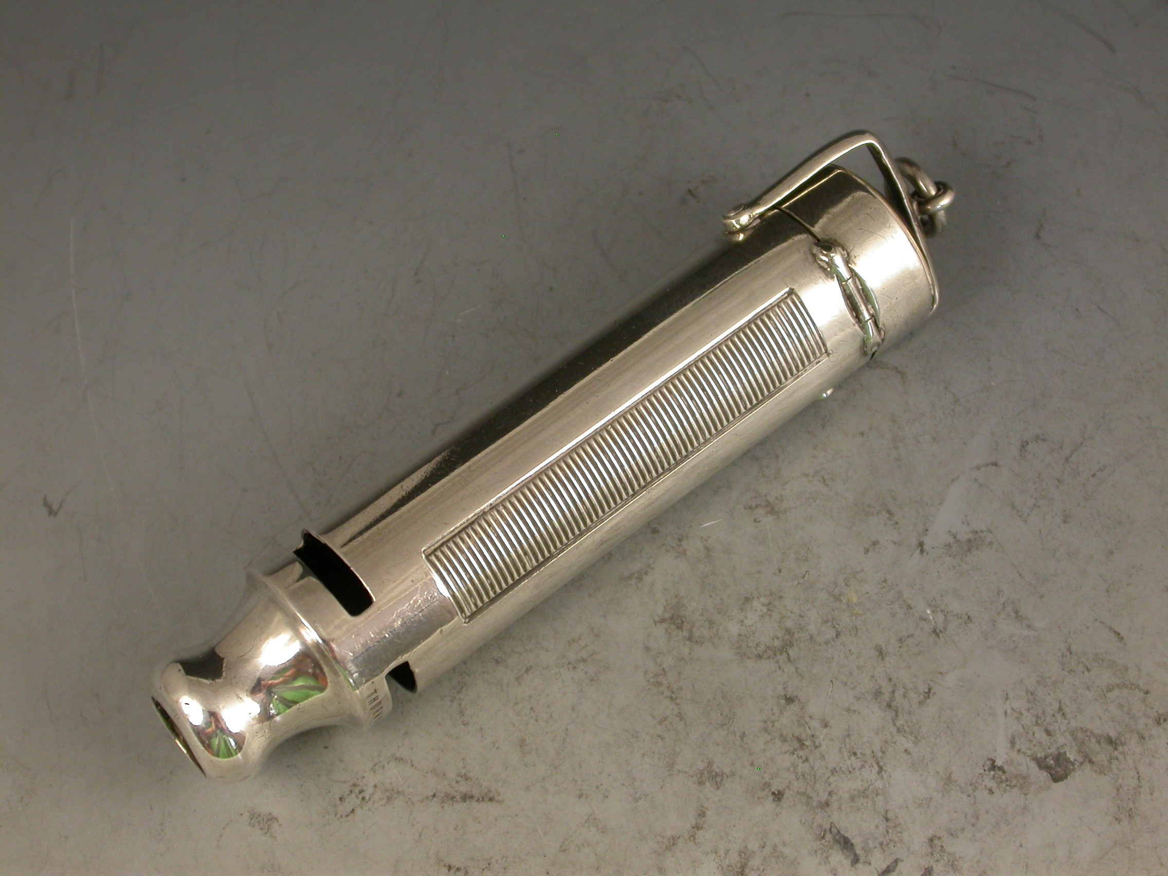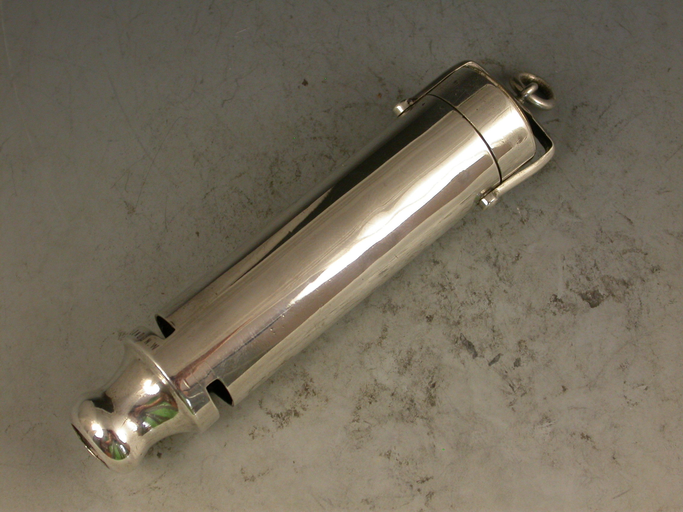 A rare Victorian novelty silver Vesta Case made in the form of a Whistle, combined with a working Compass to the hinged lid, with attached stirrup shaped suspension ring.