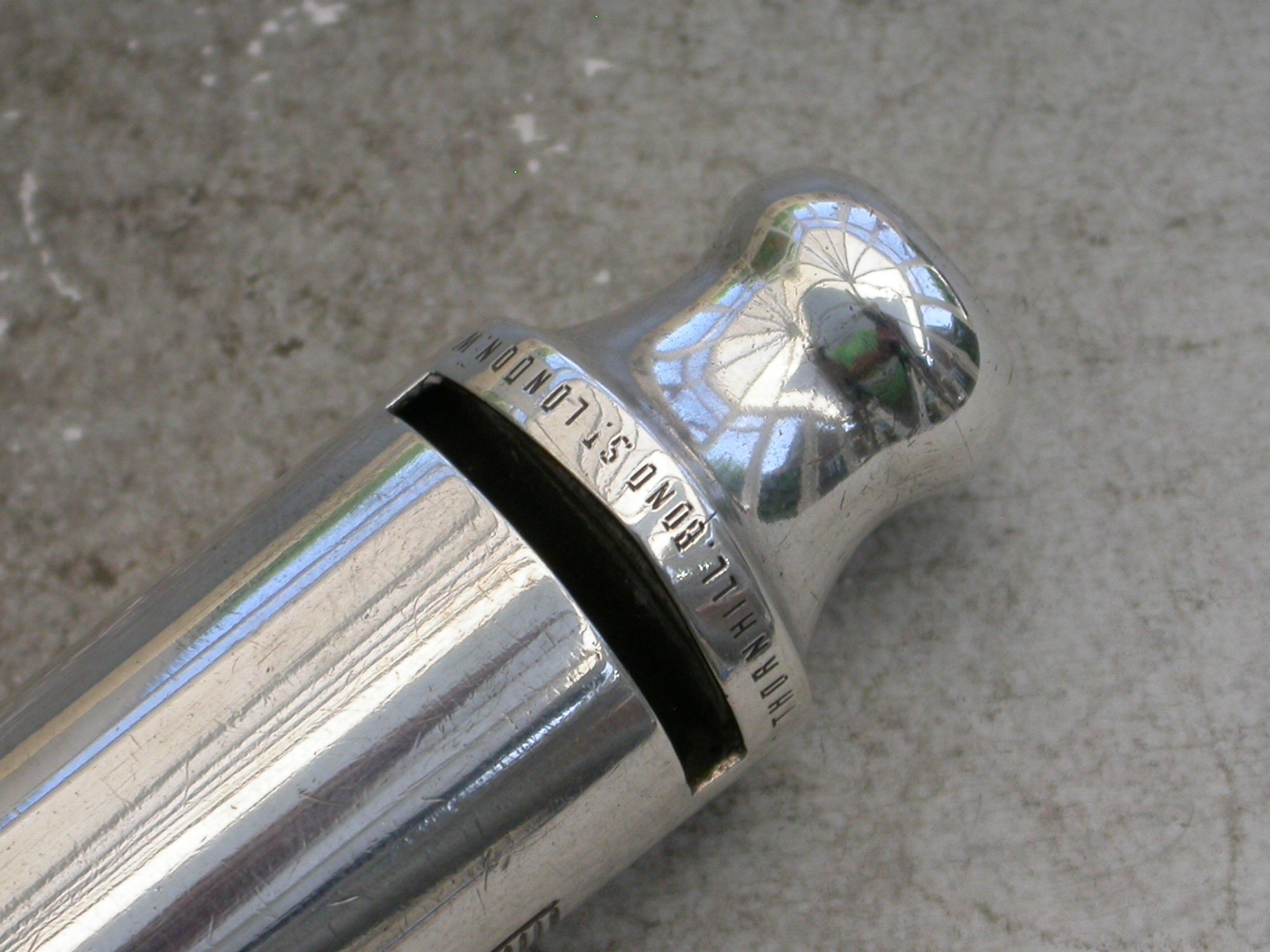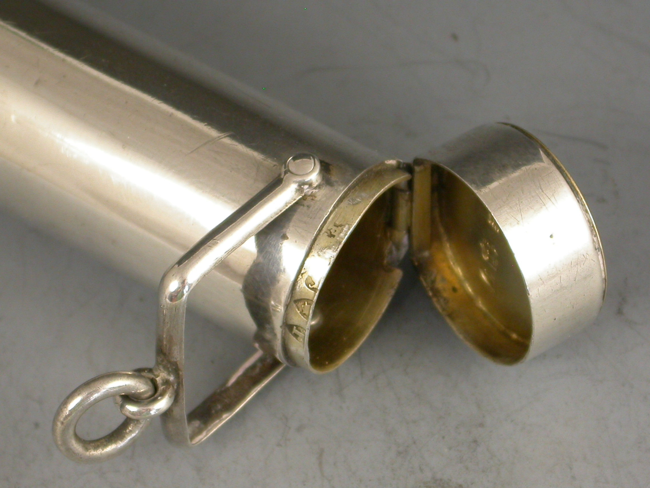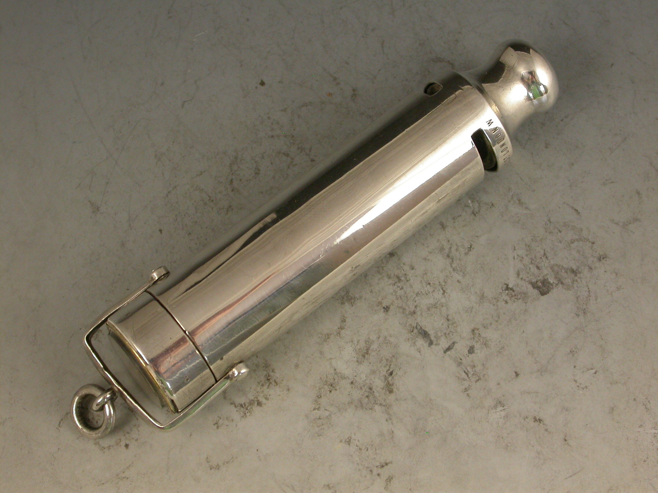 A rare Victorian novelty silver Vesta Case made in the form of a Whistle, combined with a working Compass to the hinged lid, with attached stirrup shaped suspension ring.