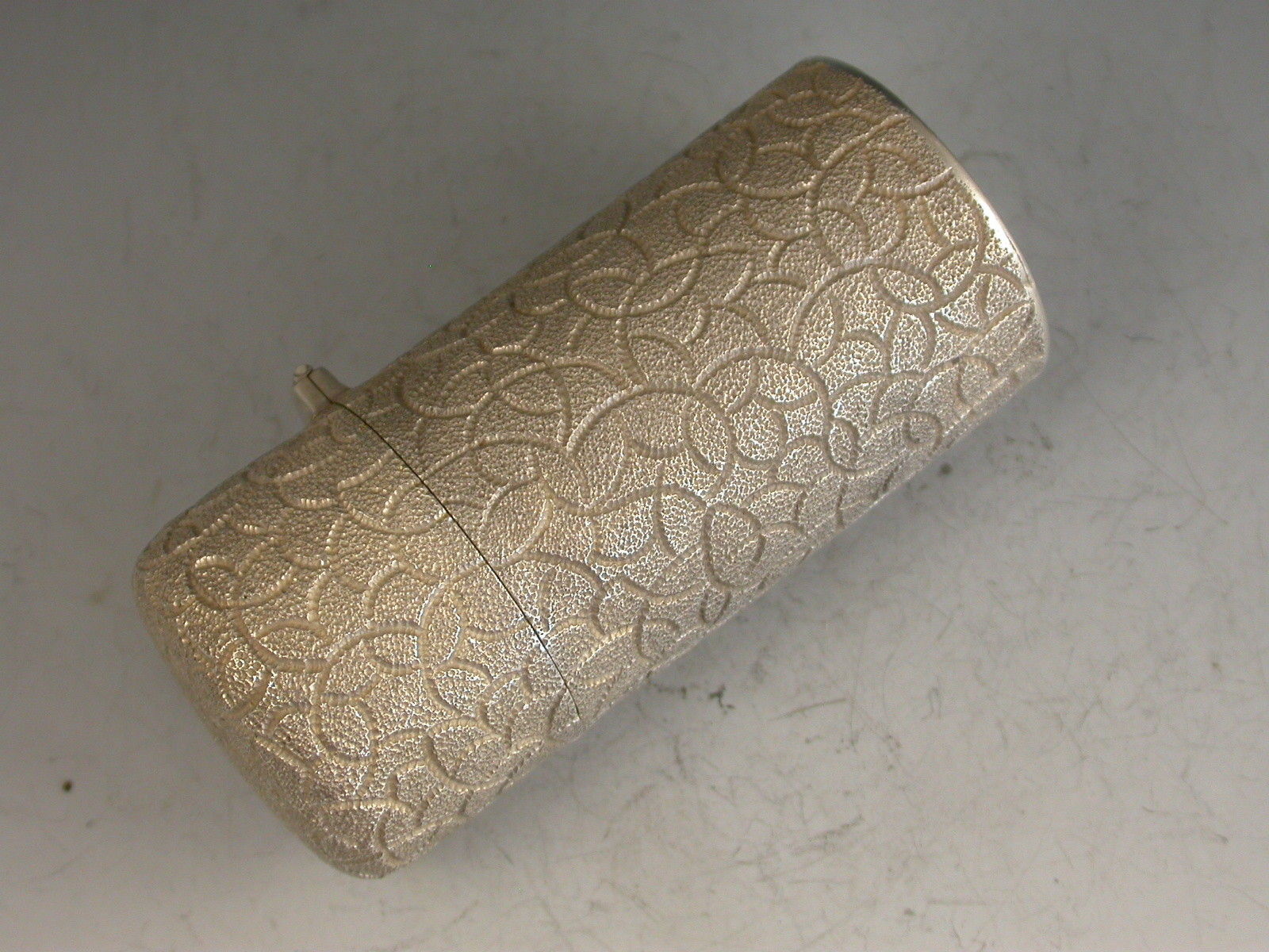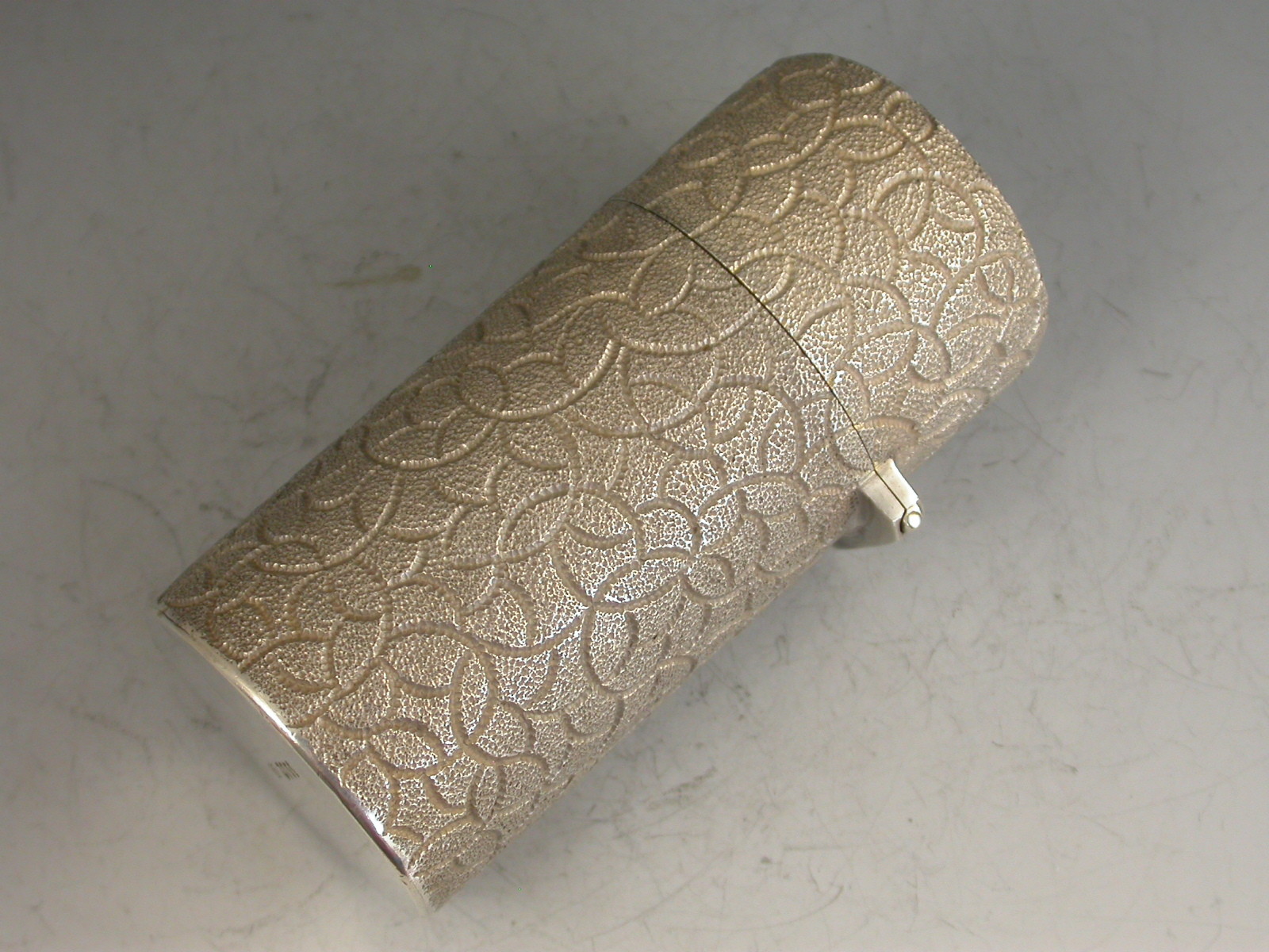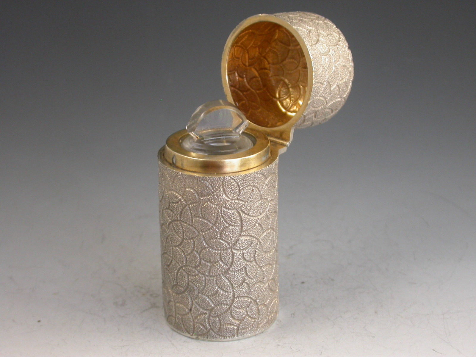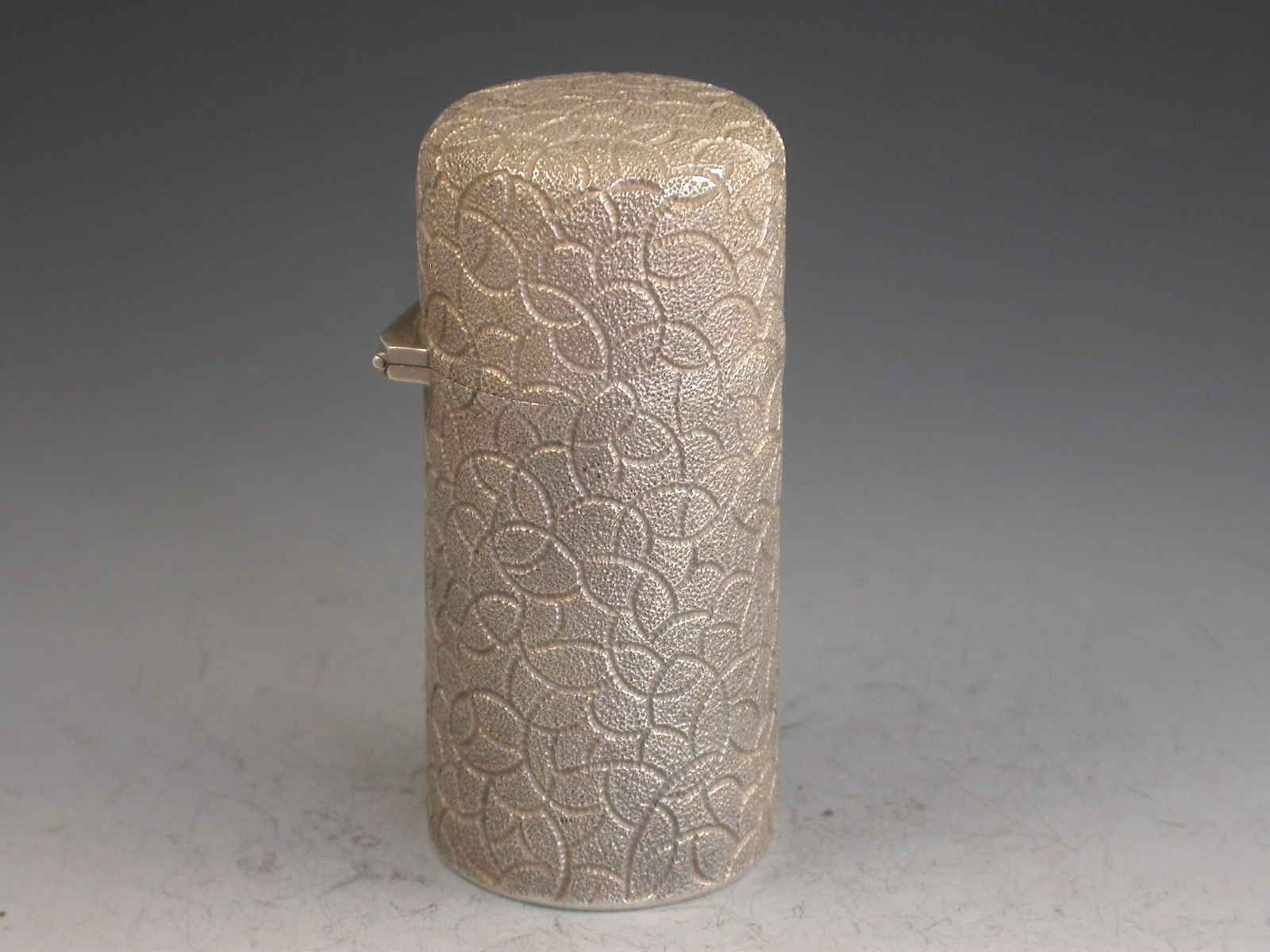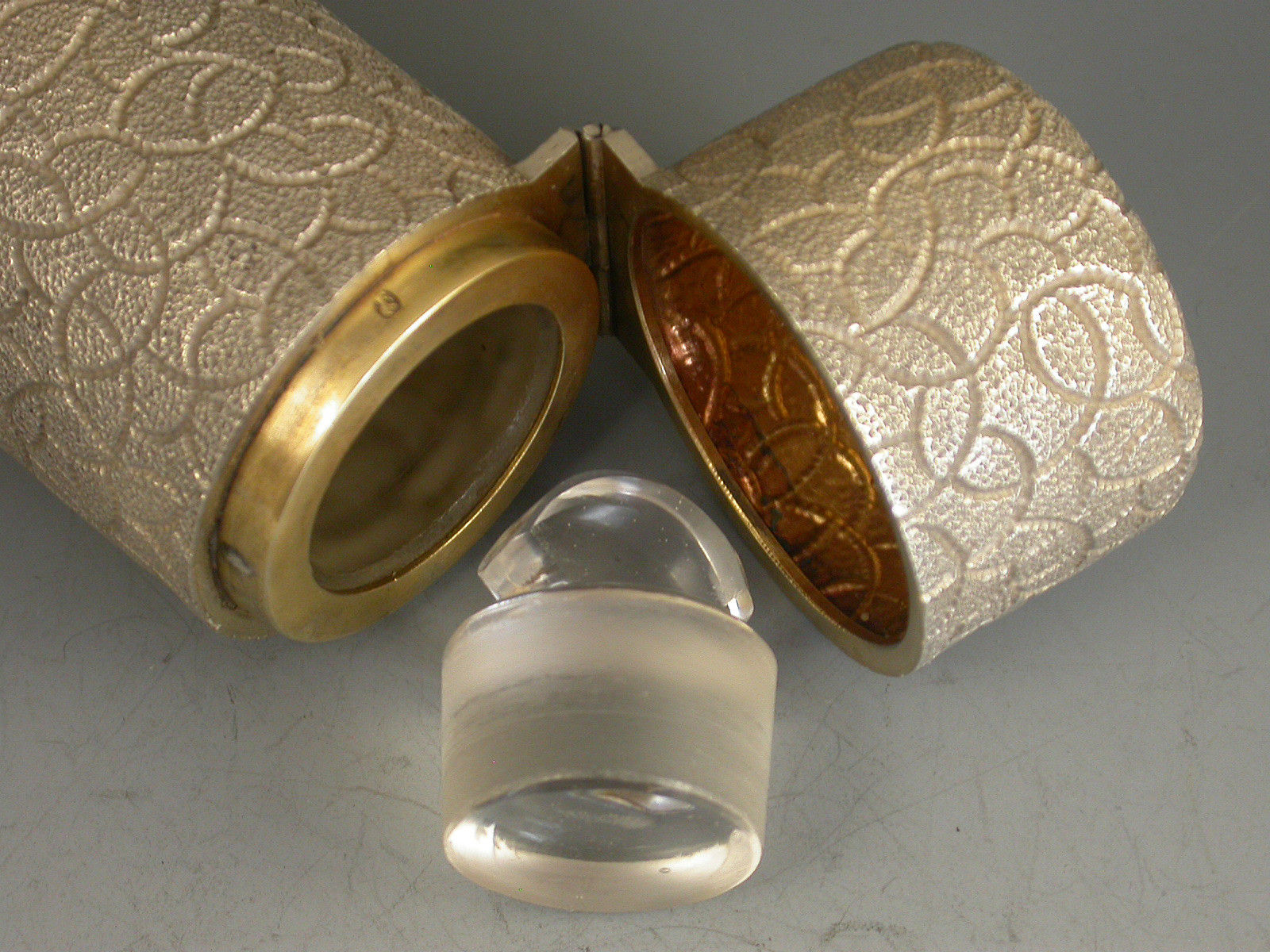 An unusual Victorian silver cylindrical Scent Bottle of larger than average size, the body deeply engraved with simulated crocodile skin decoration, the hinged cover opening to reveal a silver gilt interior with pull-out glass stopper.