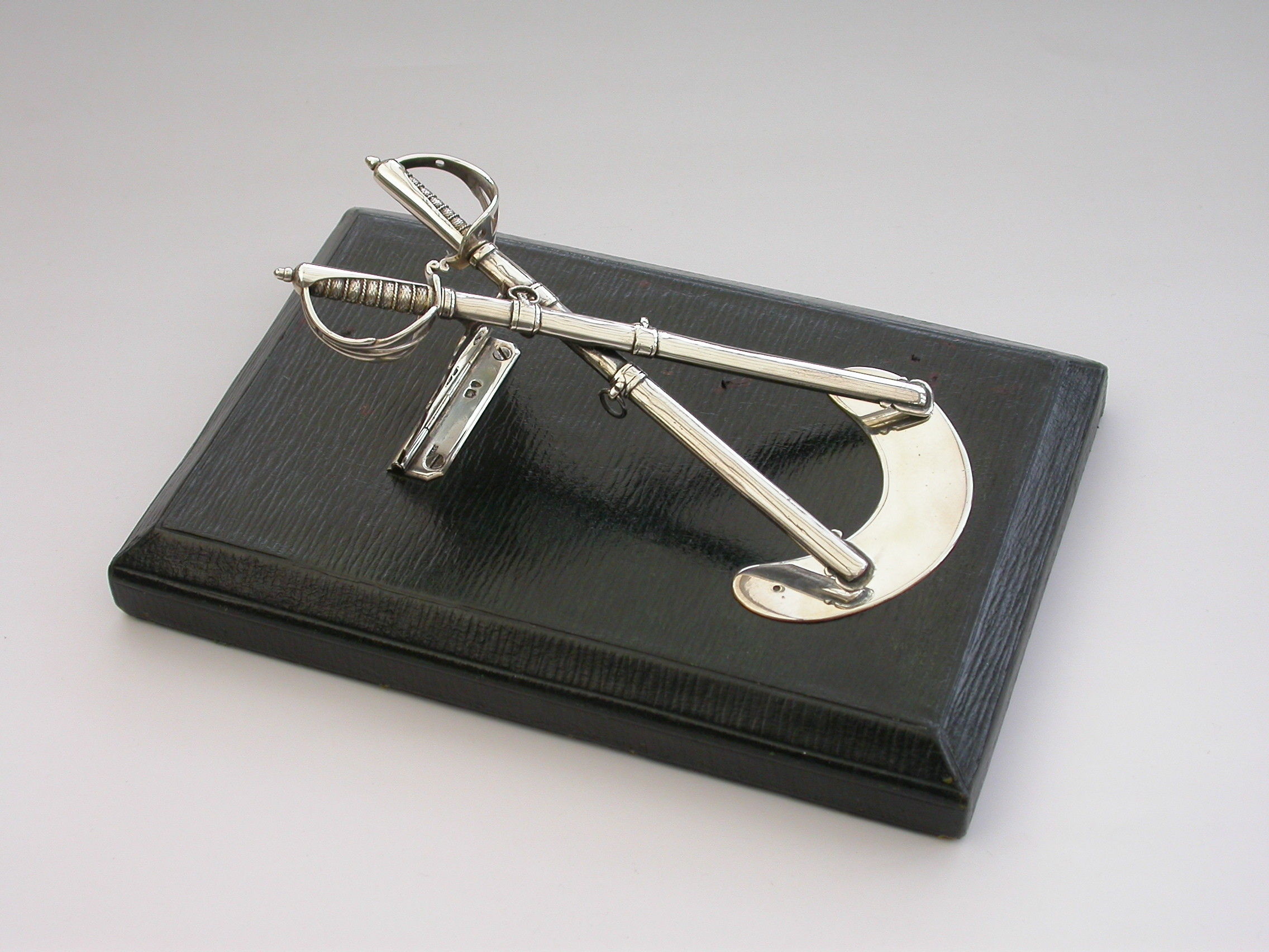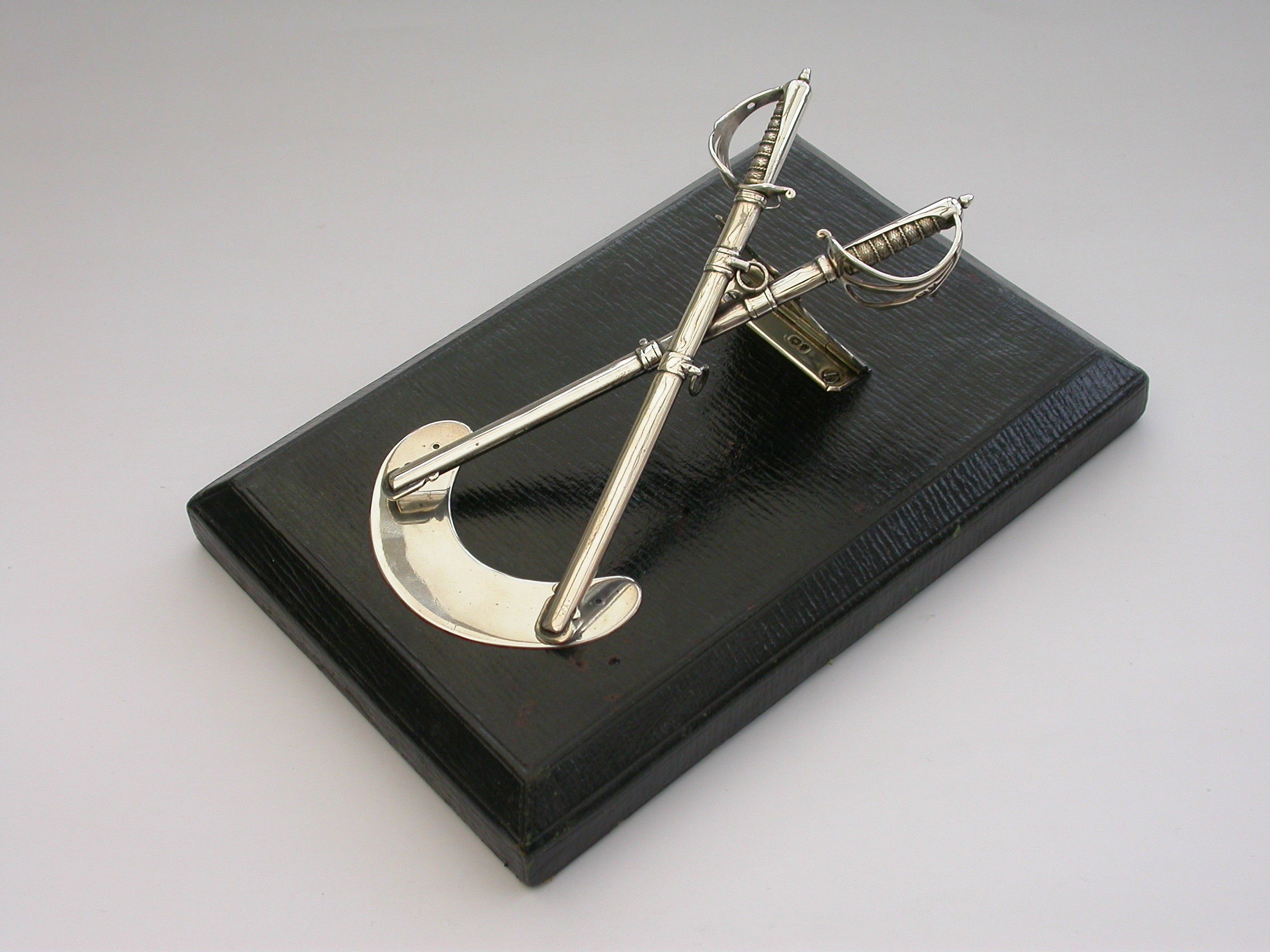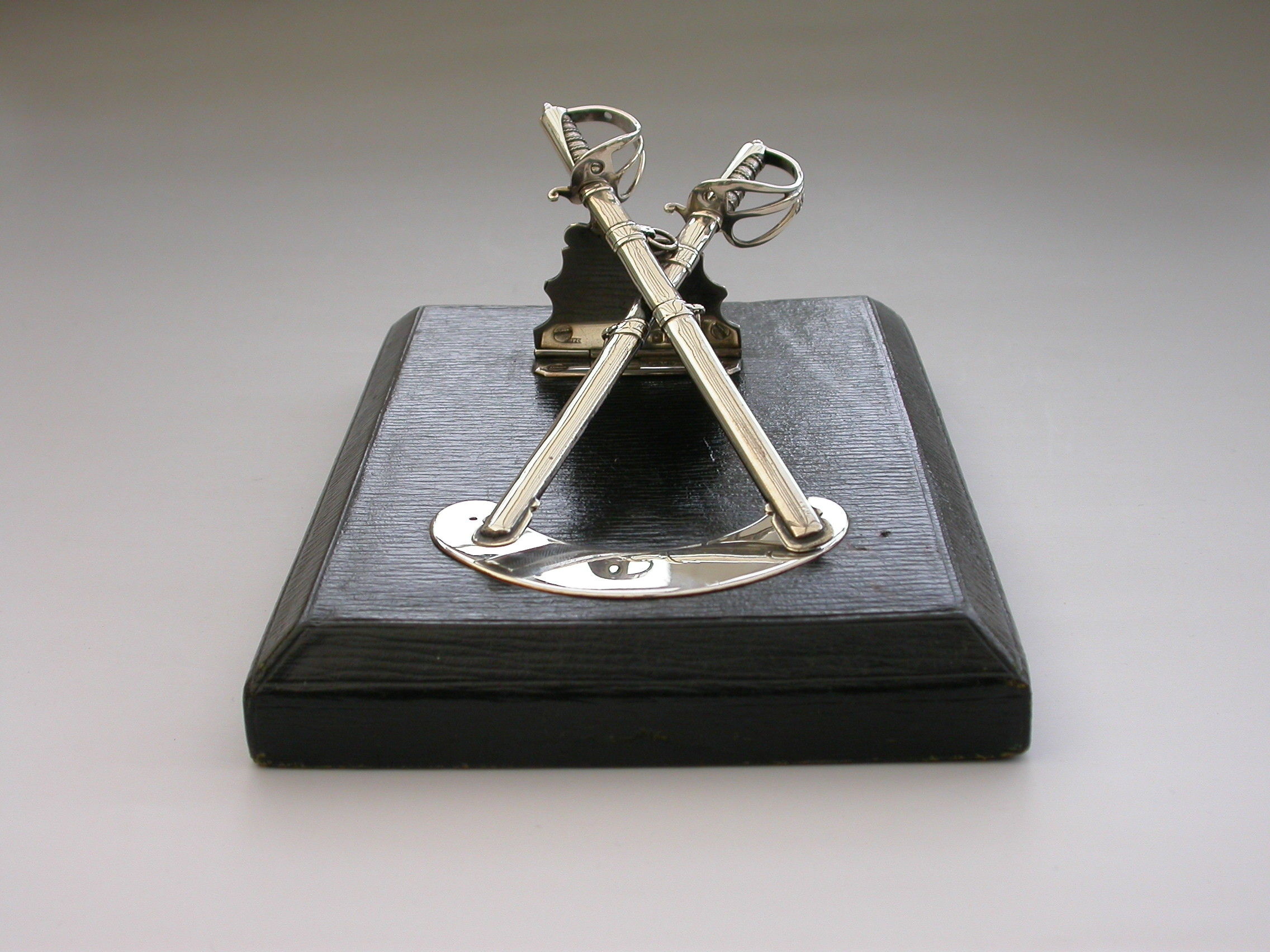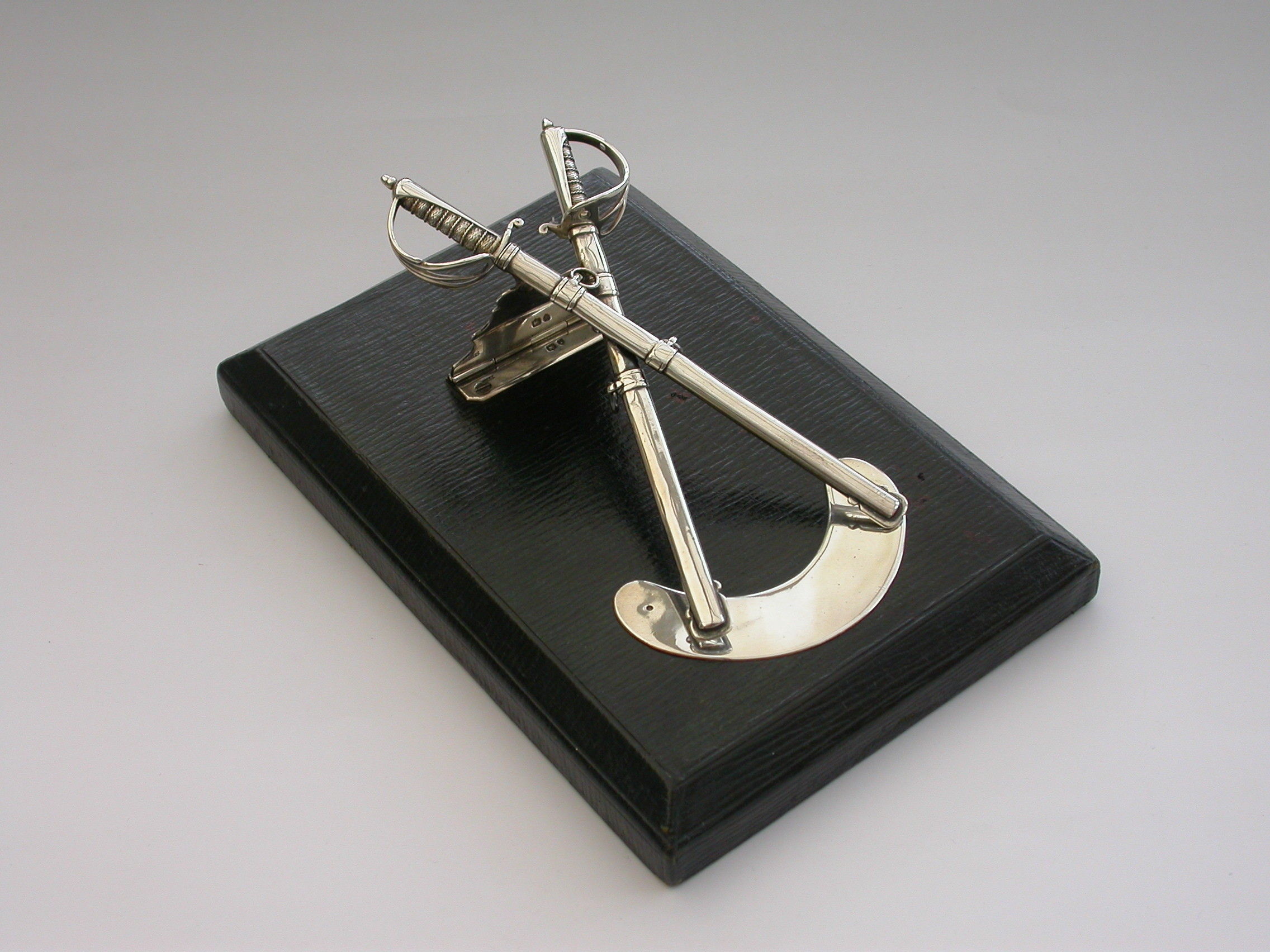 A Victorian silver Desk Clip mounted on a leather covered wooden base, formed as a crossed pair of British Officers Dress Swords complete with suspension rings and scabbards mounted on a sprung hinged stand. One sword is a propelling pencil and the other is a paper knife/letter opener.