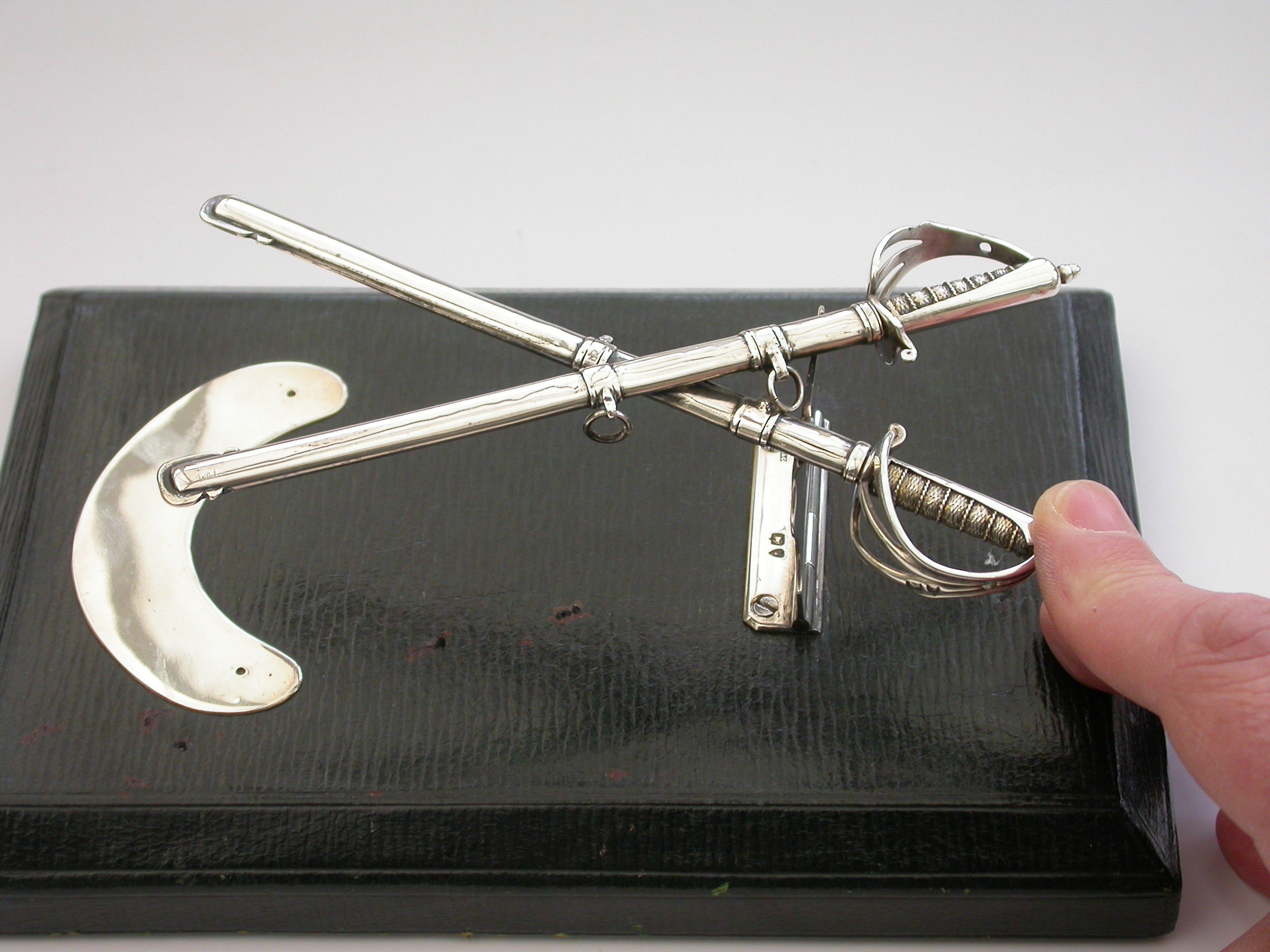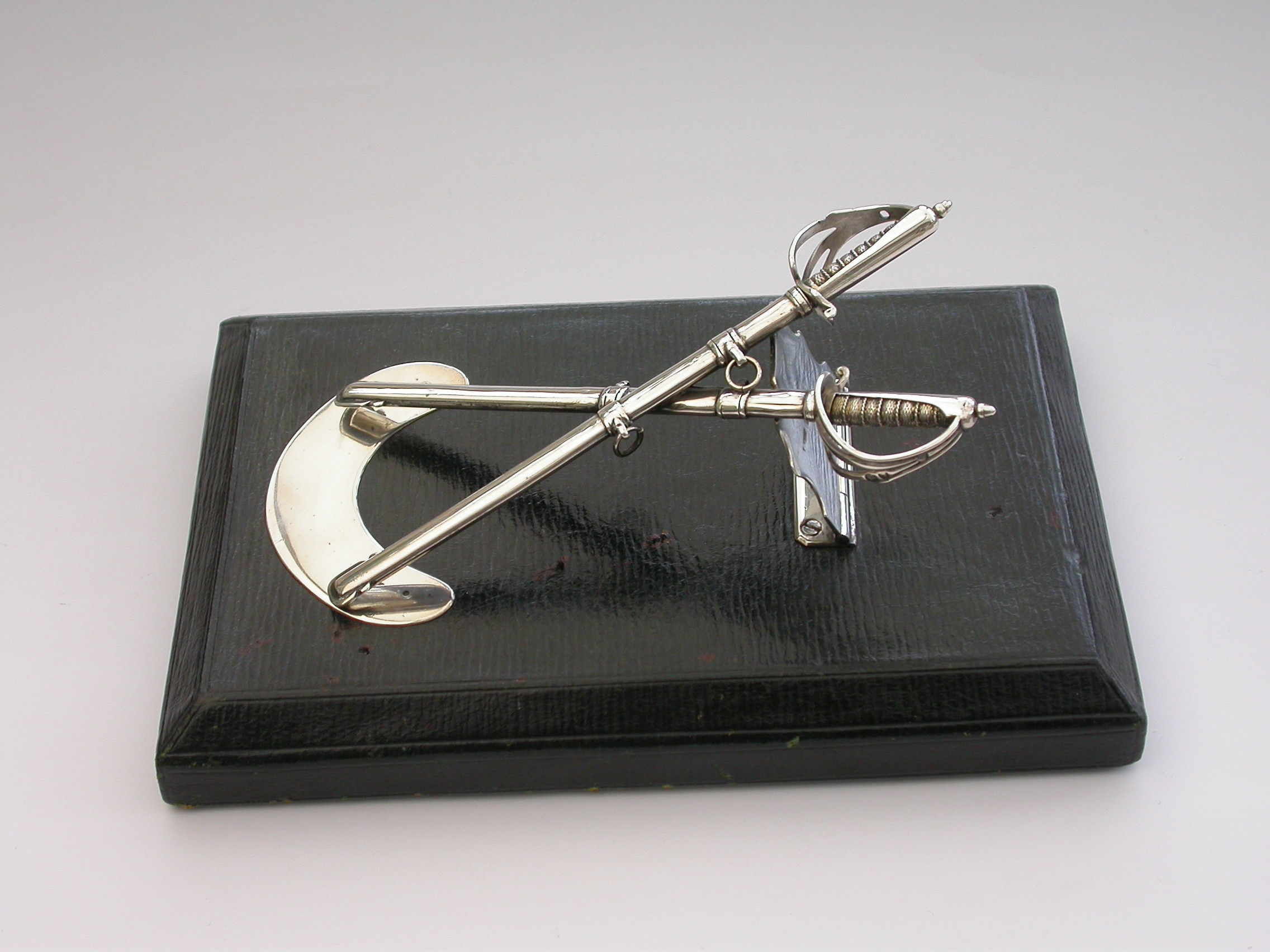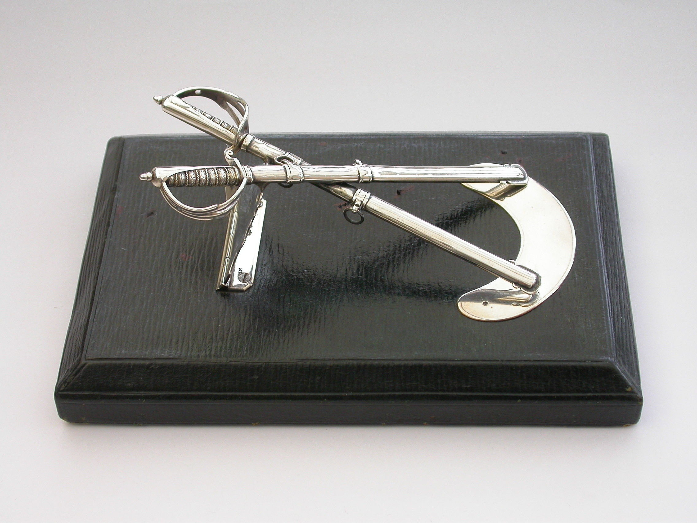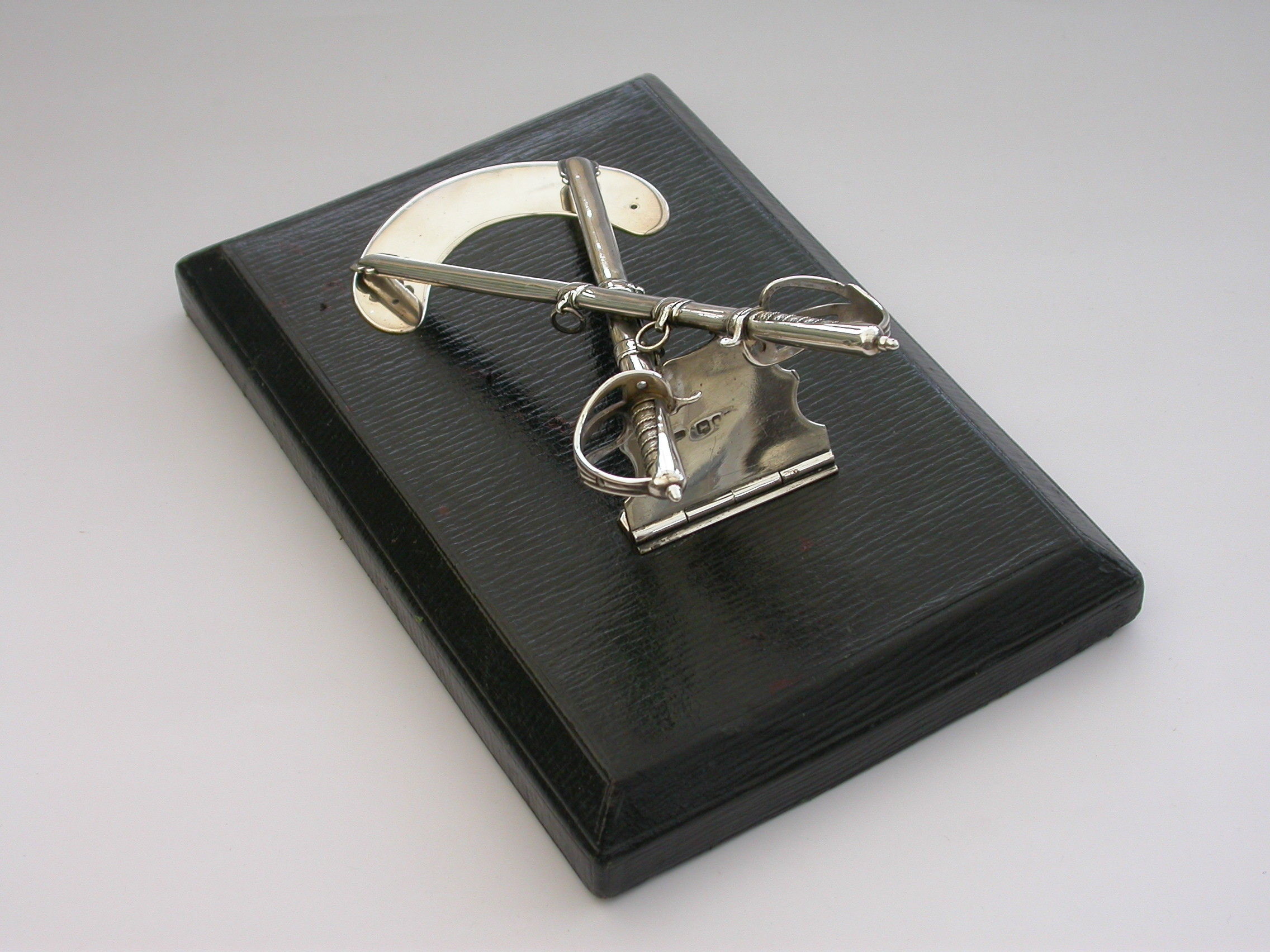 A Victorian silver Desk Clip mounted on a leather covered wooden base, formed as a crossed pair of British Officers Dress Swords complete with suspension rings and scabbards mounted on a sprung hinged stand. One sword is a propelling pencil and the other is a paper knife/letter opener.