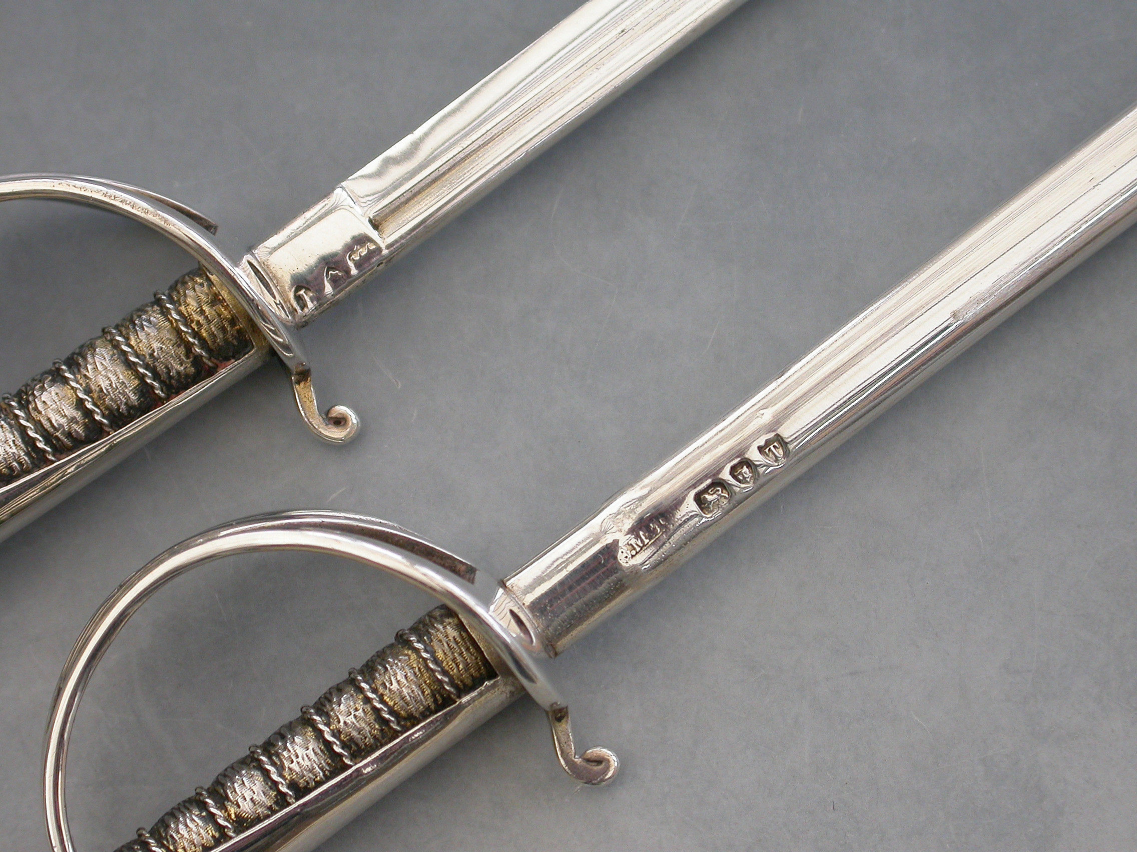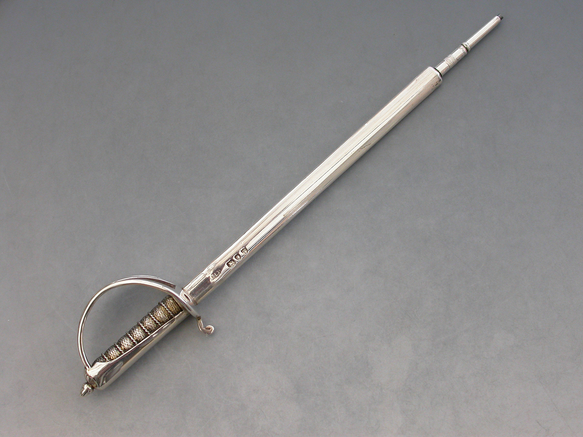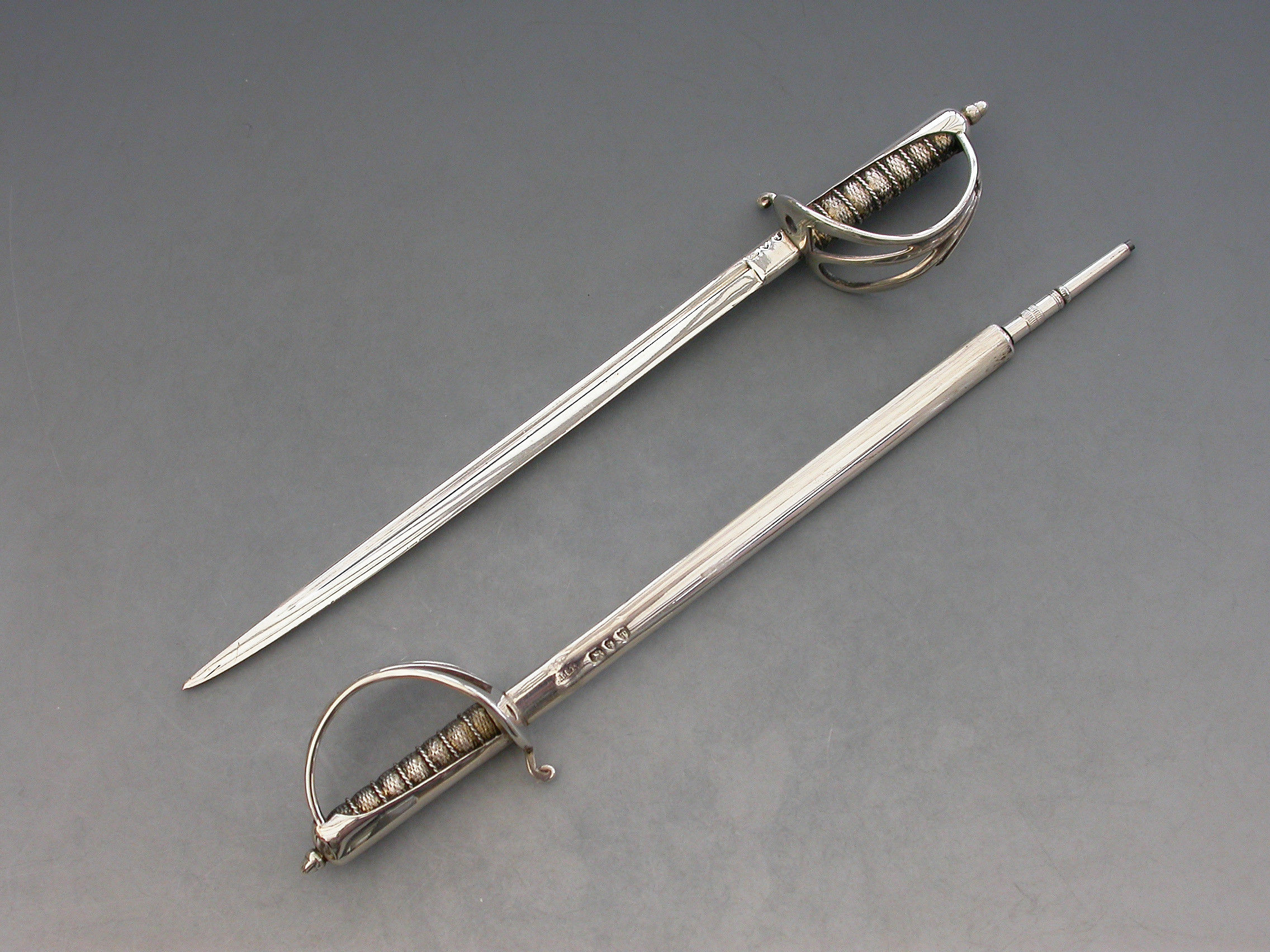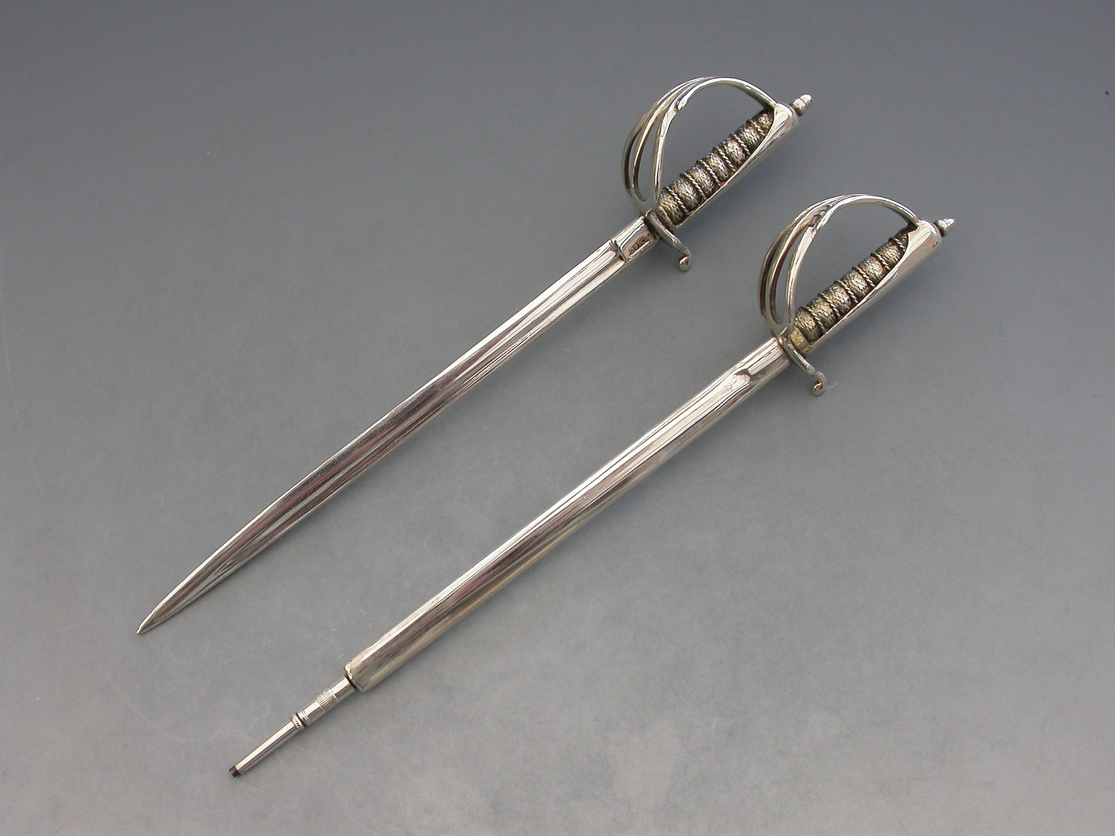 A Victorian silver Desk Clip mounted on a leather covered wooden base, formed as a crossed pair of British Officers Dress Swords complete with suspension rings and scabbards mounted on a sprung hinged stand. One sword is a propelling pencil and the other is a paper knife/letter opener.