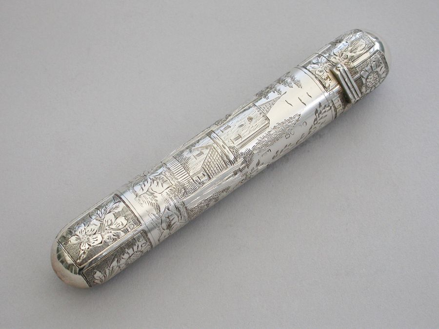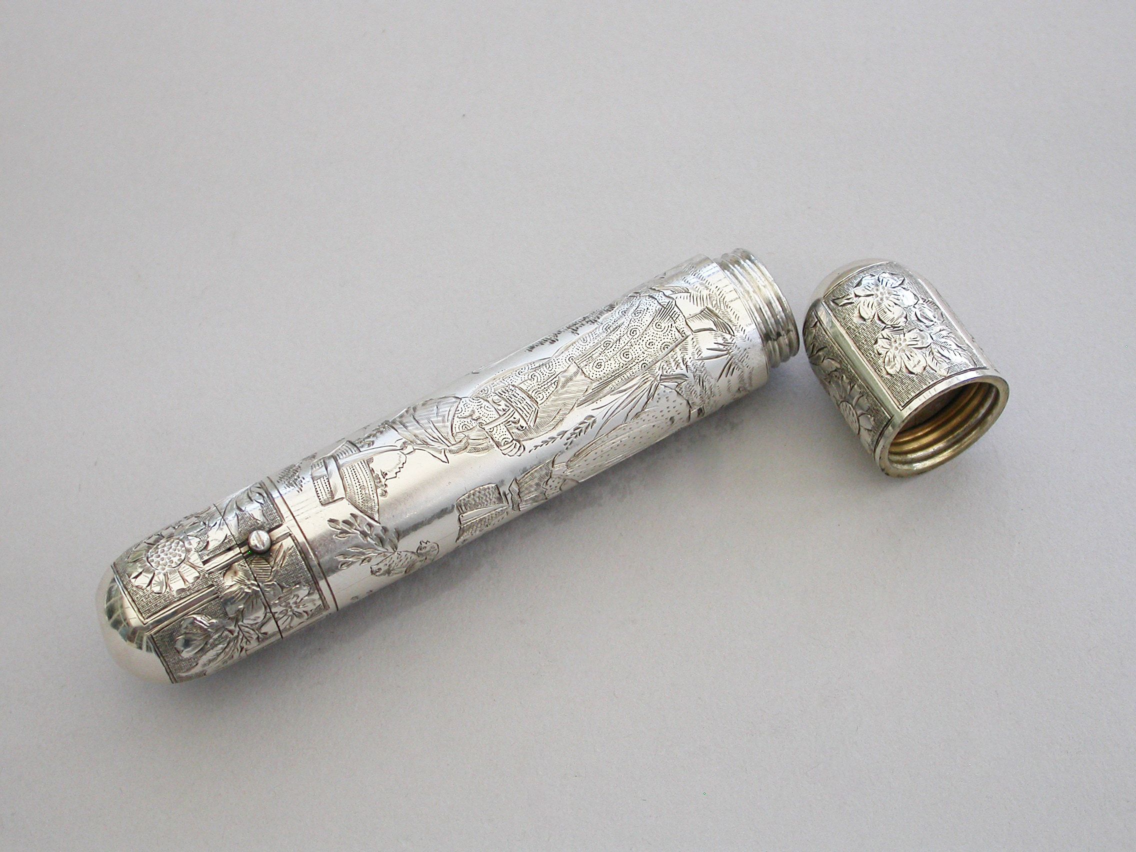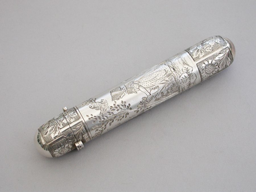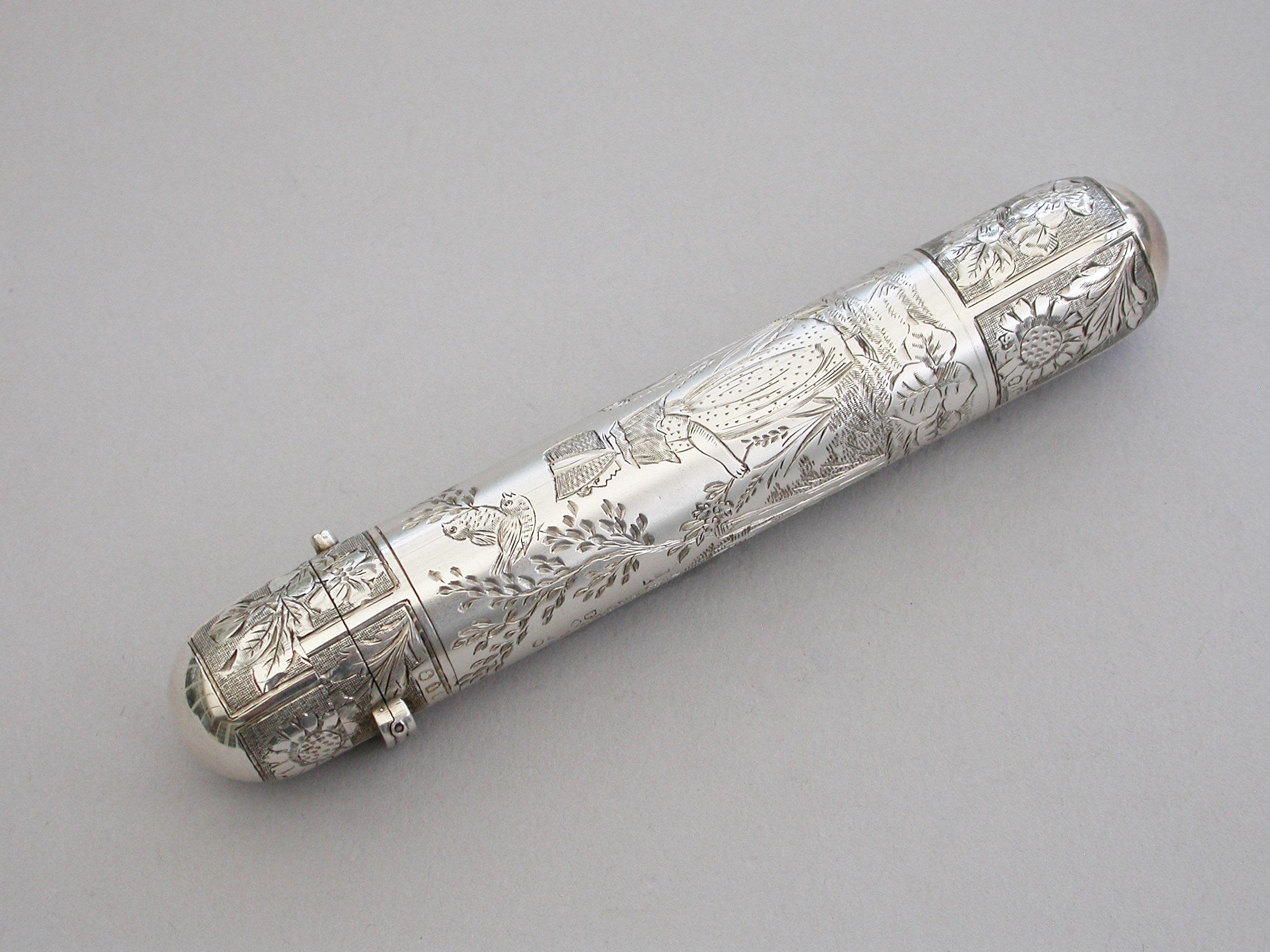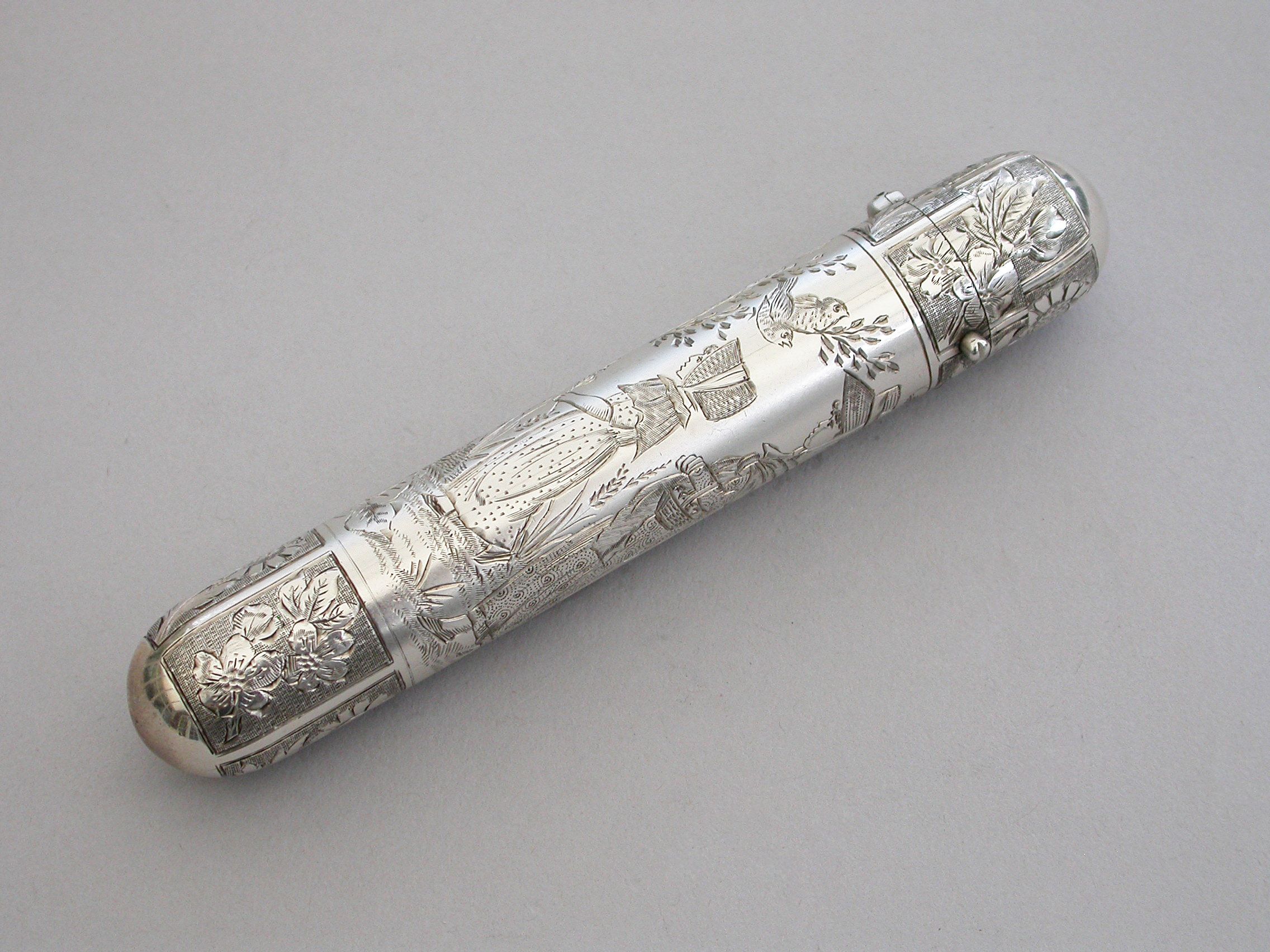 A fine Victorian silver double ended Scent Bottle engraved with Kate Greenaway style decoration depicting two girls in period costume walking in a garden scene with birds and flowers, a church in the background. One end with a sprung hinged lid, the other with screw off cap and cork stopper. Gilded interiors.