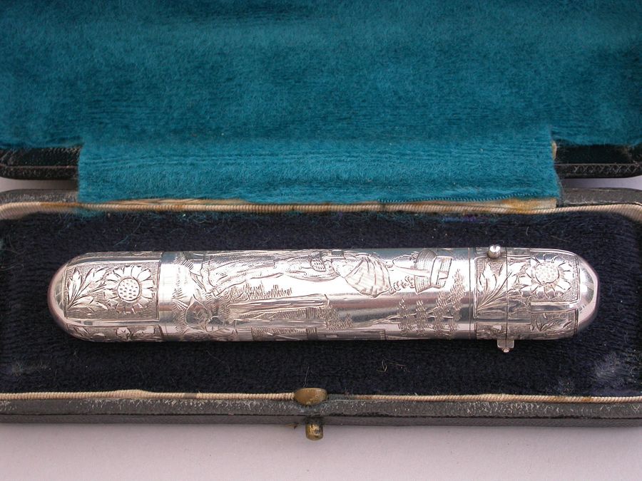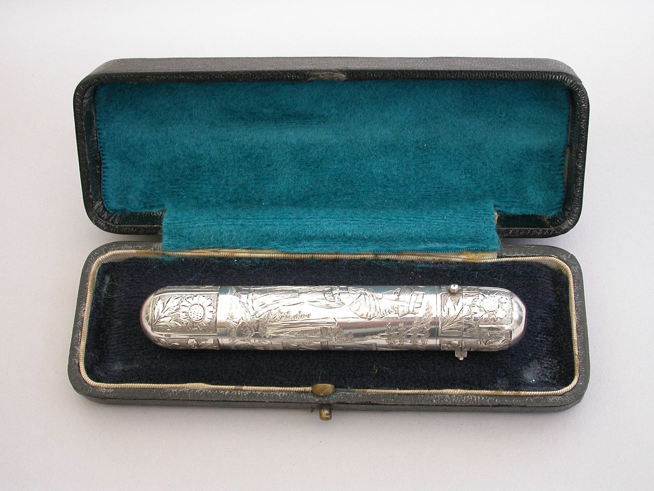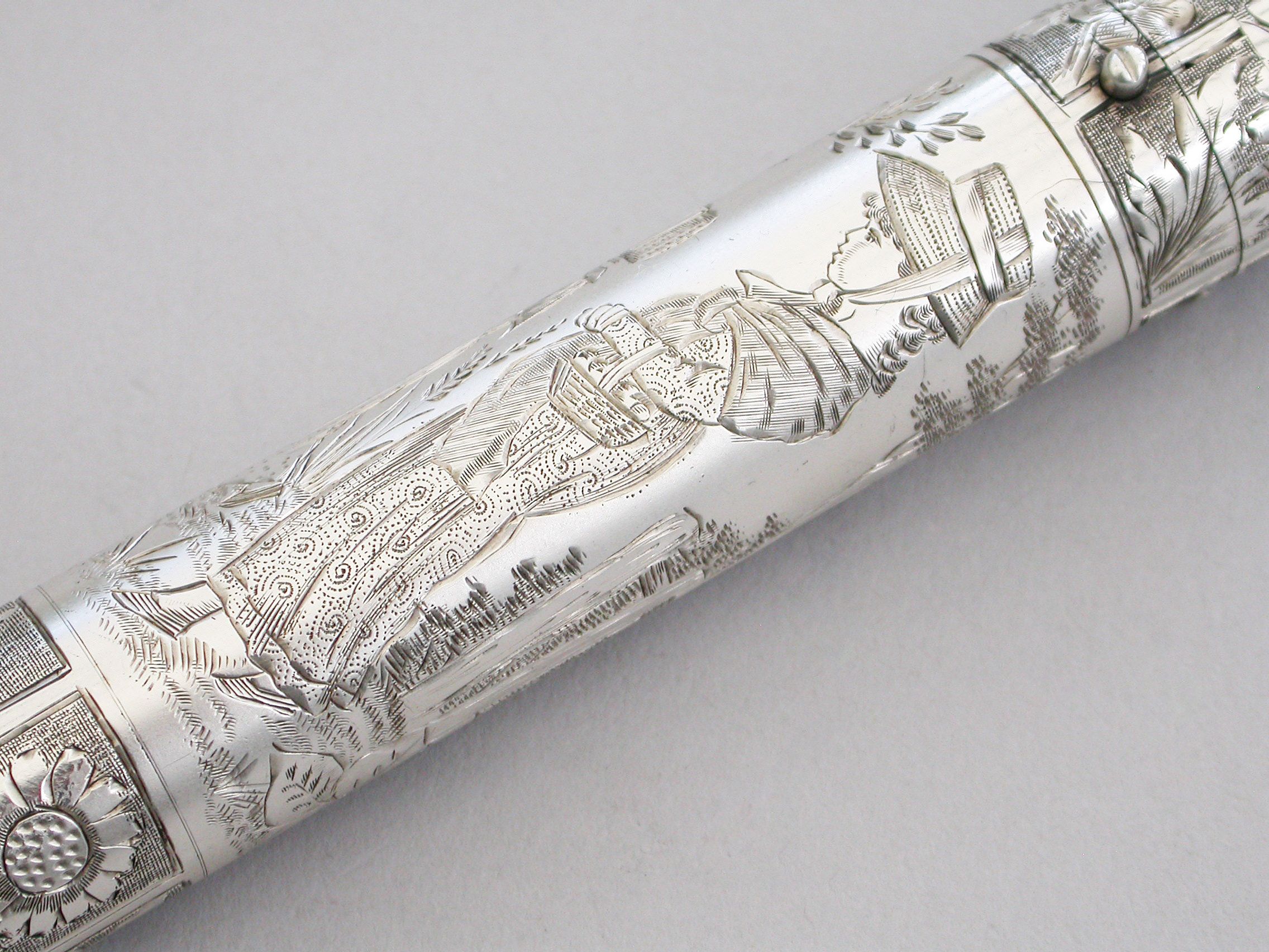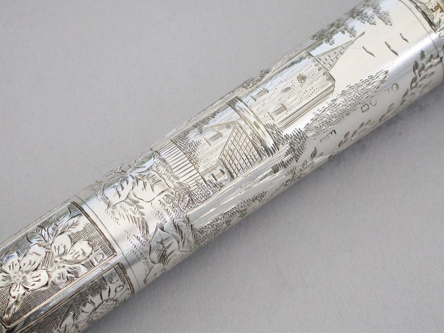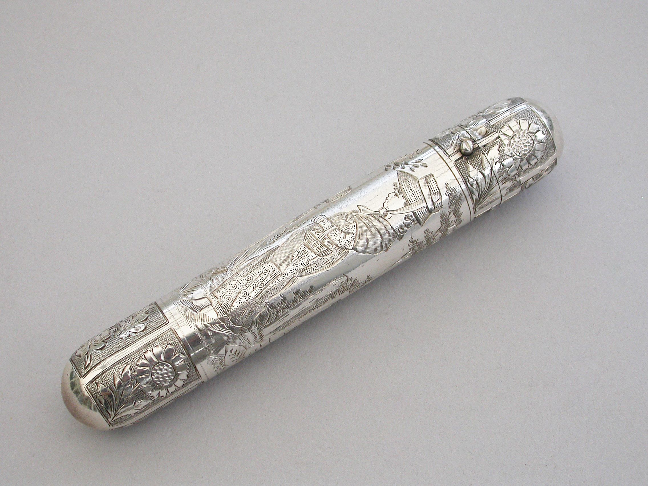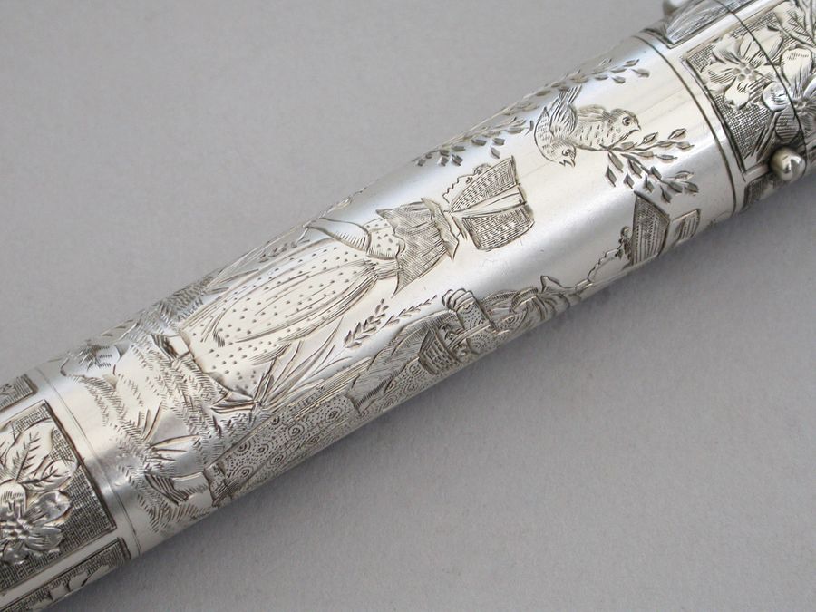 A fine Victorian silver double ended Scent Bottle engraved with Kate Greenaway style decoration depicting two girls in period costume walking in a garden scene with birds and flowers, a church in the background. One end with a sprung hinged lid, the other with screw off cap and cork stopper. Gilded interiors.