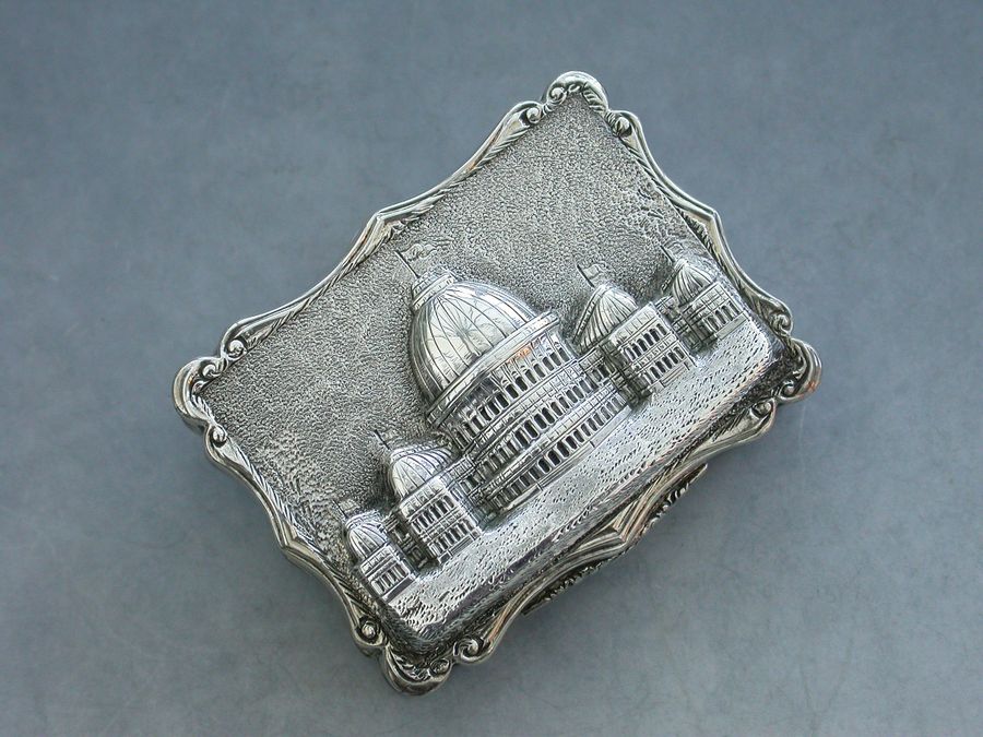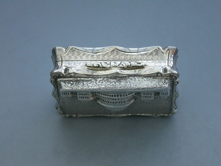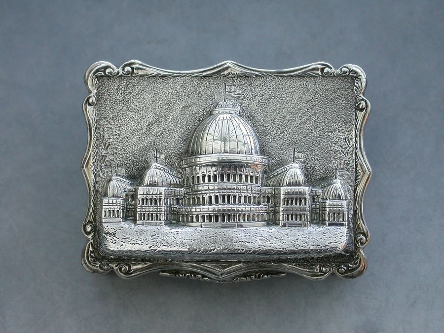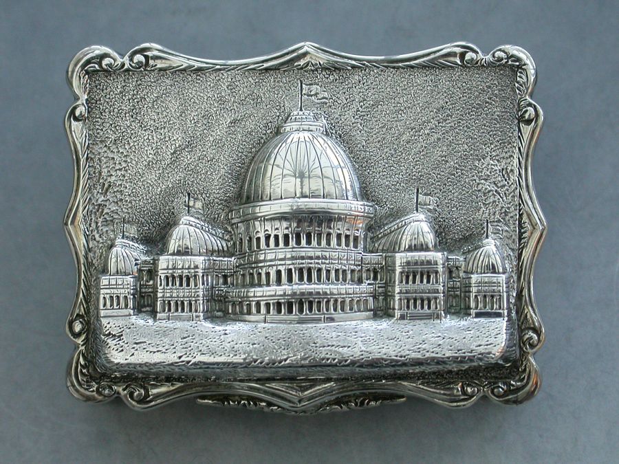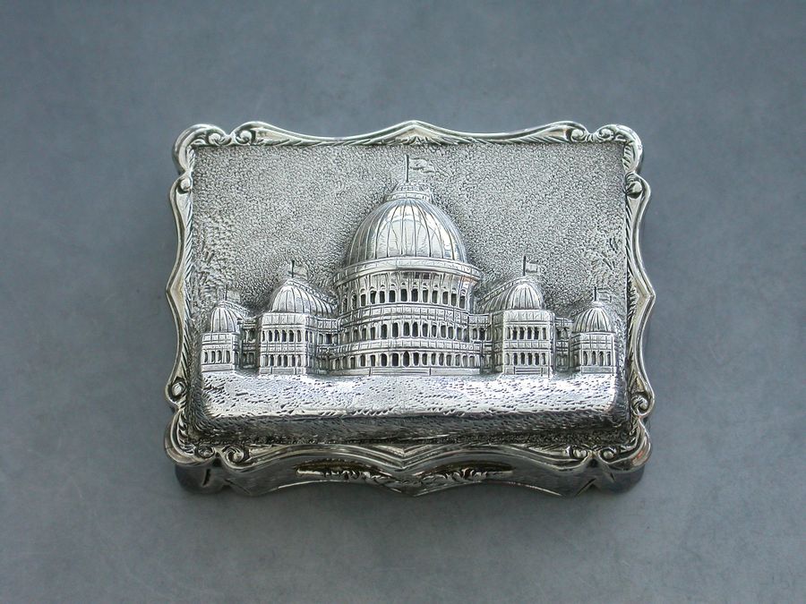 An extremely rare Victorian silver “Castle Top” Vinaigrette of shaped rectangular form, the base and sides engraved with engine turned decoration and a cartouche engraved with a presentation inscription, the lid decorated with a scene depicting the “Industrial Exhibition Building” in Dublin, Ireland in high relief. The silver gilt interior with scroll pierced grille.