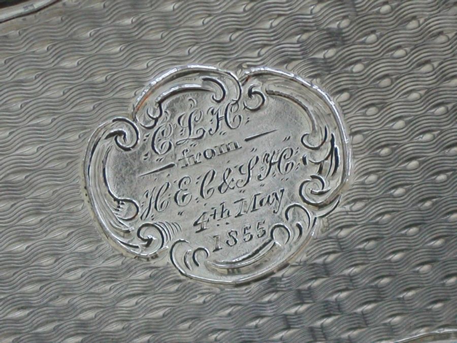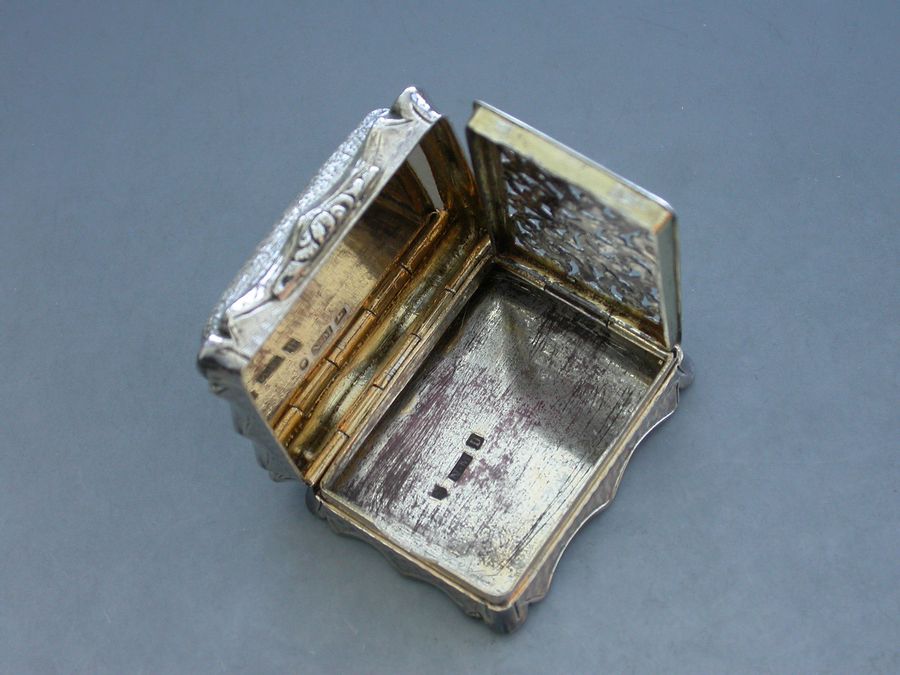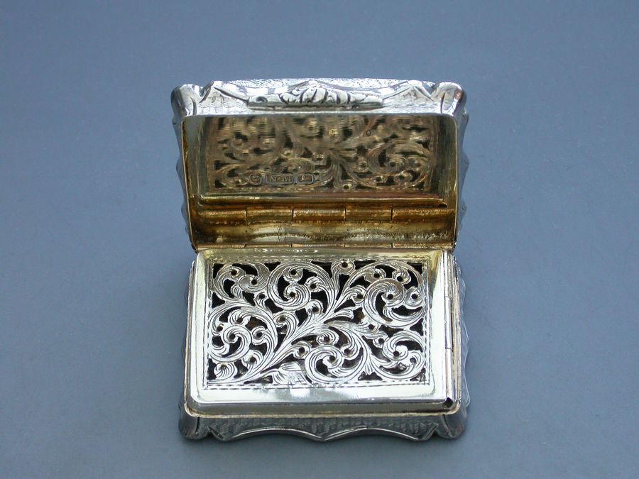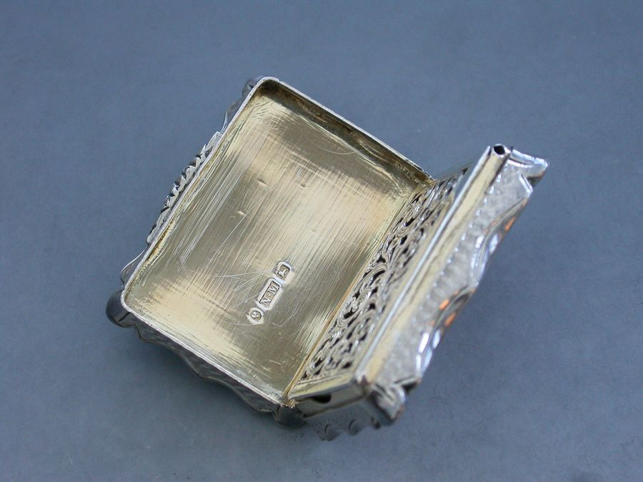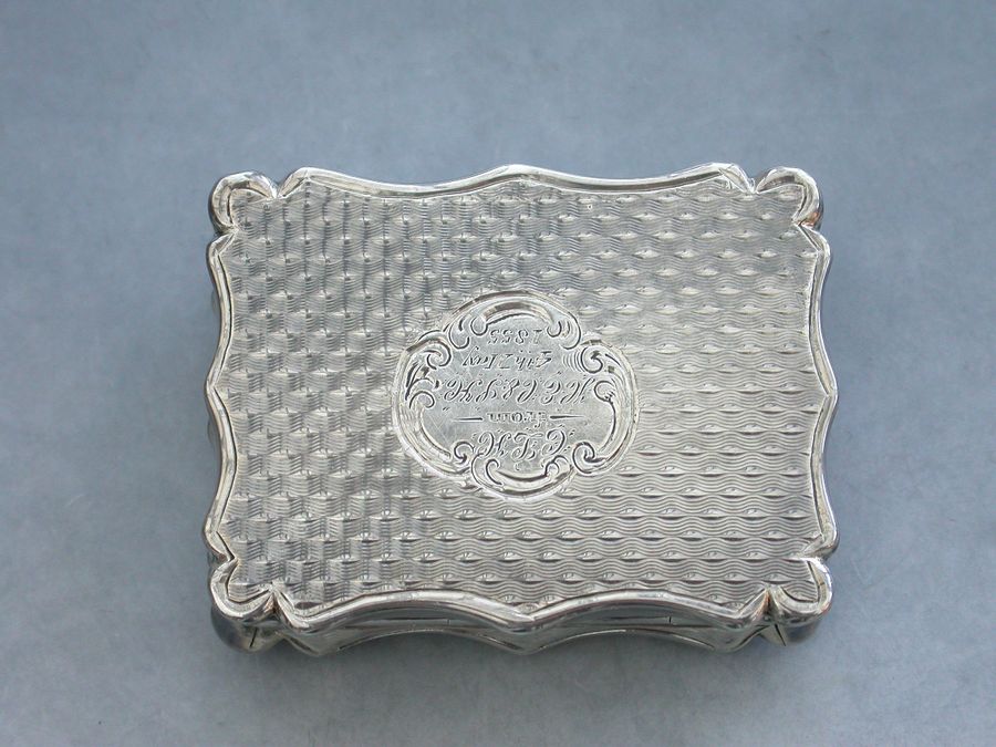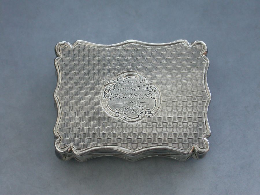 An extremely rare Victorian silver “Castle Top” Vinaigrette of shaped rectangular form, the base and sides engraved with engine turned decoration and a cartouche engraved with a presentation inscription, the lid decorated with a scene depicting the “Industrial Exhibition Building” in Dublin, Ireland in high relief. The silver gilt interior with scroll pierced grille.