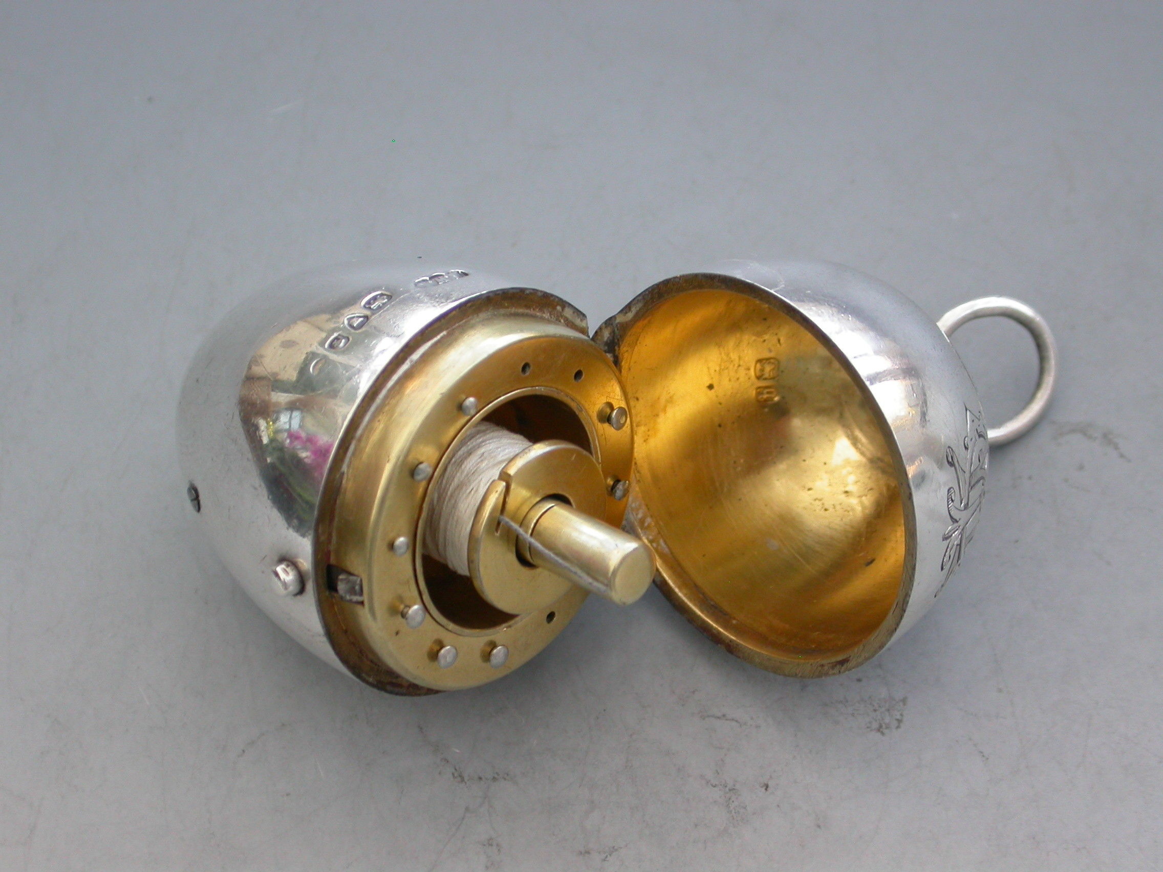 A very fine Victorian silver egg shaped Sewing Etui, the plain silver body engraved with a Viscount's Coronet and Cypher, a push button mechanism to the hinged lid opening to reveal the silver gilt interior complete with a contemporary silver thimble, silk bobbins, a needle case with pull-off cover and pins stored in the pierced rim.