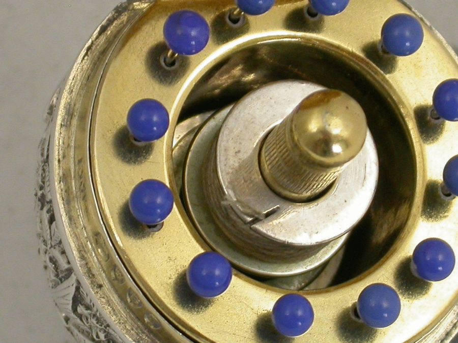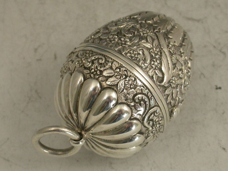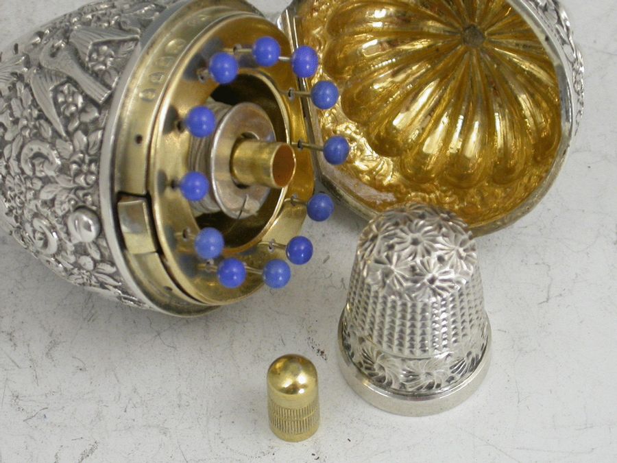 A very fine Victorian silver egg shaped Sewing Etui, the partly fluted body profusely chased and engraved with exotic birds amongst foliage. The hinged cover opening to reveal the gilded interior fitted with two bobbins, a tape measure, a pin holder and a needle case. Also containing a slightly later thimble (by Henry Griffiths, Chester 1887). Suspension ring to lid.
