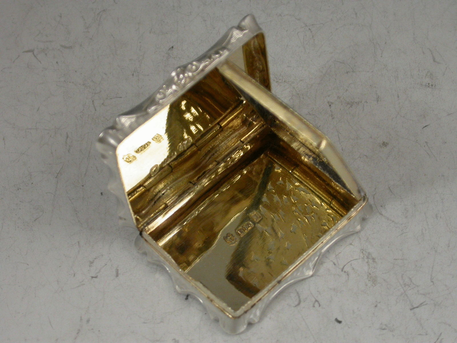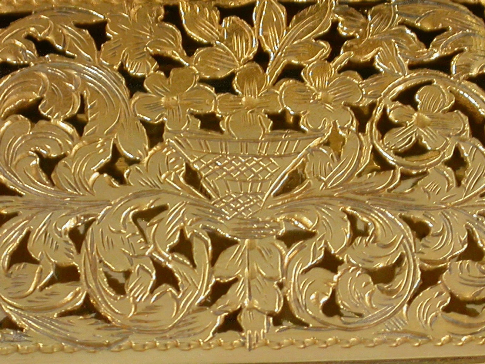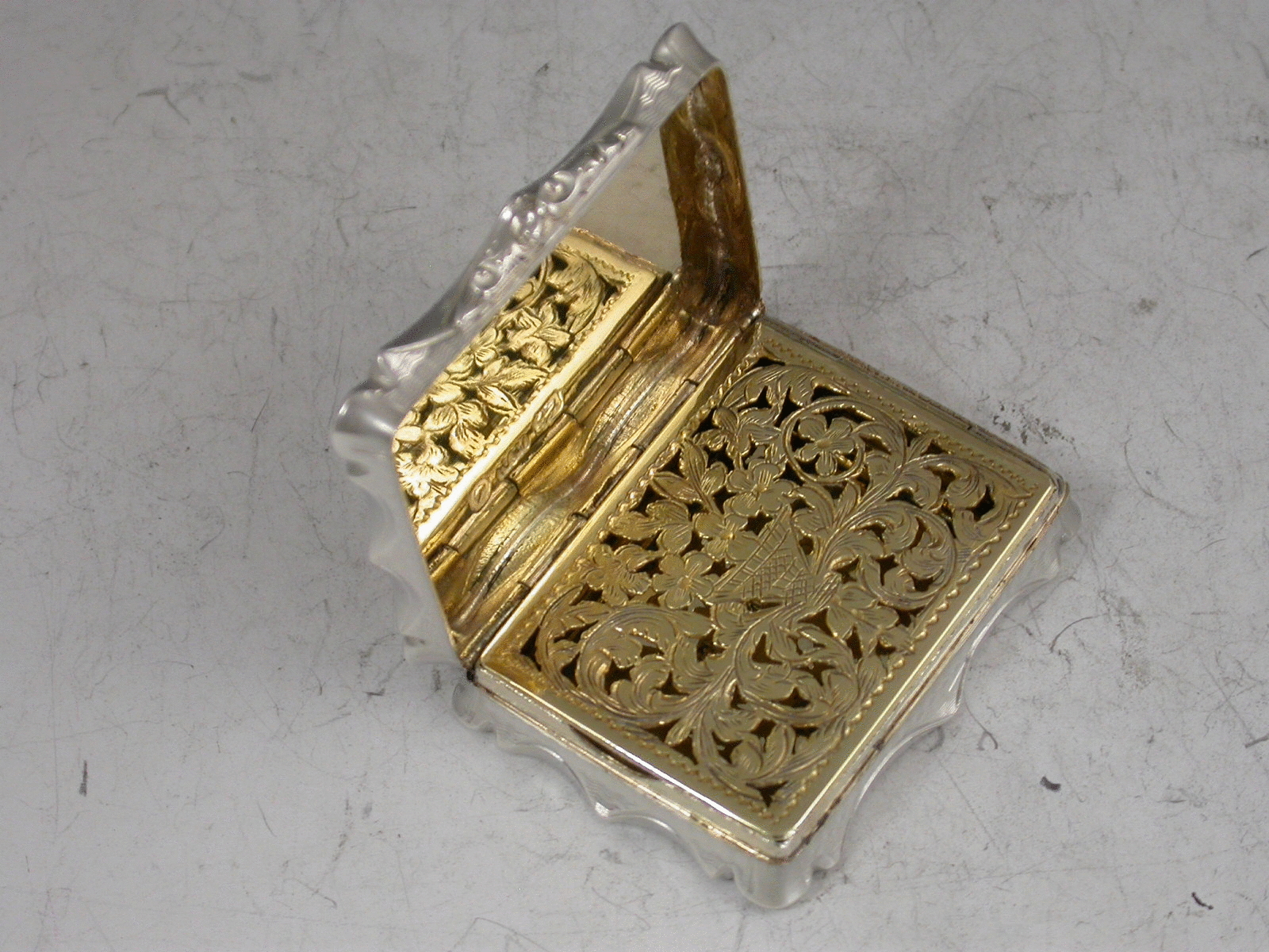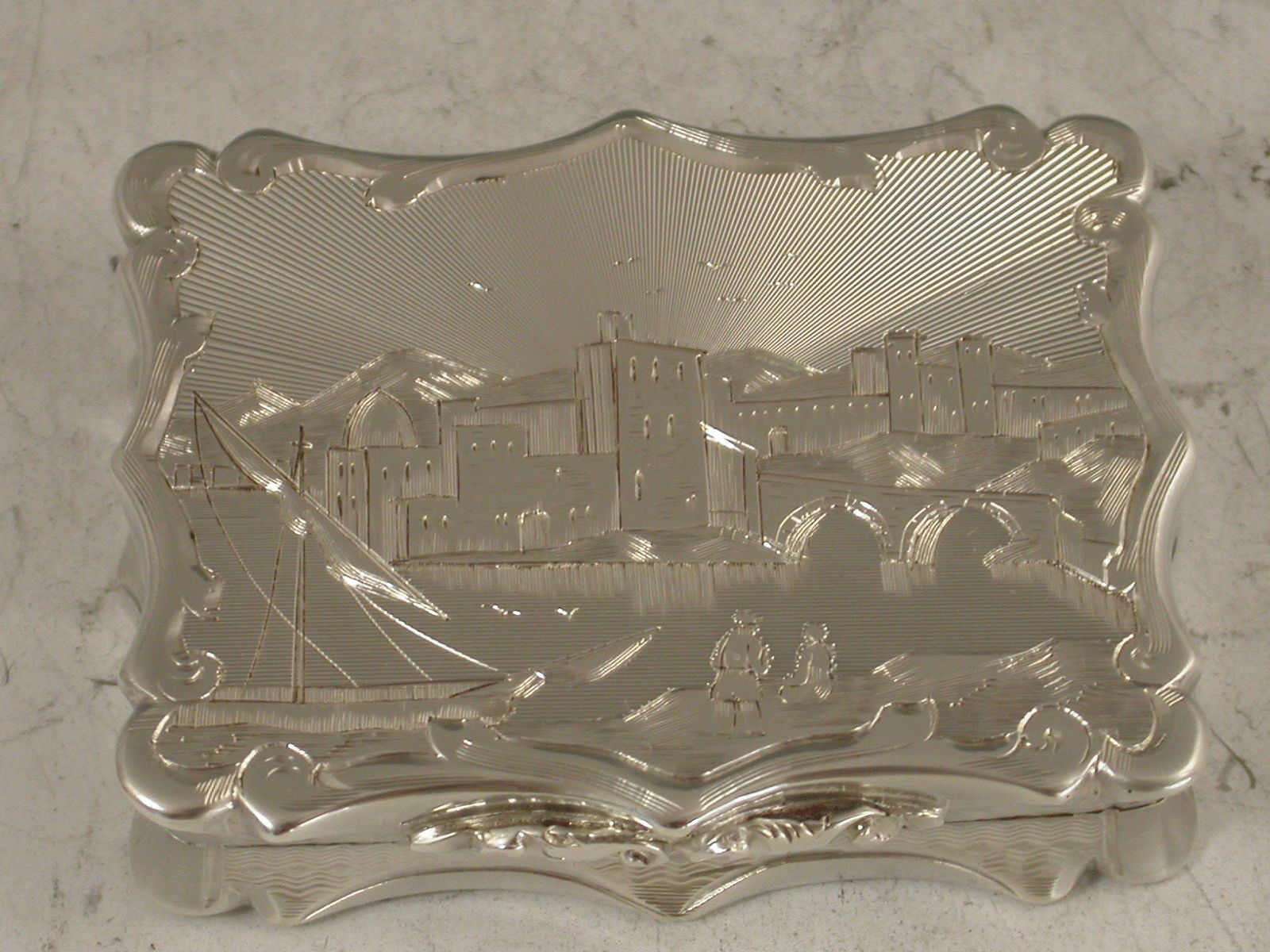 A very fine quality large Victorian silver Vinaigrette of shaped rectangular form, the lid engraved with a harbour scene including a castle and an arched bridge, bands of engine turned decoration to the base, the silver gilt interior with intricately pierced grille including a basket of flowers.
