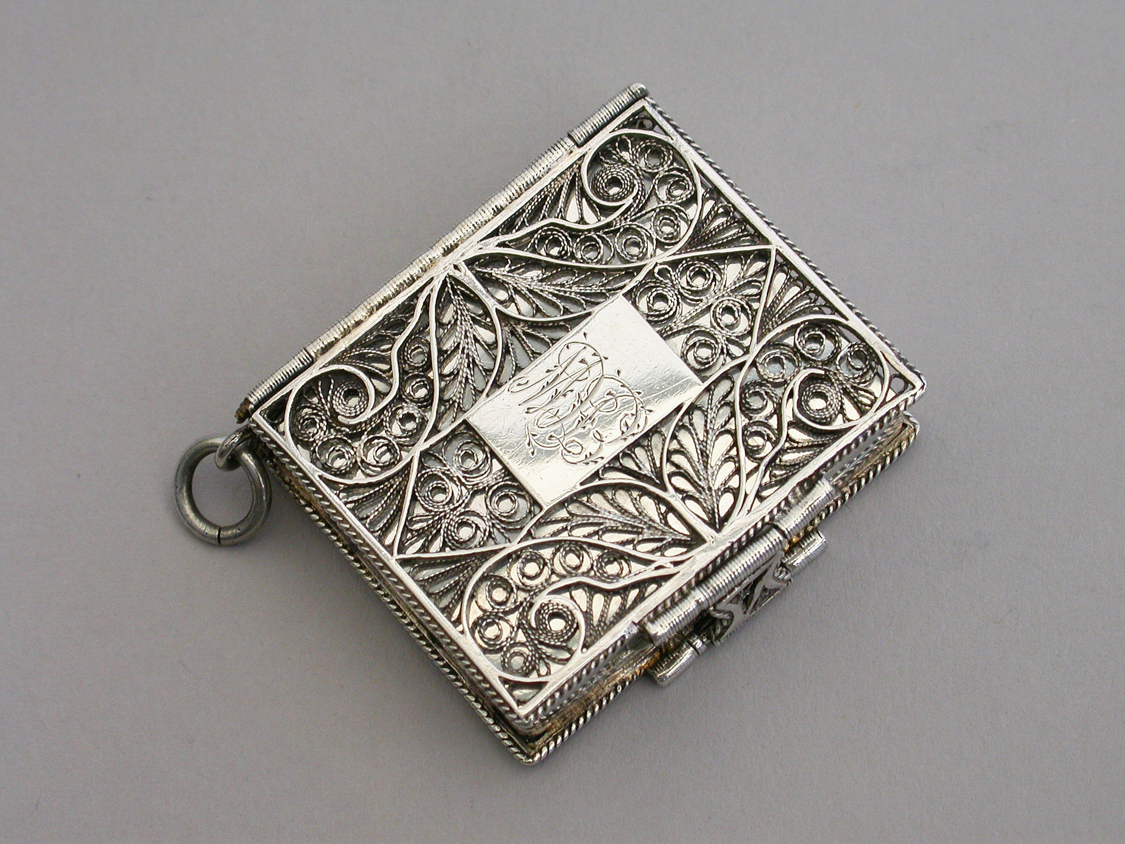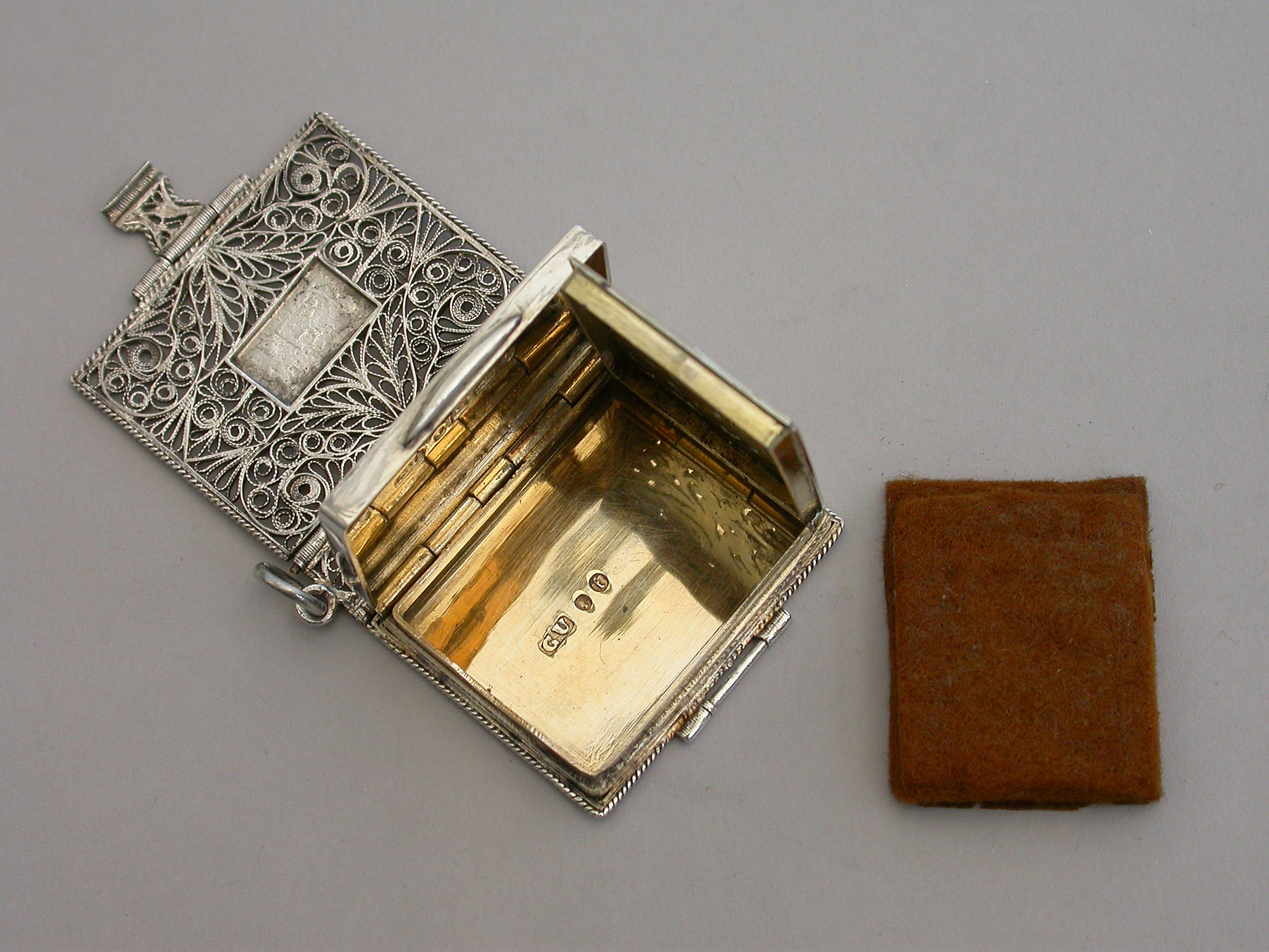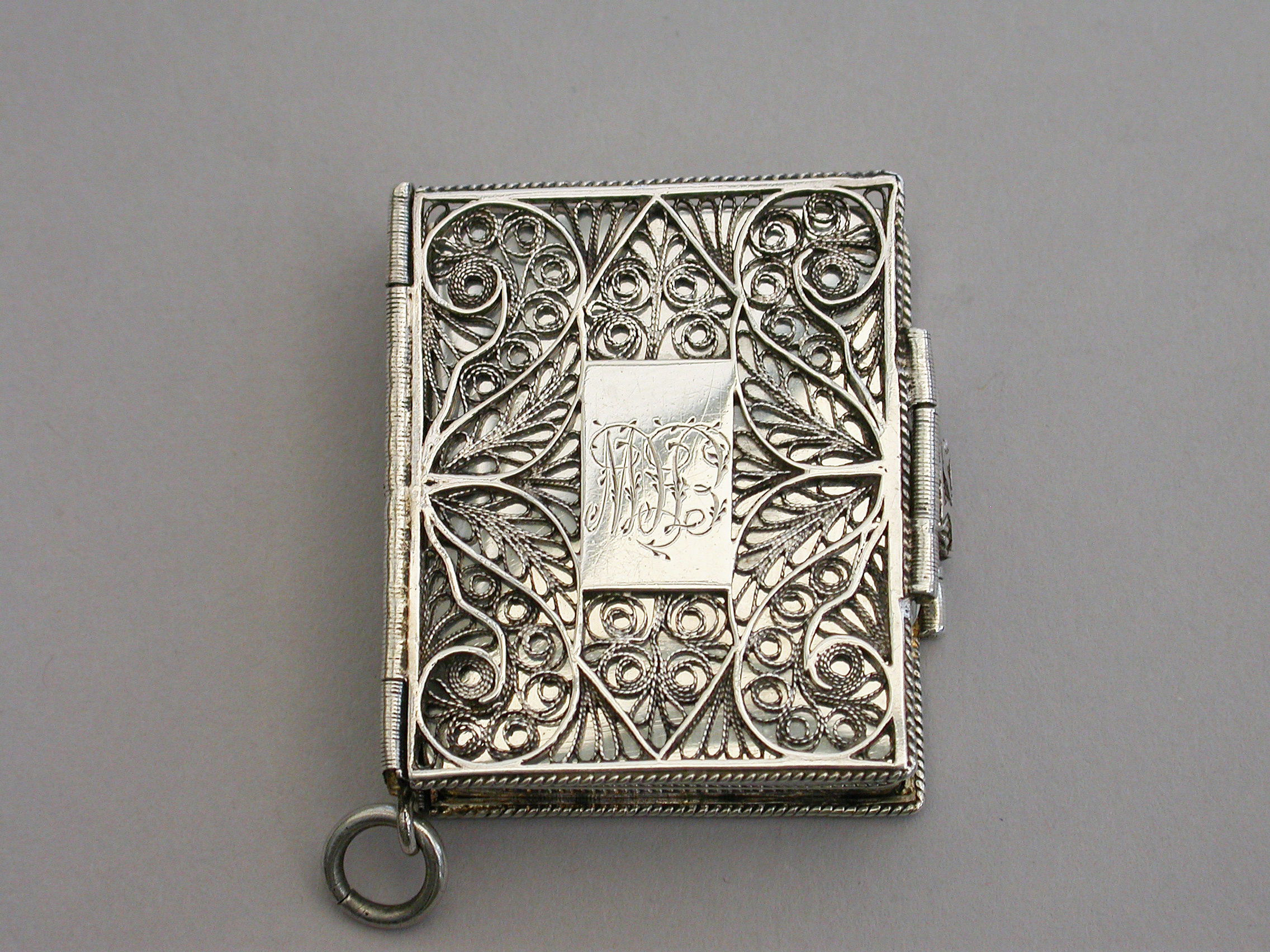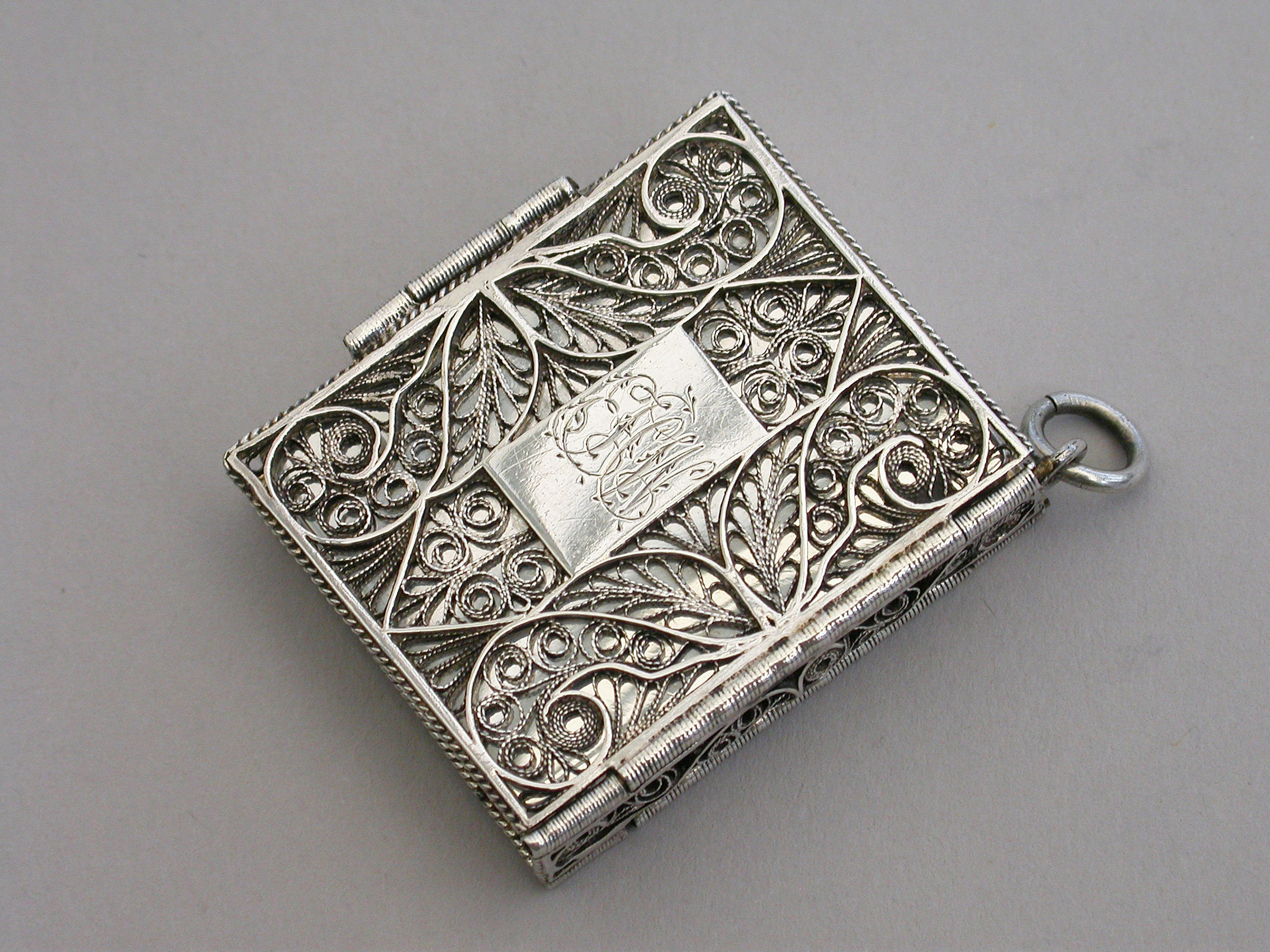 A very rare Victorian silver Vinaigrette made in the form of a family bible with clasp and suspension ring, the Vinaigrette itself with plain surfaces, the outer covers of filigree work with central plaques. The silver gilt grille pierced with scrolling leaves and two flower heads. Complete with original unused sponge including rice paper cover.