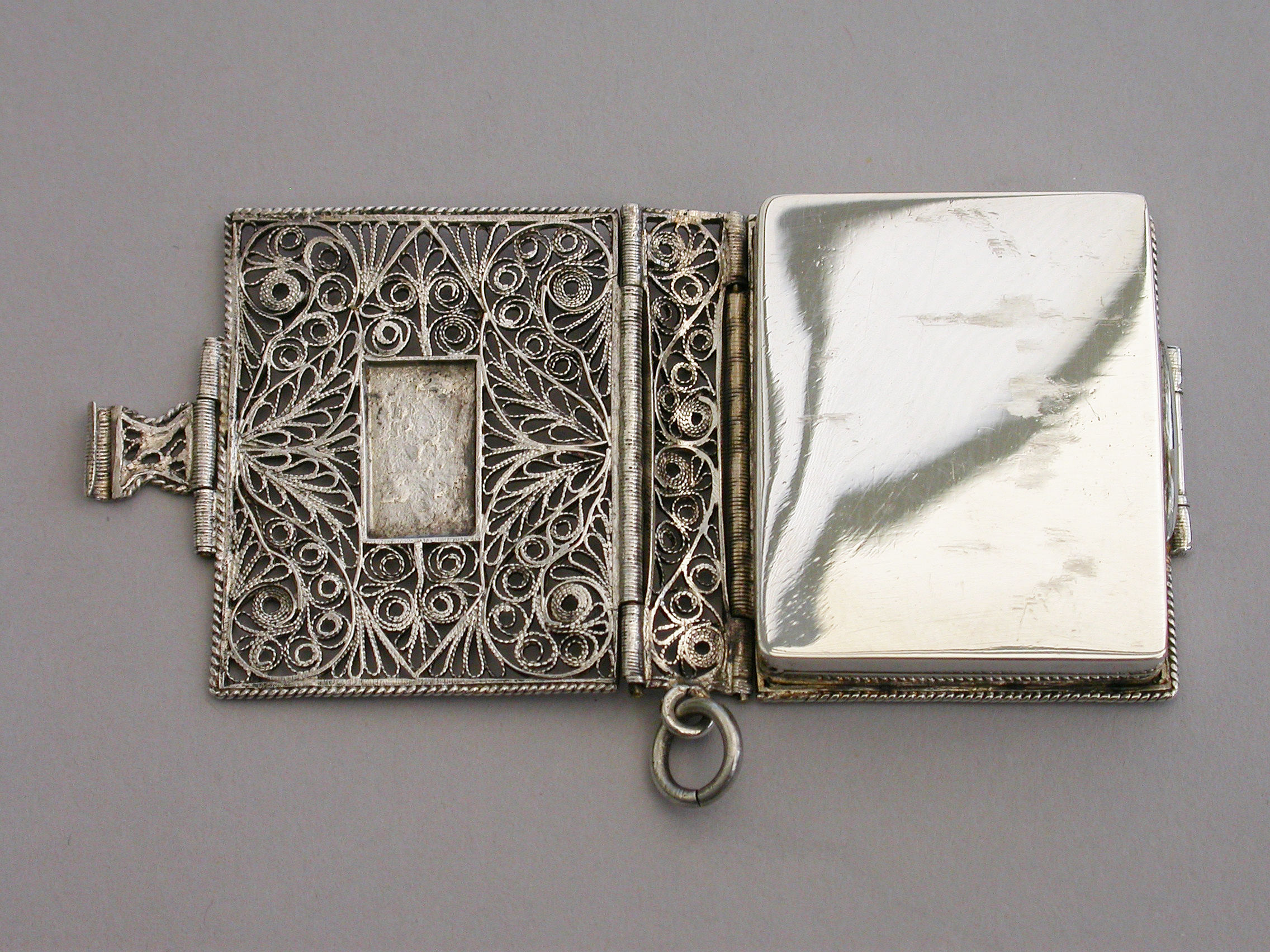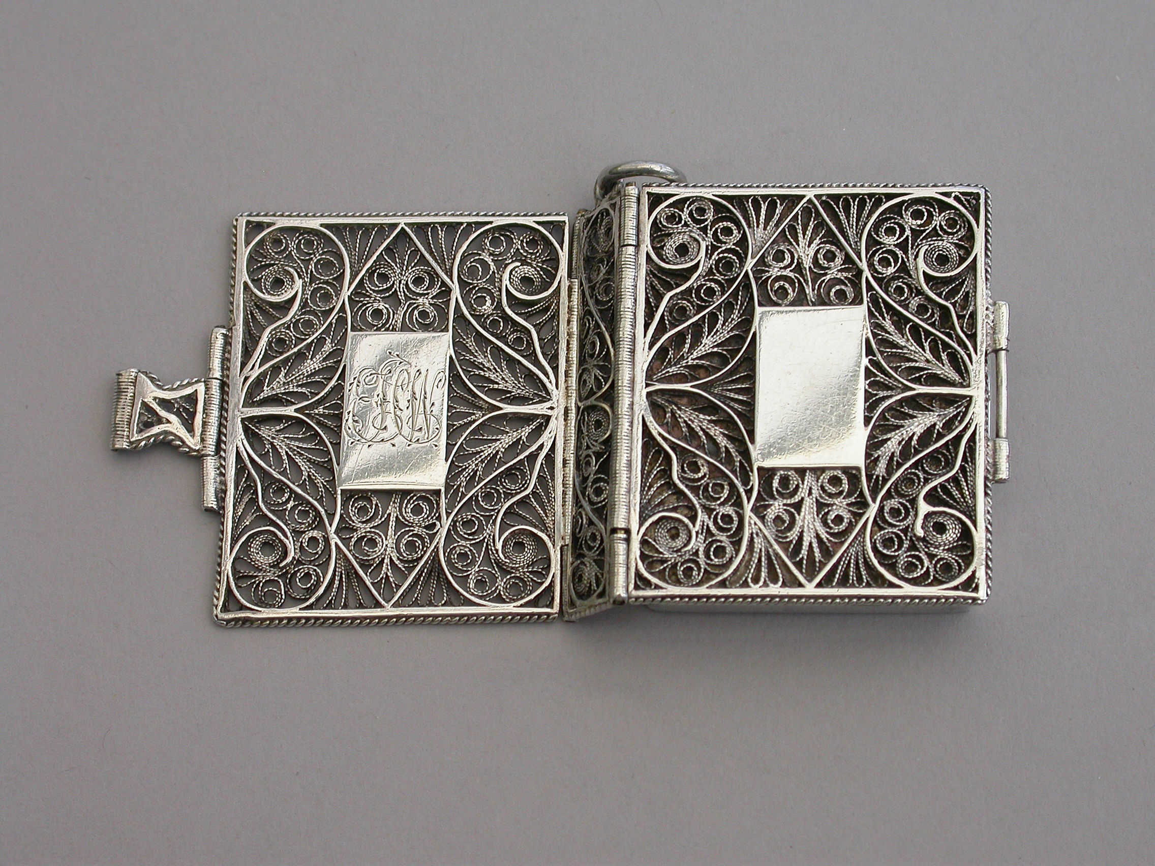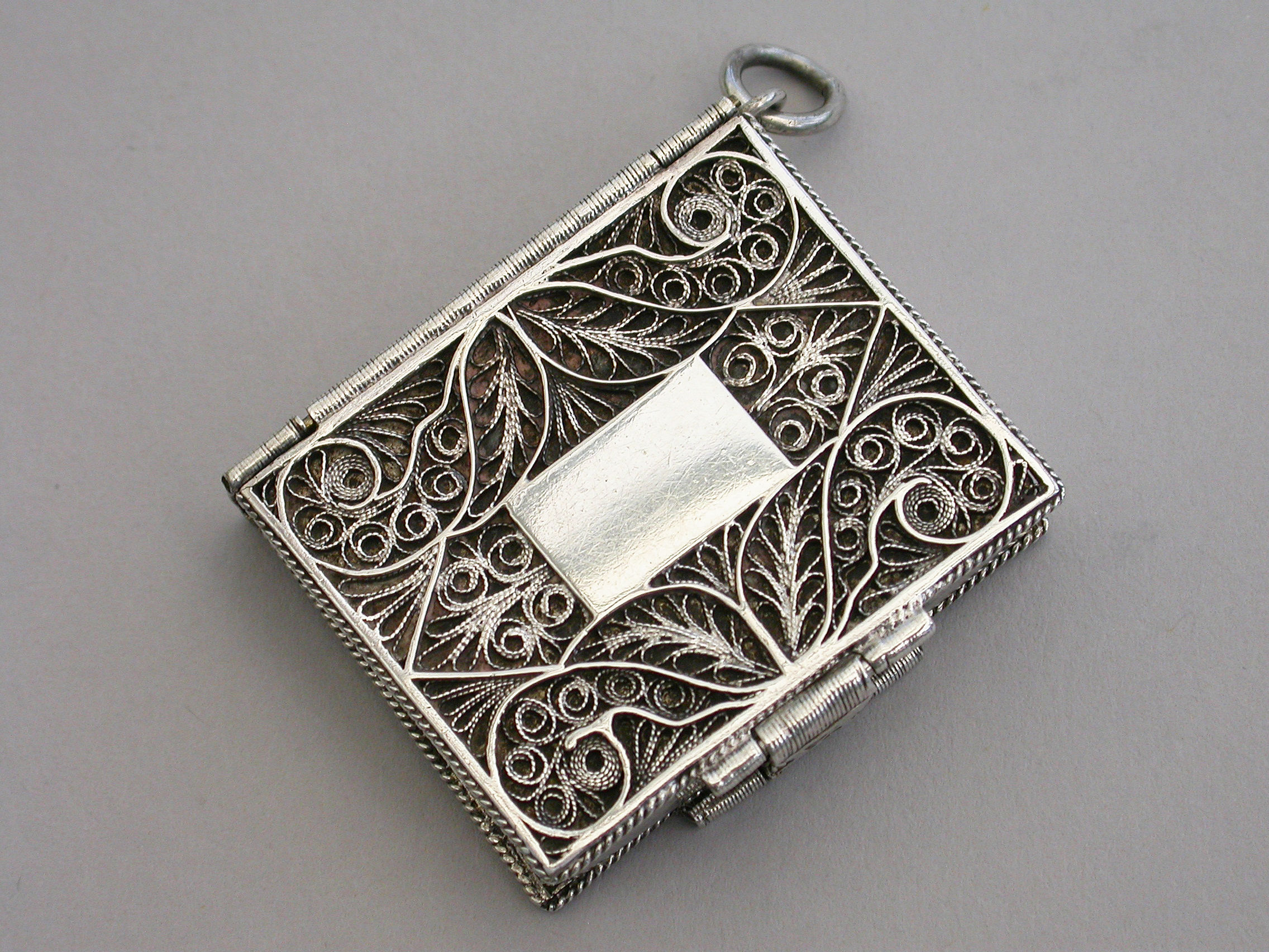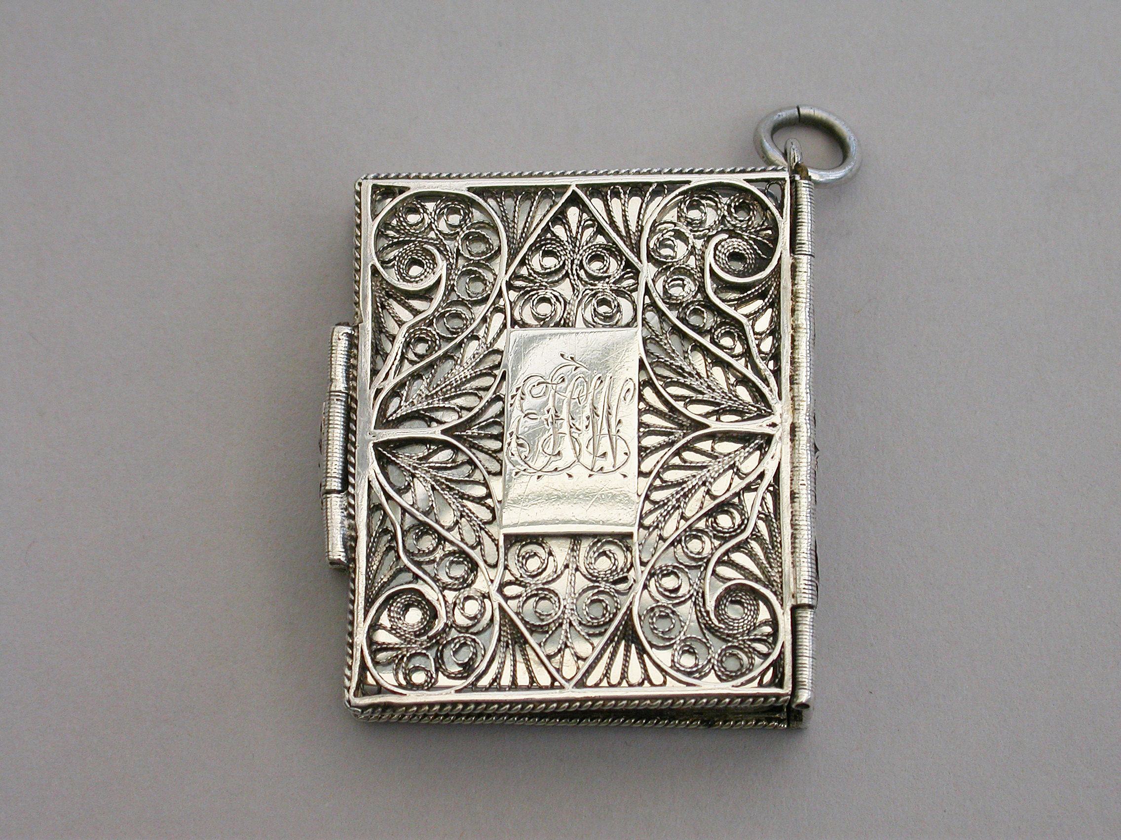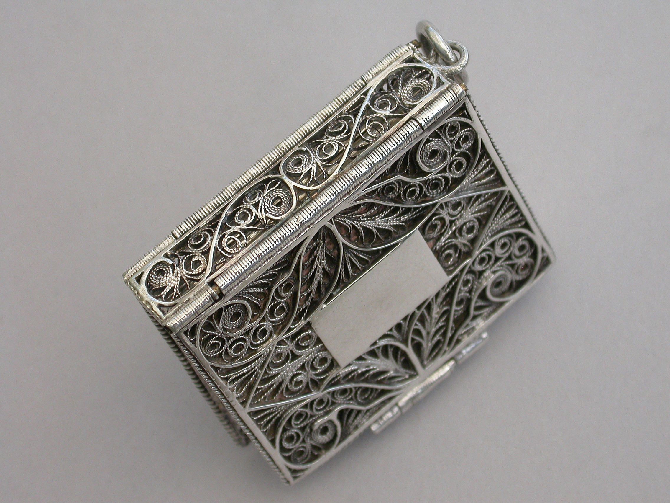A very rare Victorian silver Vinaigrette made in the form of a family bible with clasp and suspension ring, the Vinaigrette itself with plain surfaces, the outer covers of filigree work with central plaques. The silver gilt grille pierced with scrolling leaves and two flower heads. Complete with original unused sponge including rice paper cover.