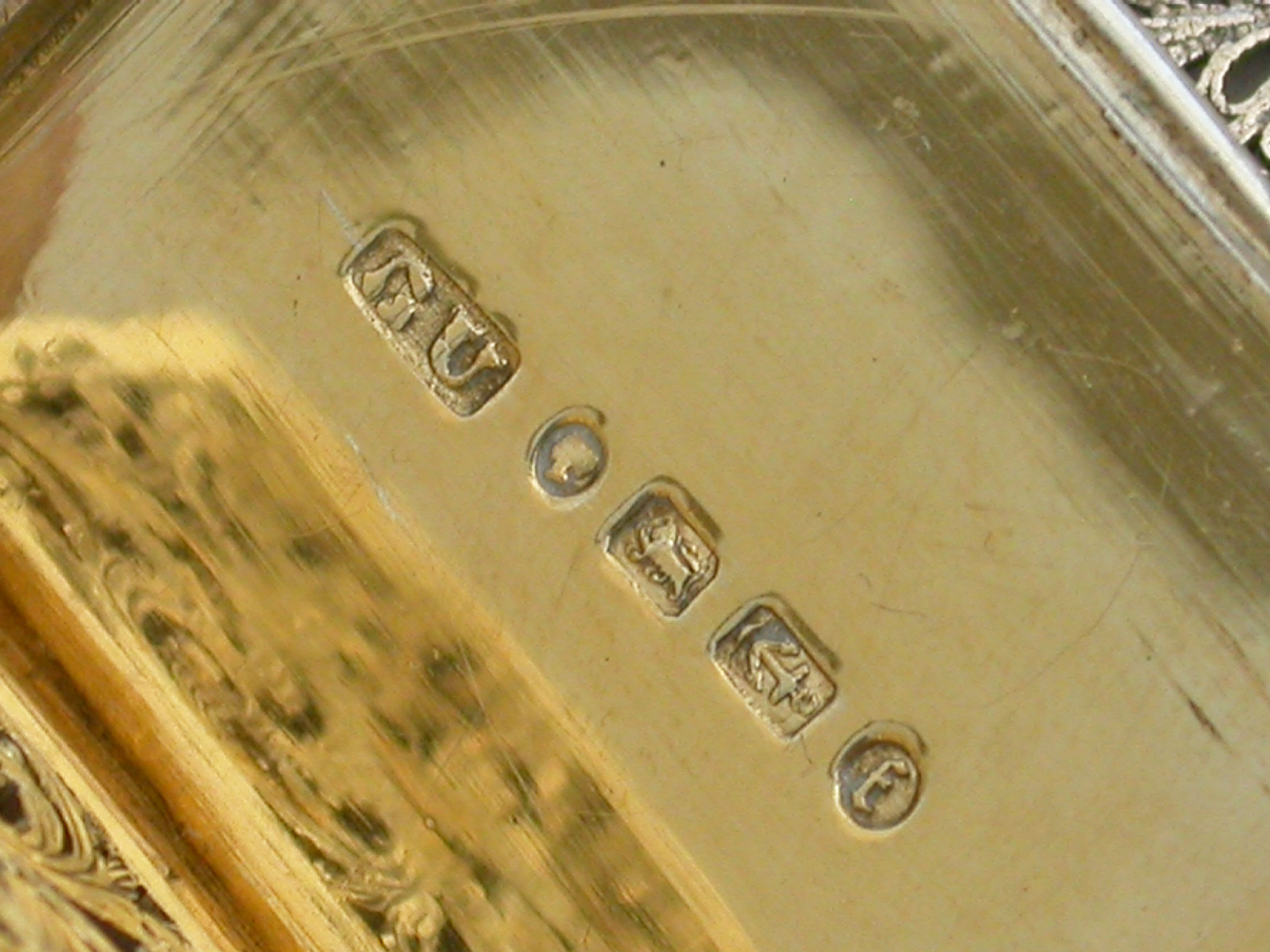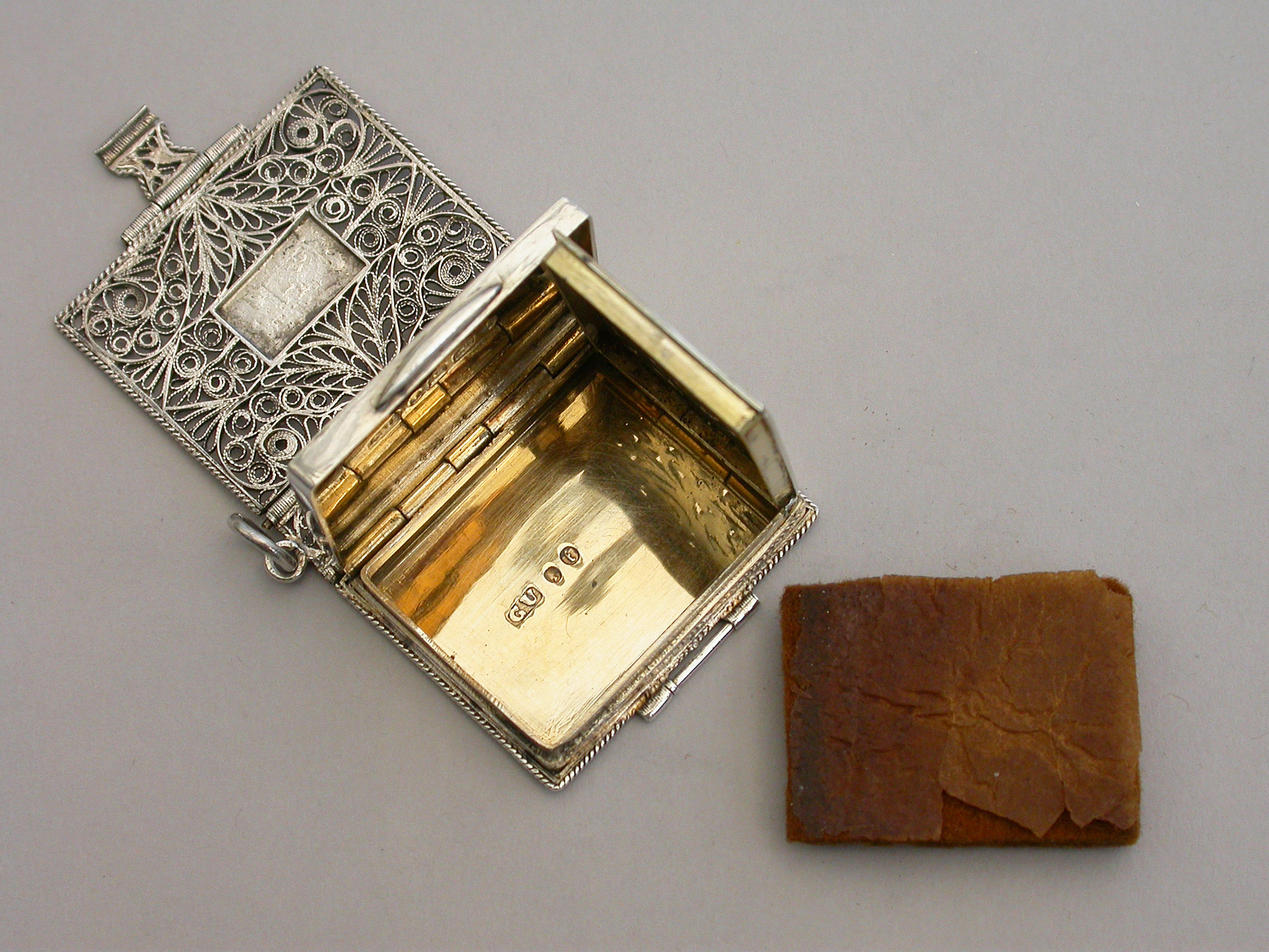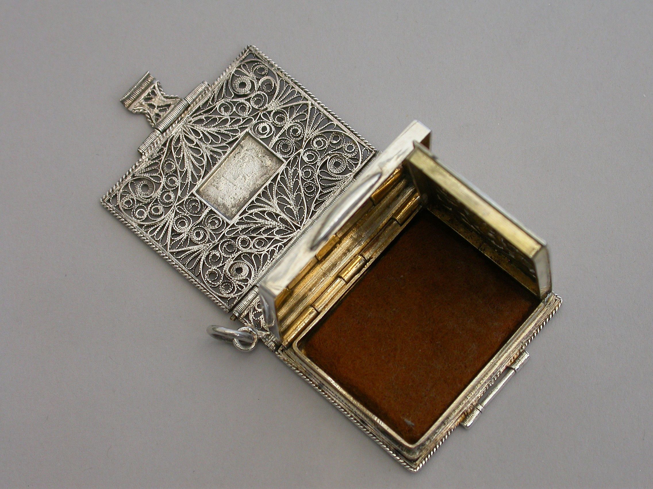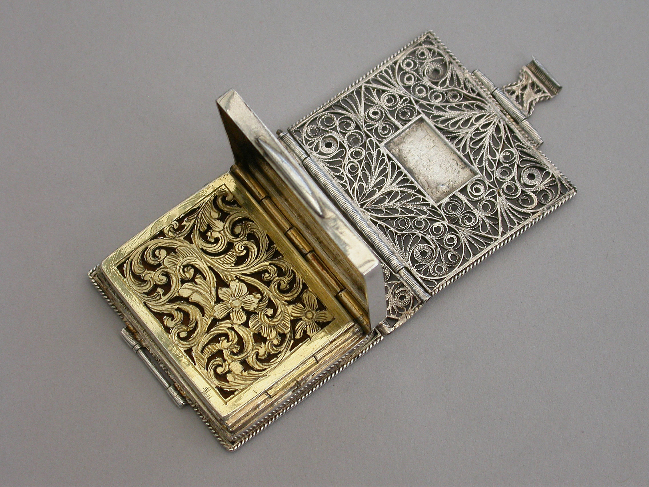 A very rare Victorian silver Vinaigrette made in the form of a family bible with clasp and suspension ring, the Vinaigrette itself with plain surfaces, the outer covers of filigree work with central plaques. The silver gilt grille pierced with scrolling leaves and two flower heads. Complete with original unused sponge including rice paper cover.
