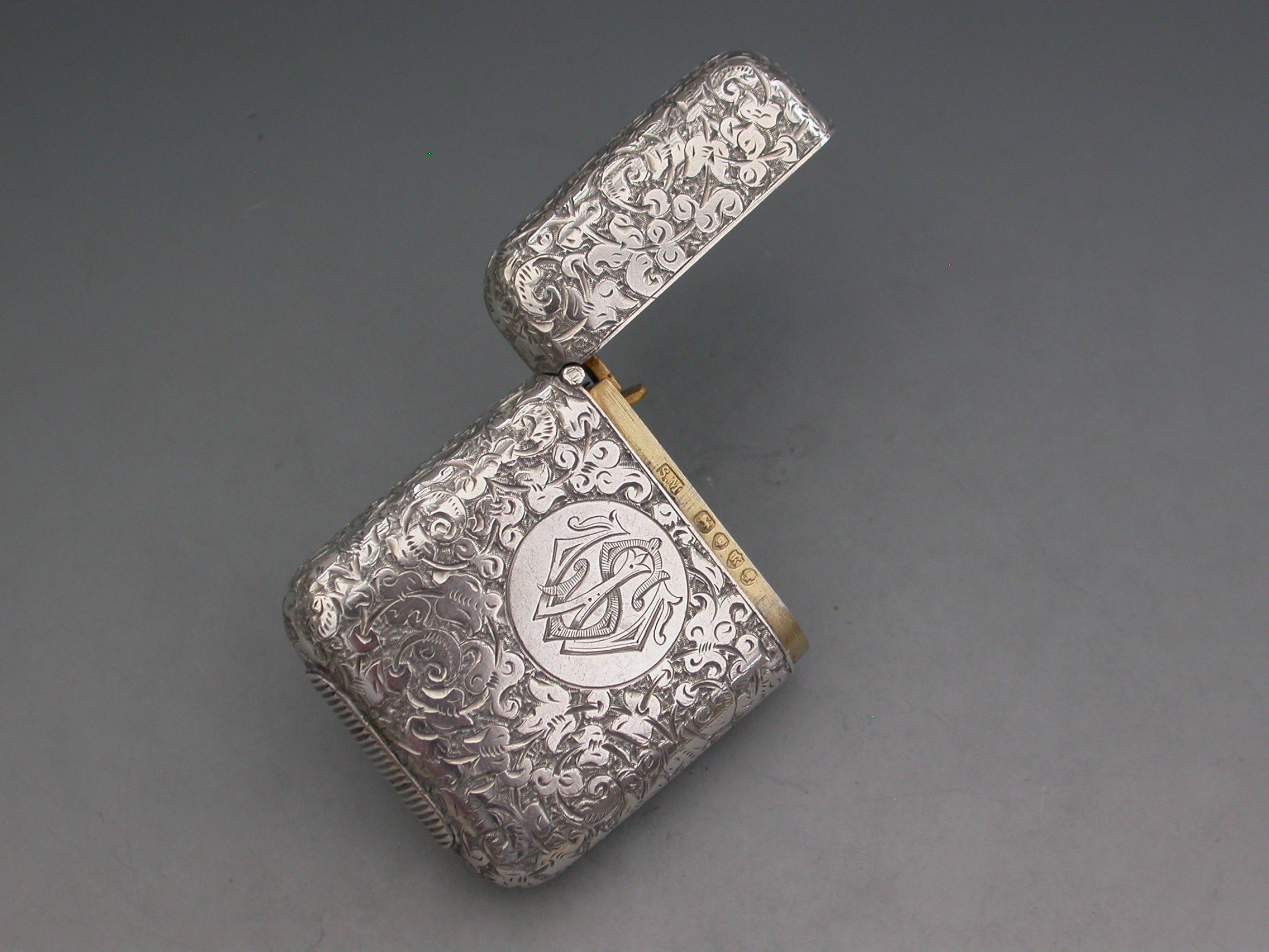 A fine quality Victorian silver Vesta Case of rounded rectangular form with sprung hinged lid and silver gilt interior, the body engraved with foliate scroll decoration, a circular cartouche to the front engraved with contemporary initials.