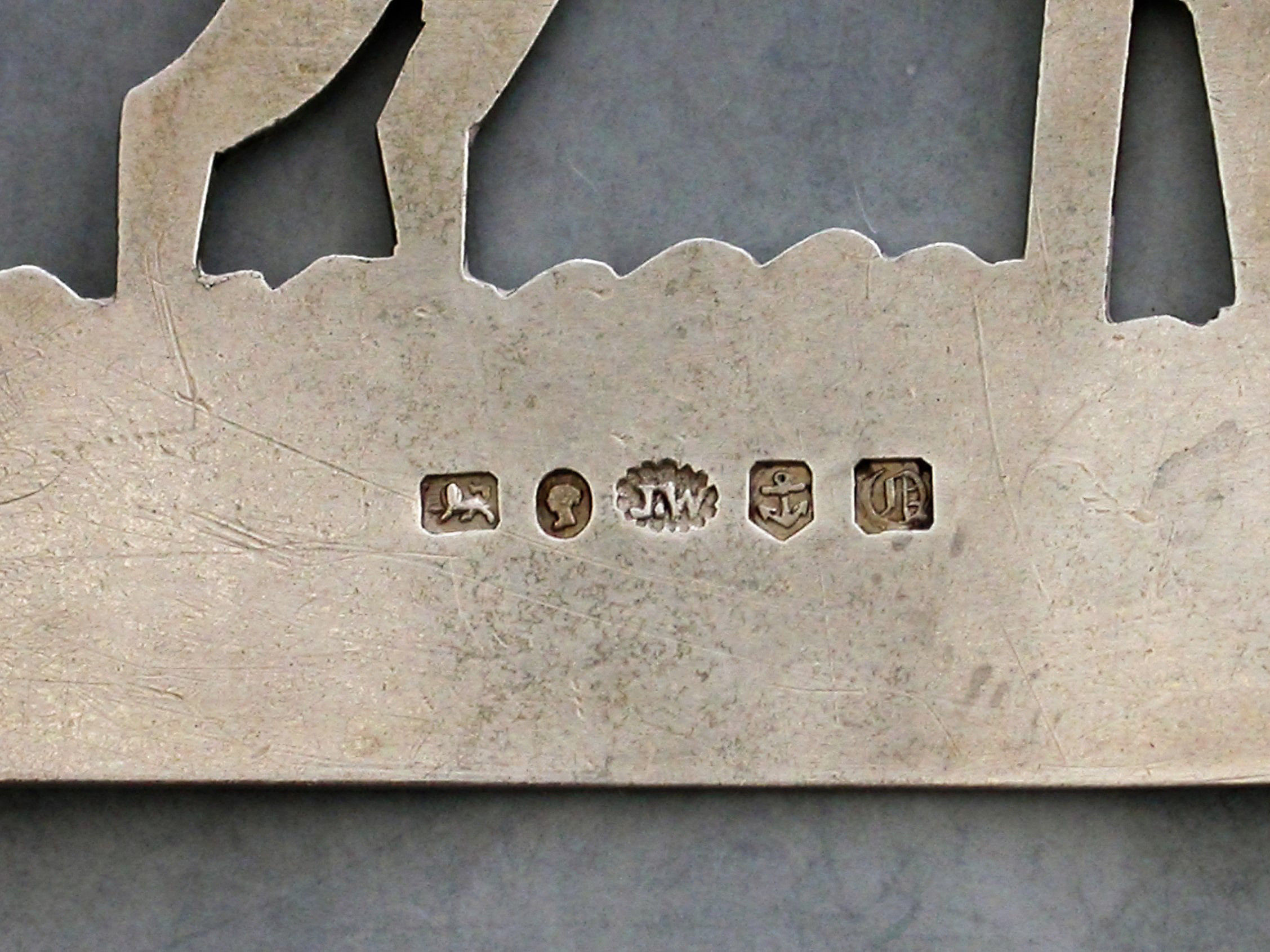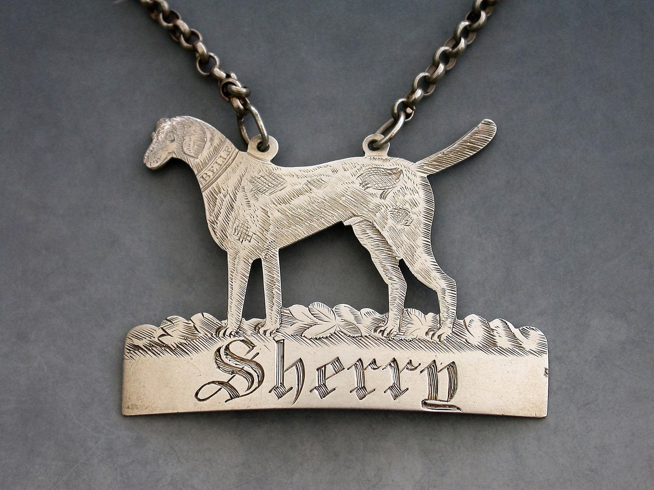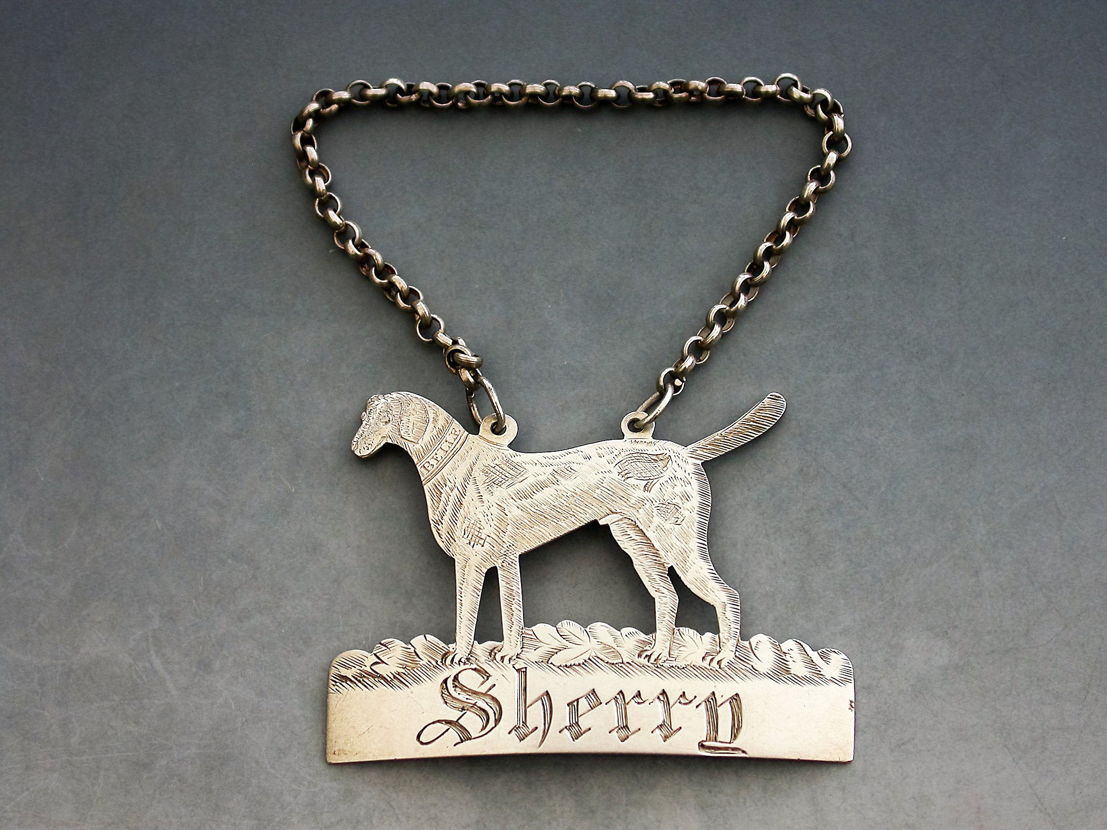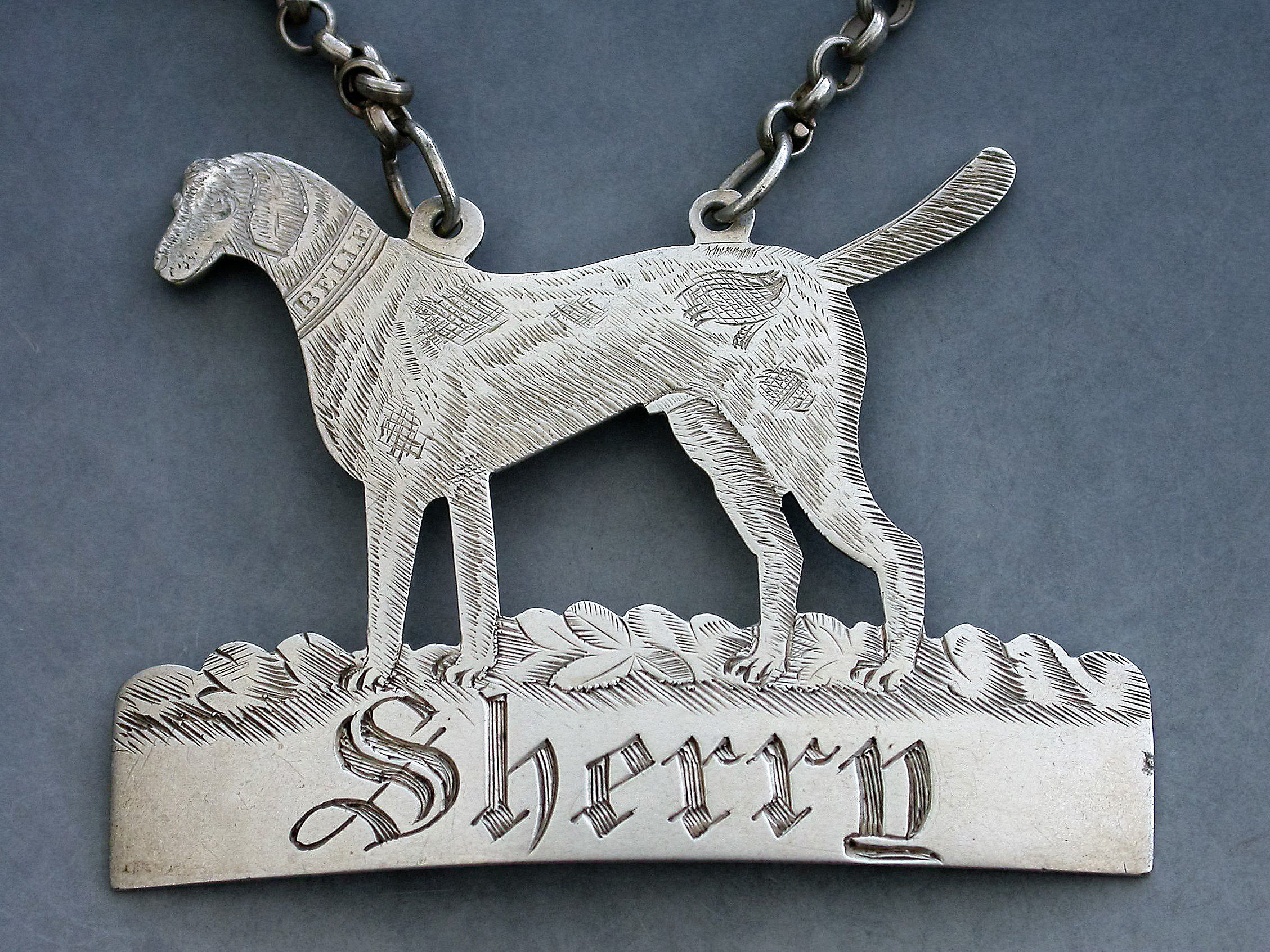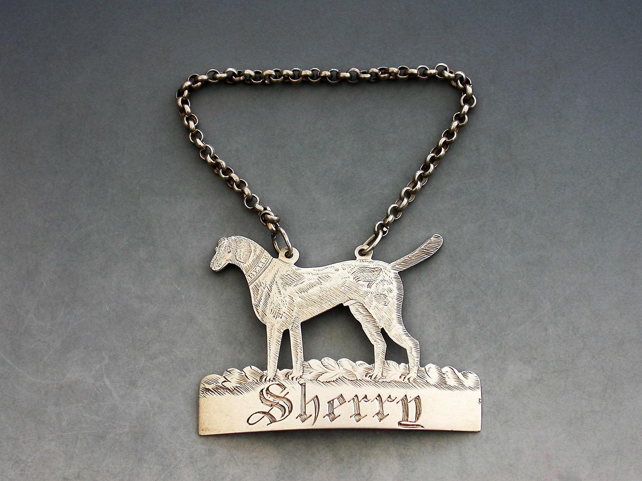 A rare early Victorian silver Wine Label made in the form of Foxhound standing on a narrow rectangular base with engraved foliage surmount. The hounds kennel name – “BELLE”, engraved on its collar. Incised for Sherry.