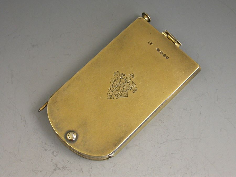 A fine quality Victorian silver gilt Aide Memoire of rounded rectangular form, the plain silver gilt covers opening on a swiveling pin and secured by a hinged clasp. The interior complete with the original seven ivory leaves (one for each day of the week) and retaining some original penciled notes. Complete with engine turned propelling pencil. The cover engraved with a monogram.