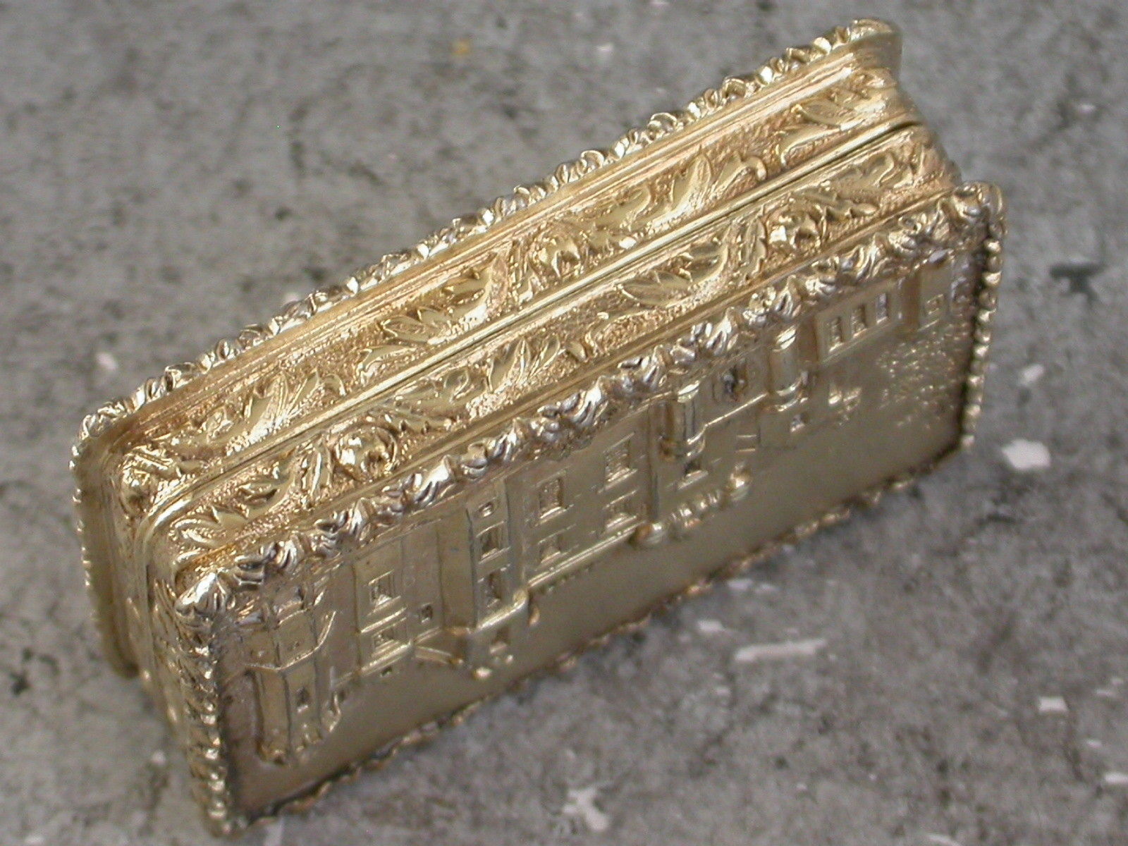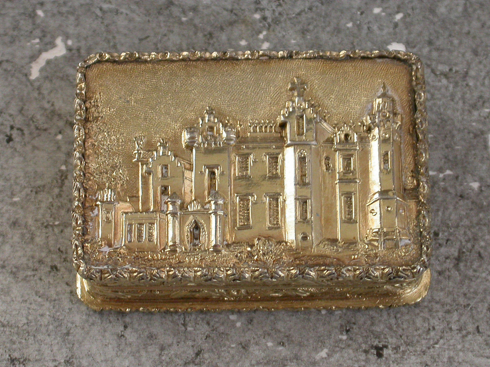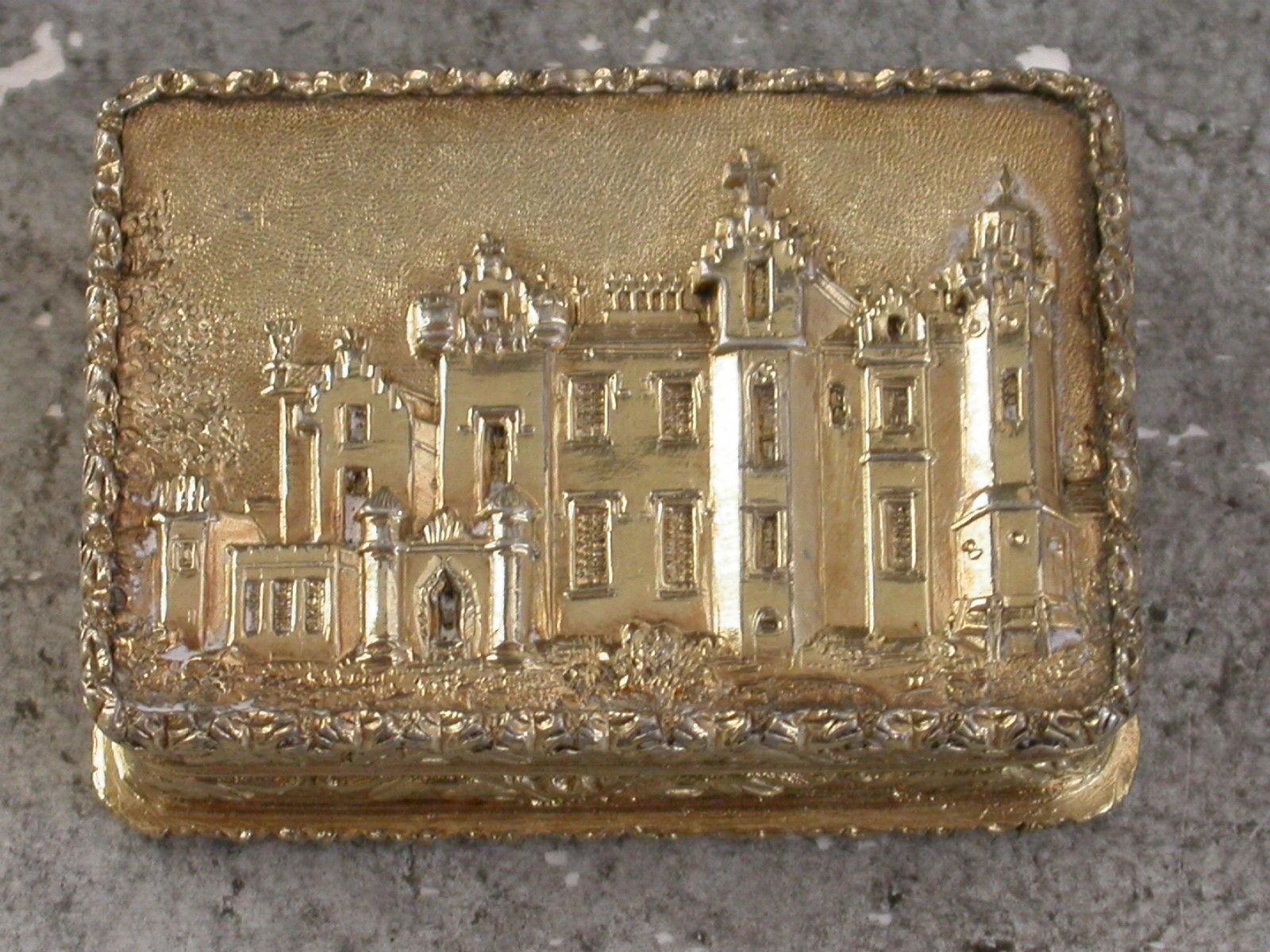 A fine quality early Victorian silver gilt ""Castle Top"" Vinaigrette of rectangular form with raised foliate borders and sides, the base with engine turned decoration and a vacant rectangular cartouche, the lid with a chased and engraved view in high relief depicting Abbotsford House, the home of Sir Walter Scott. The silver gilt interior with finely pierced foliate scroll grille.