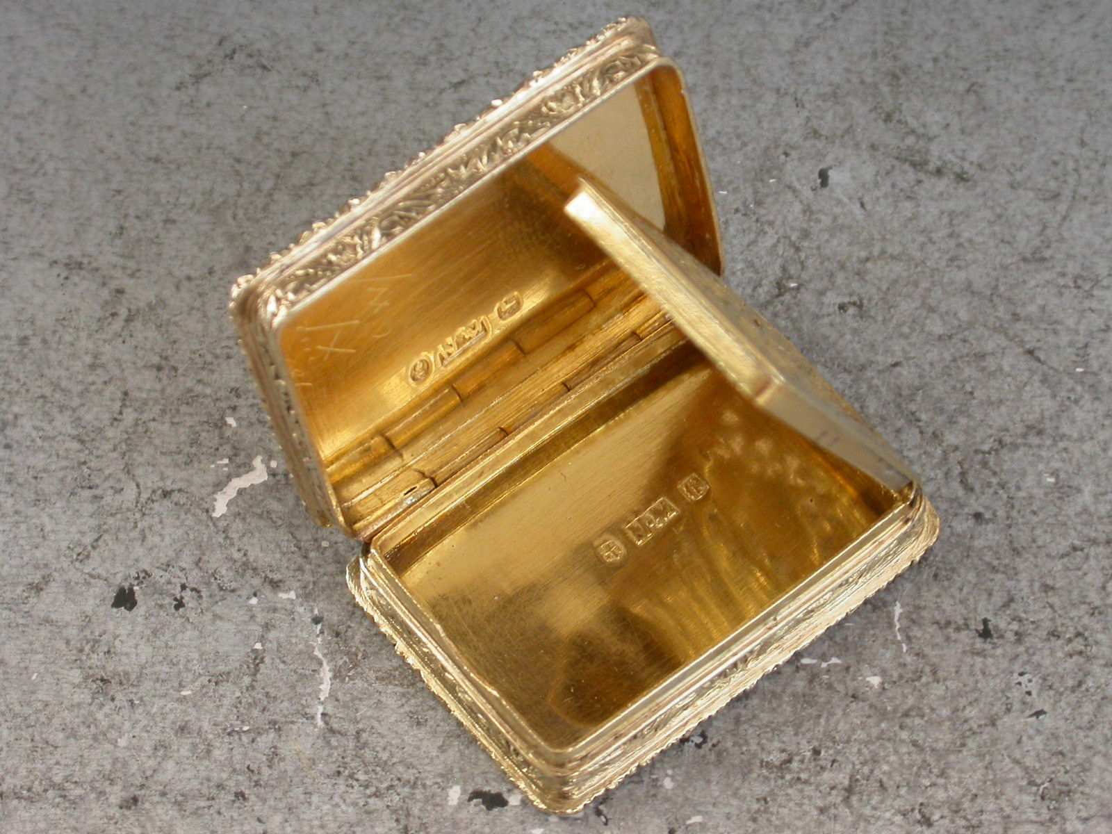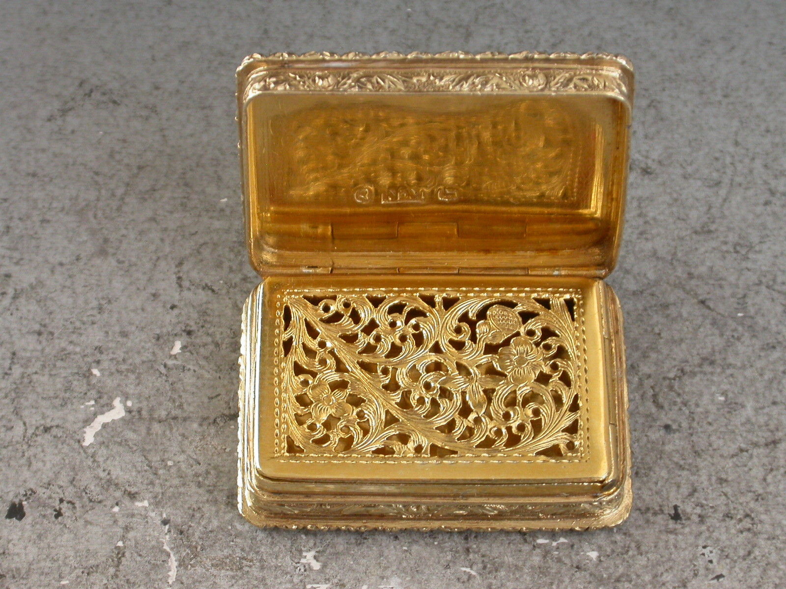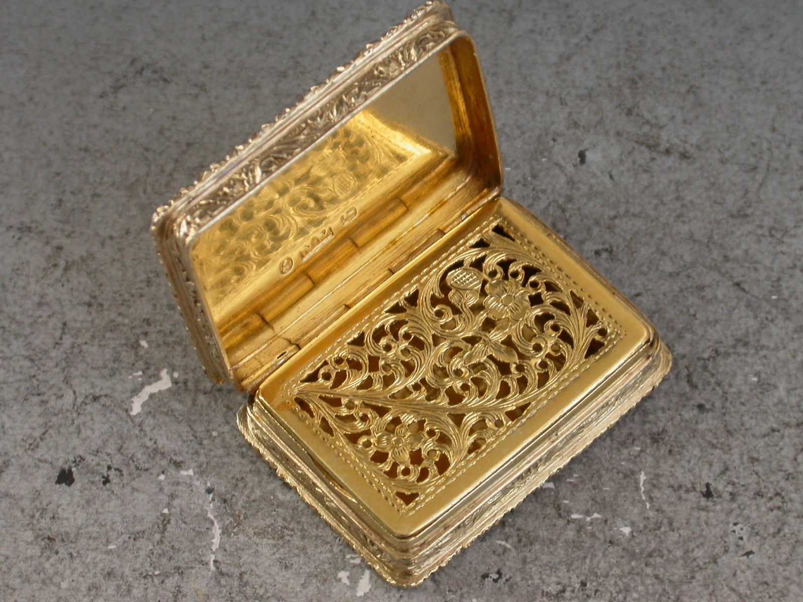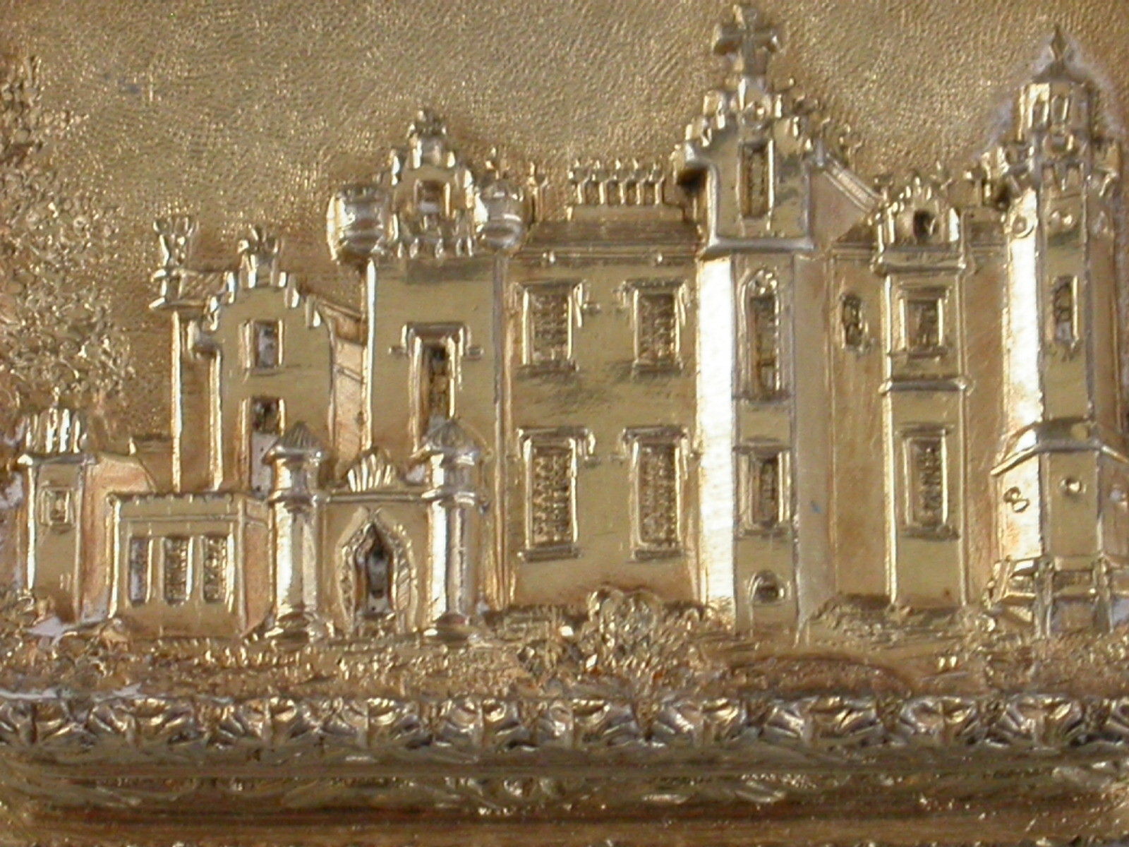 A fine quality early Victorian silver gilt ""Castle Top"" Vinaigrette of rectangular form with raised foliate borders and sides, the base with engine turned decoration and a vacant rectangular cartouche, the lid with a chased and engraved view in high relief depicting Abbotsford House, the home of Sir Walter Scott. The silver gilt interior with finely pierced foliate scroll grille.