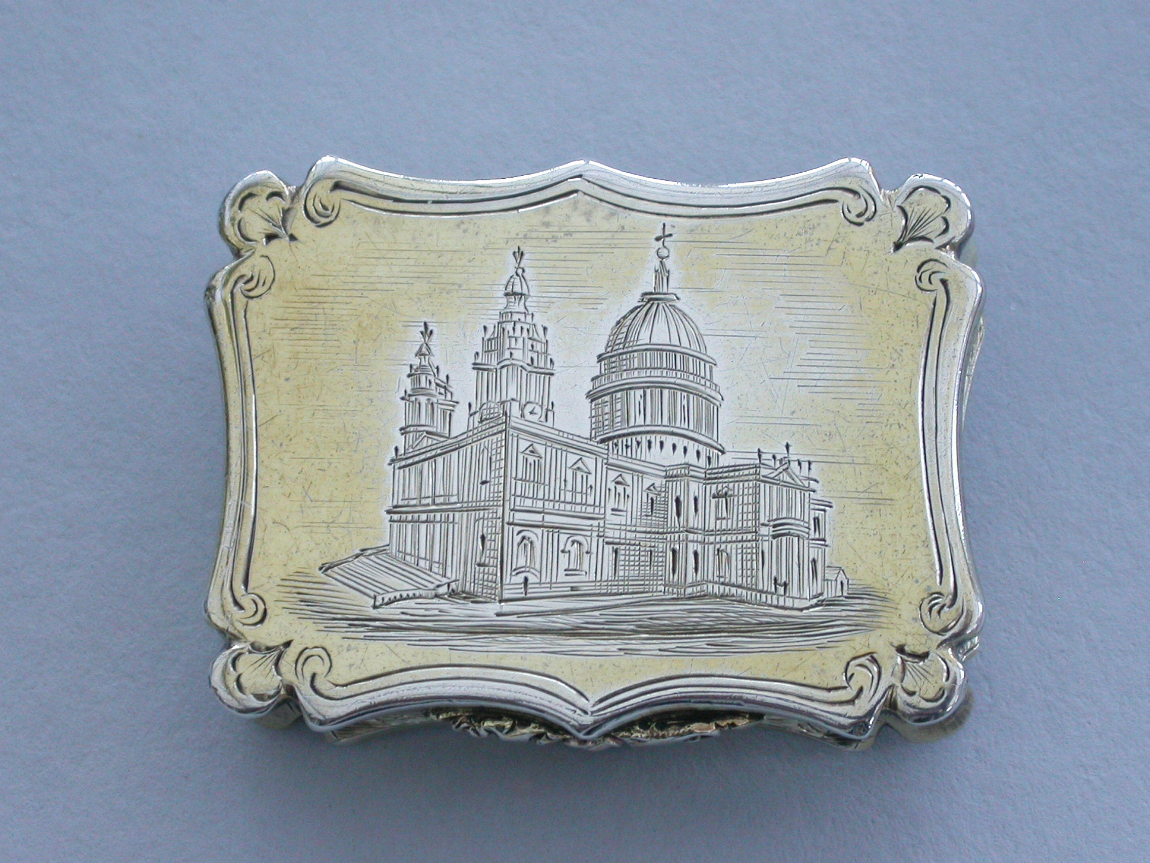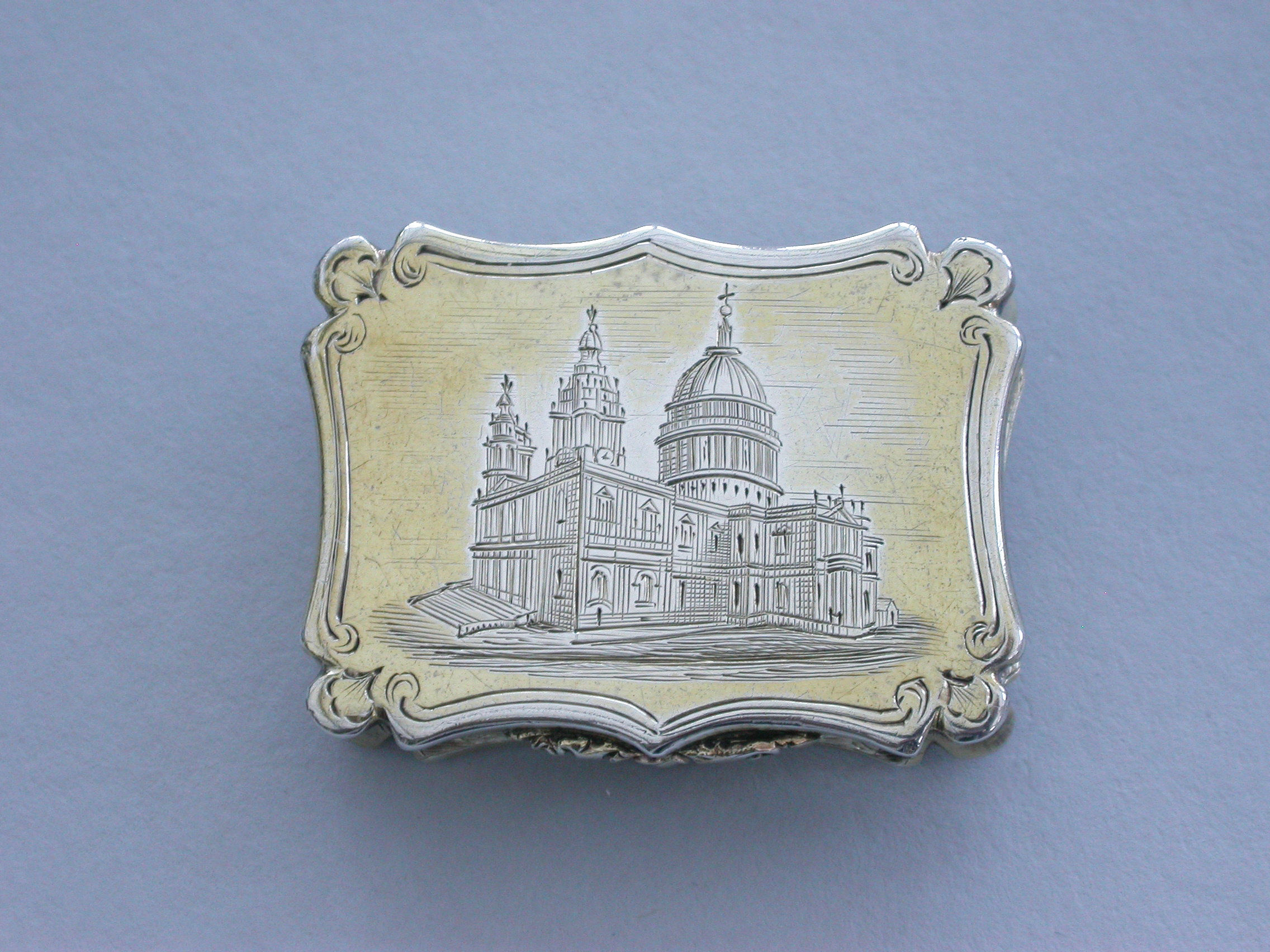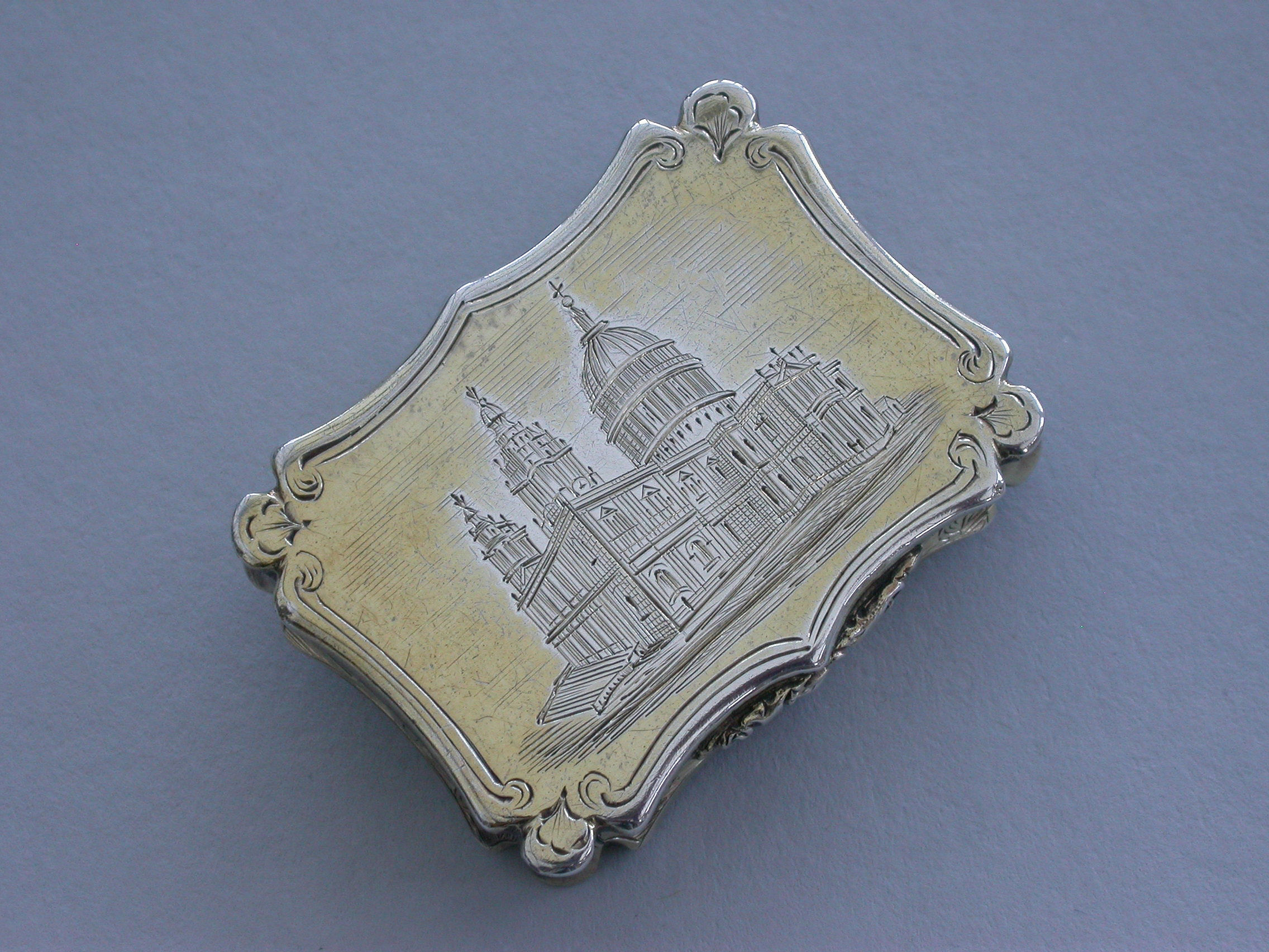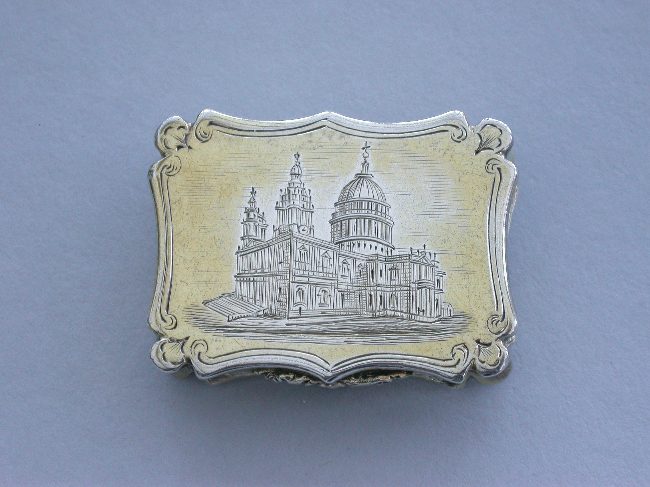 A Victorian silver gilt castle-top Vinaigrette of shaped rectangular form, the base and sides engraved with folaite scrolls and a vacant cartouche, the cover engraved with a view of St Pauls Cathedral within a border with sylised leaves at each corner. The silver gilt grille pierced with scrolls and a flower head.