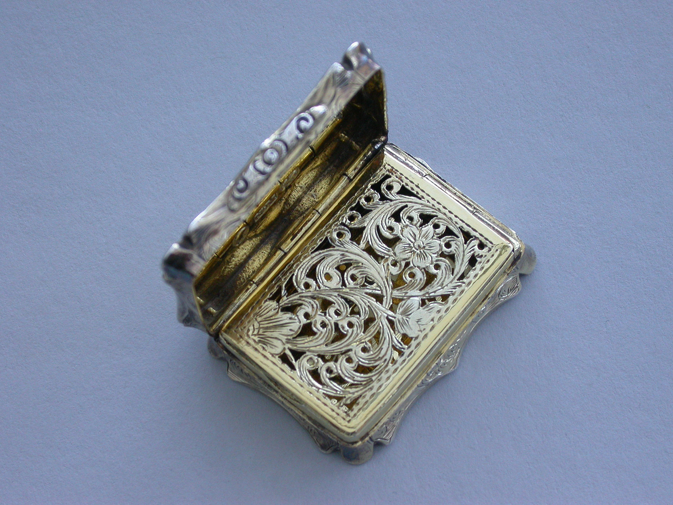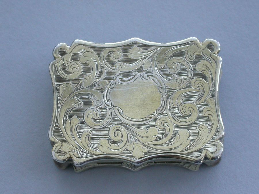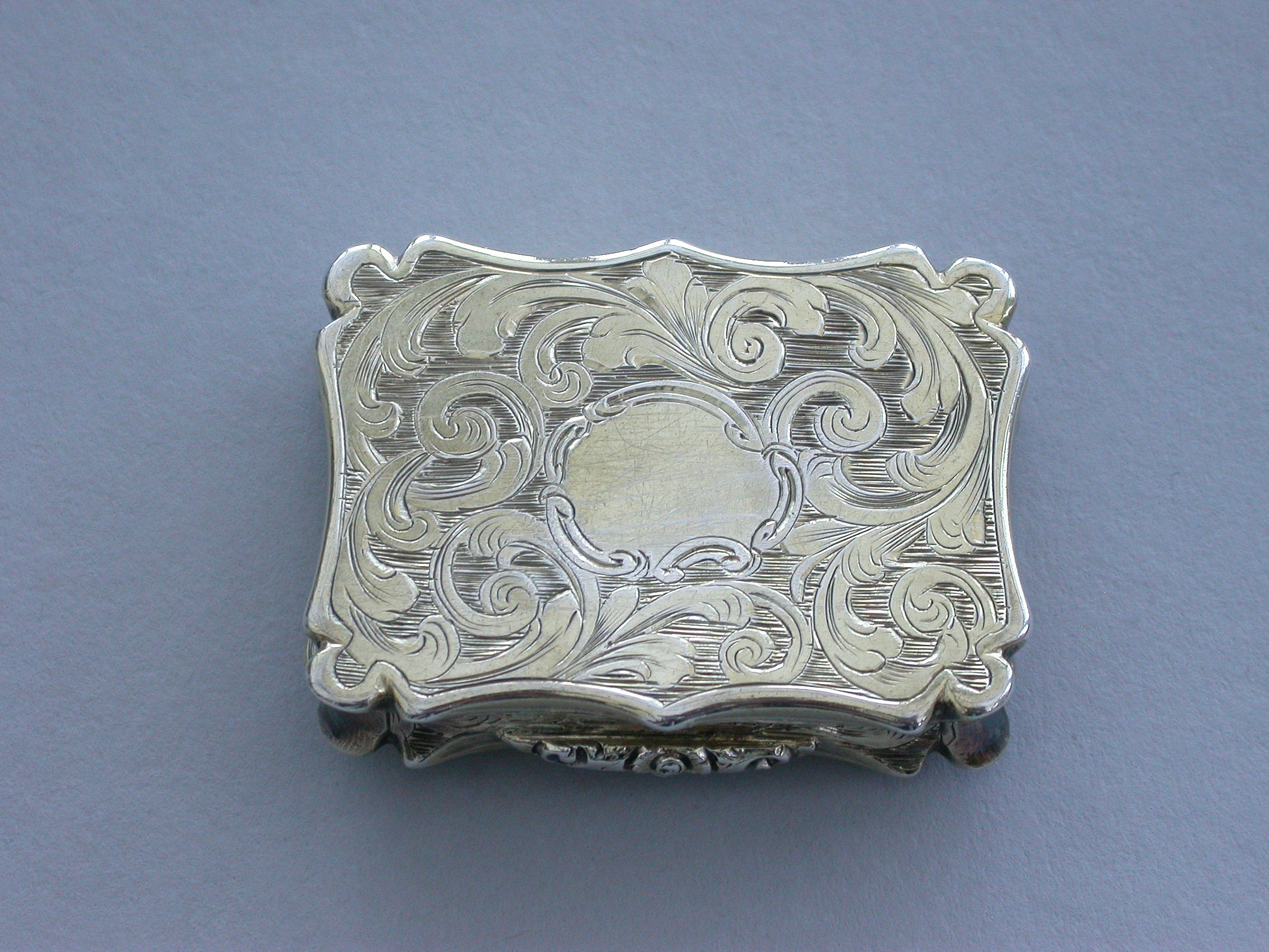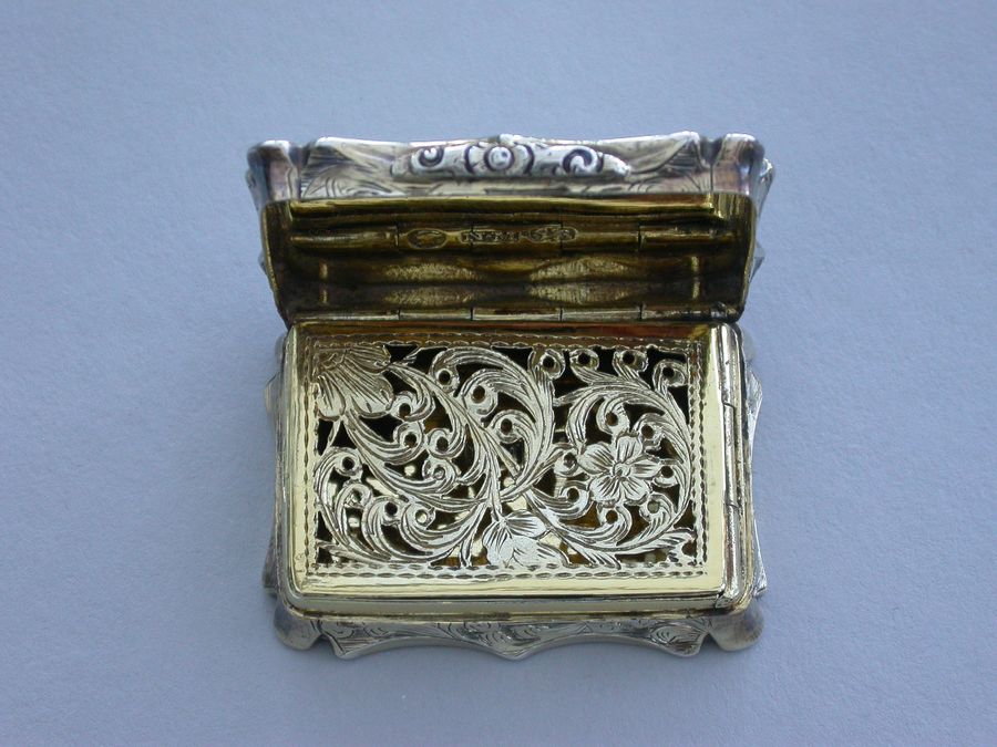 A Victorian silver gilt castle-top Vinaigrette of shaped rectangular form, the base and sides engraved with folaite scrolls and a vacant cartouche, the cover engraved with a view of St Pauls Cathedral within a border with sylised leaves at each corner. The silver gilt grille pierced with scrolls and a flower head.
