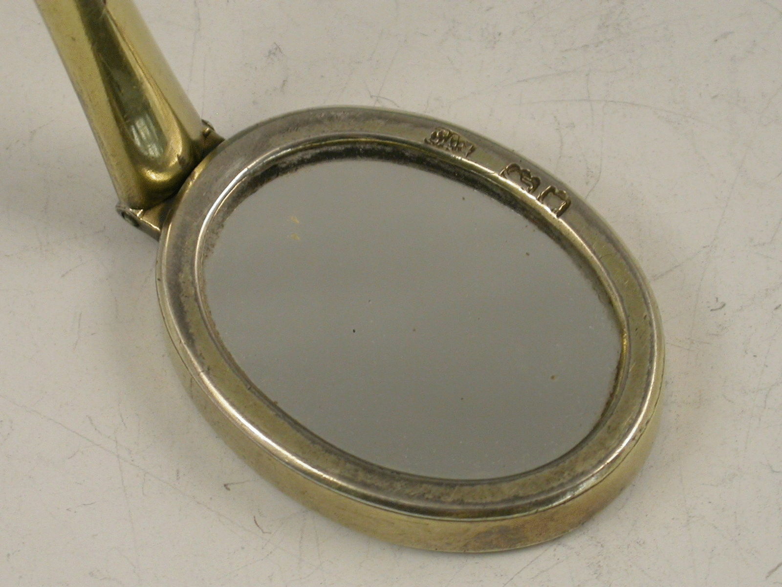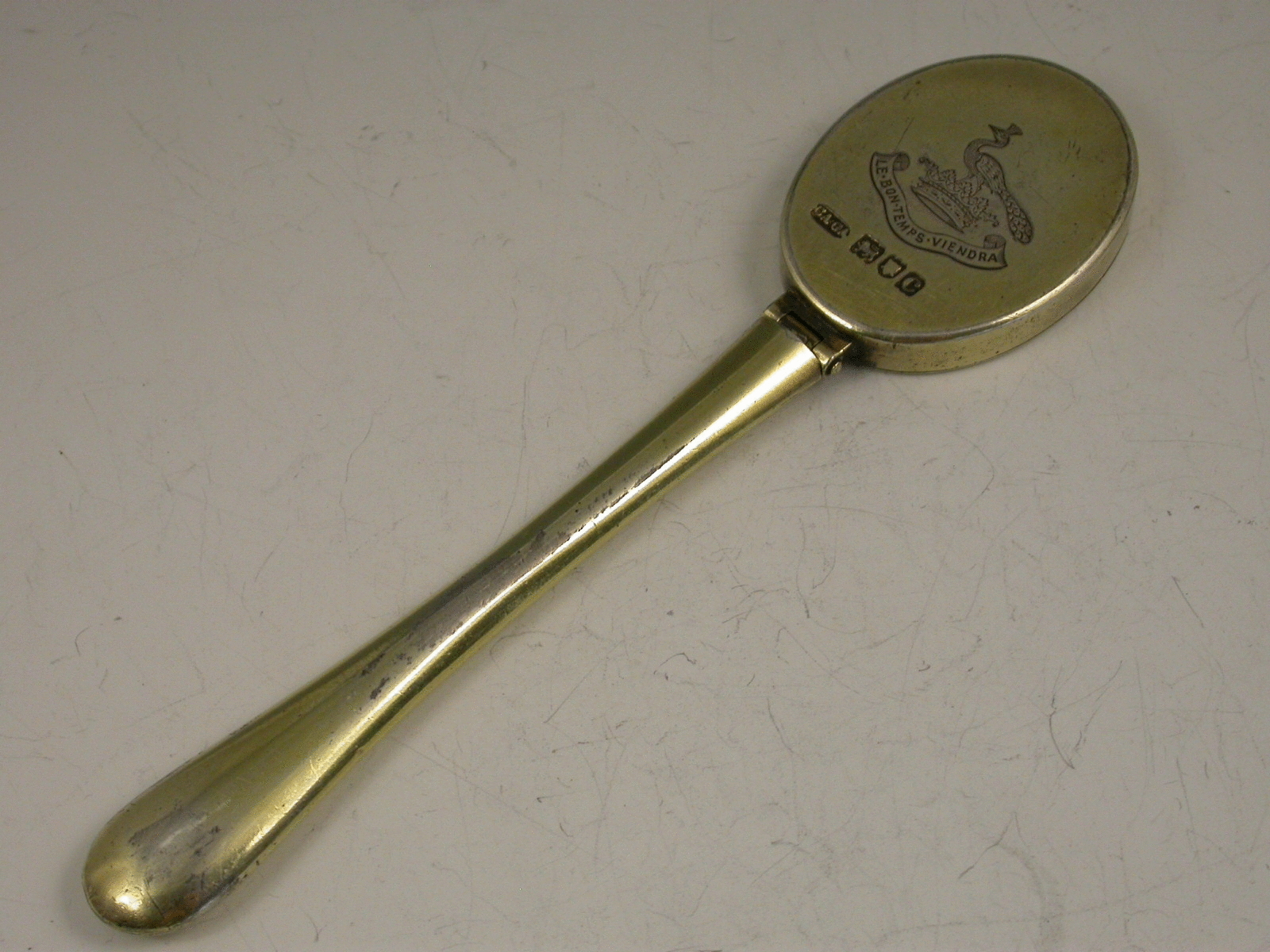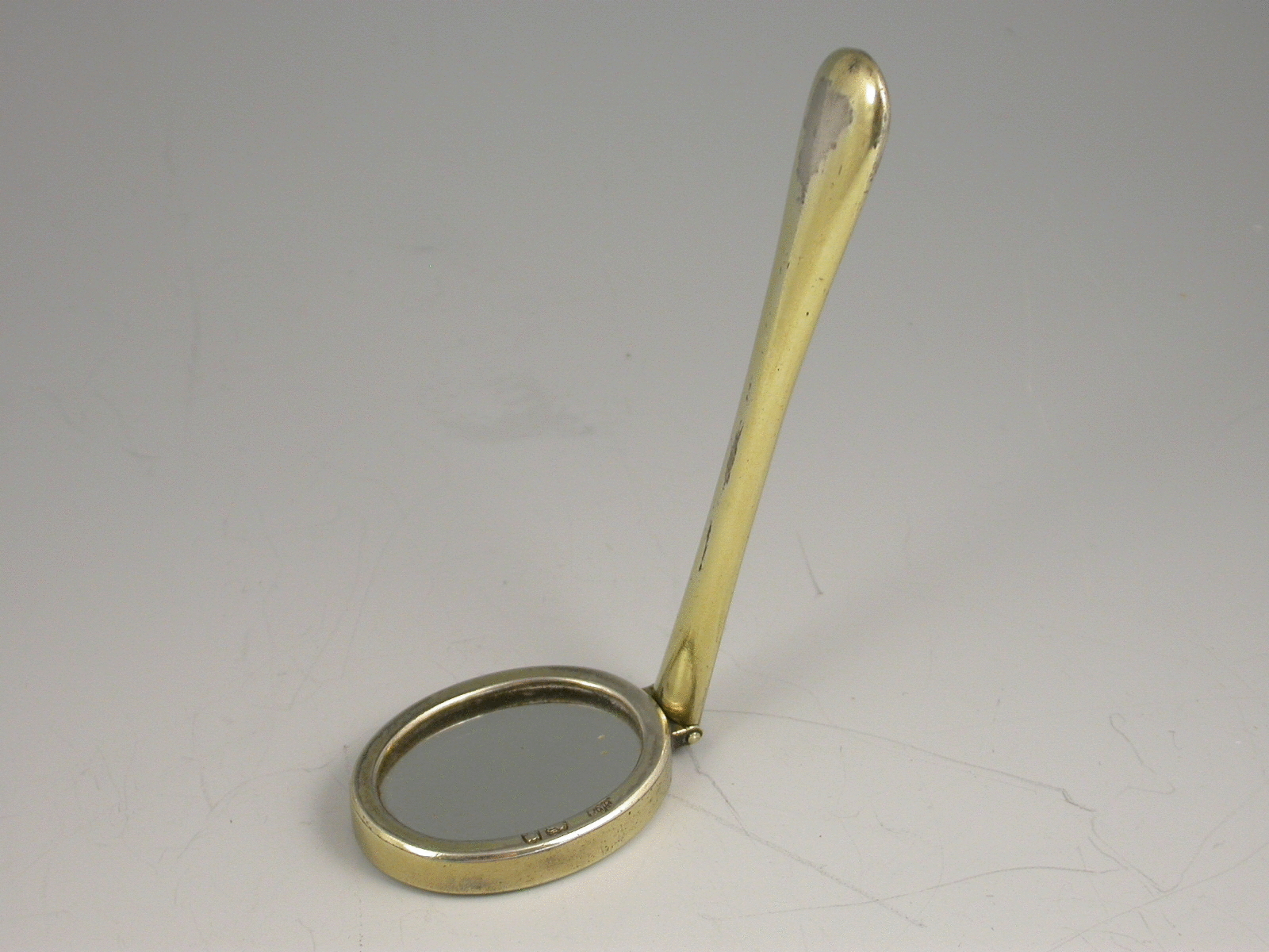 An unusual Victorian silver gilt Dental Mirror, the Old English shaped hollow handle hinged to allow the mirror to swivel. Engraved with a contemporary crest and motto of Harcourt.