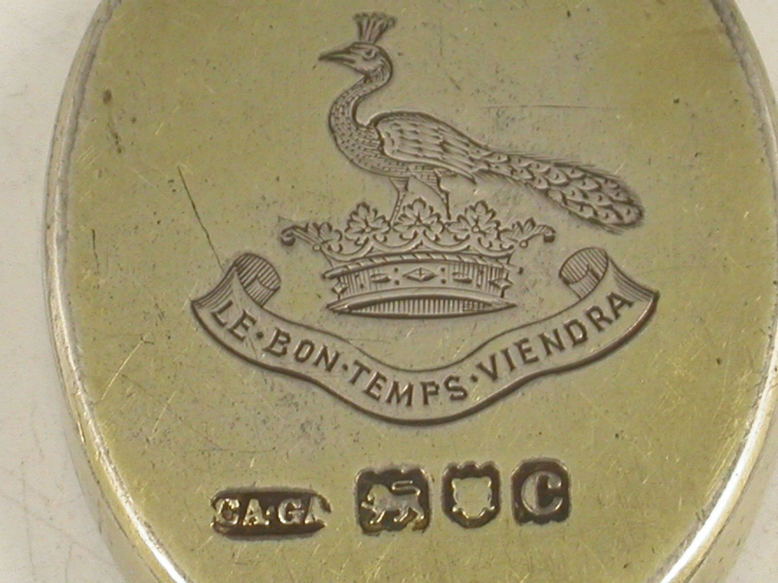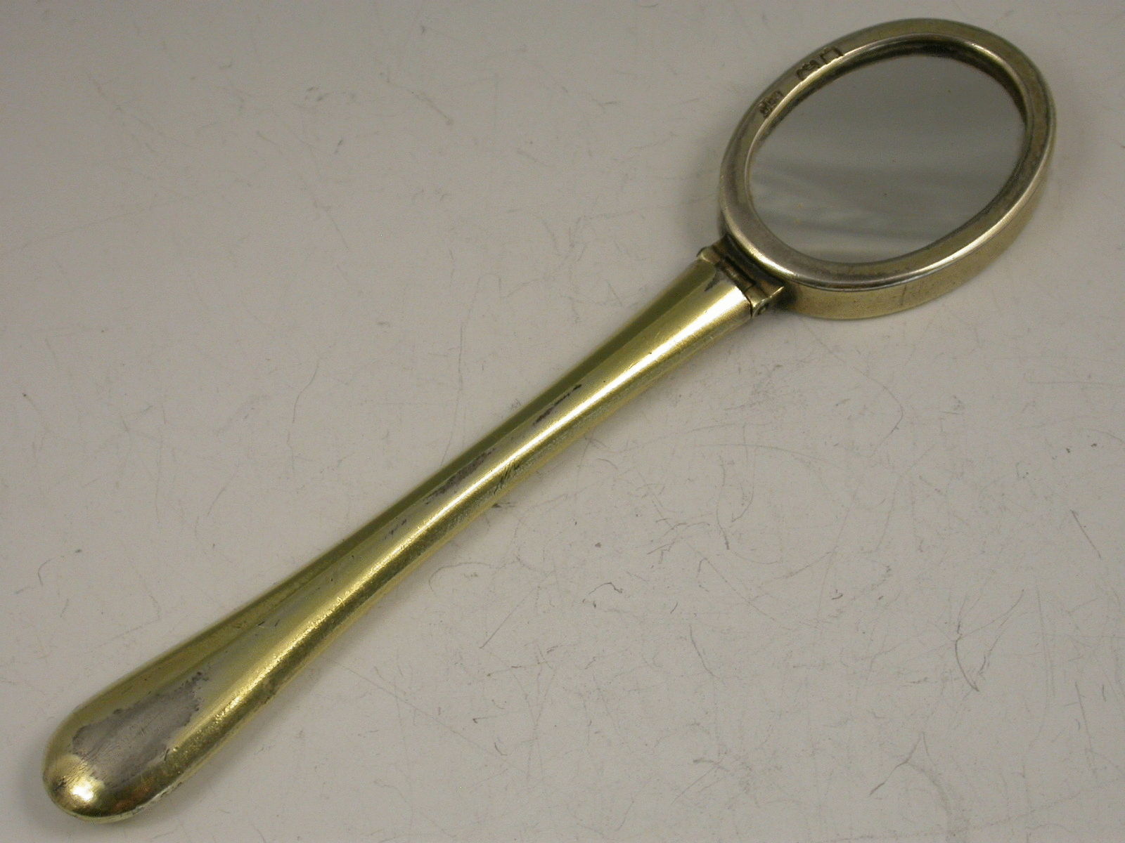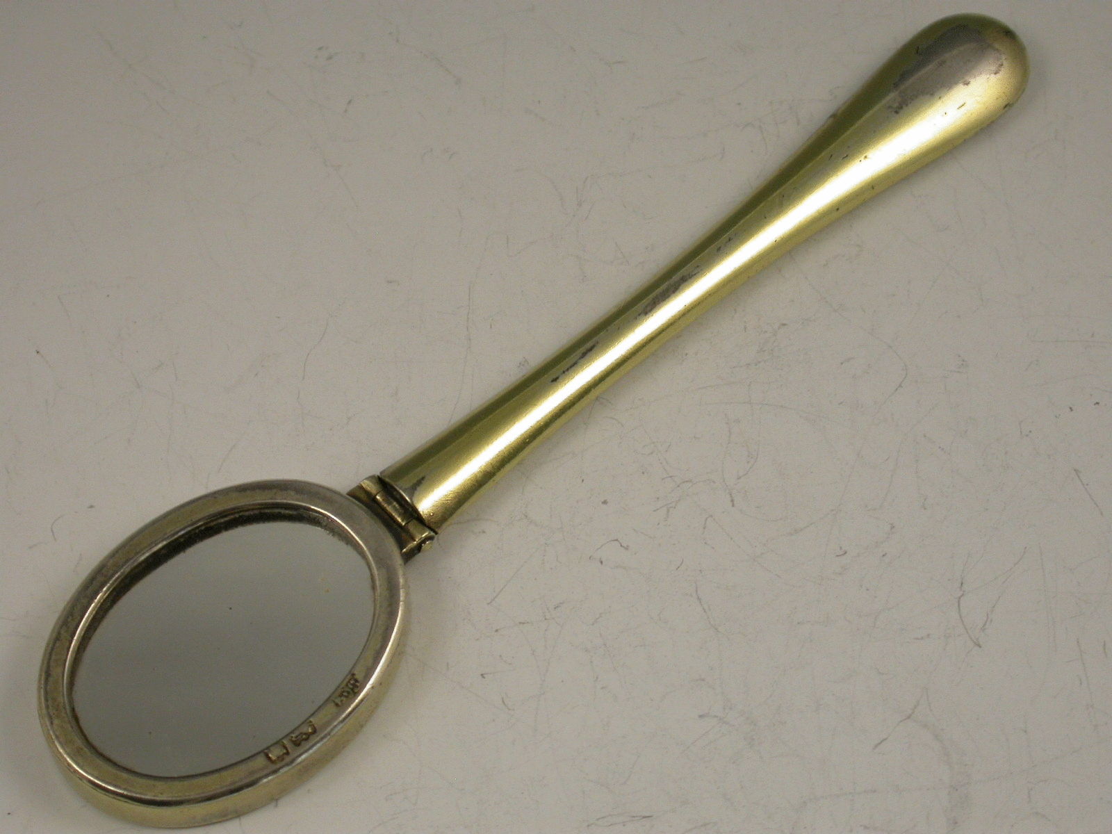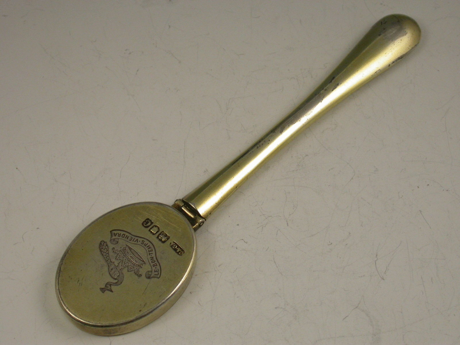 An unusual Victorian silver gilt Dental Mirror, the Old English shaped hollow handle hinged to allow the mirror to swivel. Engraved with a contemporary crest and motto of Harcourt.