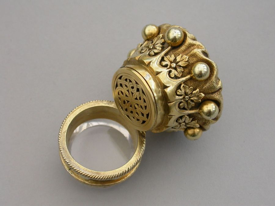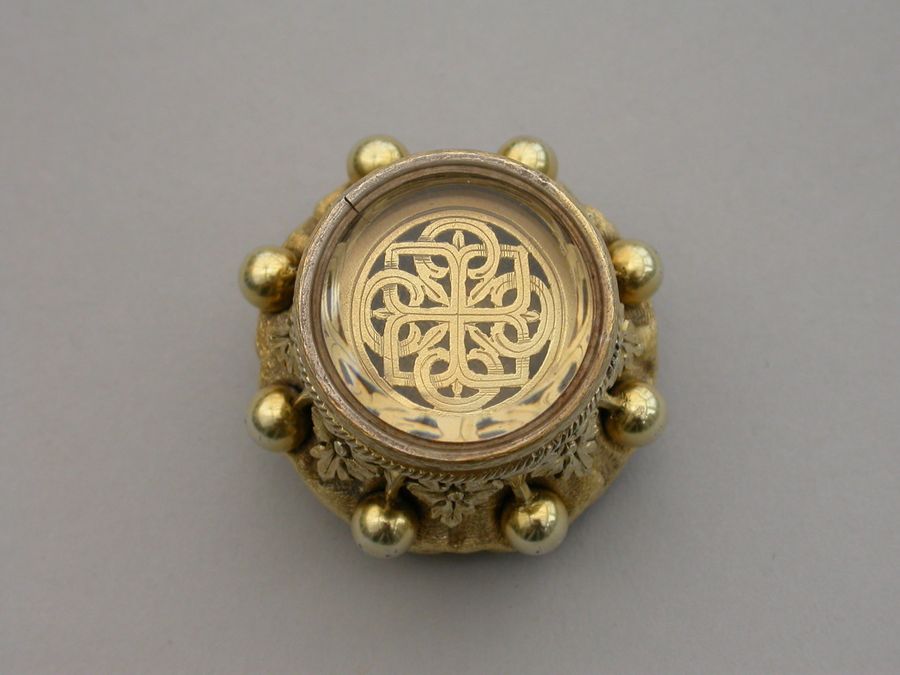 A fine quality Victorian novelty silver gilt Vinaigrette cast as an Earl's Coronet, hinging to reveal a pierced geometric design grille visible through a beveled crystal base. Sitting on its own purple velvet display cushion with gilt cording and a tassel to each corner.