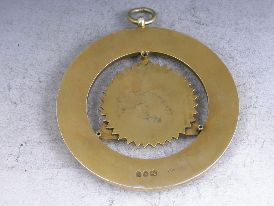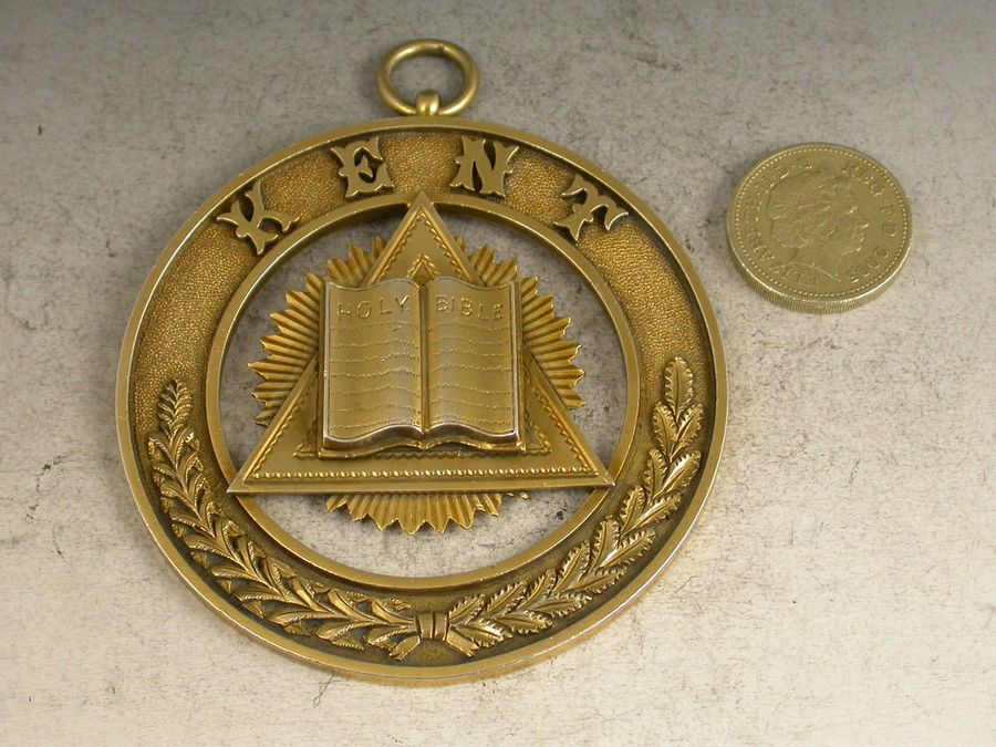 A Victorian silver gilt Masonic Badge / Medal depicting the Holy Bible on top of a triangle and rising sun, the border with a laurel wreath and the word 'KENT' on a matt back-ground, with attached suspension ring.