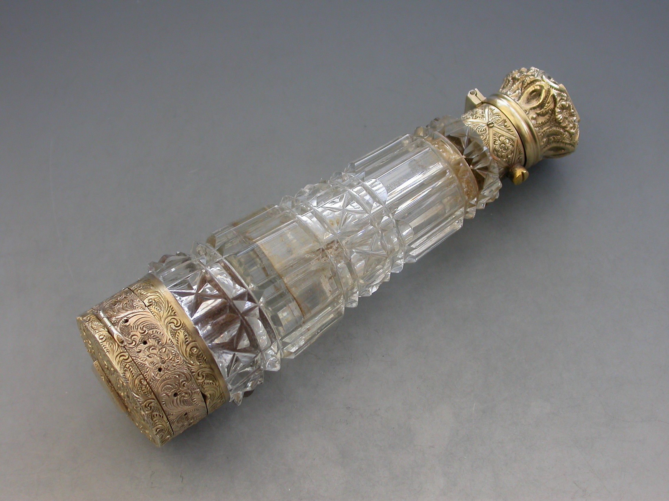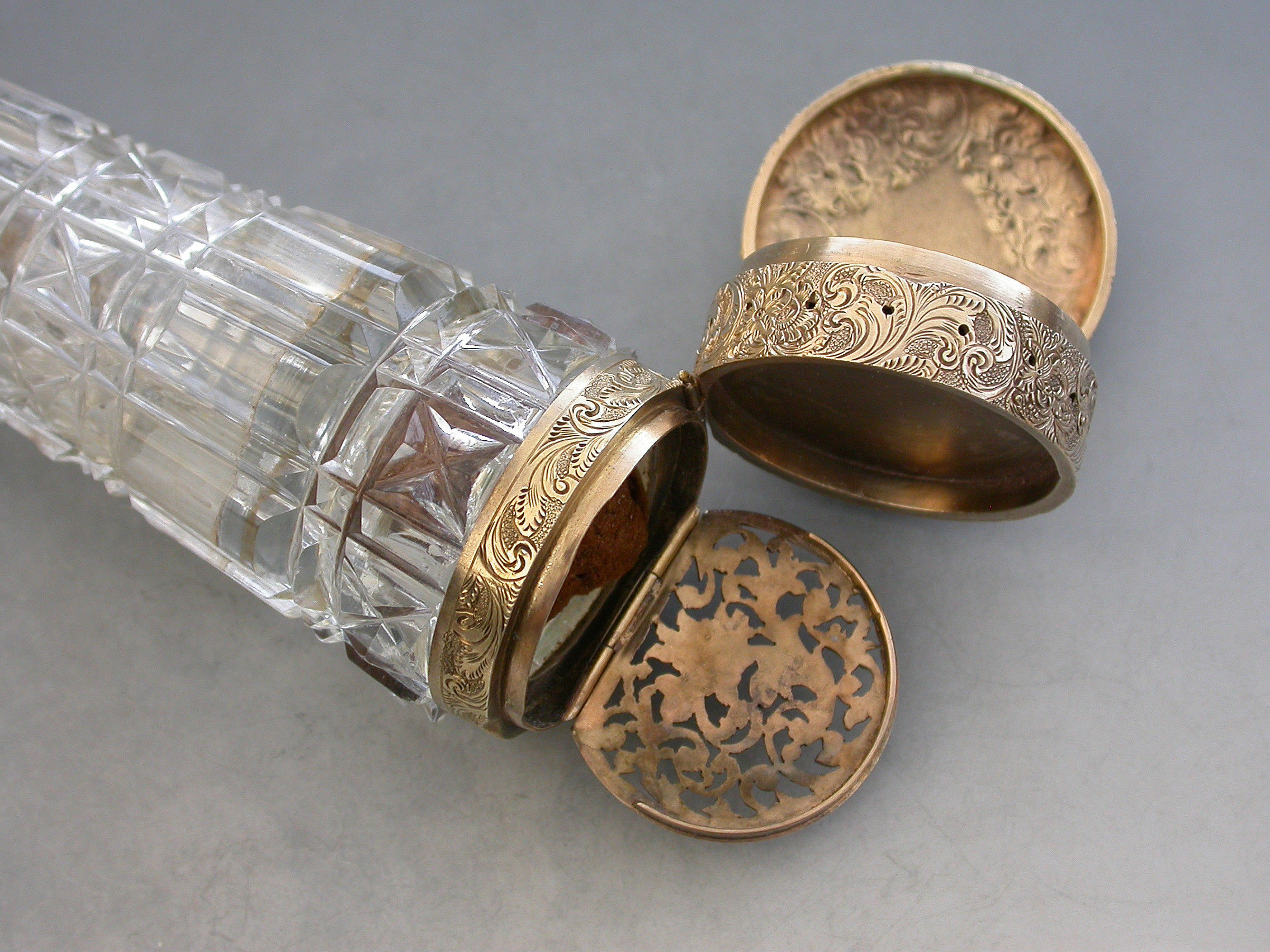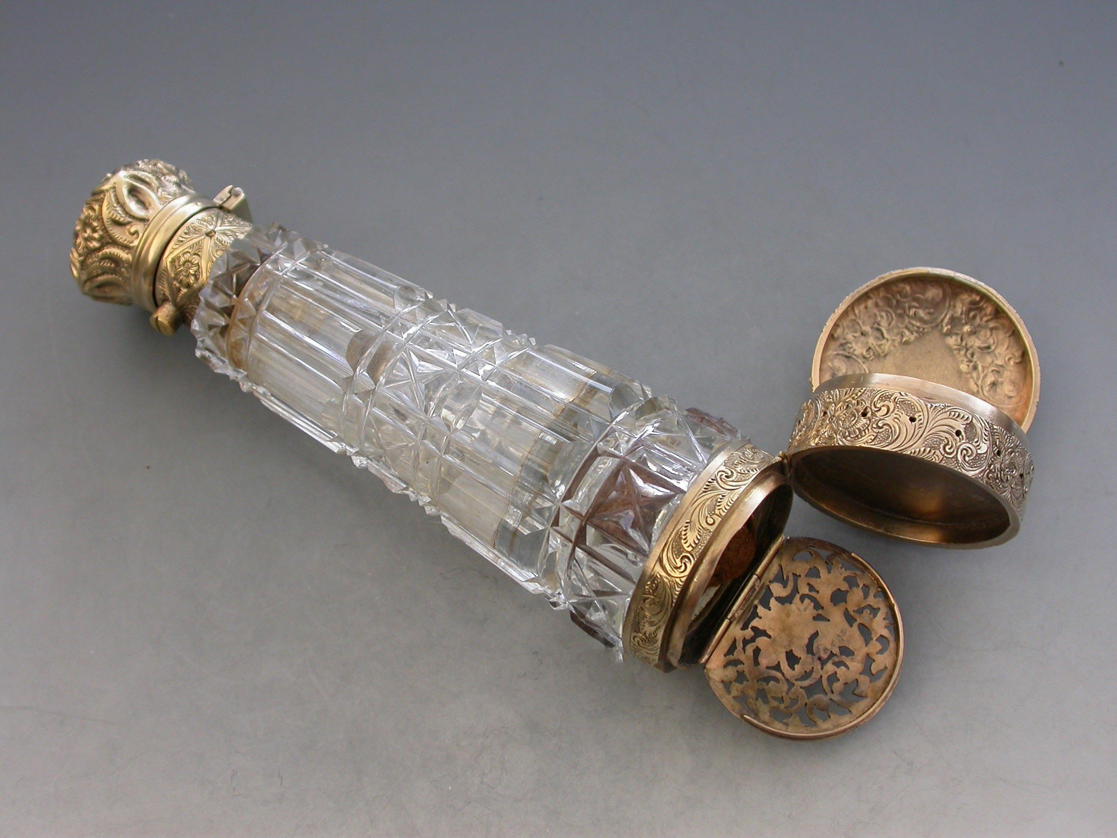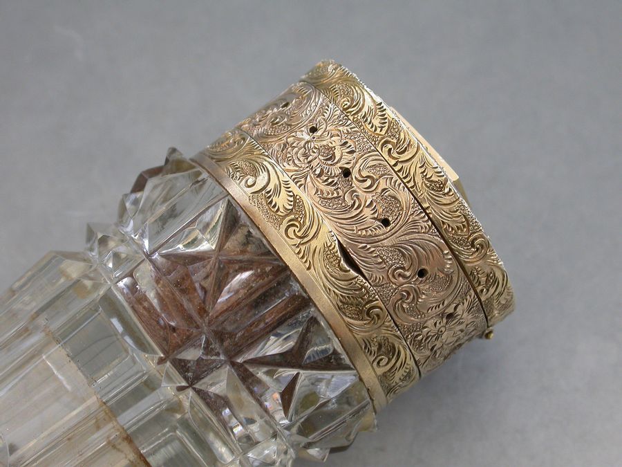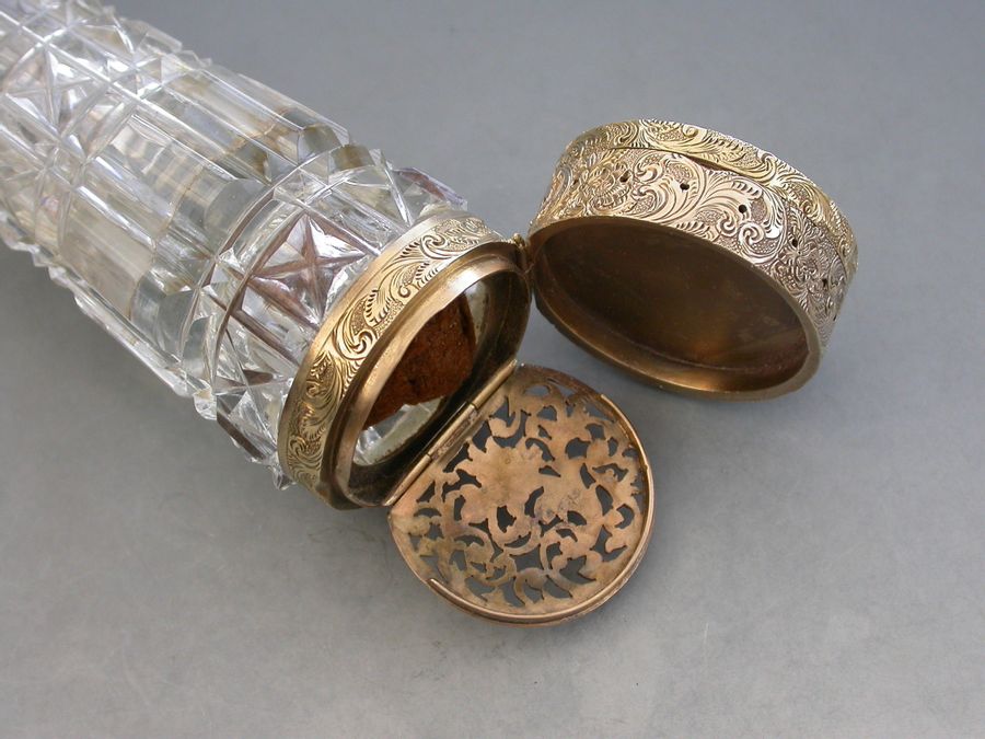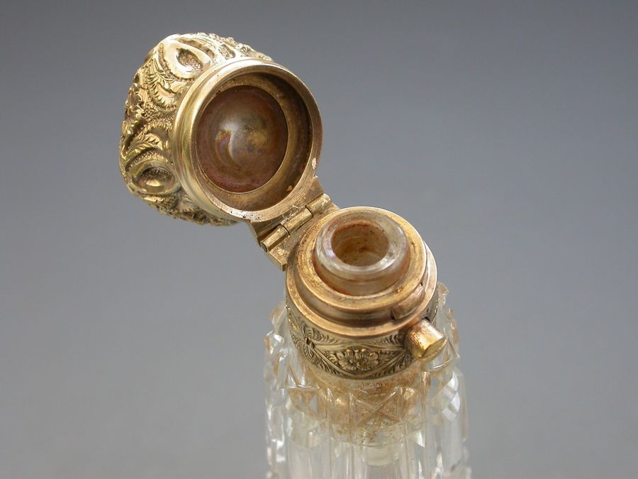 An unusual Victorian silver gilt mounted tapering faceted cut-glass Scent Bottle with multi compartments. The silver gilt lid with chased decoration and sprung push-button opening mechanism, the silver gilt base hinging open in two sections to reveal a vinaigrette and photo compartment combined with a pin cushion with holes around the circumference for pins. Diamond shaped cartouche to the base engraved with the date 29th July 1872.