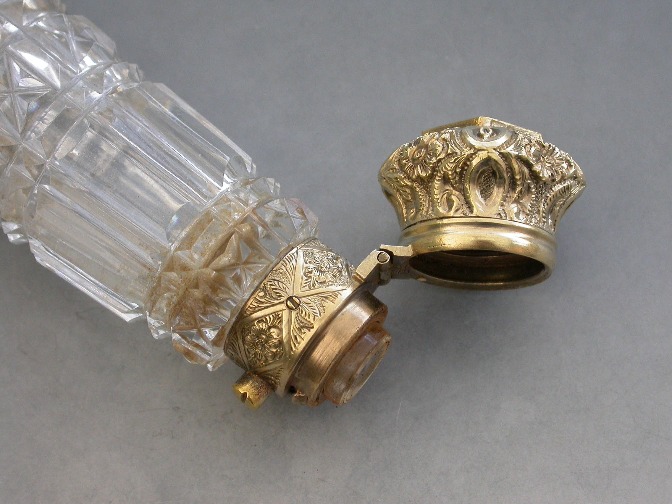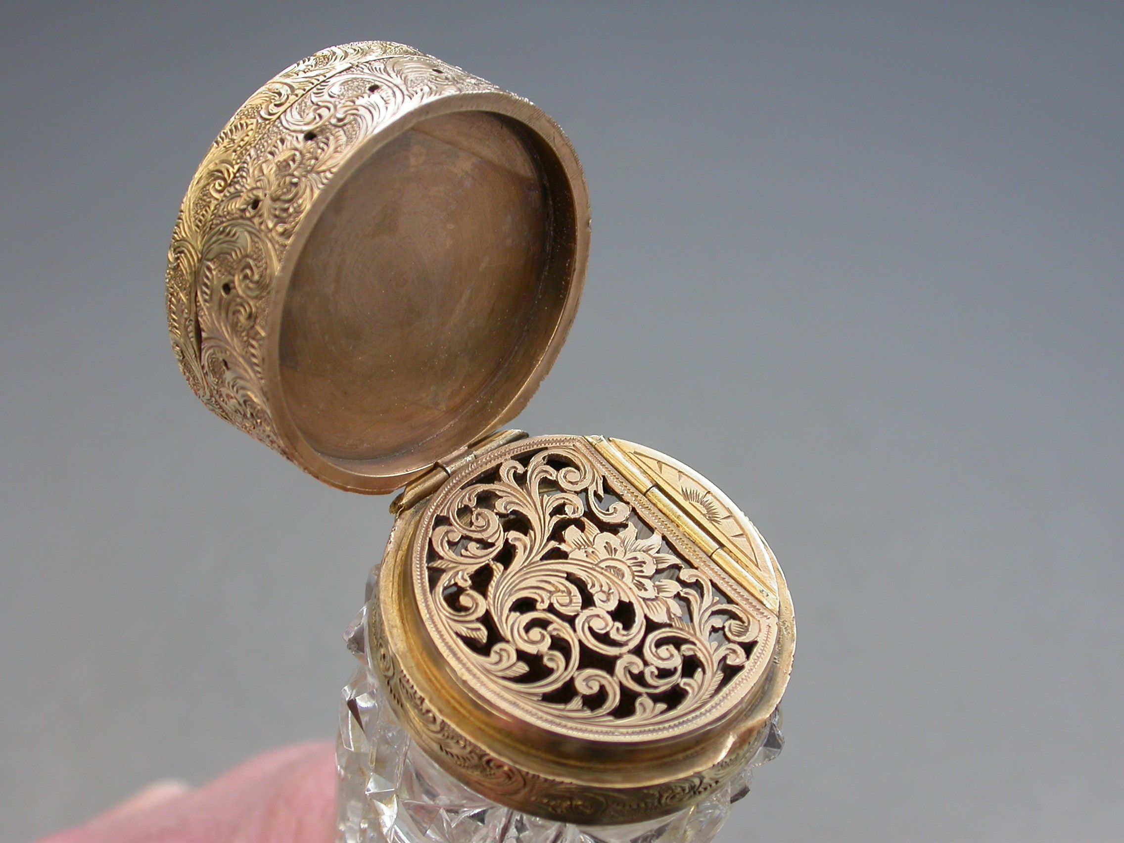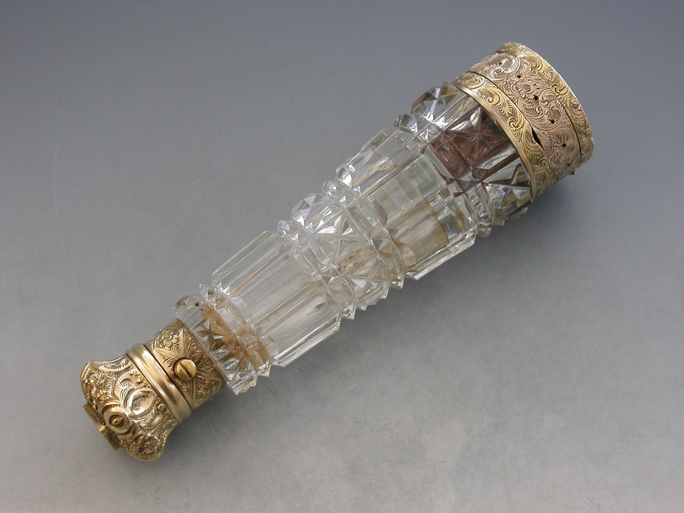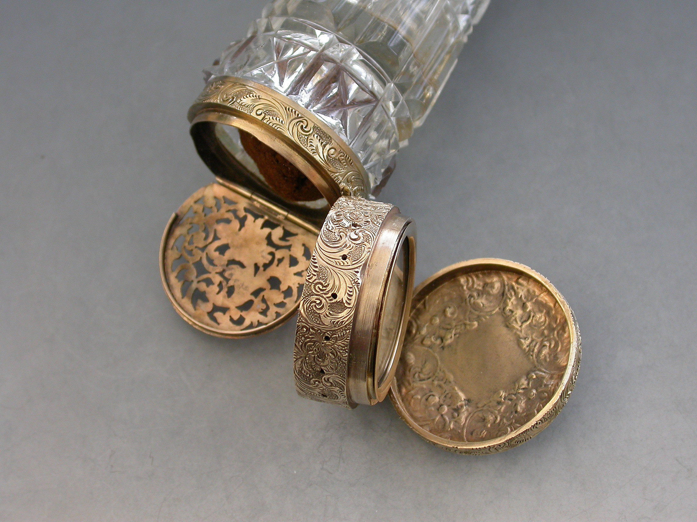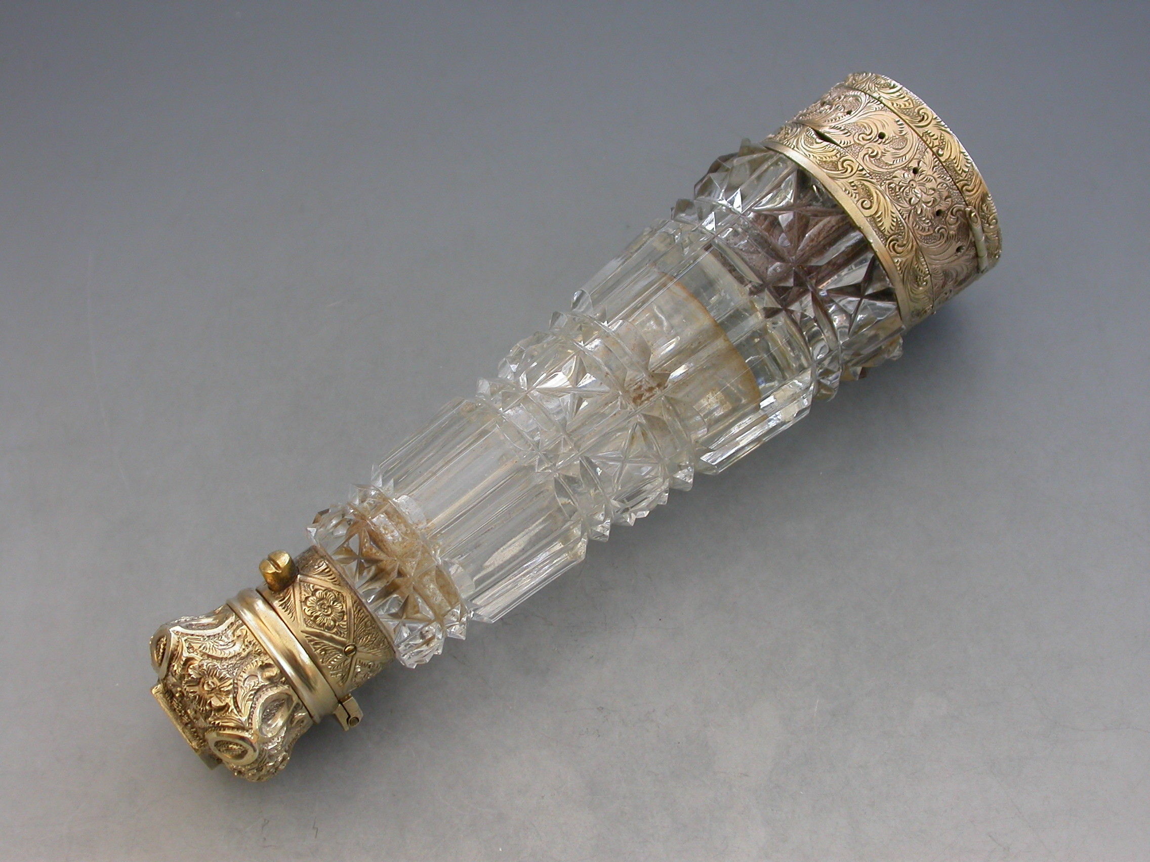 An unusual Victorian silver gilt mounted tapering faceted cut-glass Scent Bottle with multi compartments. The silver gilt lid with chased decoration and sprung push-button opening mechanism, the silver gilt base hinging open in two sections to reveal a vinaigrette and photo compartment combined with a pin cushion with holes around the circumference for pins. Diamond shaped cartouche to the base engraved with the date 29th July 1872.