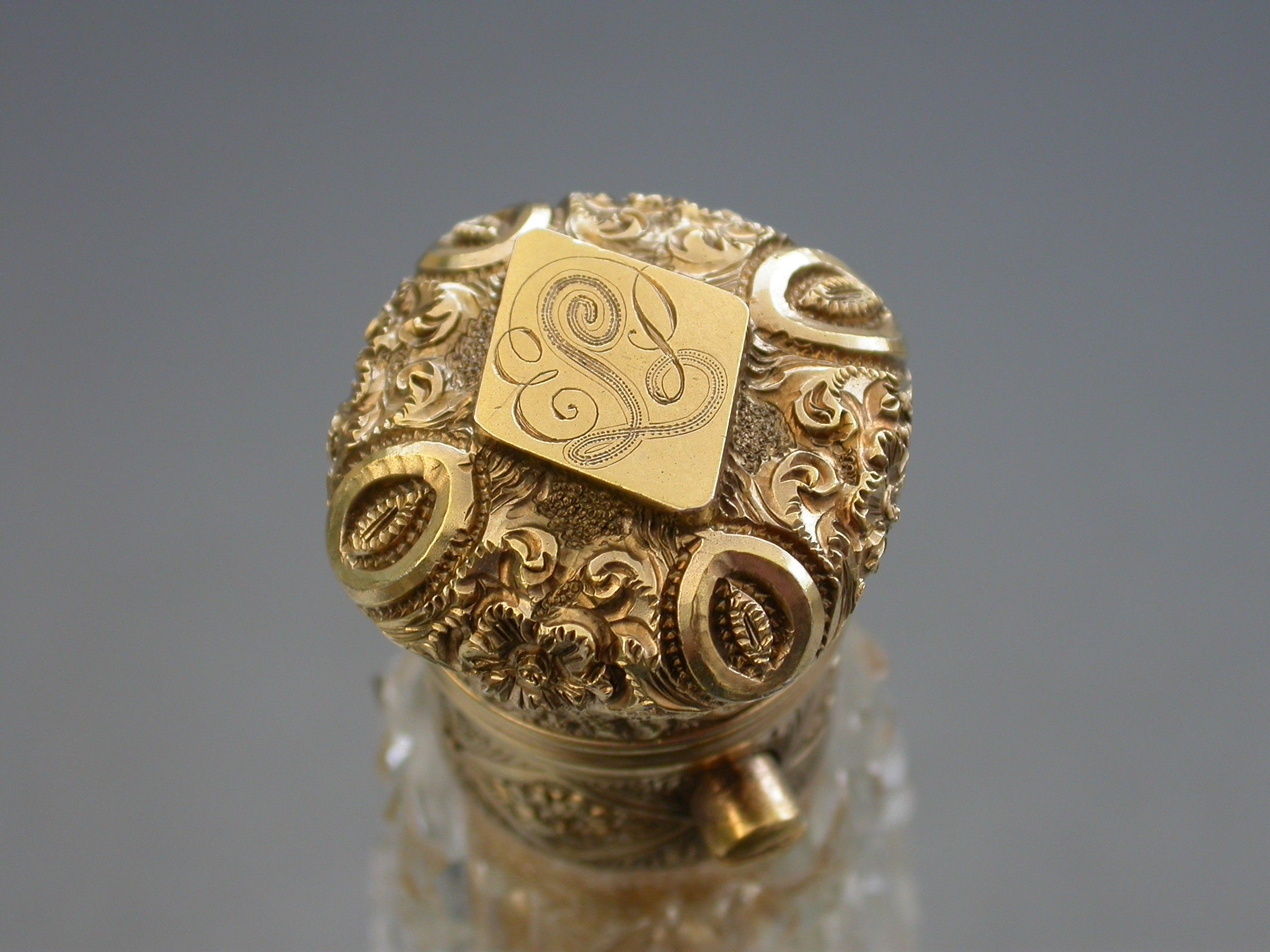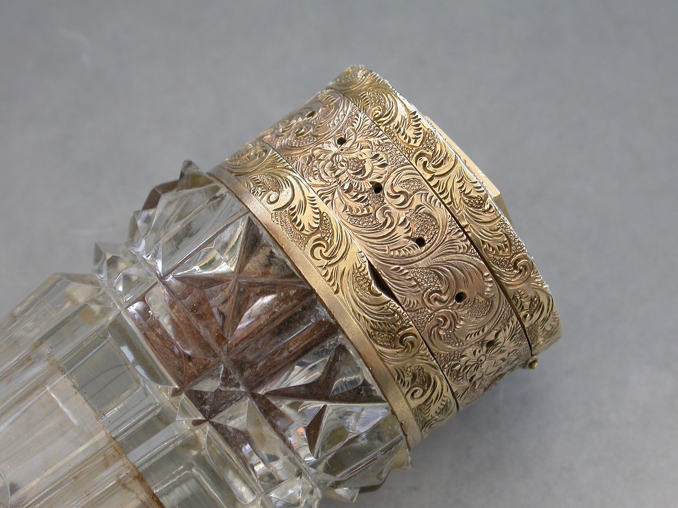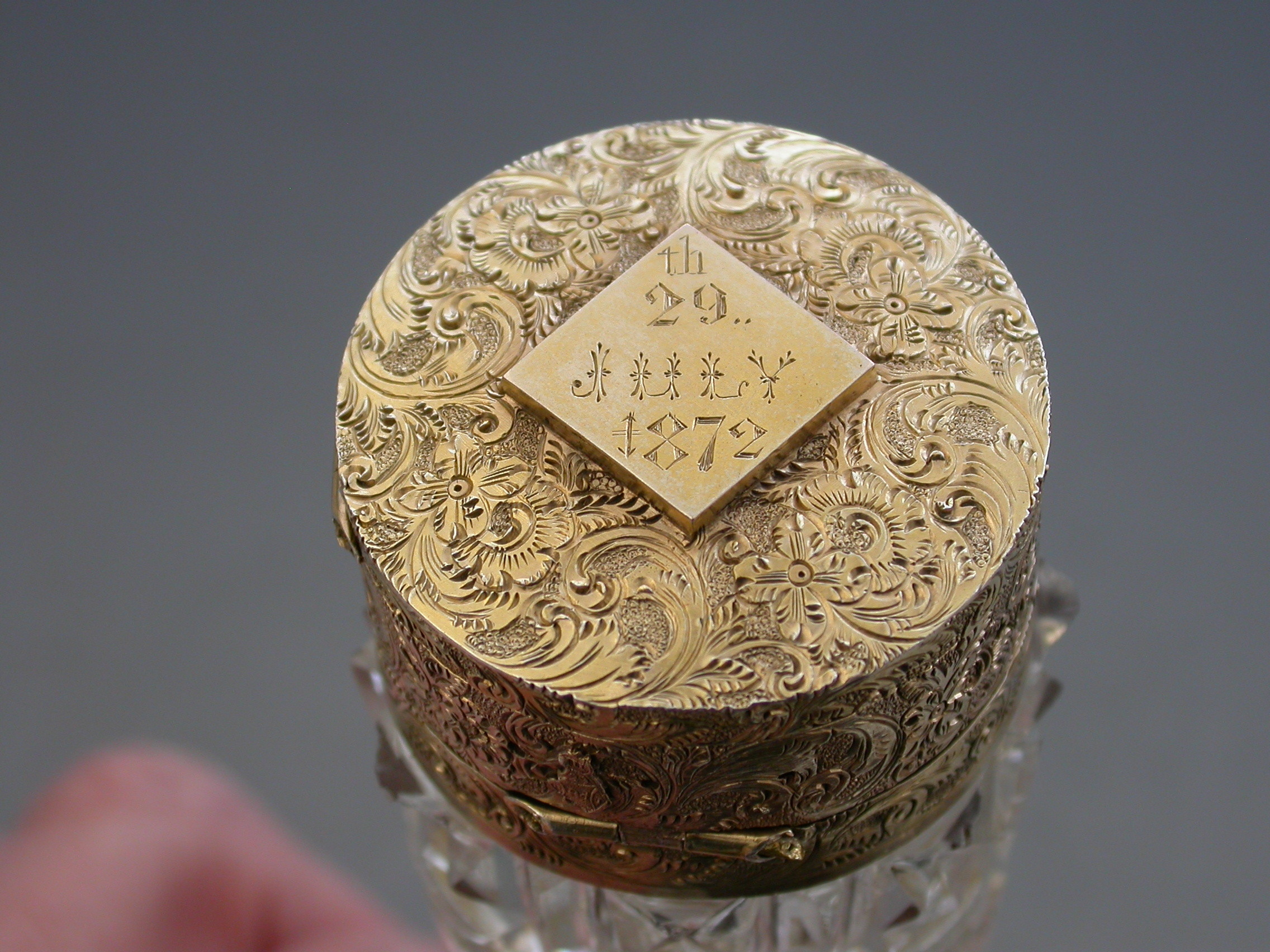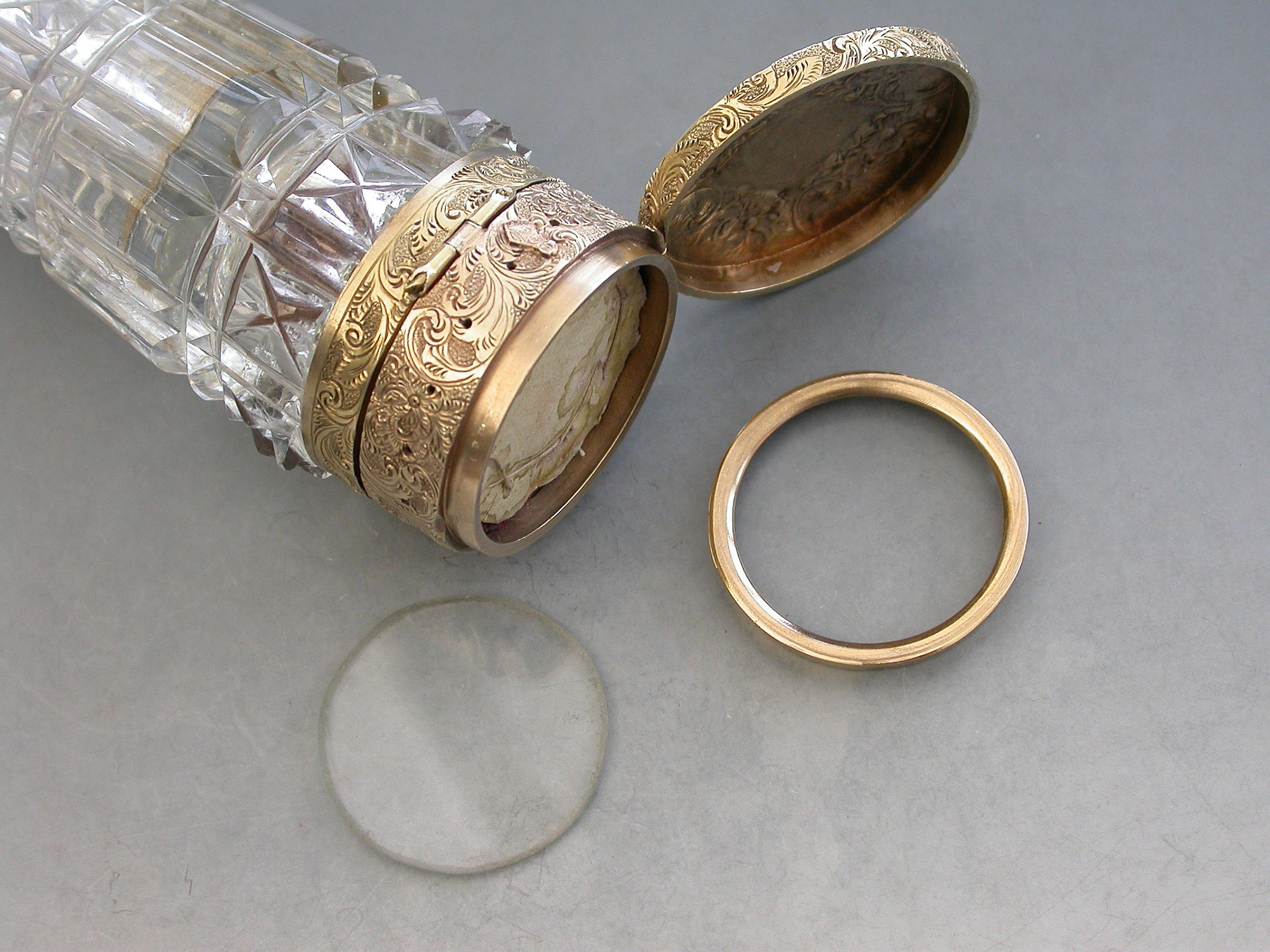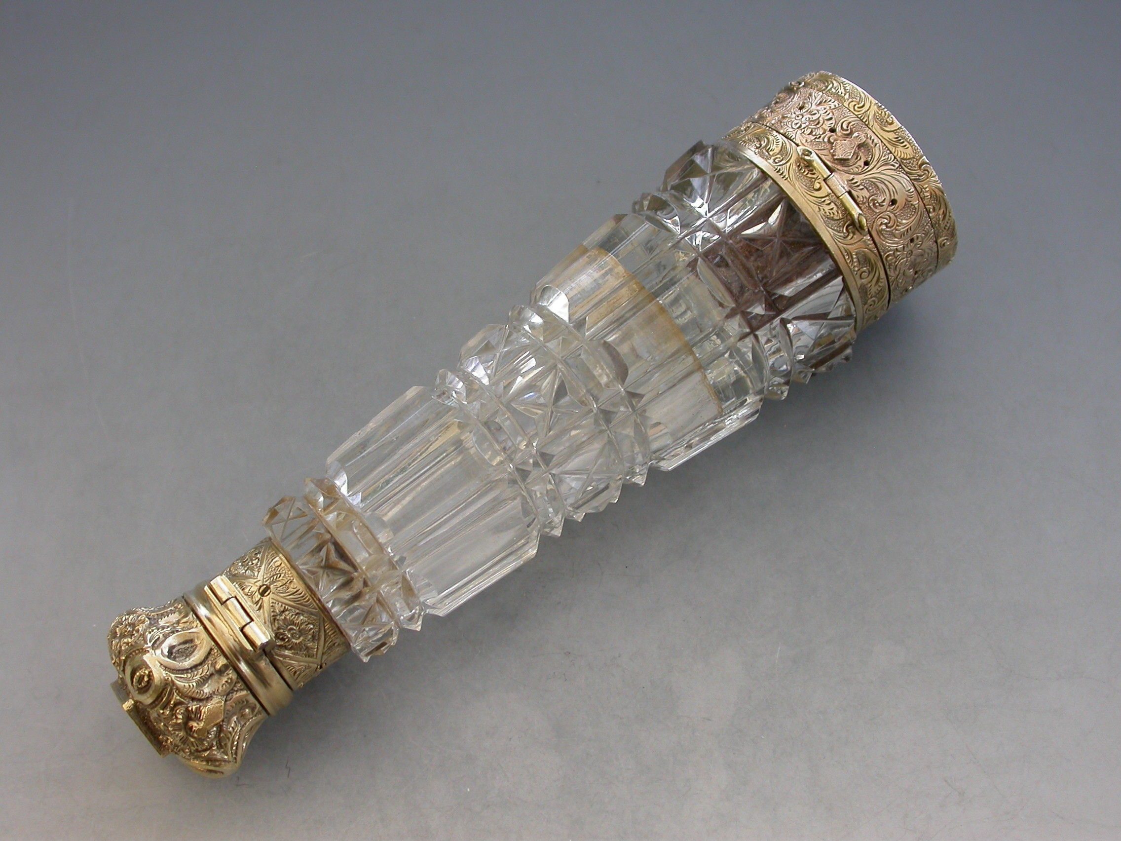 An unusual Victorian silver gilt mounted tapering faceted cut-glass Scent Bottle with multi compartments. The silver gilt lid with chased decoration and sprung push-button opening mechanism, the silver gilt base hinging open in two sections to reveal a vinaigrette and photo compartment combined with a pin cushion with holes around the circumference for pins. Diamond shaped cartouche to the base engraved with the date 29th July 1872.