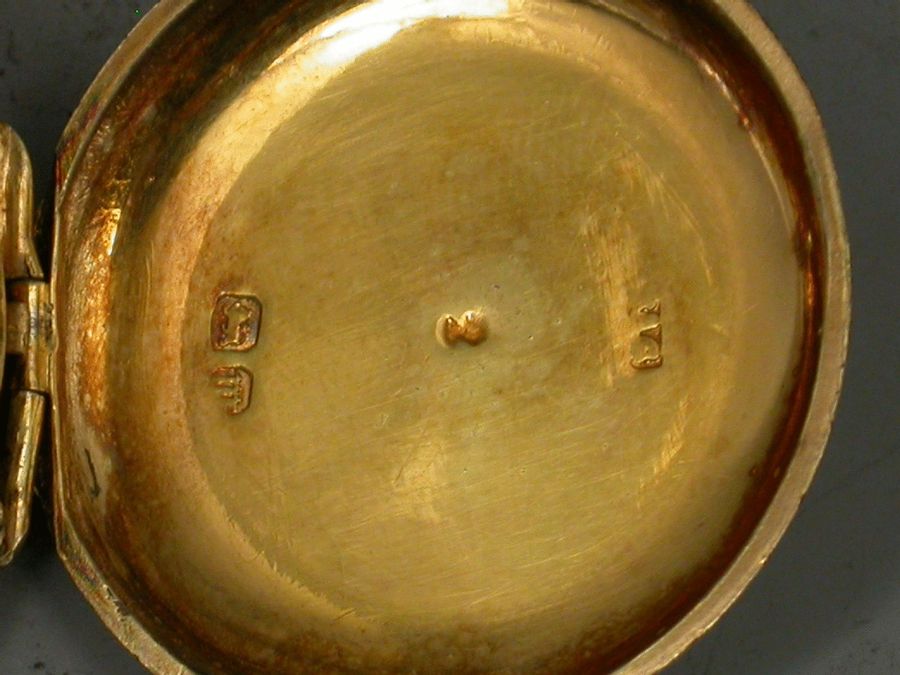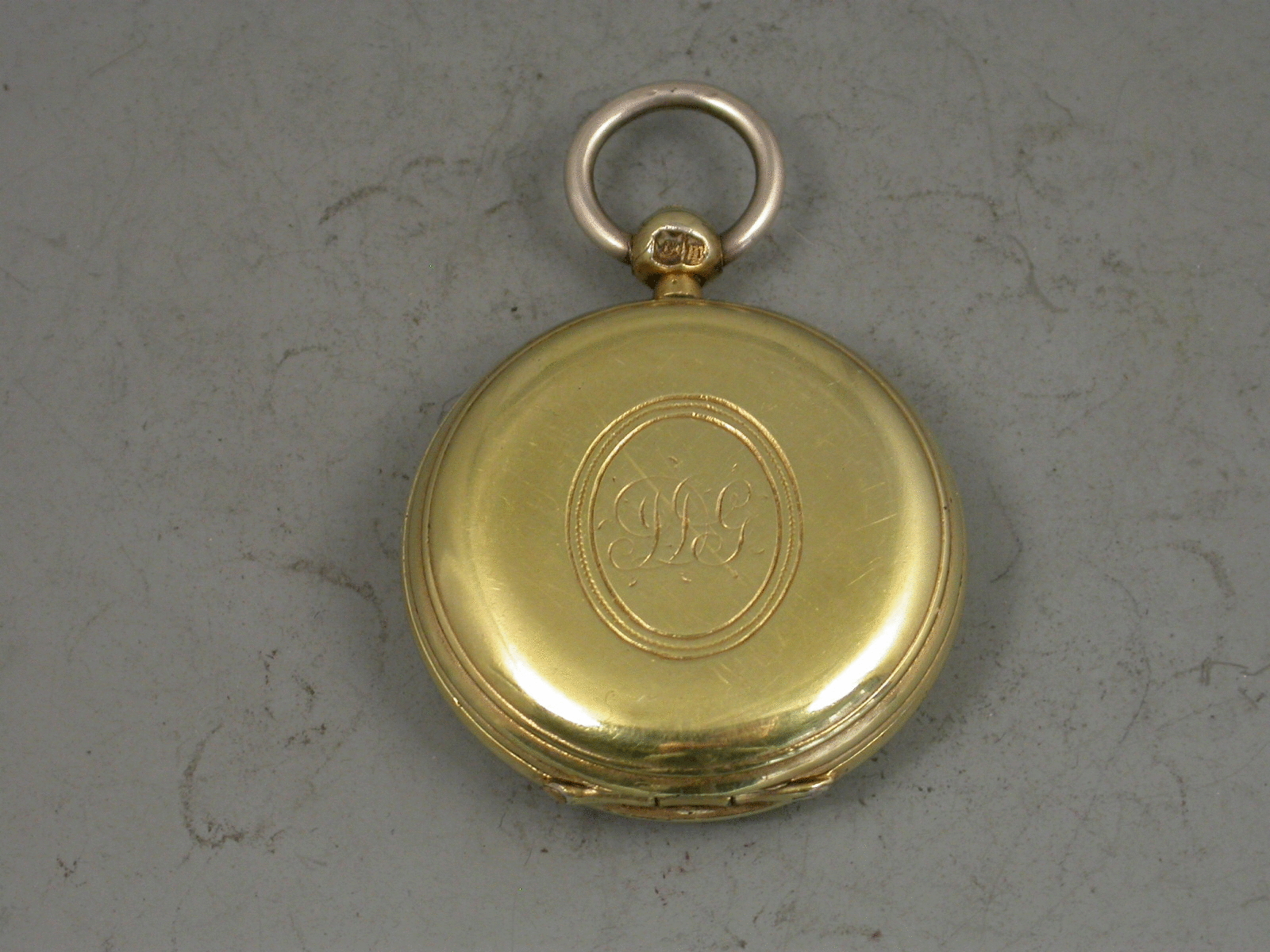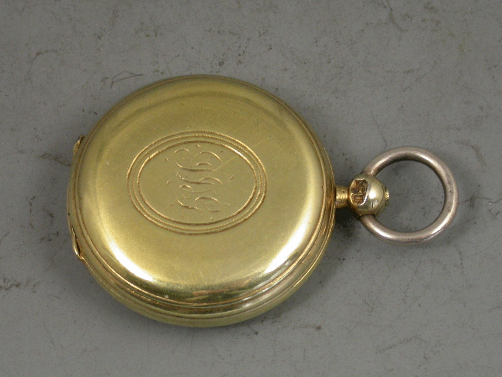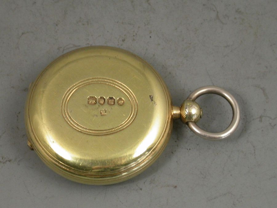 A good Victorian silver gilt Compass of pocket watch form, the plain circular case with reeded decoration and engraved with contemporary initials to an oval cartouche. White enamel dial.