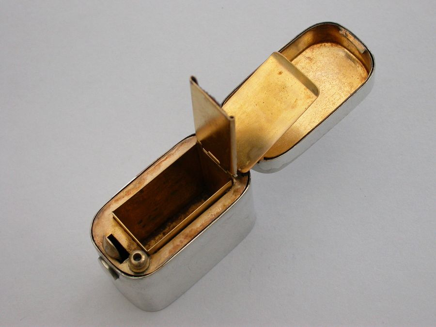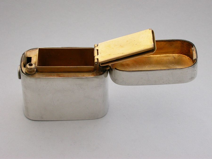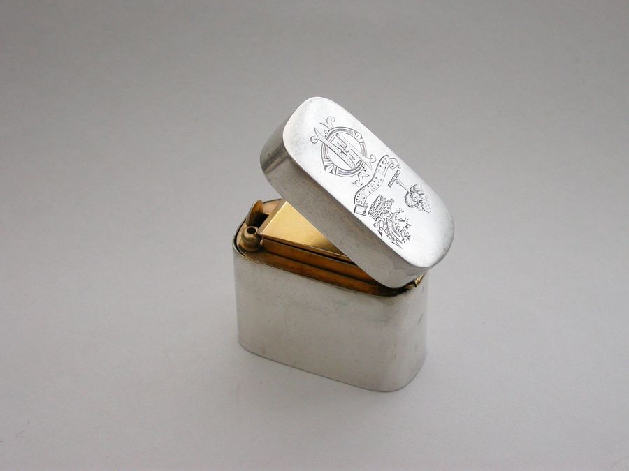A good quality Victorian silver ""Go-to-Bed"" Vesta Case of a heavy gauge and rounded oblong form, the lid engraved with contemporary crests, motto and initials. A push-button sprung opening mechanism to the hinged lid and a silver gilt interior with two further protective hinged lids to the vesta compartment, one set with a striker. A ball shaped support for a lit match.