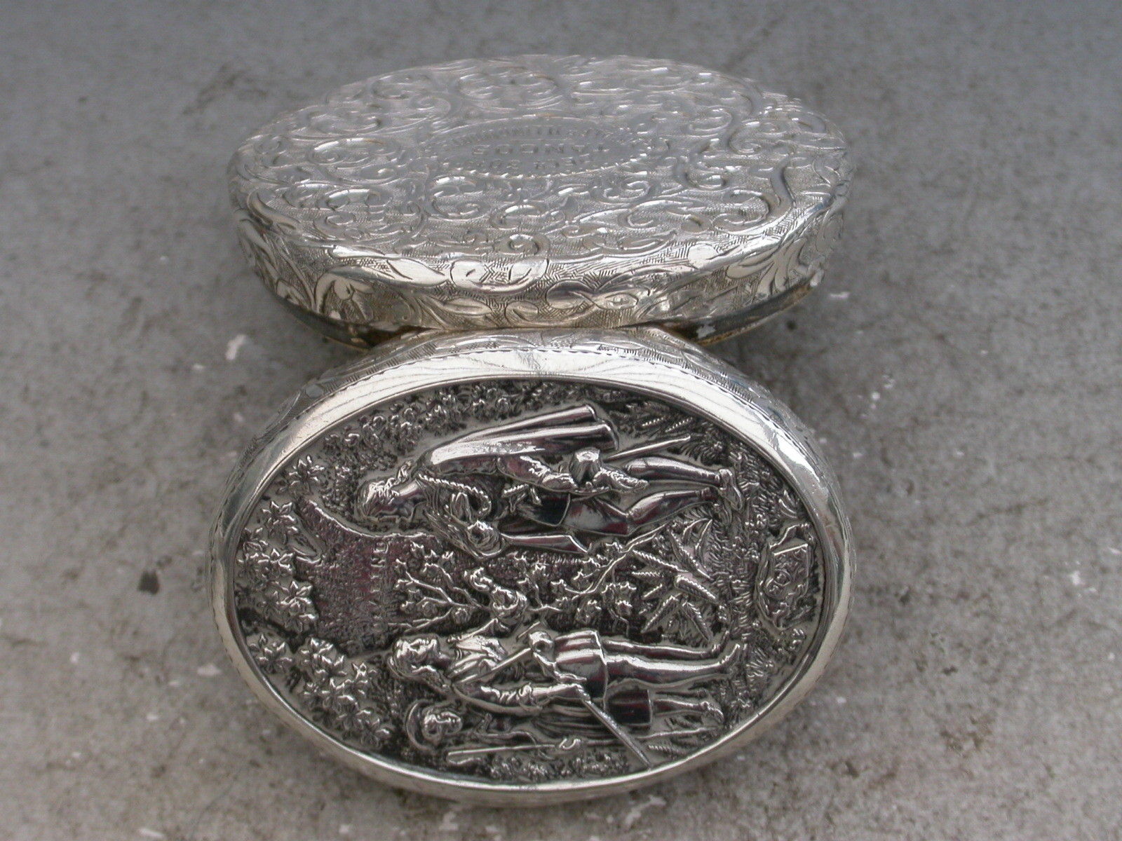 A rare Victorian silver Vinaigrette with theatrical interest, of compressed oval form with foliate scroll engraved decoration to the base and sides, the lid inset with a panel depicting a scene from Shakespeare's ""As you like it"" in high relief. The silver gilt interior with foliate scroll pierced grille. The base with an oval cartouche engraved with presentation inscription to Mrs Alfred Illingworth.