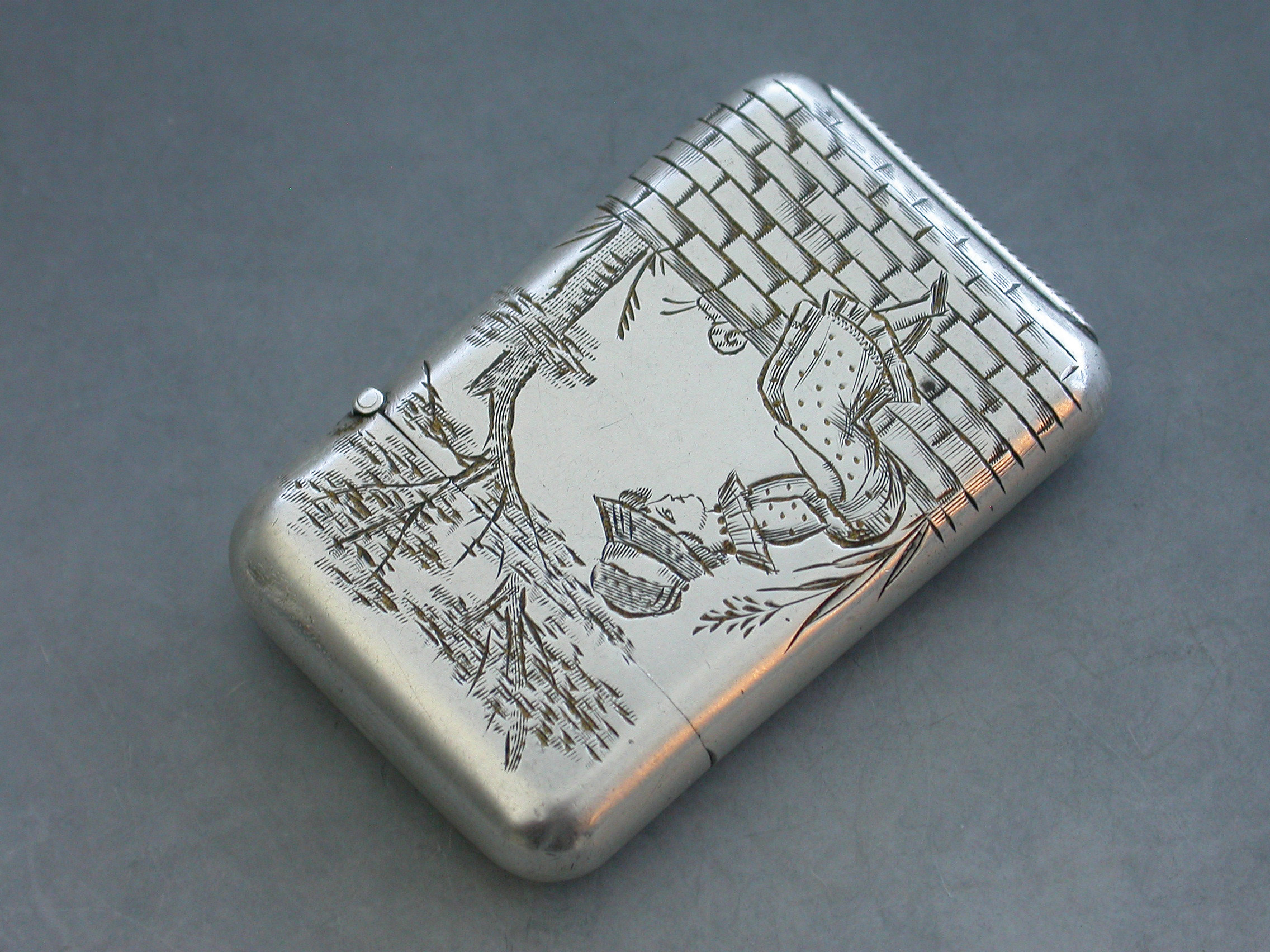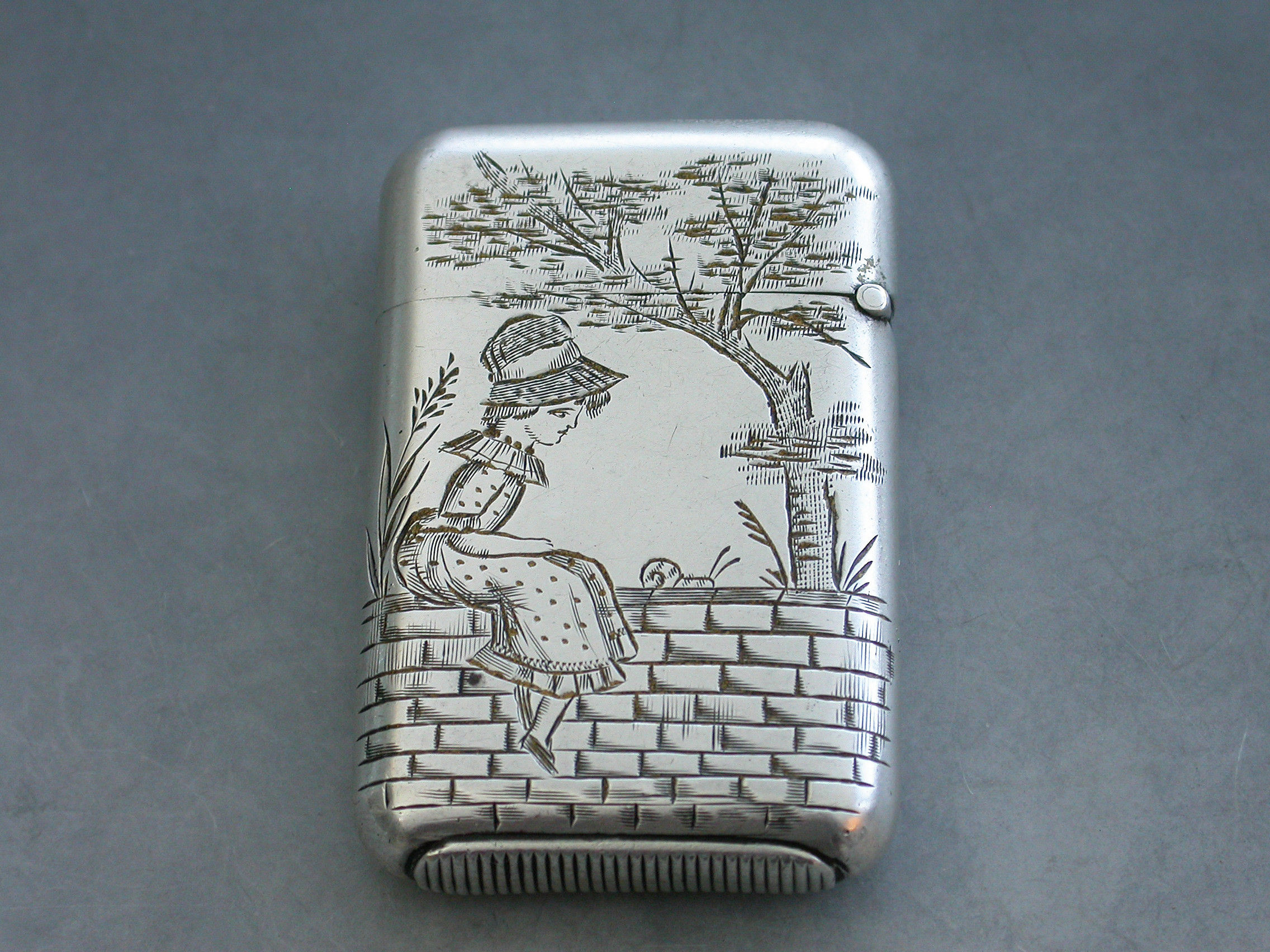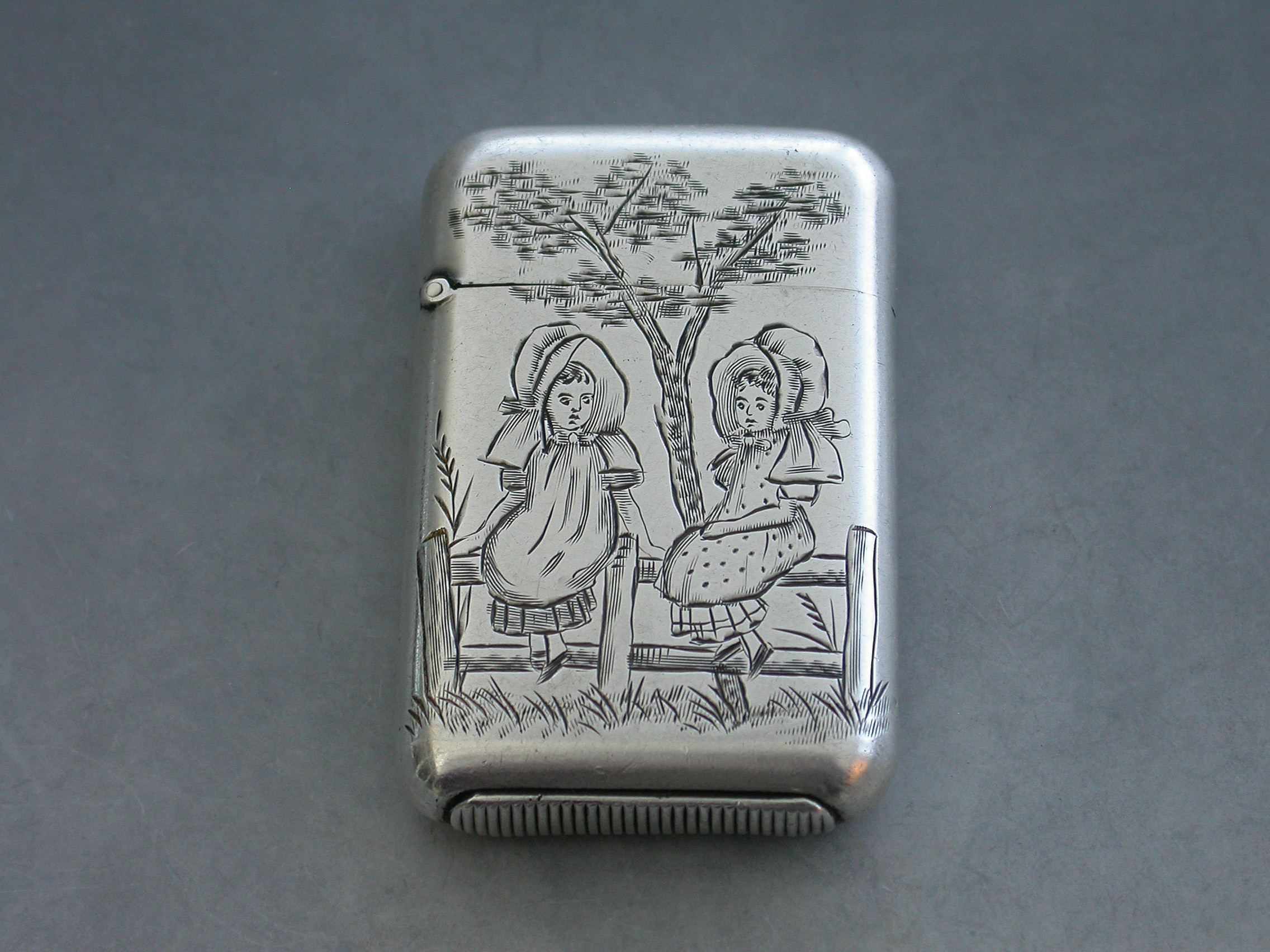 A fine Victorian silver Vesta Case of rounded rectangular form with sprung hinged lid, the face decorated in the Kate Greenaway style with two little girls sitting on a fence beneath a tree, the reverse with a little girl sitting on a brick wall watching a snail.