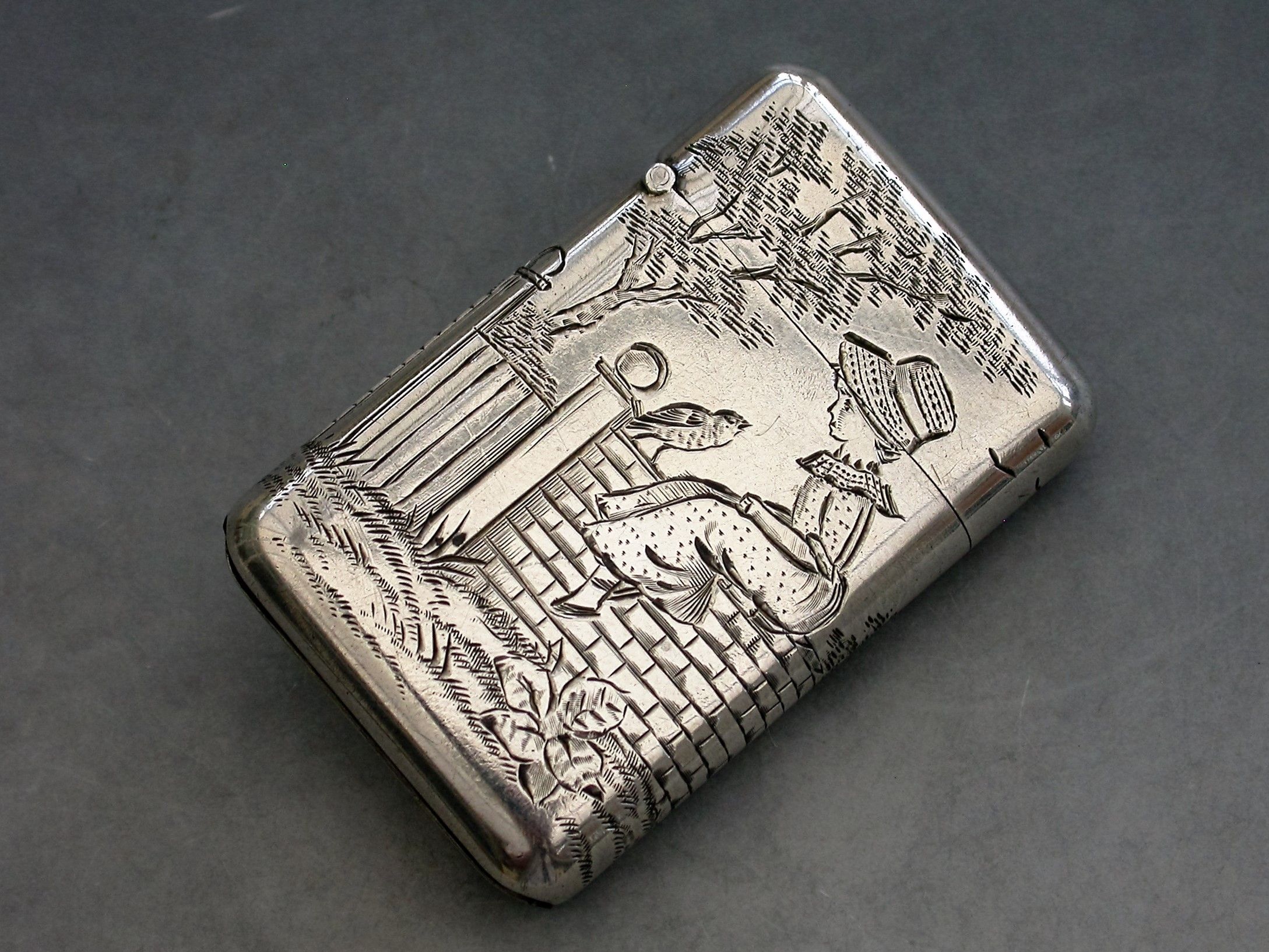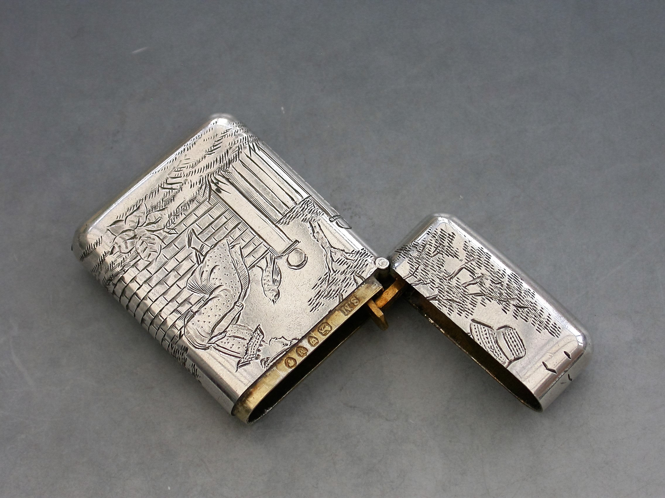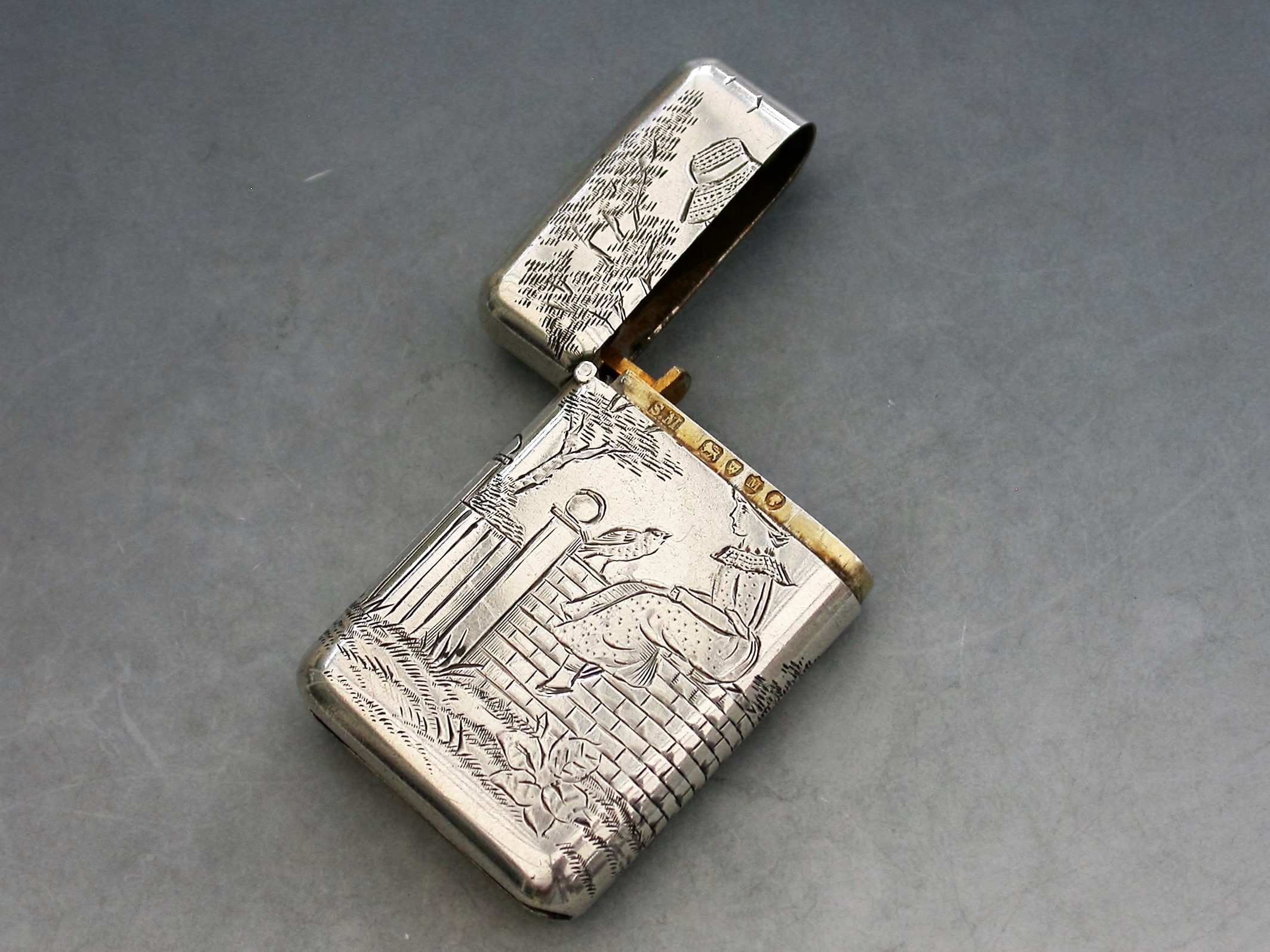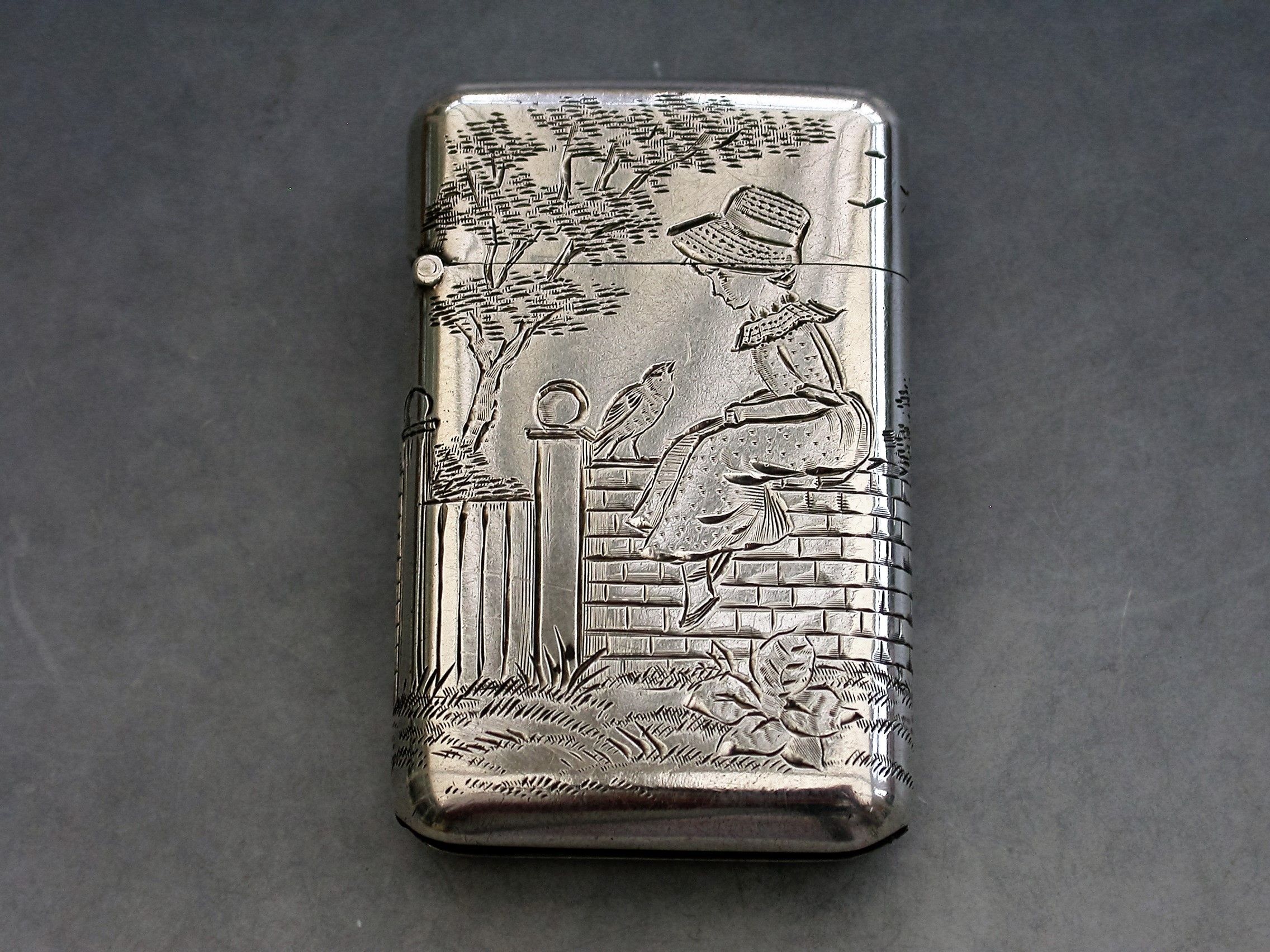 A fine and slightly unusual Victorian silver Vesta Case of rounded rectangular form with sprung hinged lid, the face decorated in the Kate Greenaway style with a little girl sitting on a wall watching a singing bird, the reverse with two little girls playing chase.
