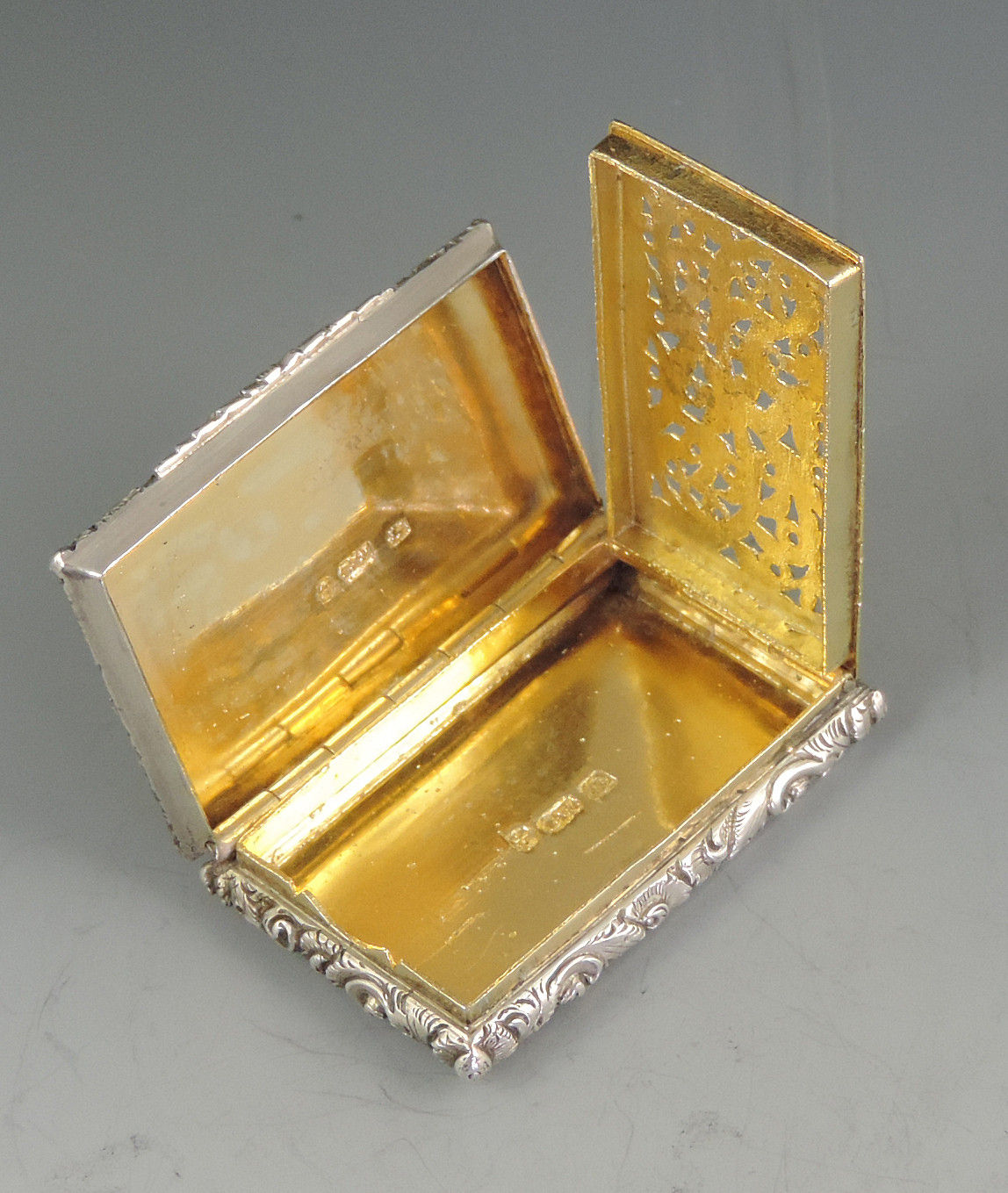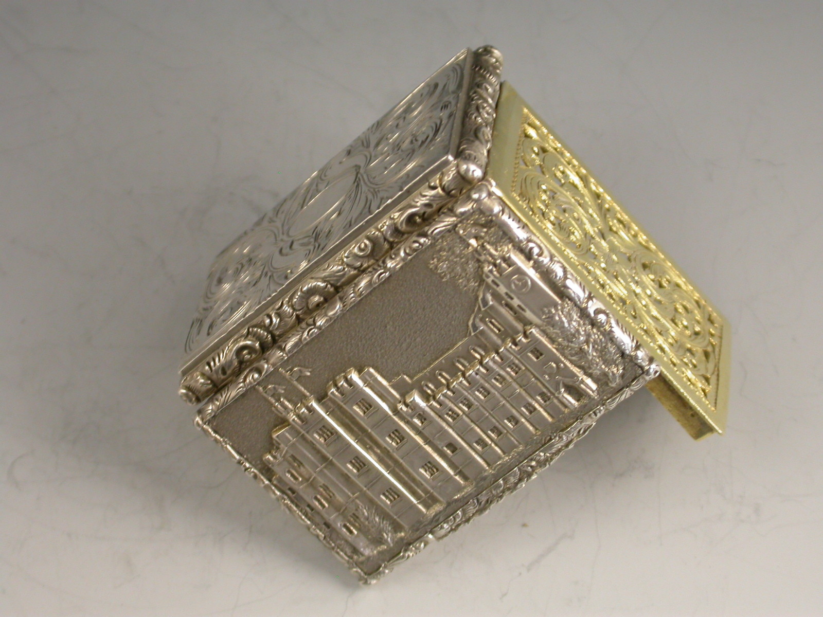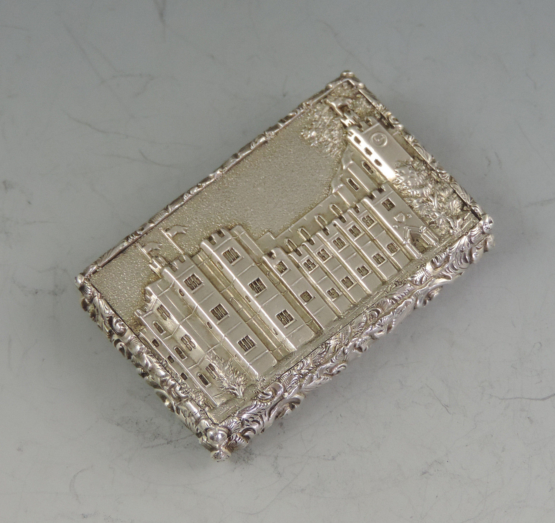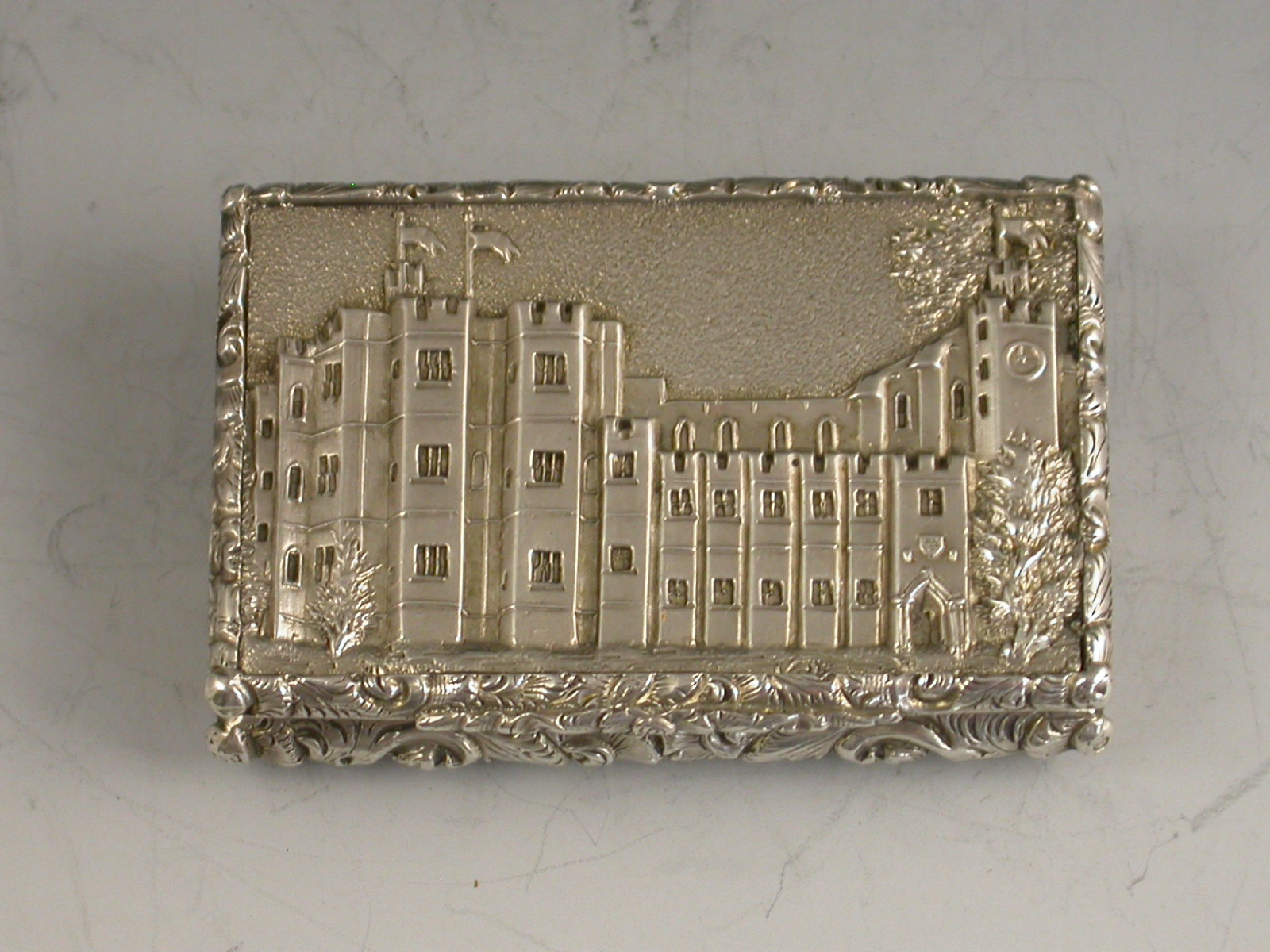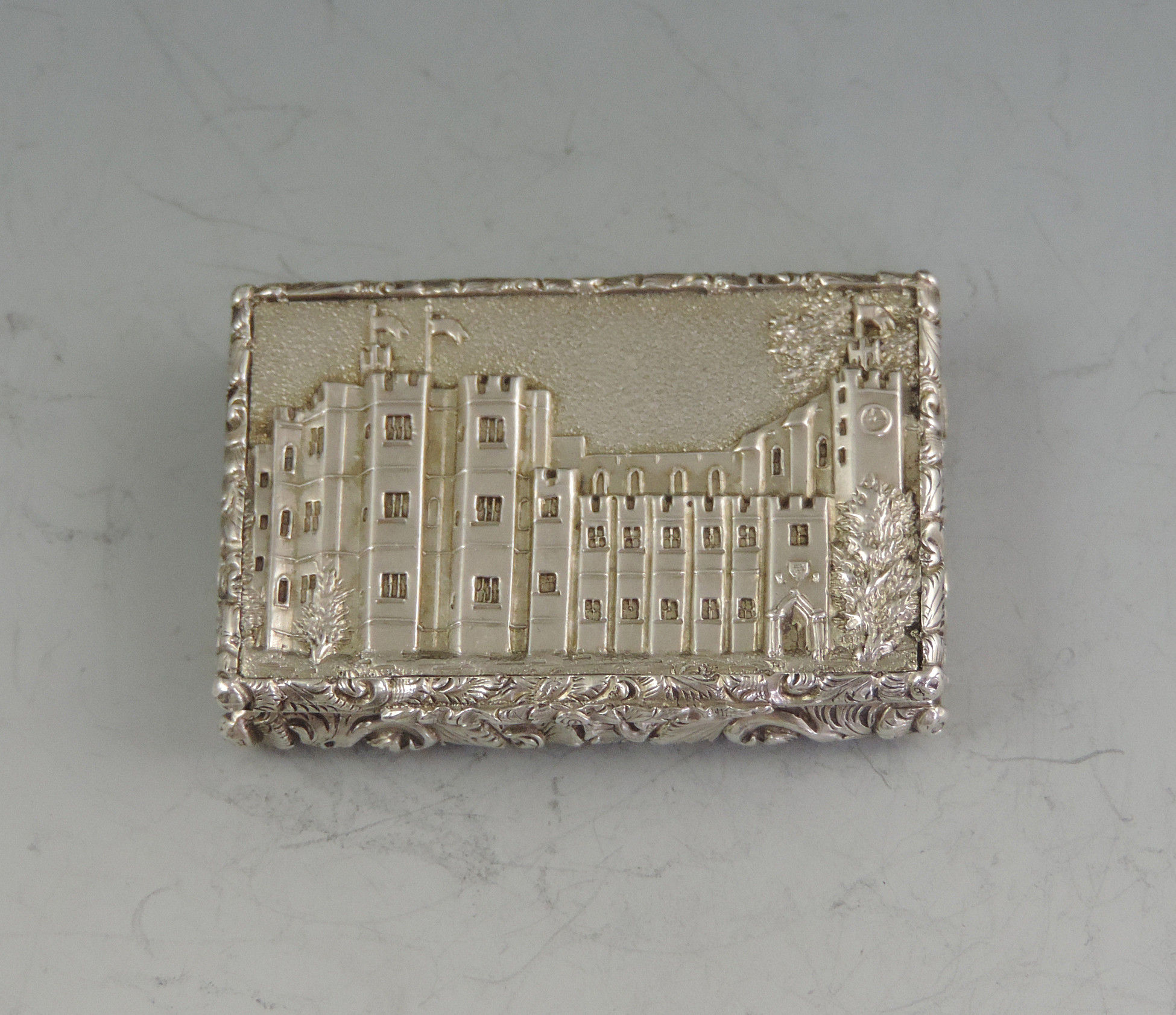 A very fine early Victorian silver 'Castle Top' Vinaigrette of compressed rectangular form with foliate scroll engraved decoration to the base, the sides and lid with raised foliate scroll borders, the lid with a view of Kenilworth Castle in high relief. The silver gilt interior with foliate scroll pierced grille.