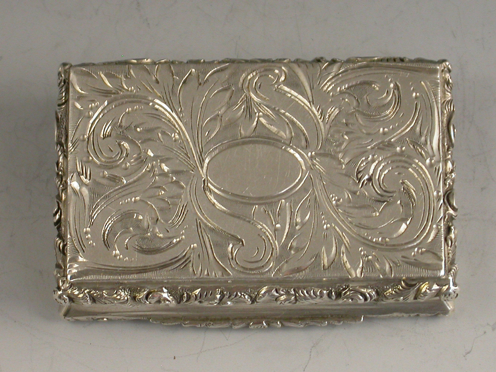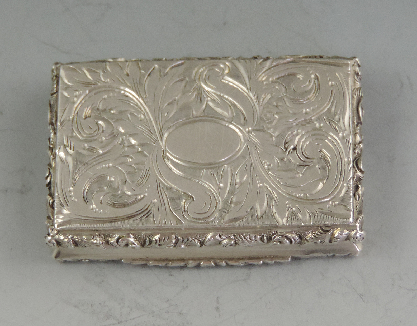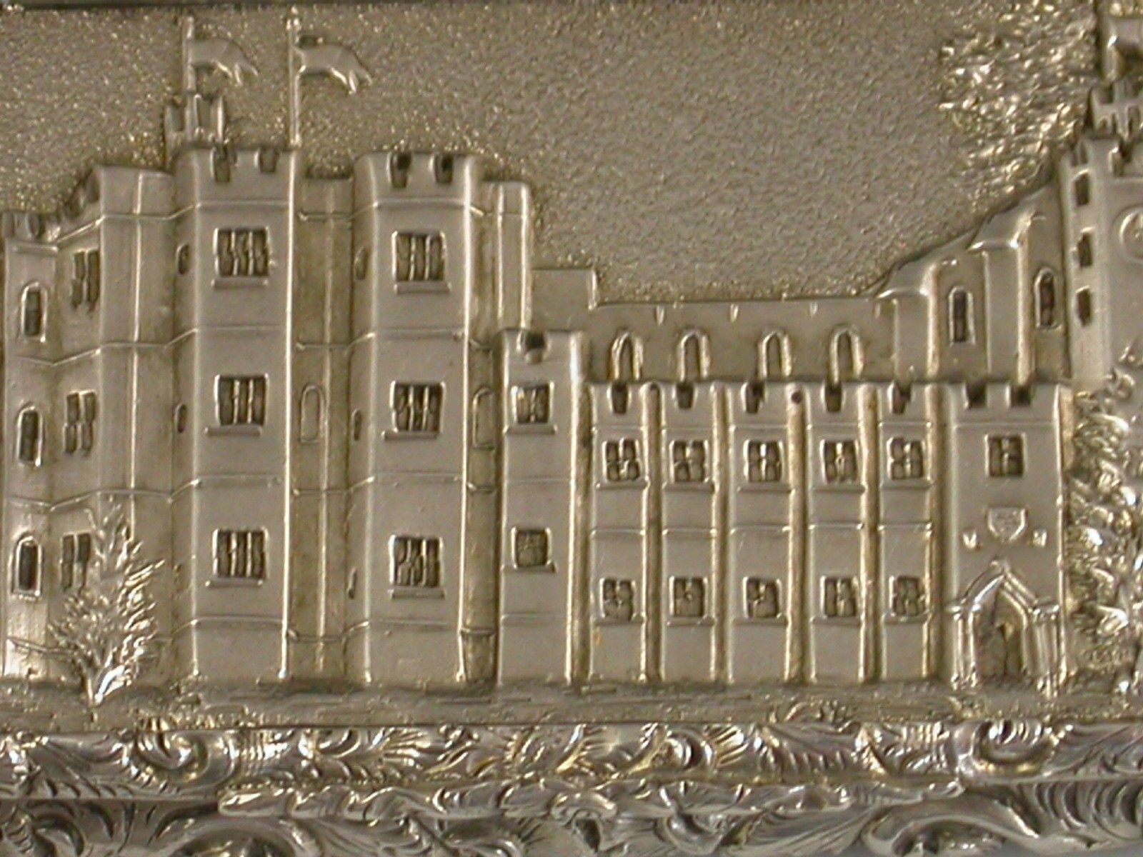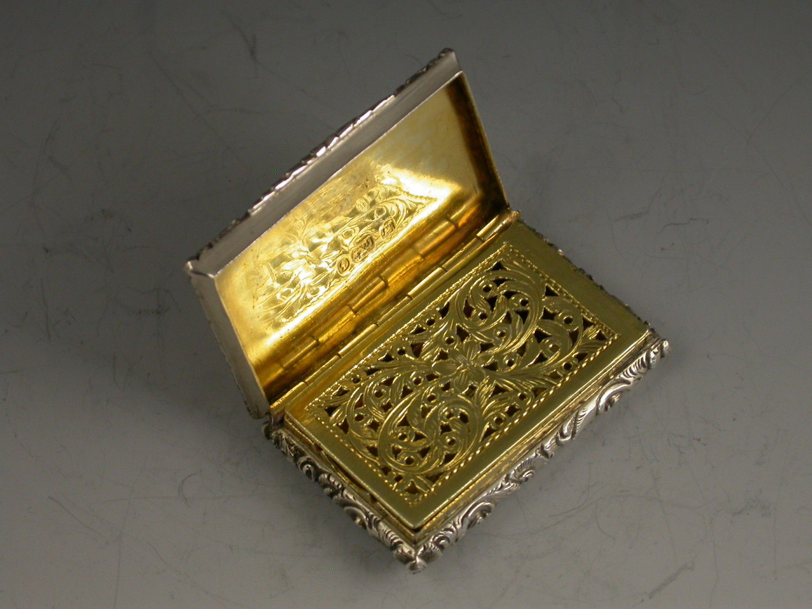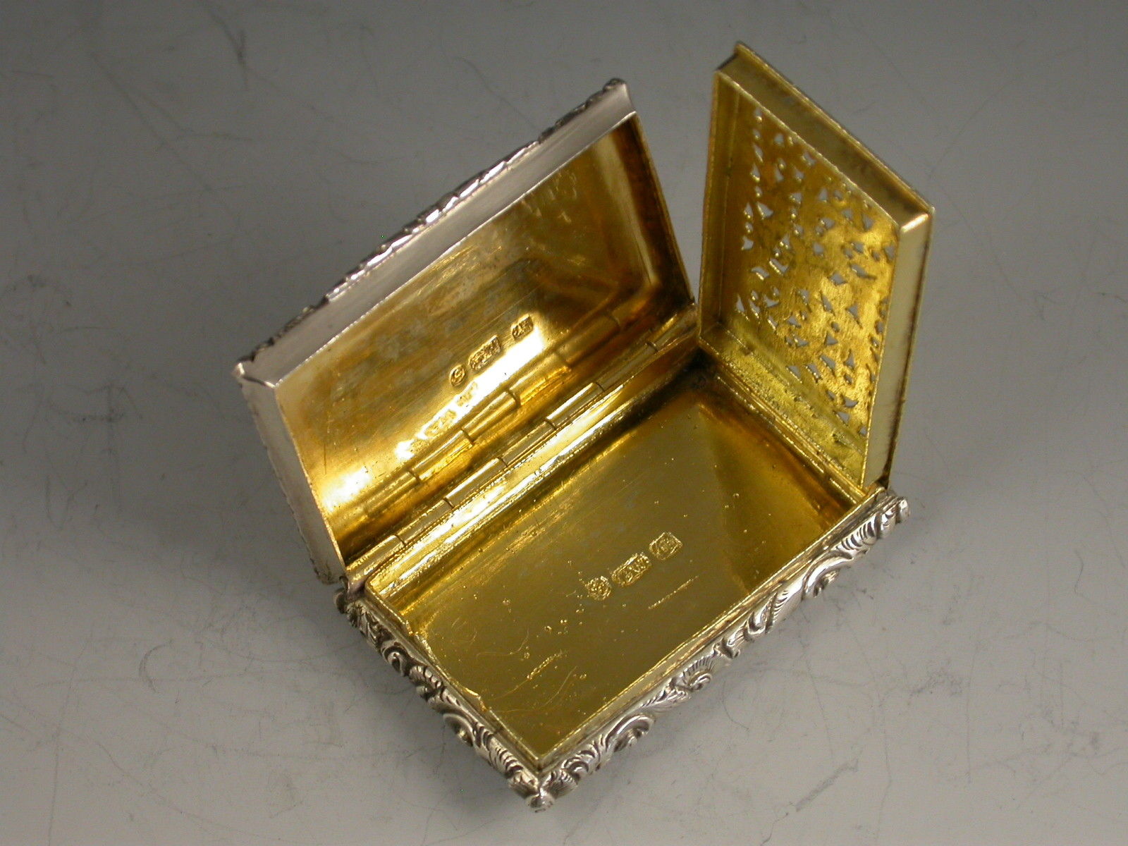 A very fine early Victorian silver 'Castle Top' Vinaigrette of compressed rectangular form with foliate scroll engraved decoration to the base, the sides and lid with raised foliate scroll borders, the lid with a view of Kenilworth Castle in high relief. The silver gilt interior with foliate scroll pierced grille.