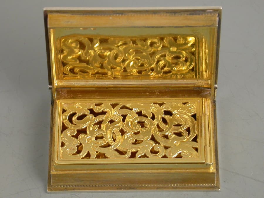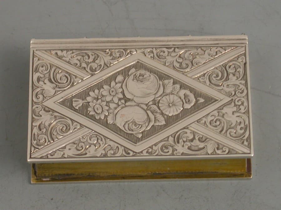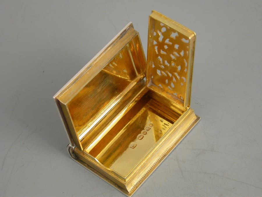 An extremely fine quality Victorian silver book form Vinaigrette with engraved foliate scroll decoration, the cover with a diamond shaped panel engraved with a lake side scene, the reverse with a similar diamond shaped panel engraved with a bouquet of flowers, the spine engraved ""Keep Sake"". The sides realistically gilded and engraved as the pages of the book. The silver gilt interior with intricately pierced hinged grill.