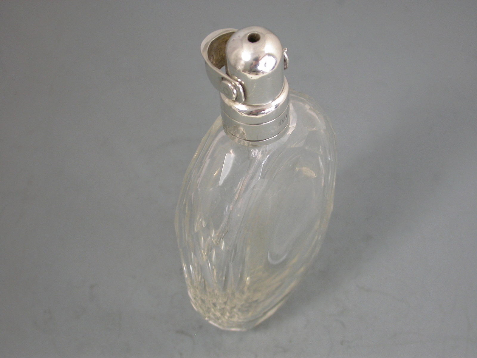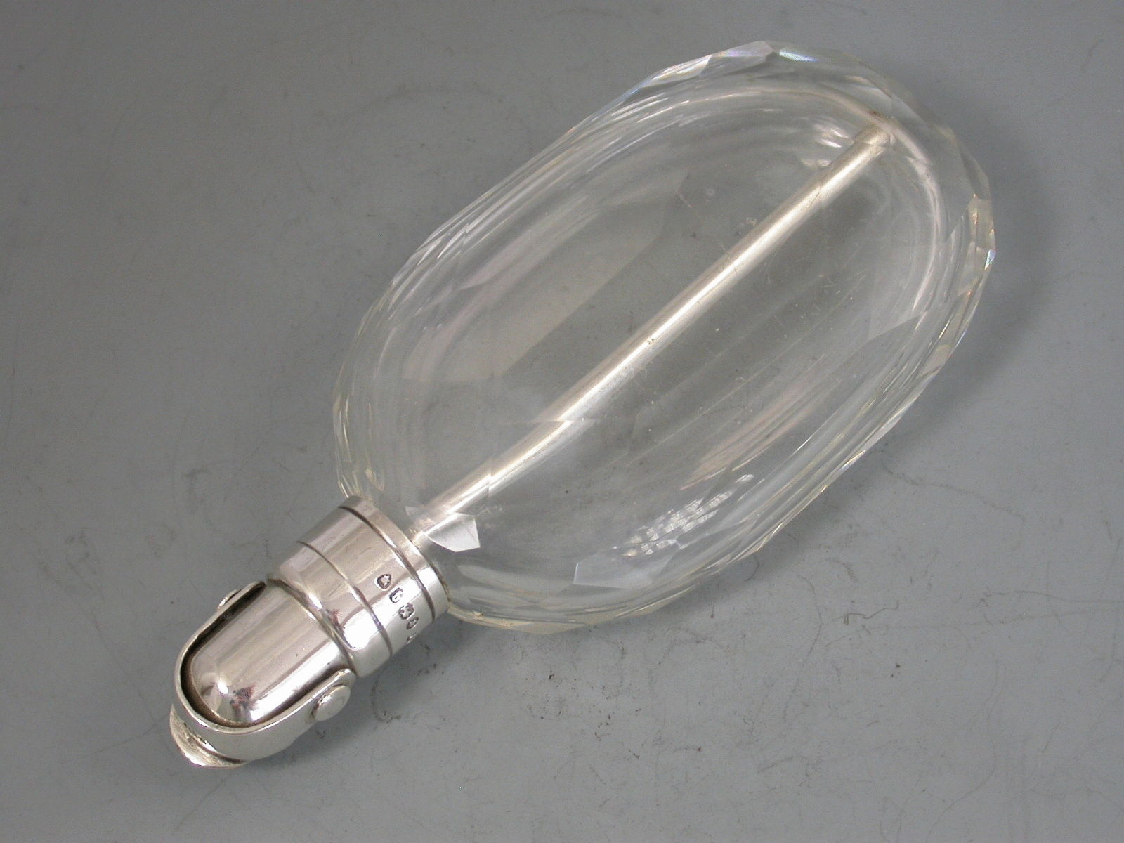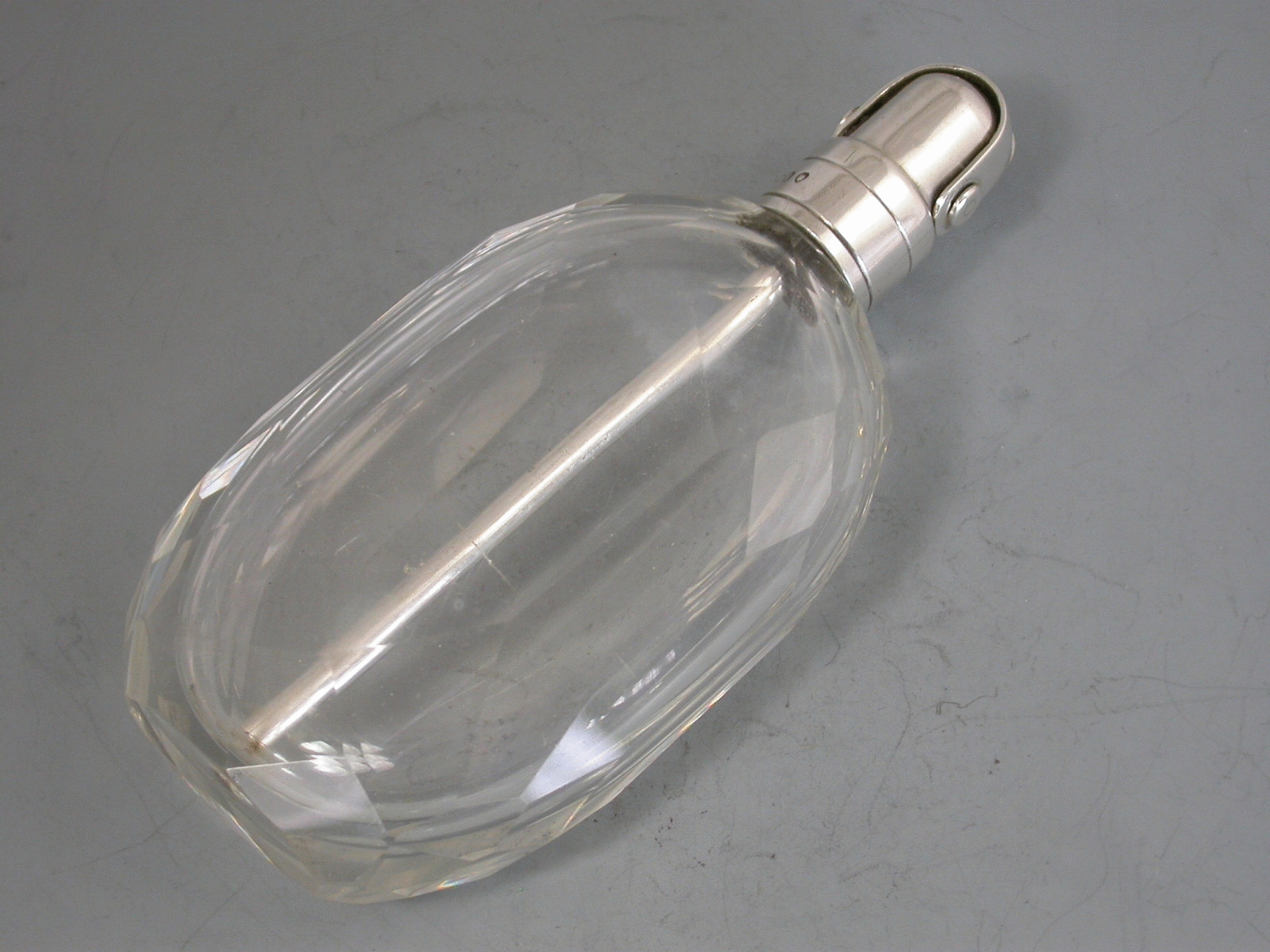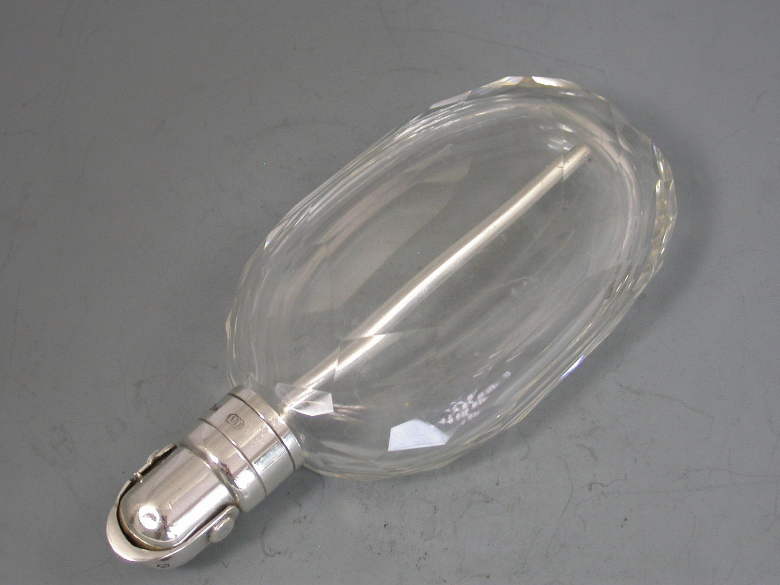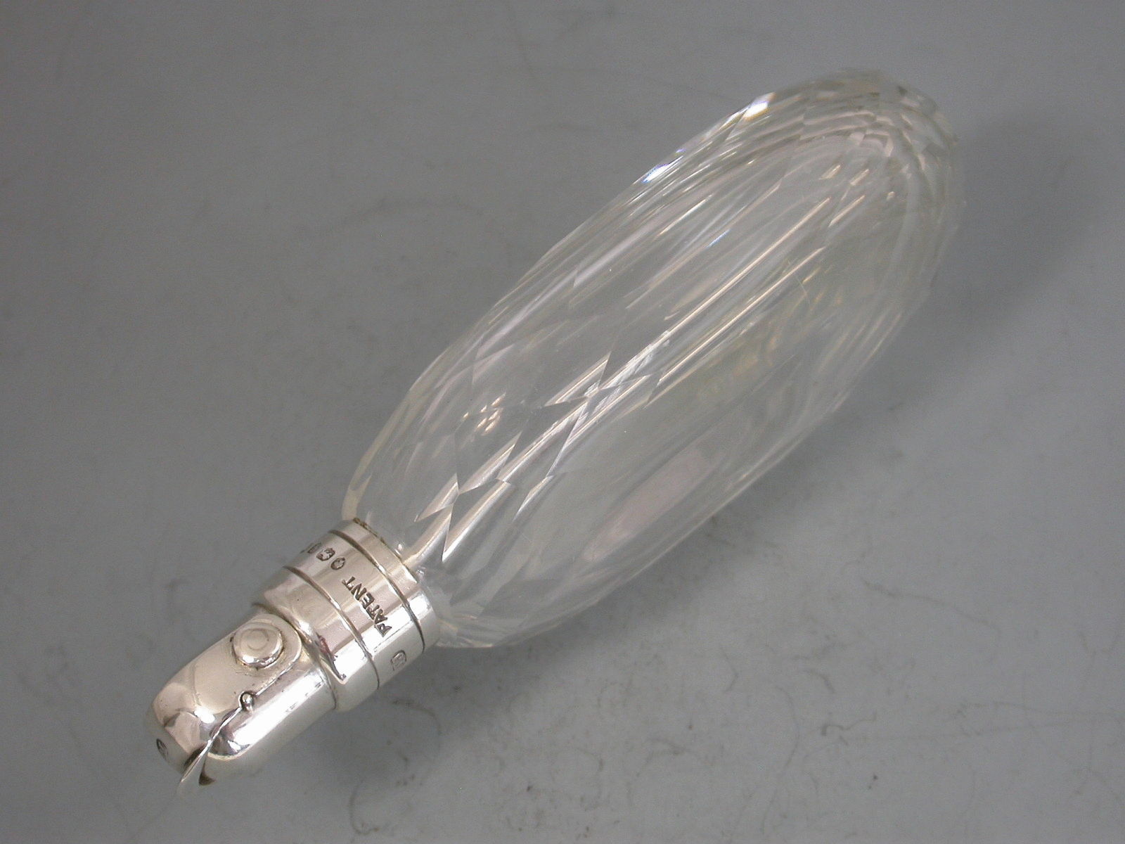An unusual Victorian silver mounted clear faceted oval glass Spirit or Perfume Flask, the silver mount with internal straw or tube and Patent closure mechanism.