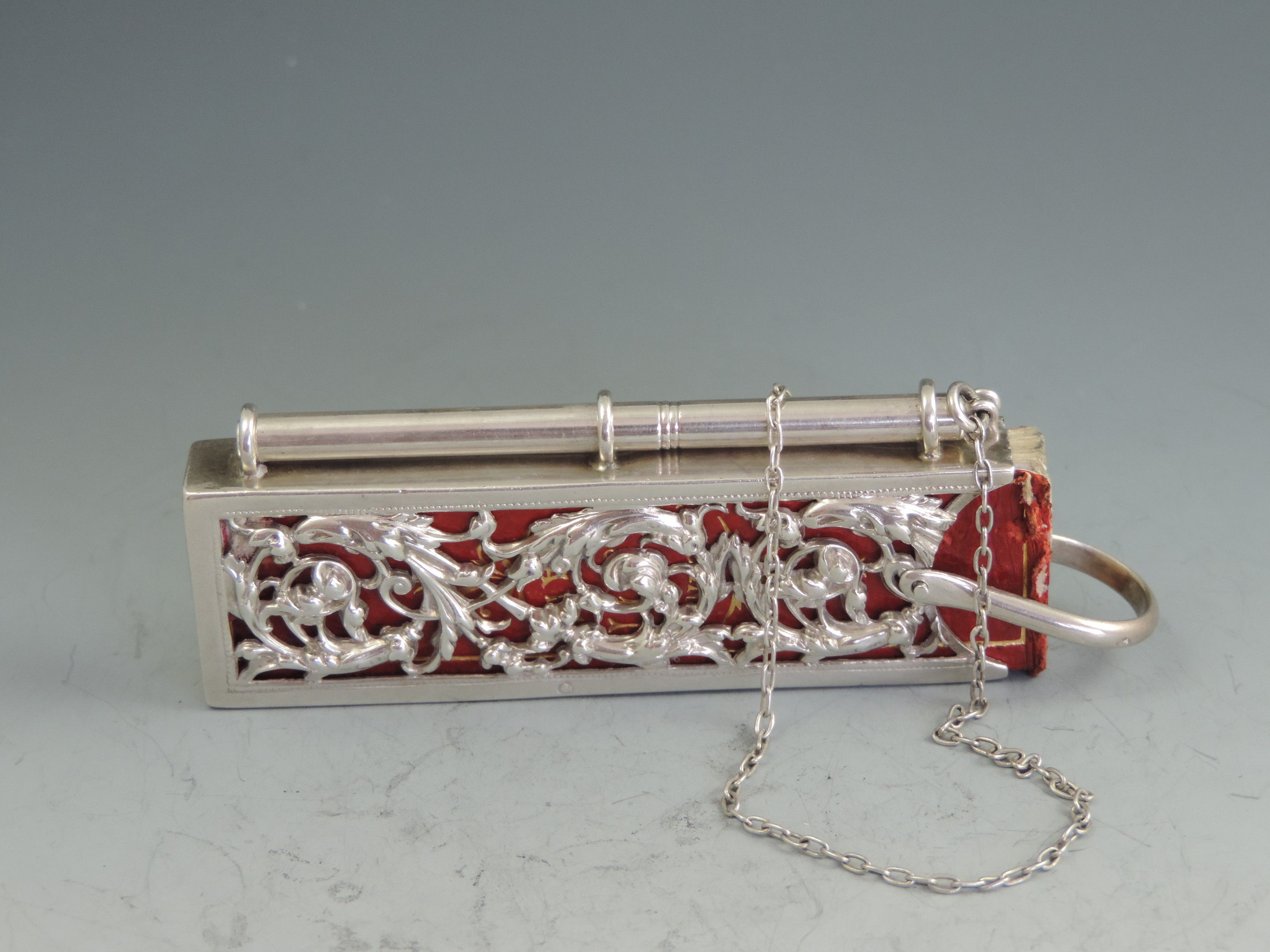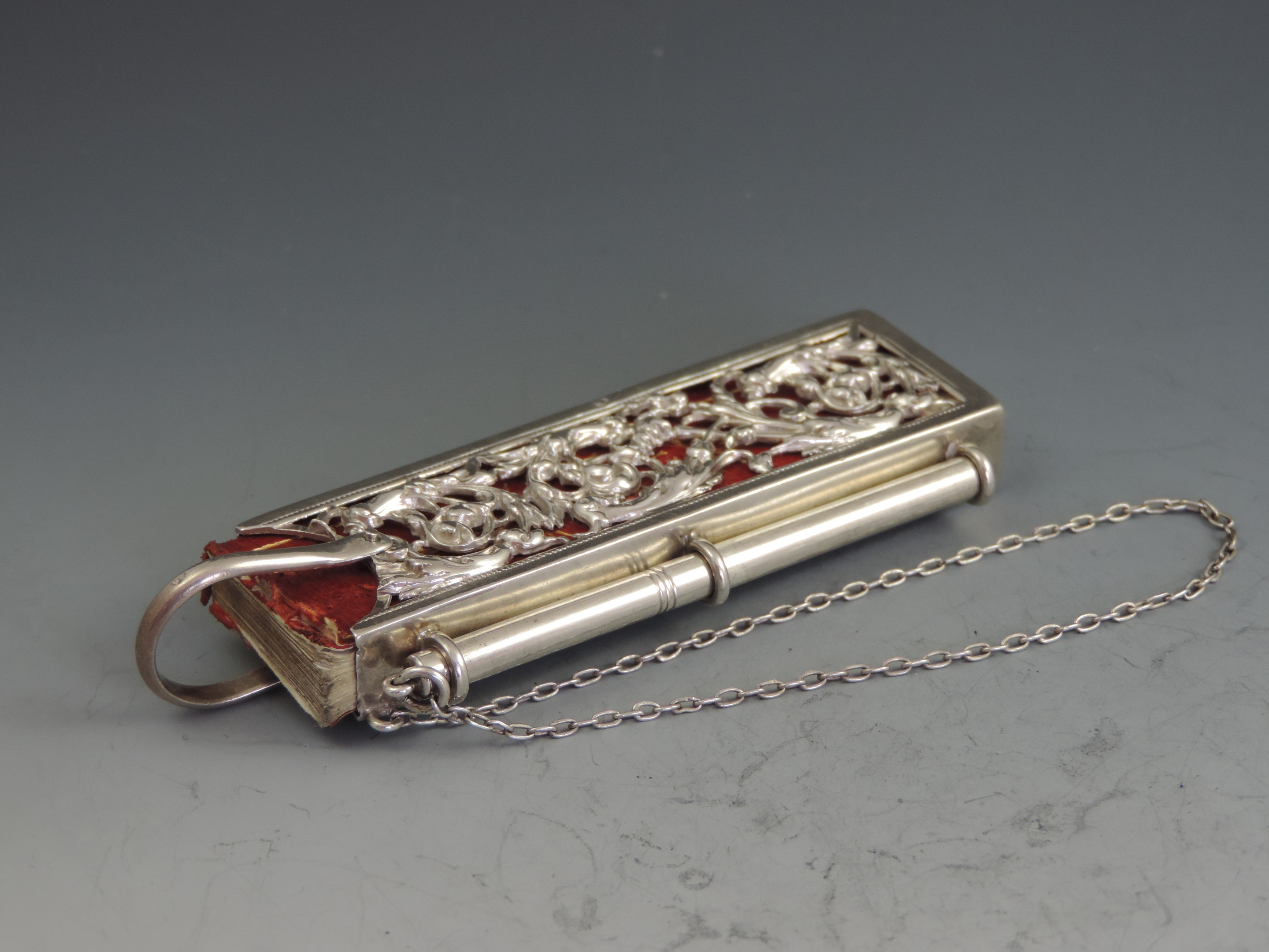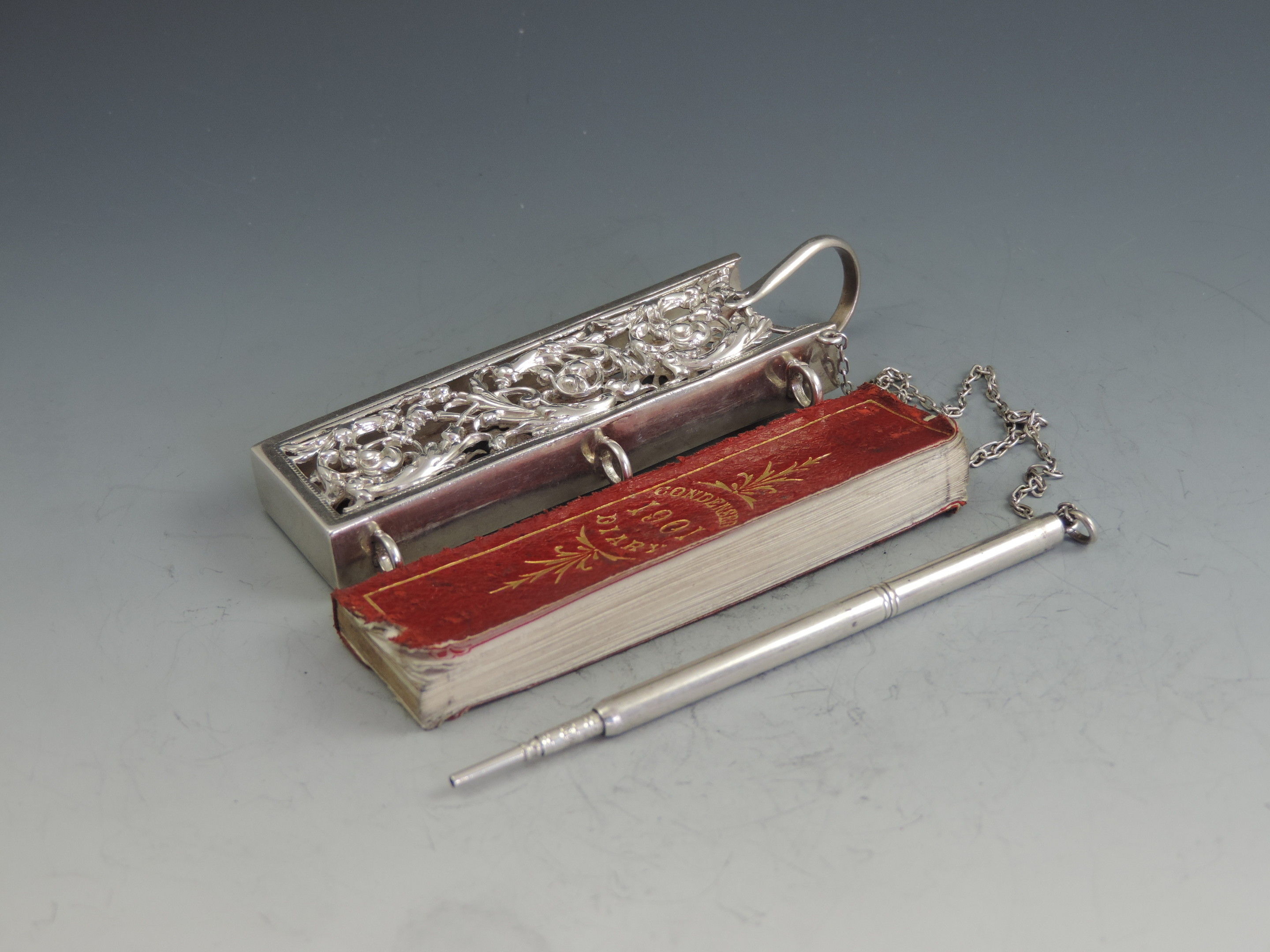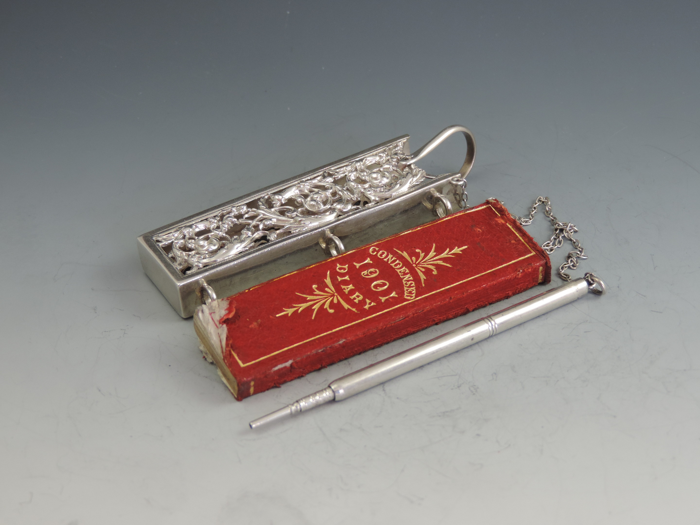 A late Victorian red leather bound De La Rue's finger shaped Condensed Diary and Engagement Book, contained within pierced silver holder with suspensory loop and with attached silver Propelling Pencil on a retaining chain, the case pierced with foliate scrolls and flower heads.