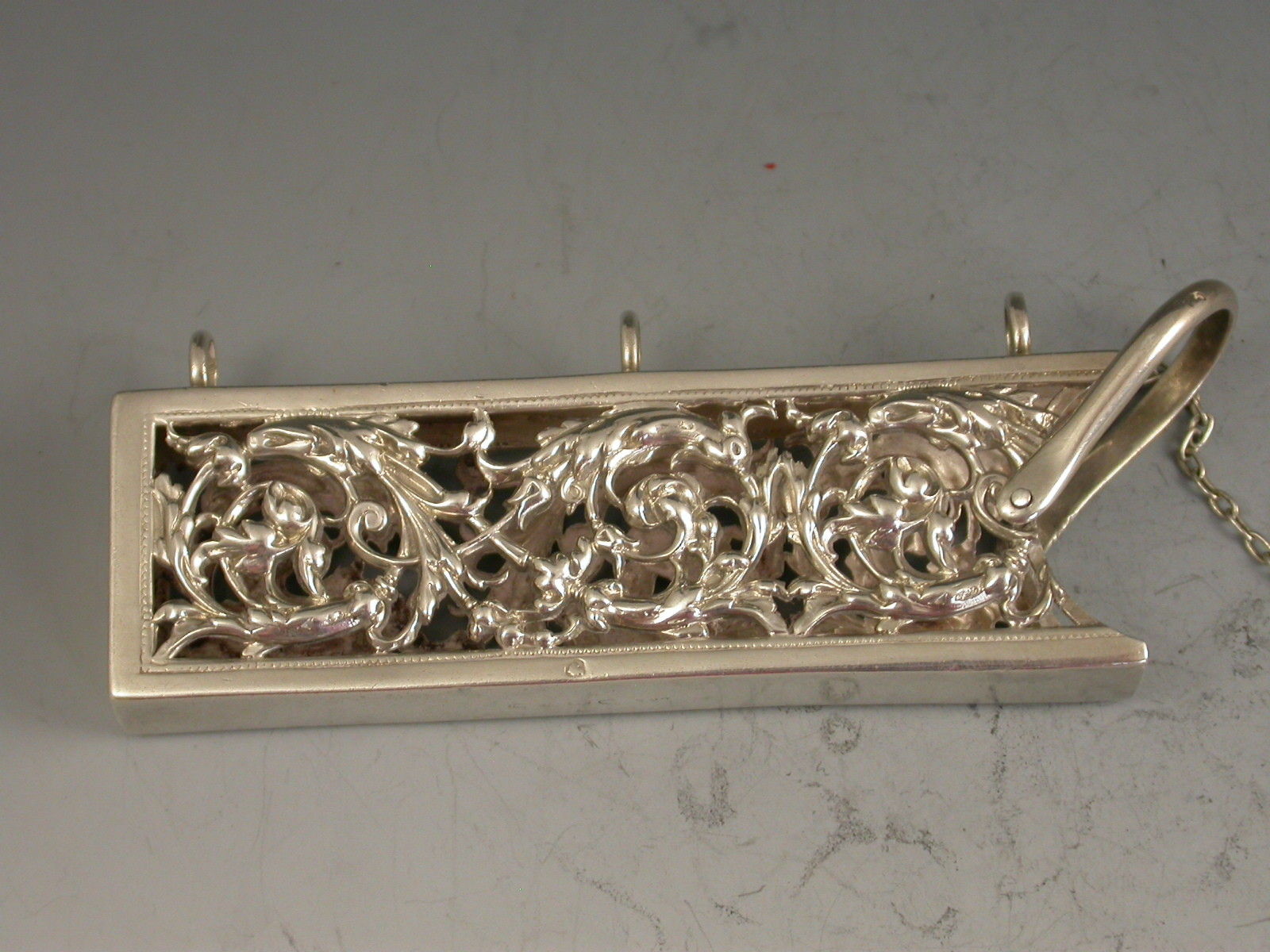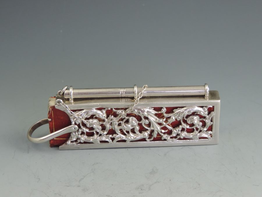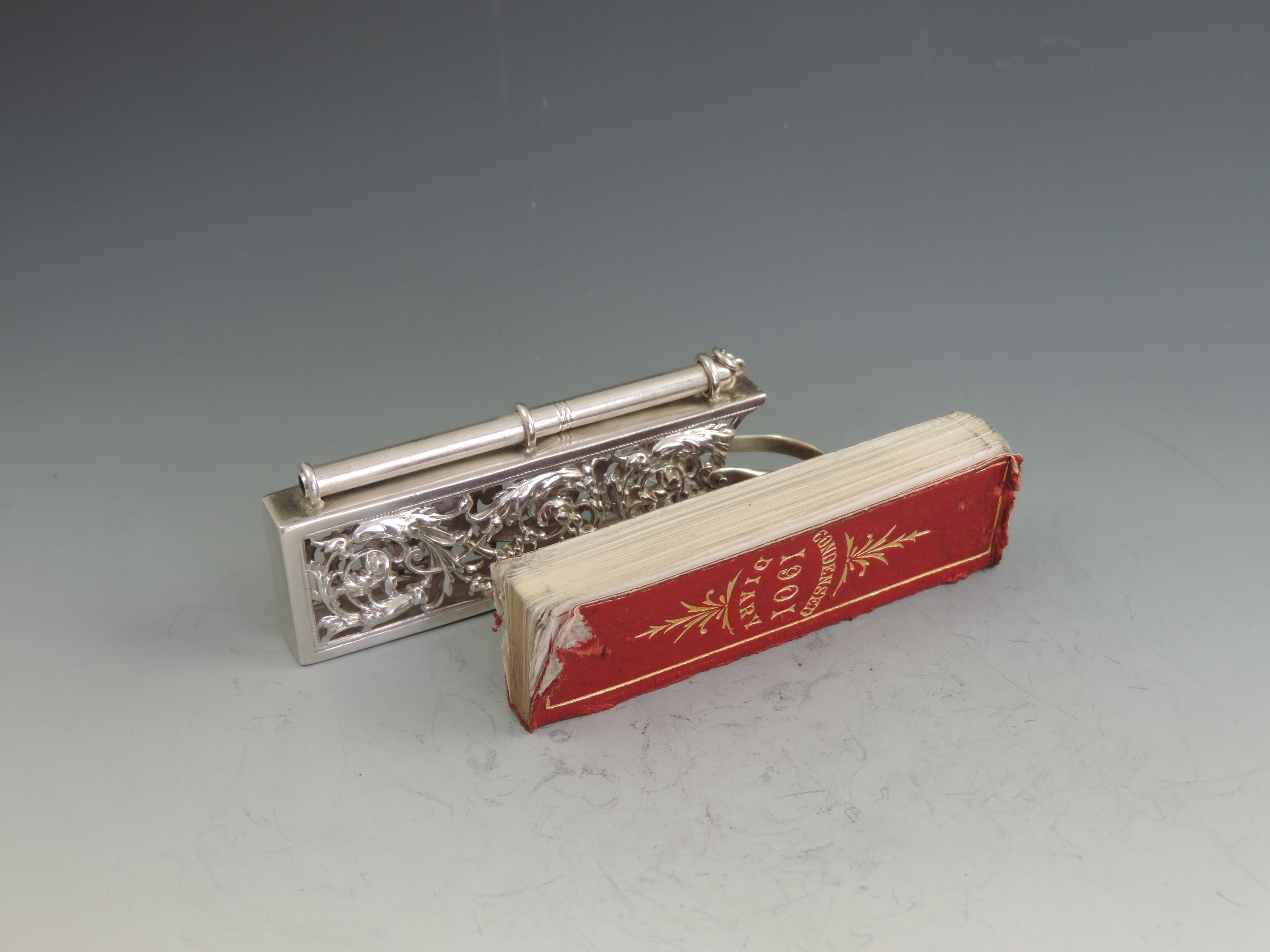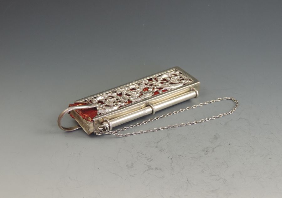 A late Victorian red leather bound De La Rue's finger shaped Condensed Diary and Engagement Book, contained within pierced silver holder with suspensory loop and with attached silver Propelling Pencil on a retaining chain, the case pierced with foliate scrolls and flower heads.