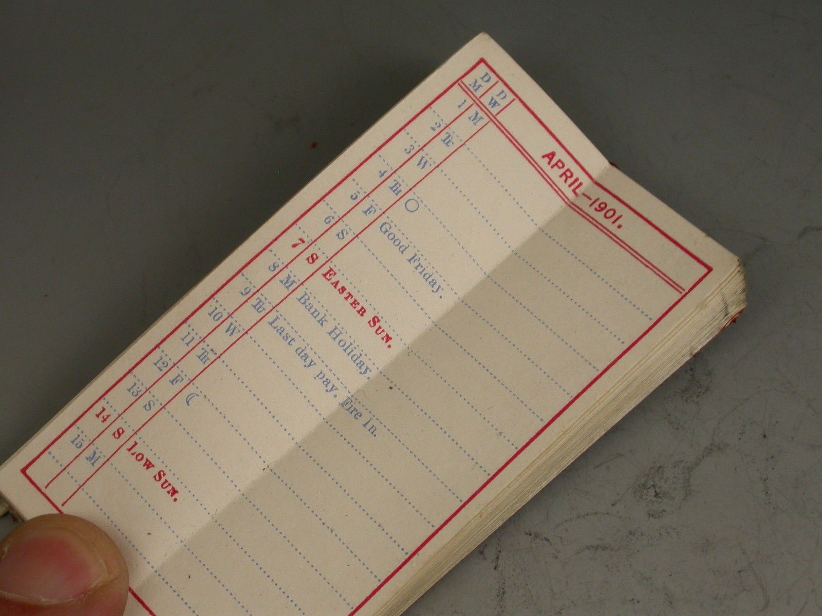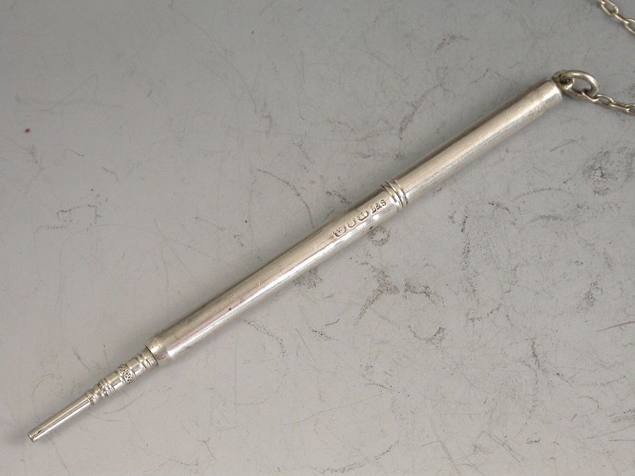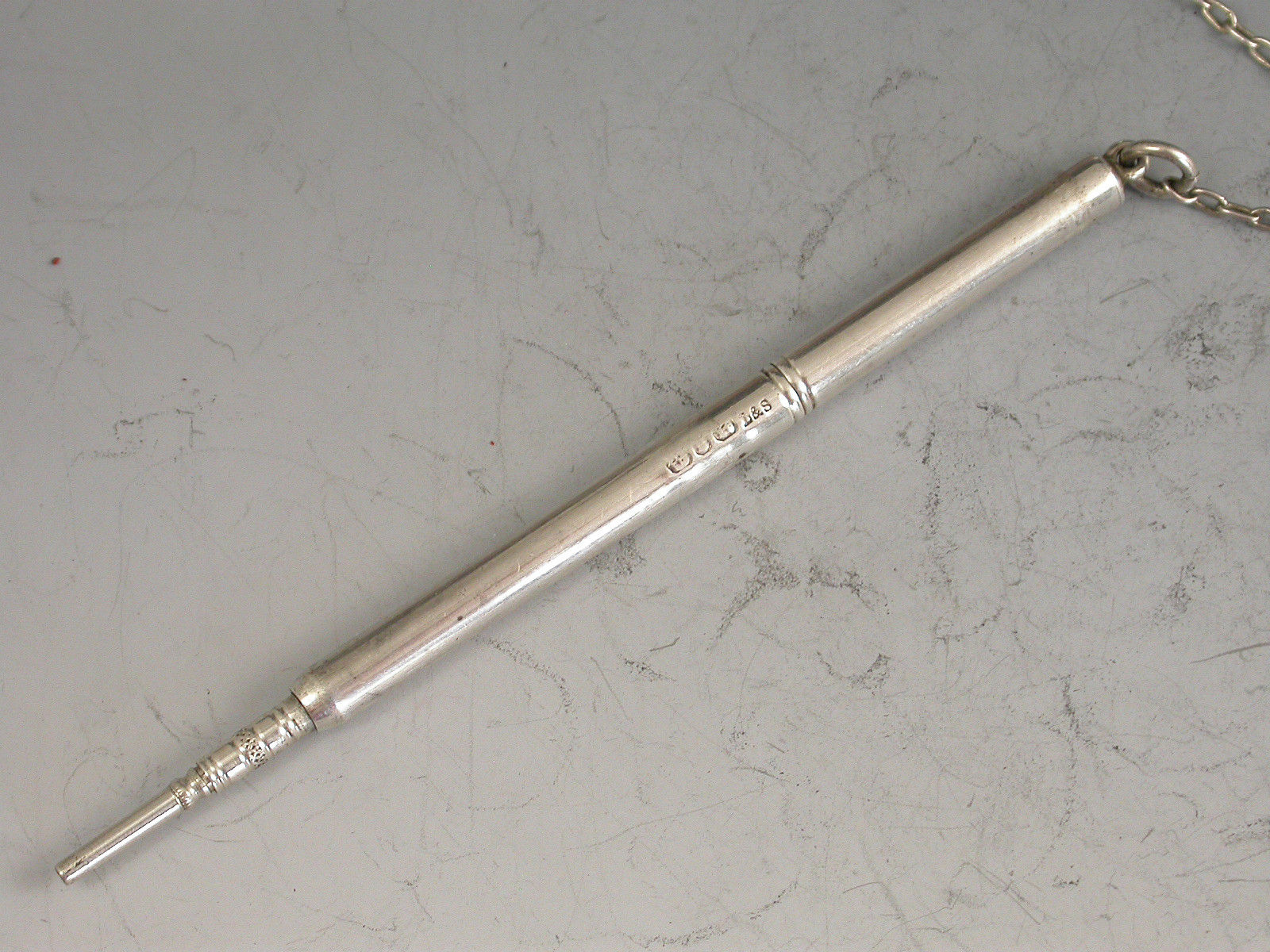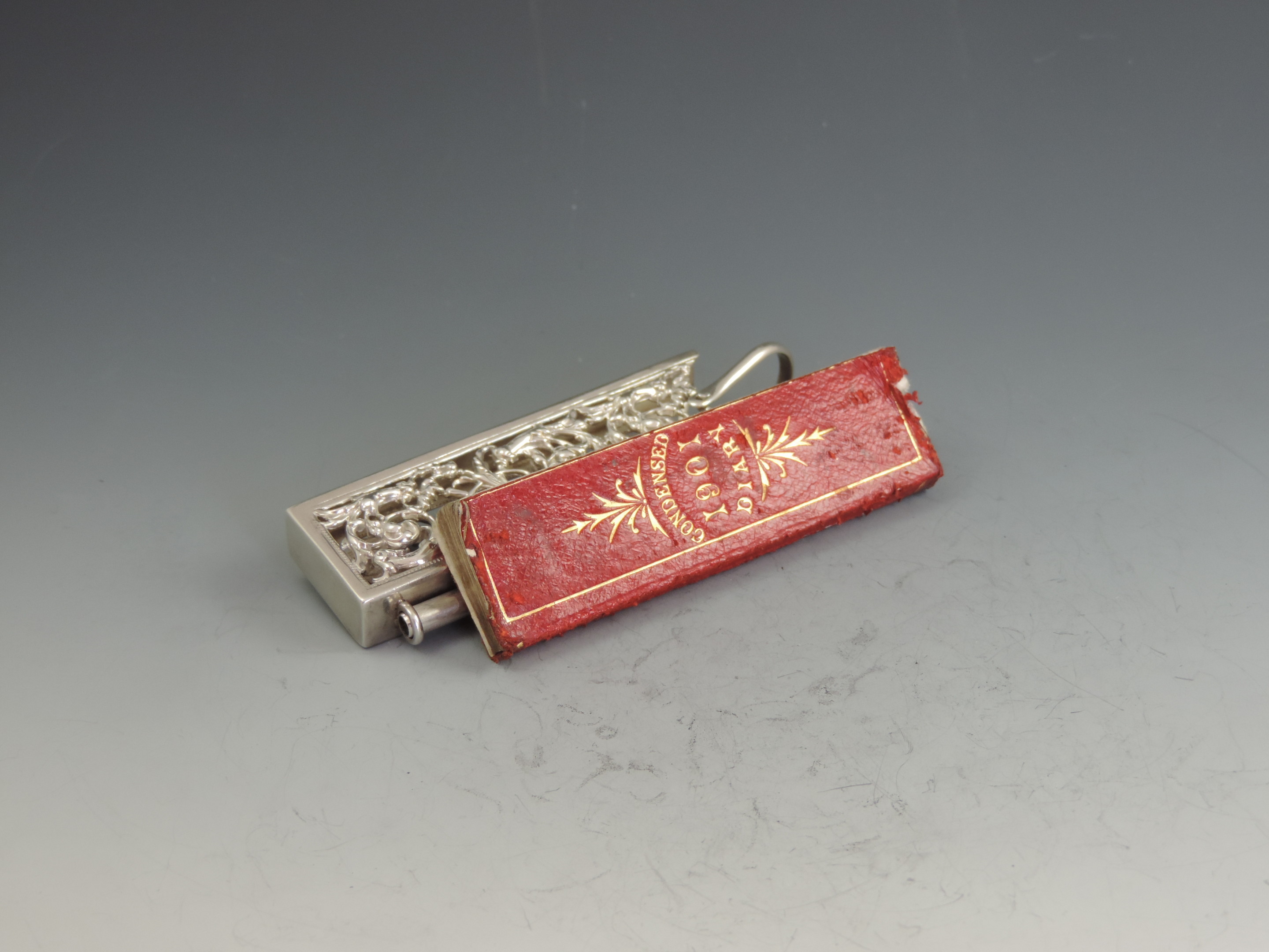 A late Victorian red leather bound De La Rue's finger shaped Condensed Diary and Engagement Book, contained within pierced silver holder with suspensory loop and with attached silver Propelling Pencil on a retaining chain, the case pierced with foliate scrolls and flower heads.