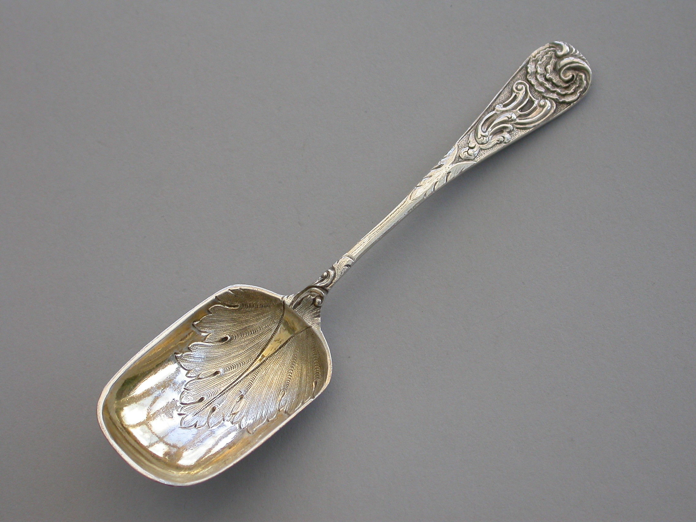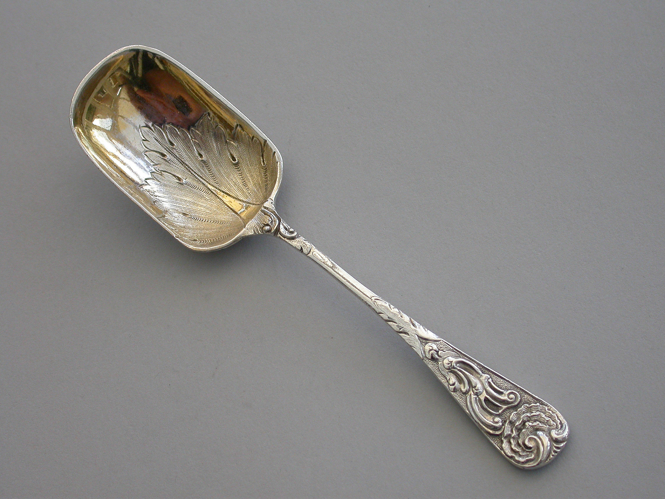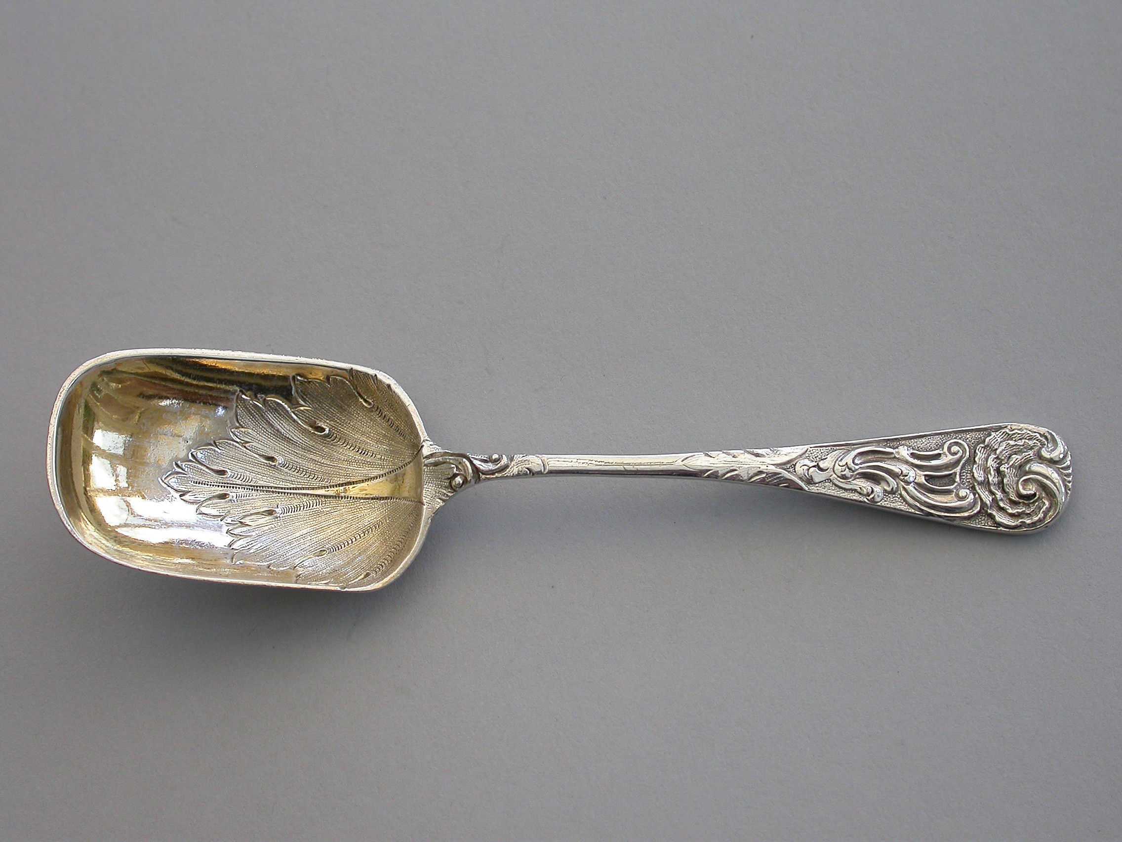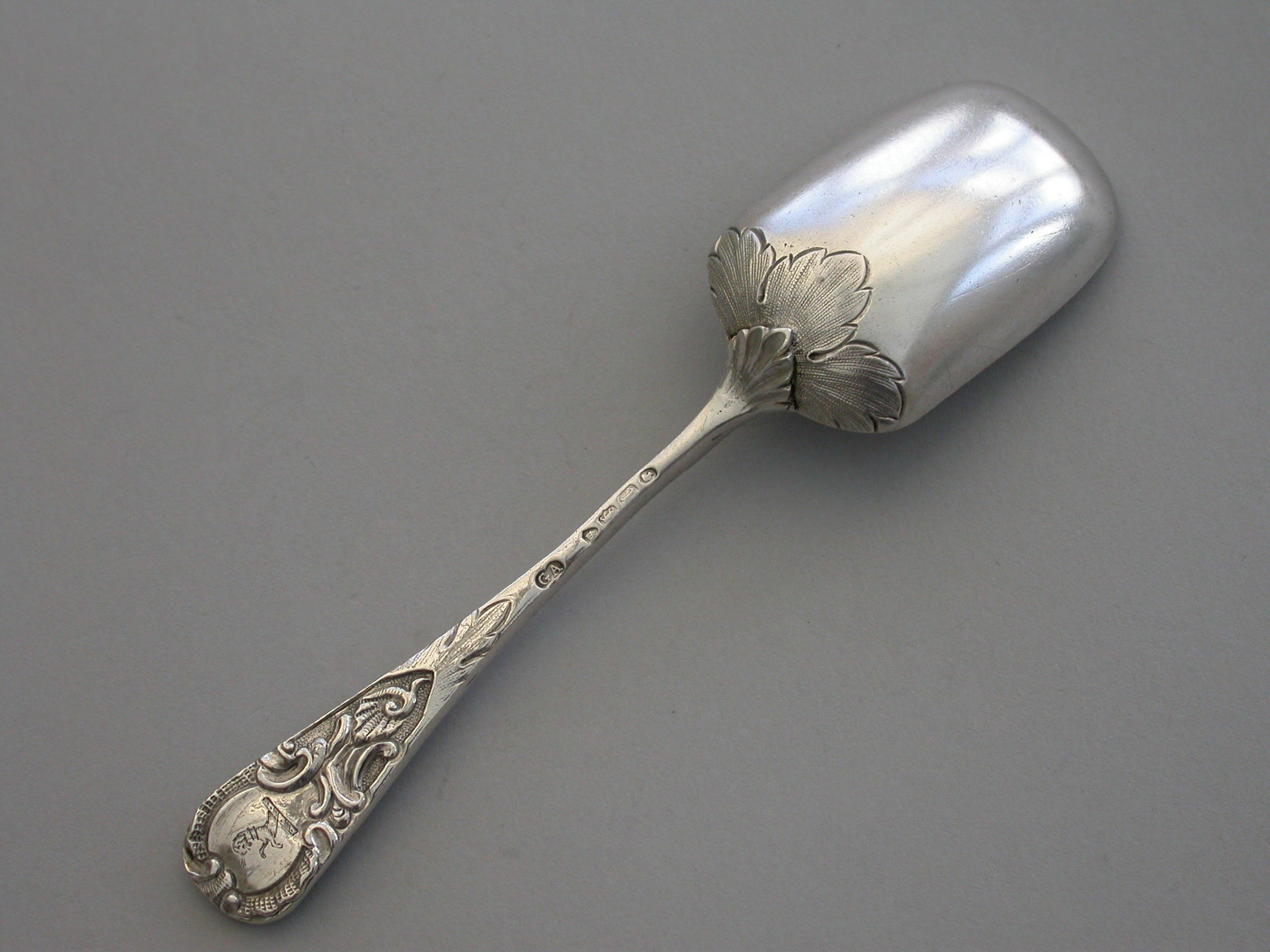 A good quality Victorian silver Preserve Spoon with gilded rounded rectangular scoop shaped bowl chased with an acanthus leaf, the handle chased with rococo scrolls and shells, an asymmetrical cartouche to the reverse engraved with a crest.
