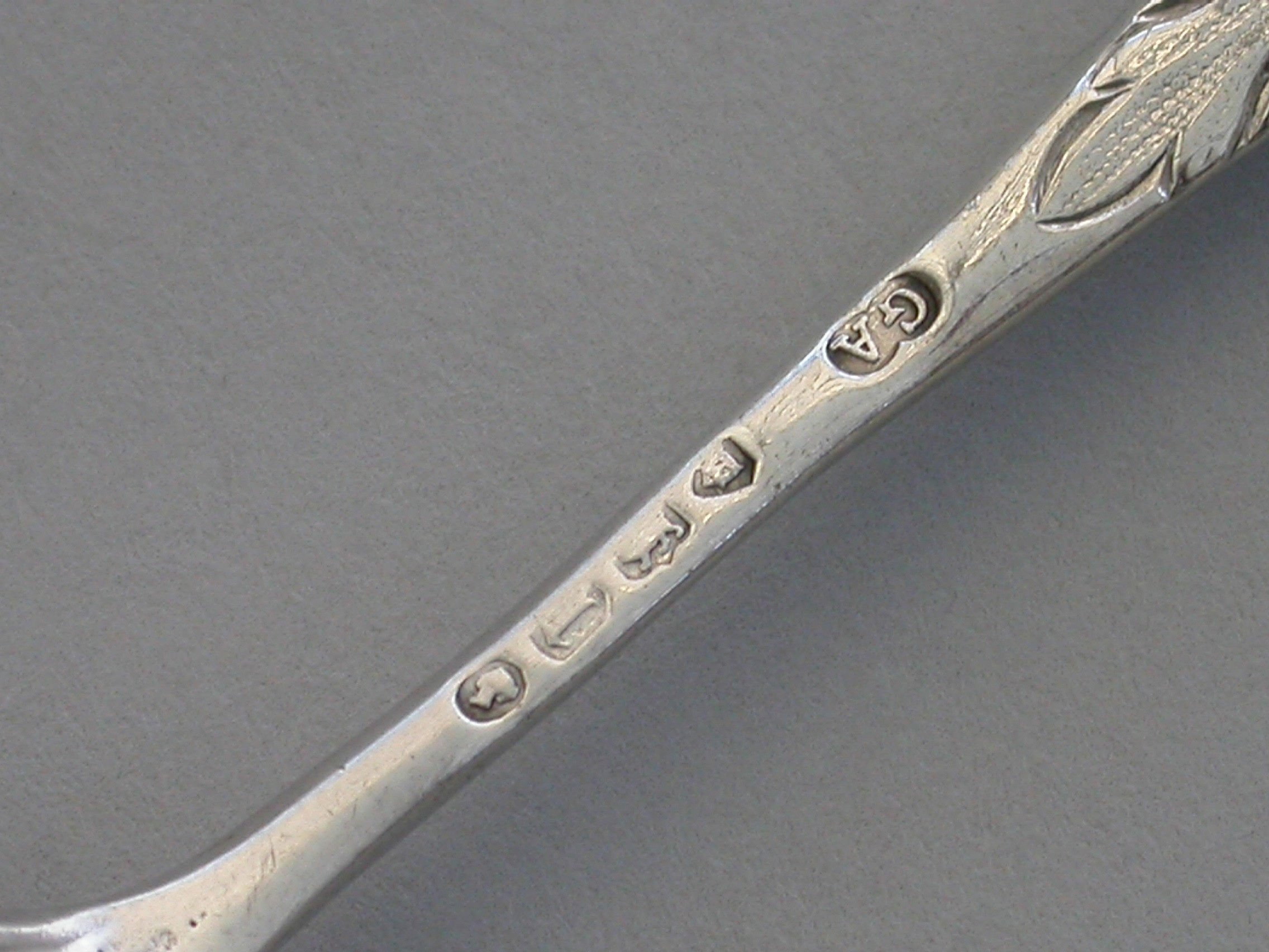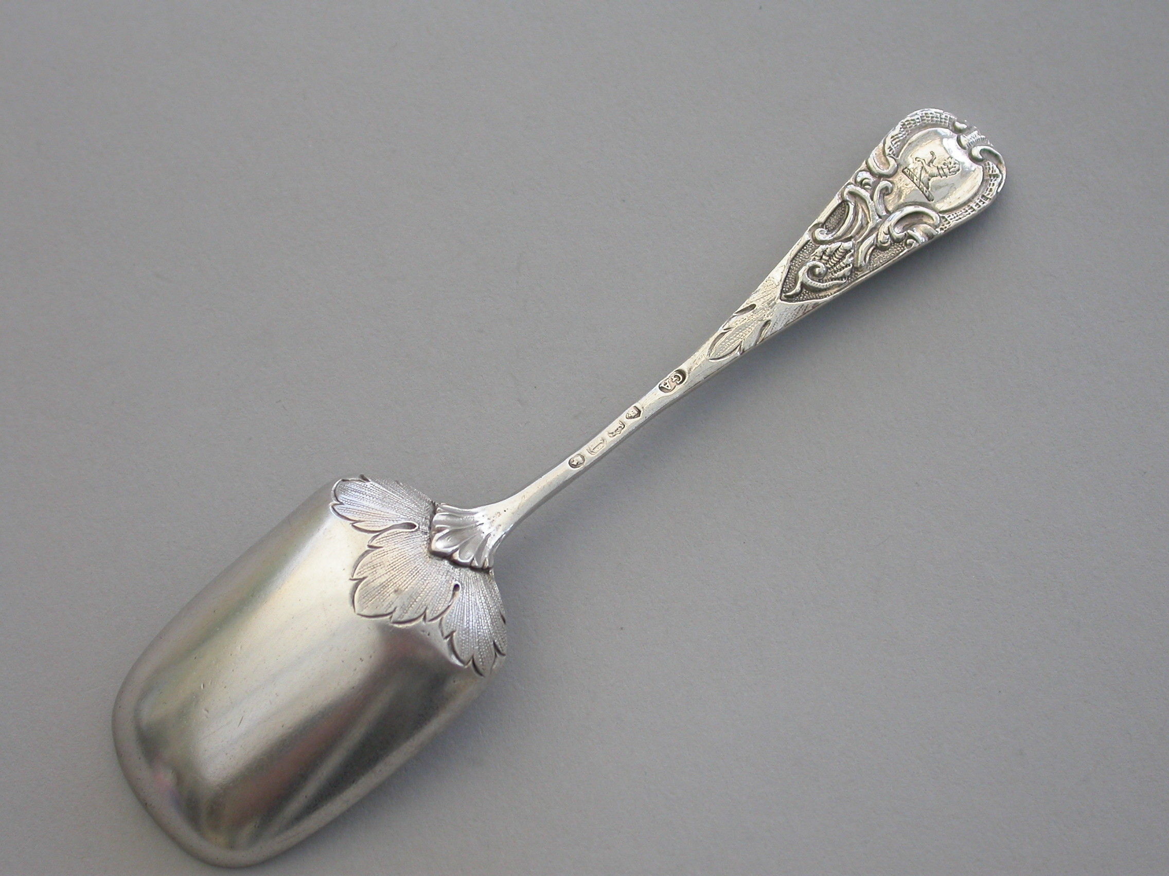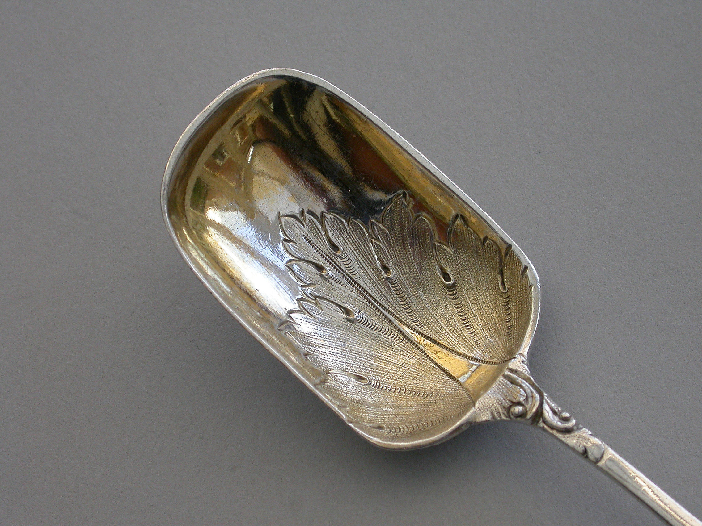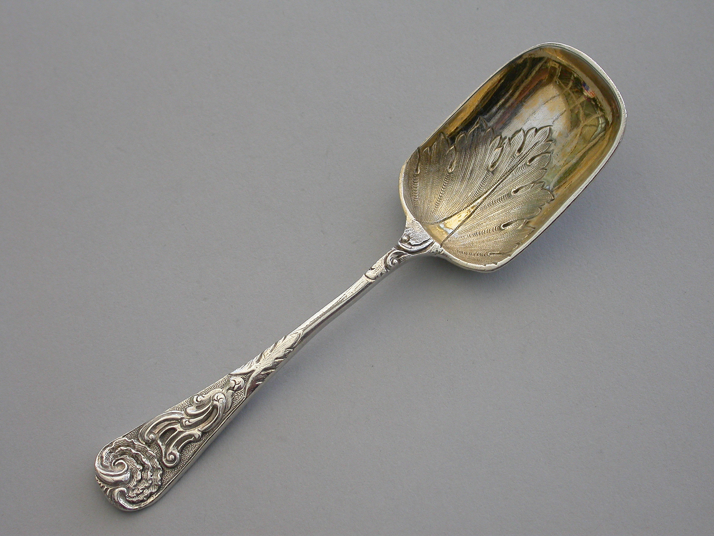 A good quality Victorian silver Preserve Spoon with gilded rounded rectangular scoop shaped bowl chased with an acanthus leaf, the handle chased with rococo scrolls and shells, an asymmetrical cartouche to the reverse engraved with a crest.